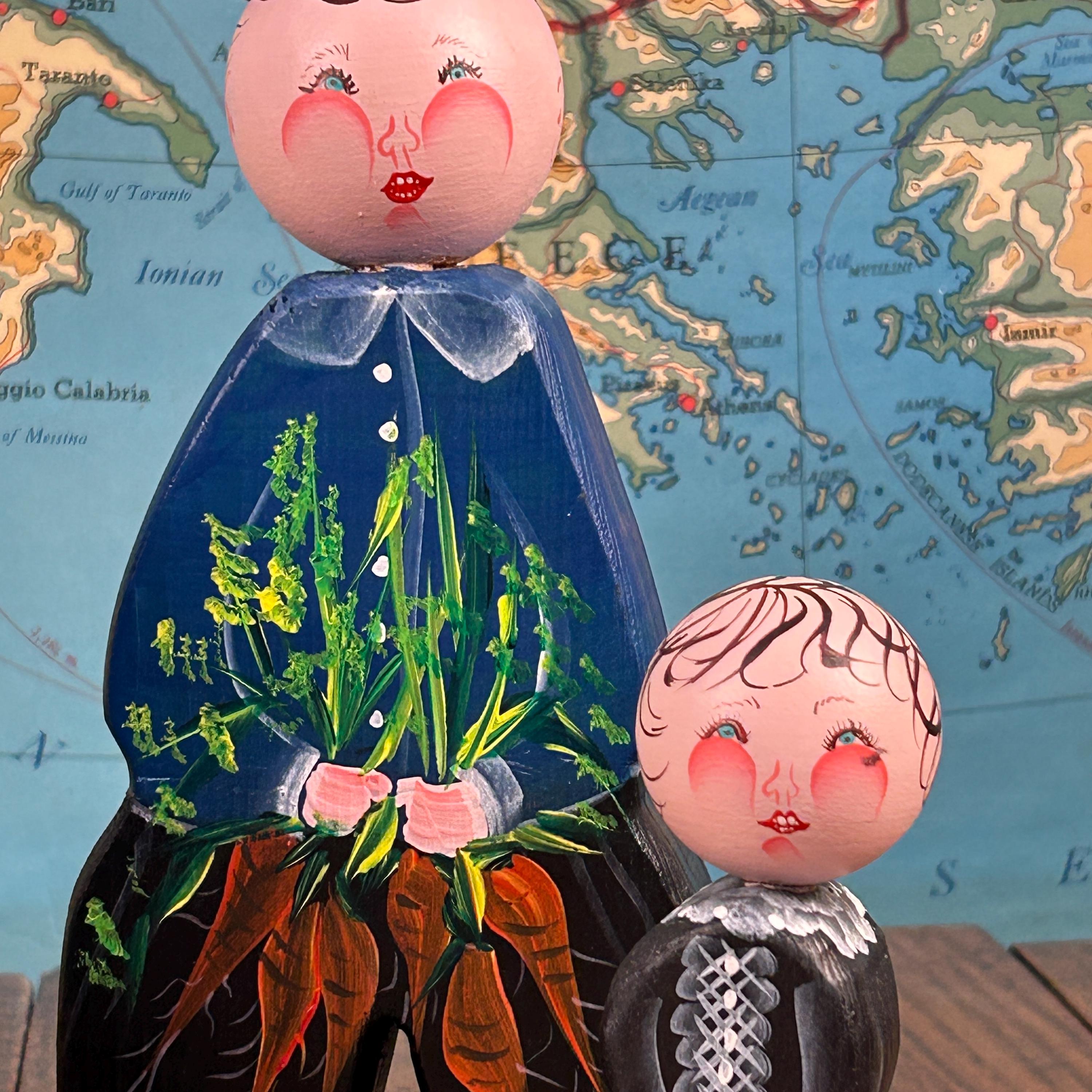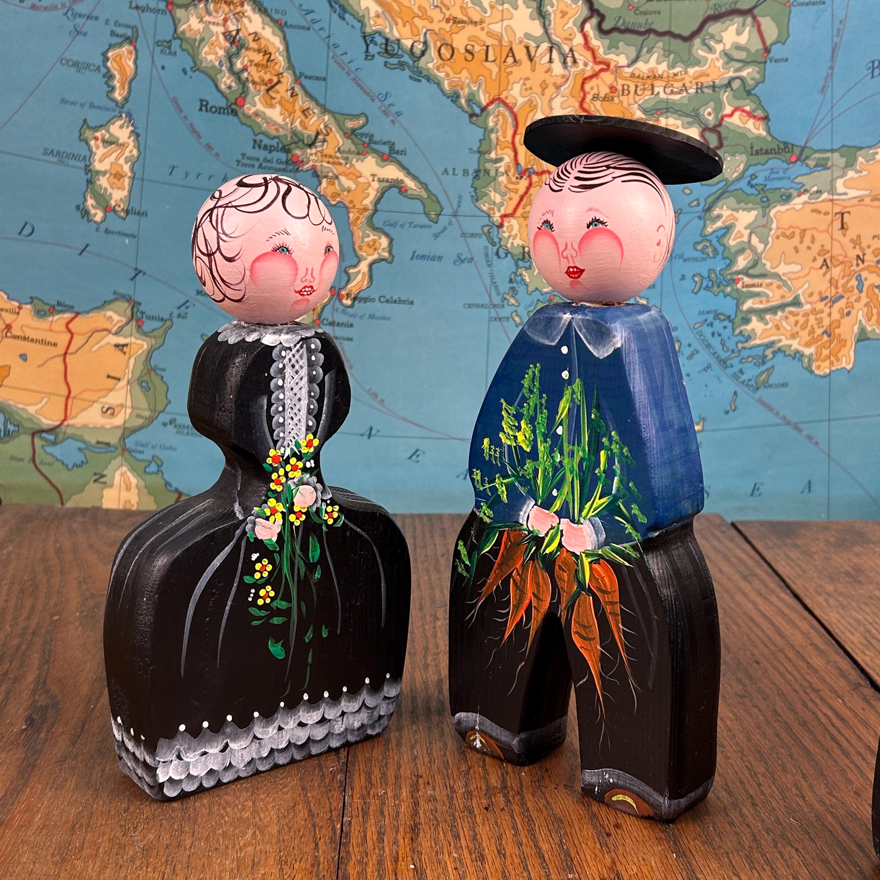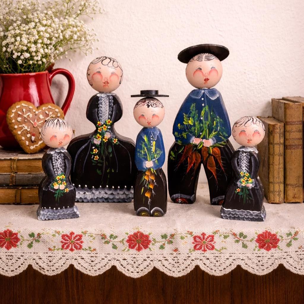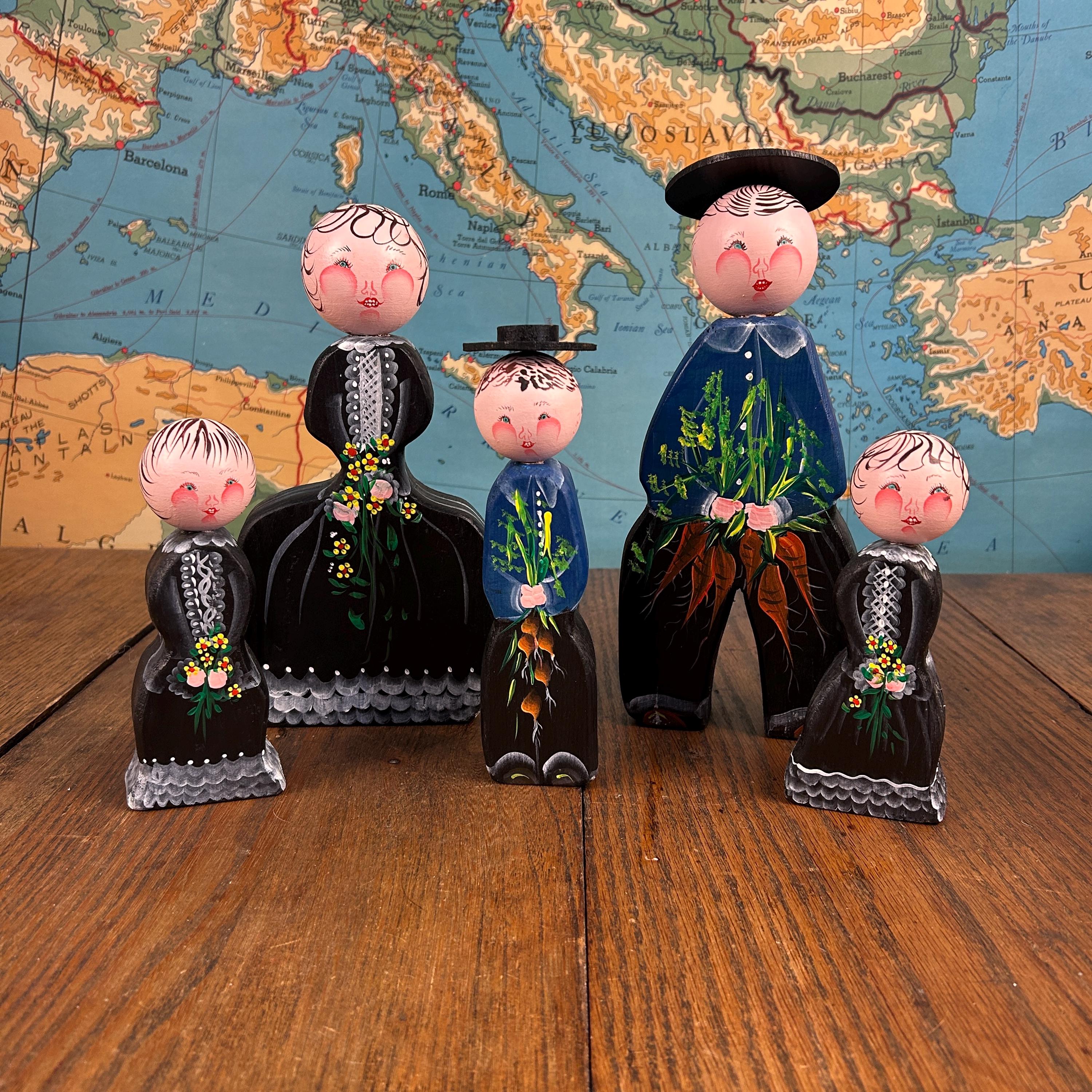 This delightful set of five vintage wooden folk figurines features hand-painted peg dolls dressed in traditional European-style costumes. Each figure is uniquely detailed and appears to be holding a small painted bouquet of flowers or carrots, adding to their rustic, countryside charm.