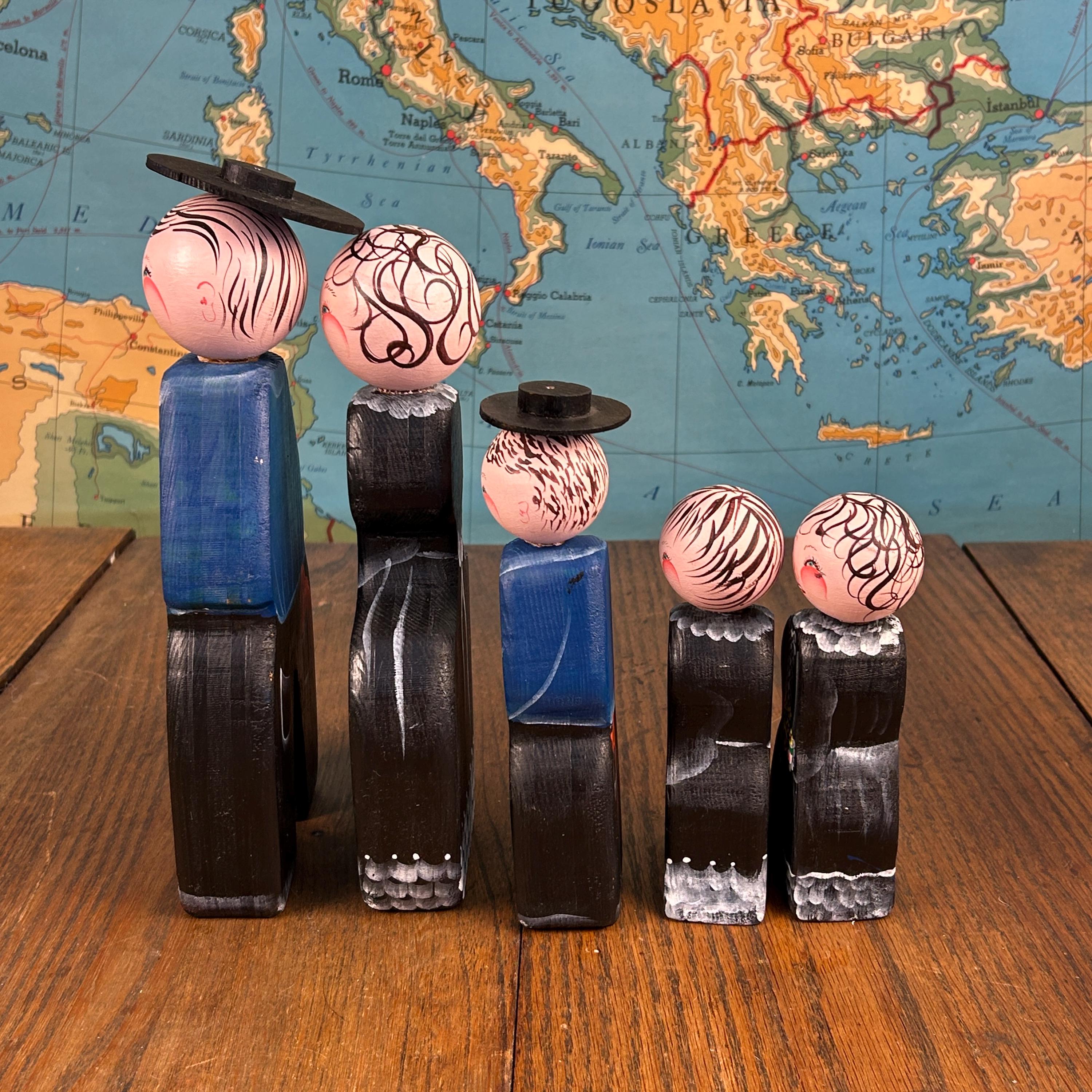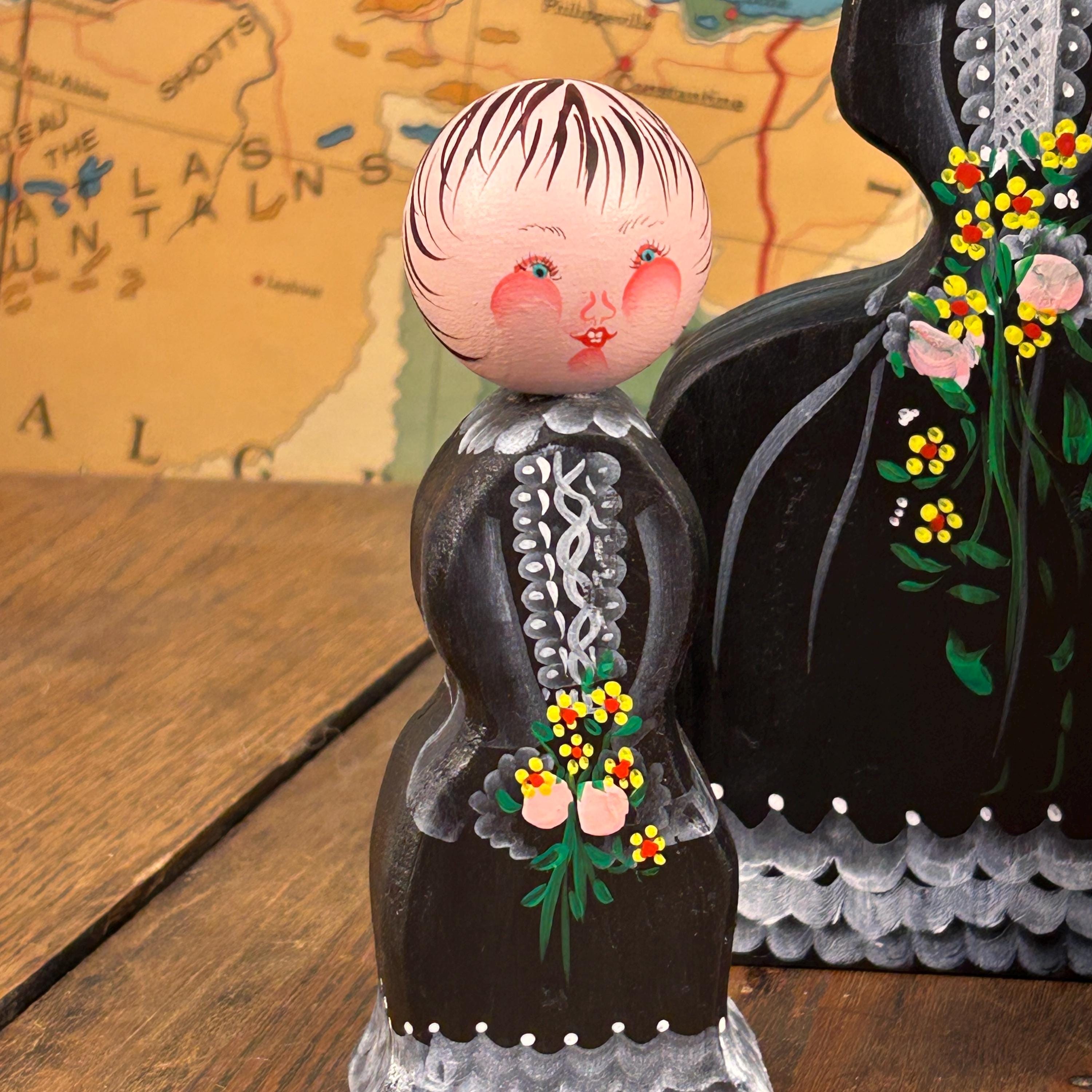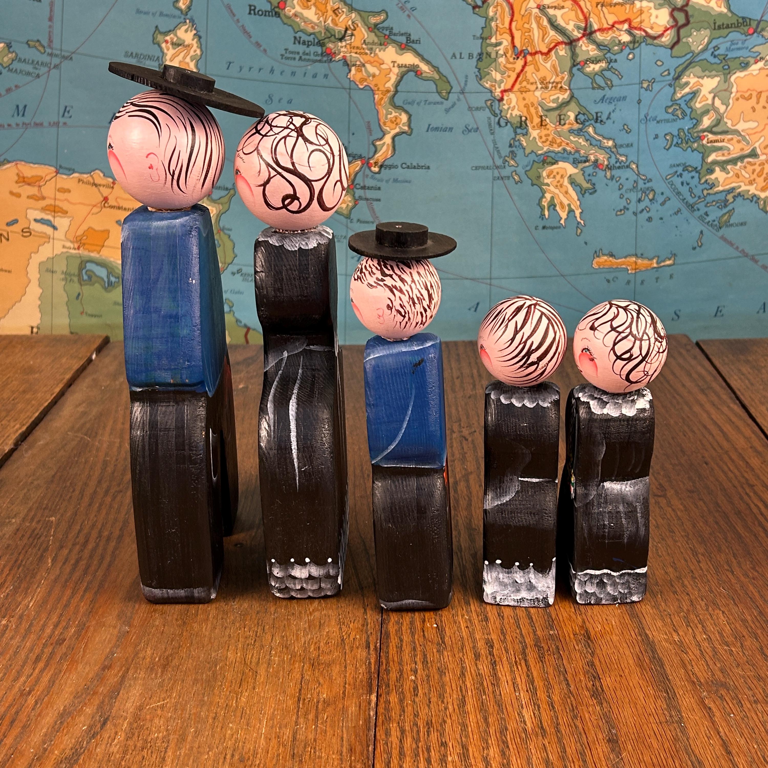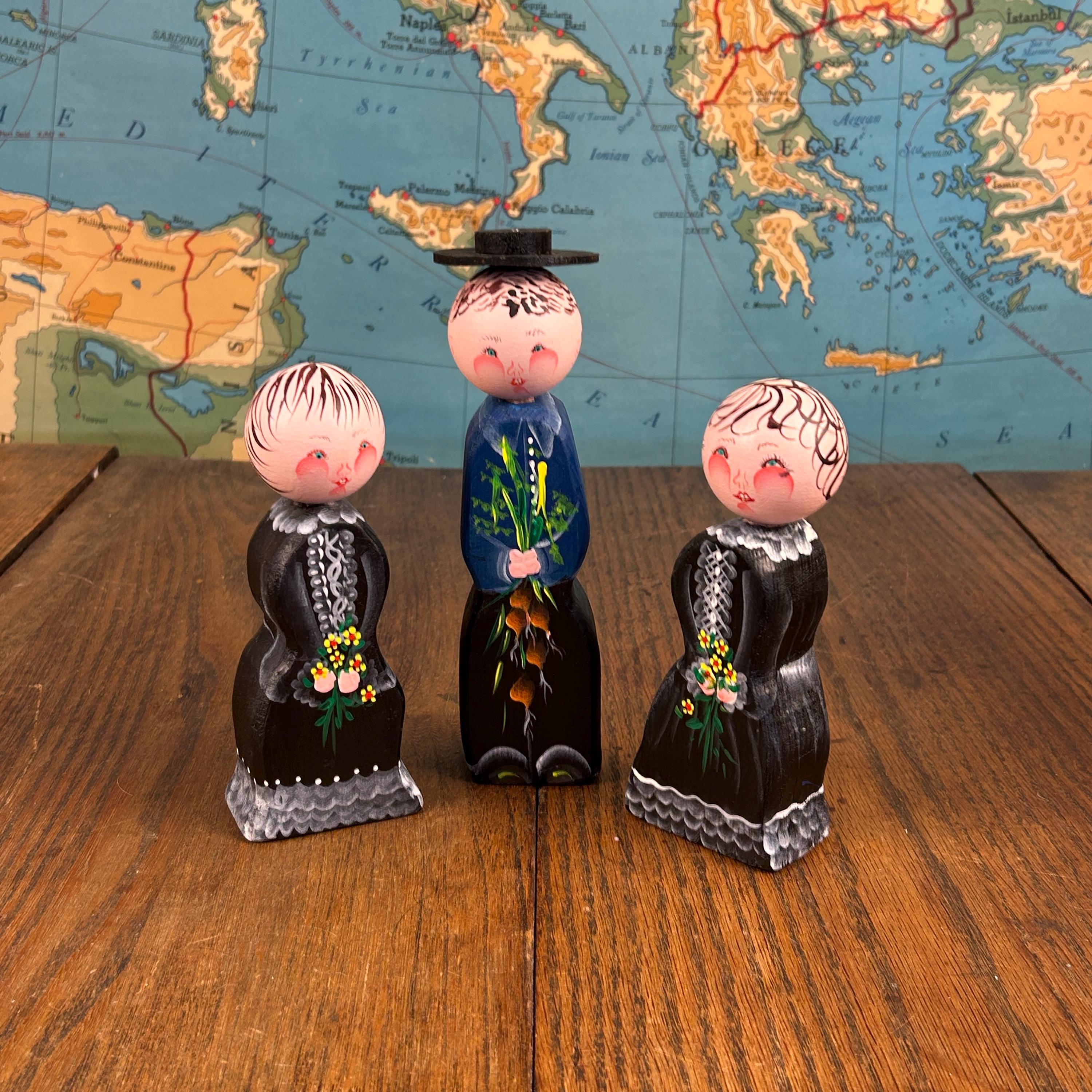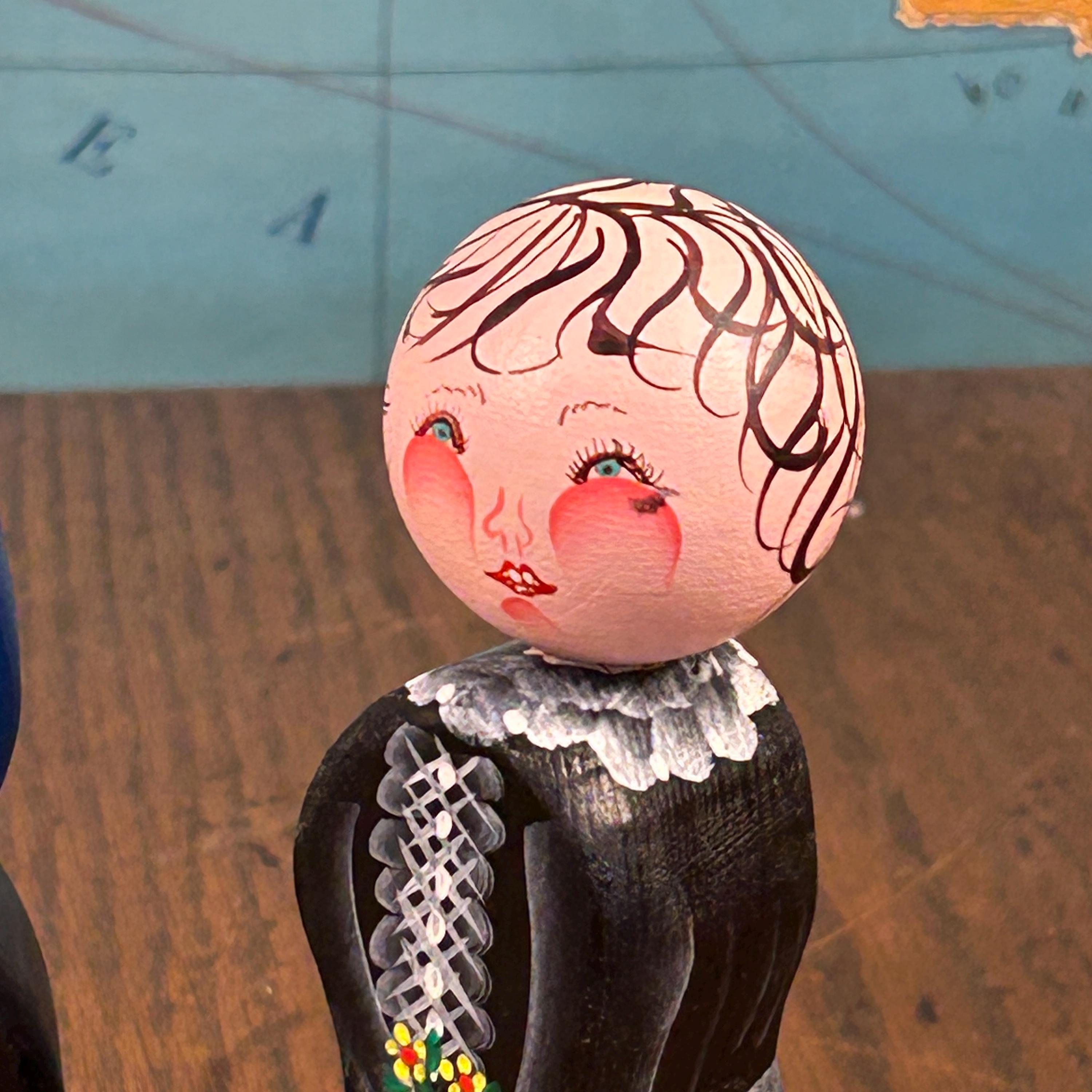 Their simple peg form and cheerful hand-painted details make them perfect for display on a shelf, in a curio cabinet, or as part of a seasonal or folk art collection.