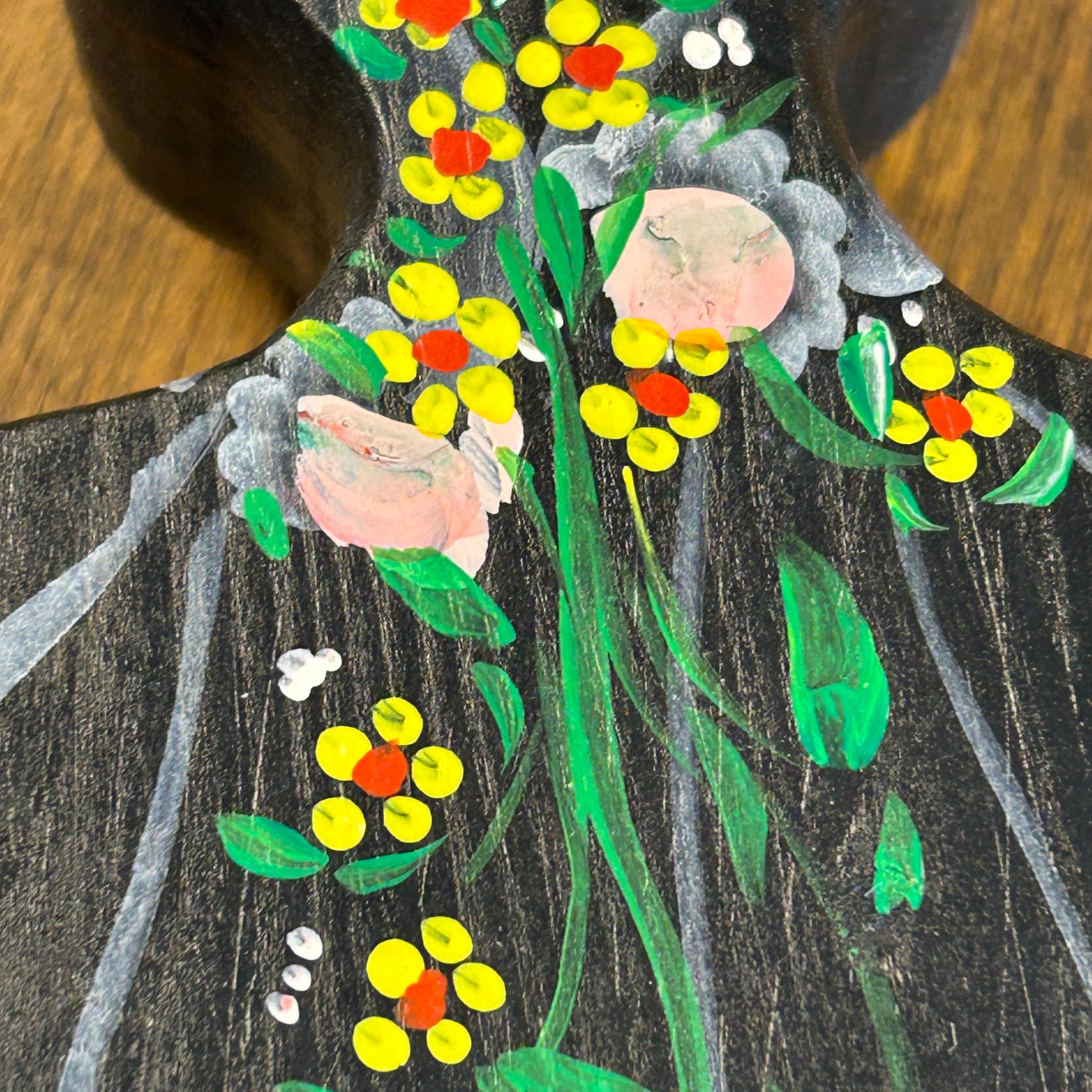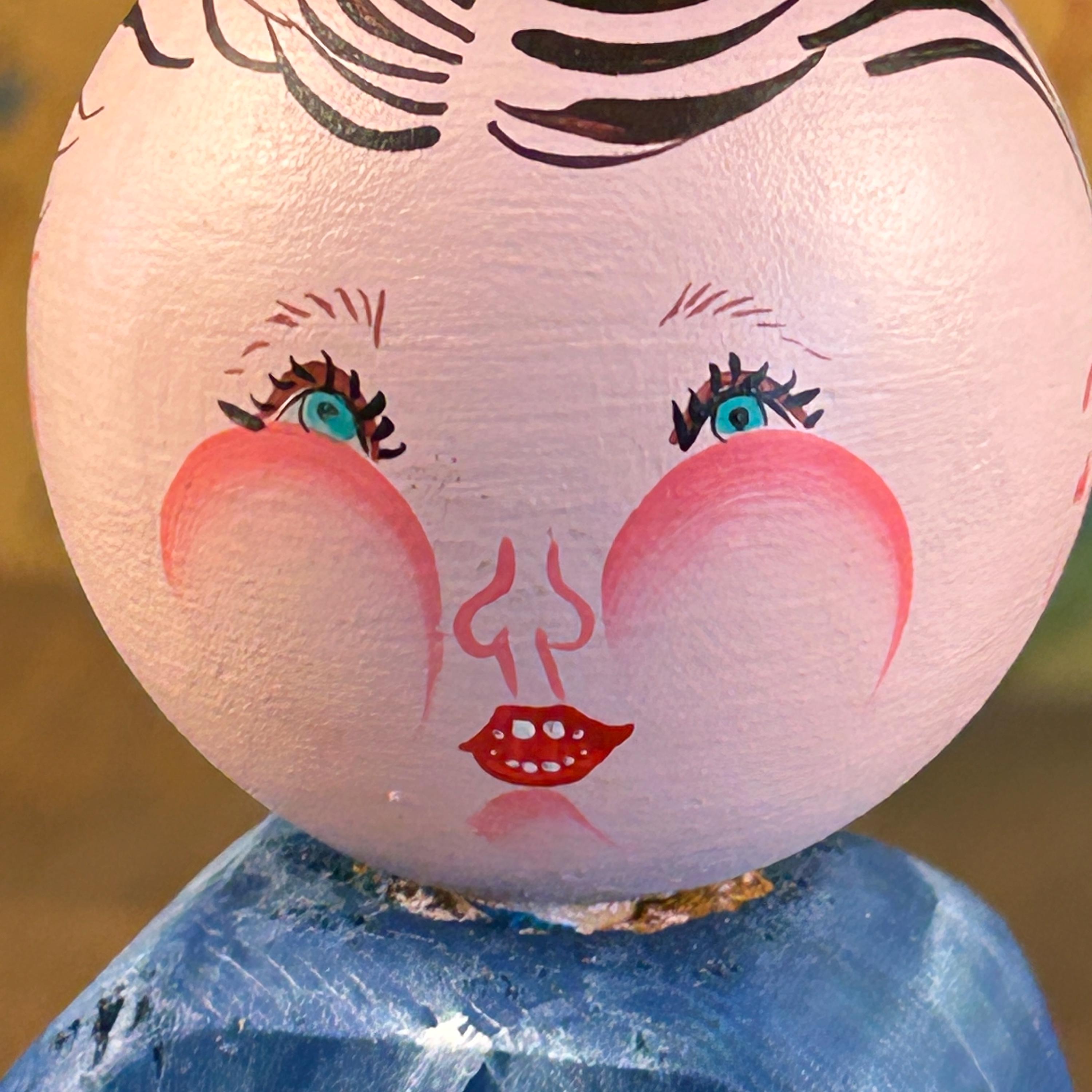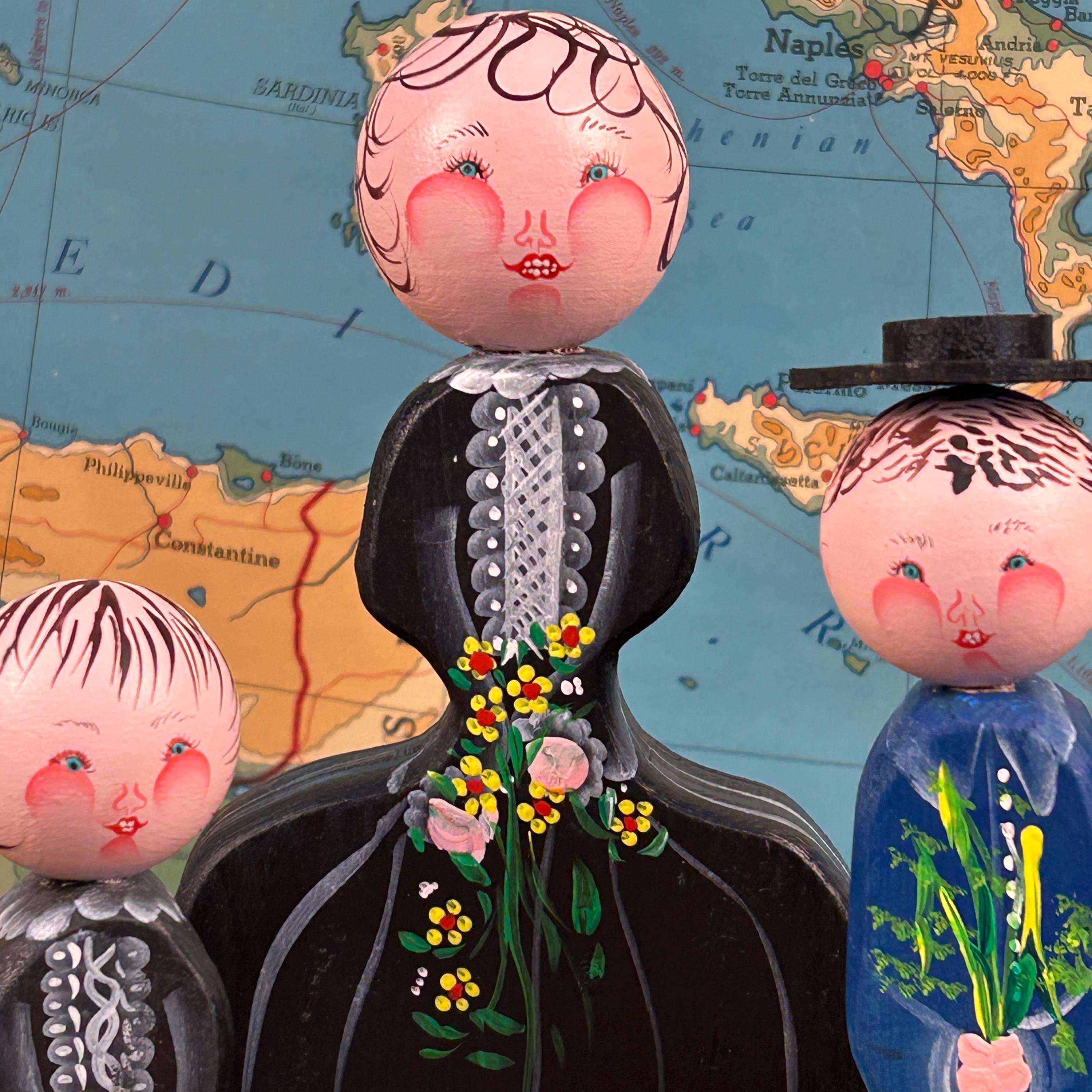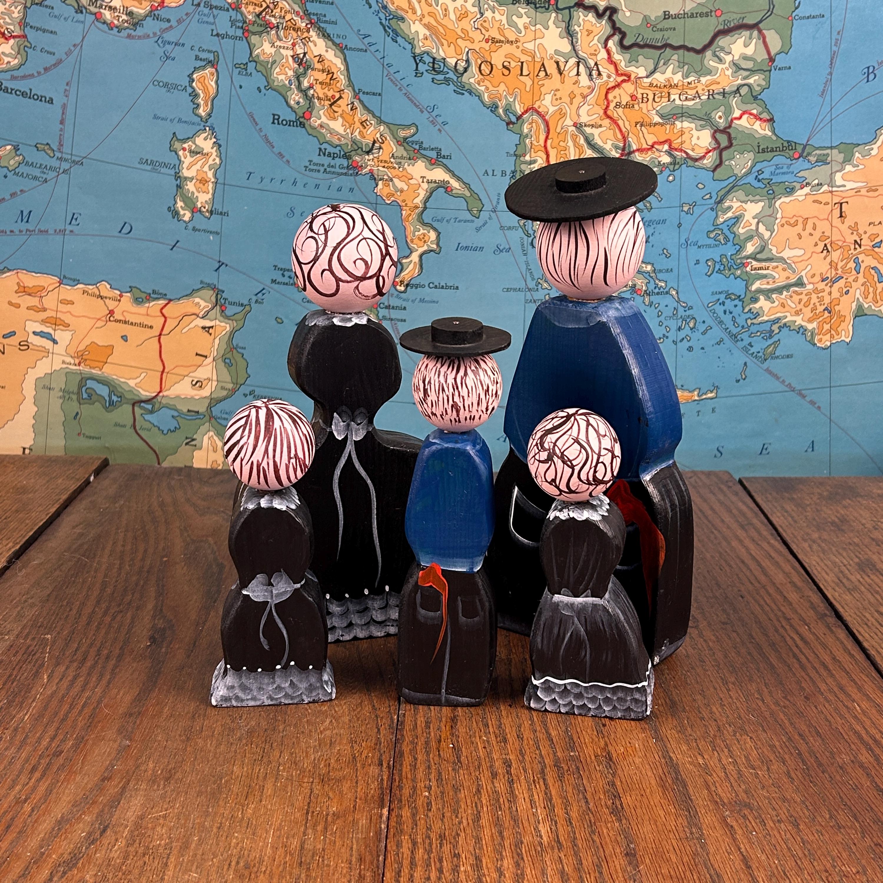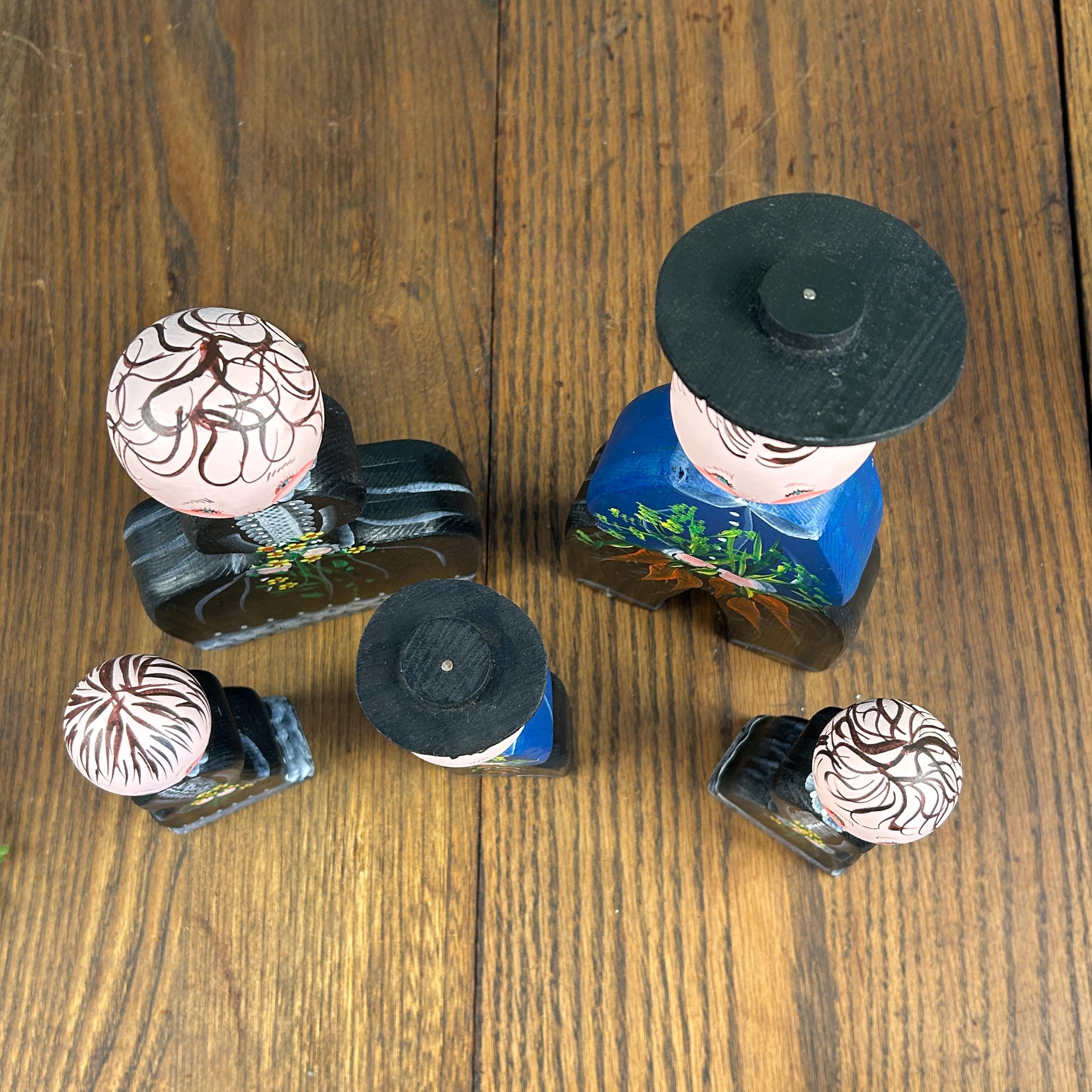 Their simple peg form and cheerful hand-painted details make them perfect for display on a shelf, in a curio cabinet, or as part of a seasonal or folk art collection.