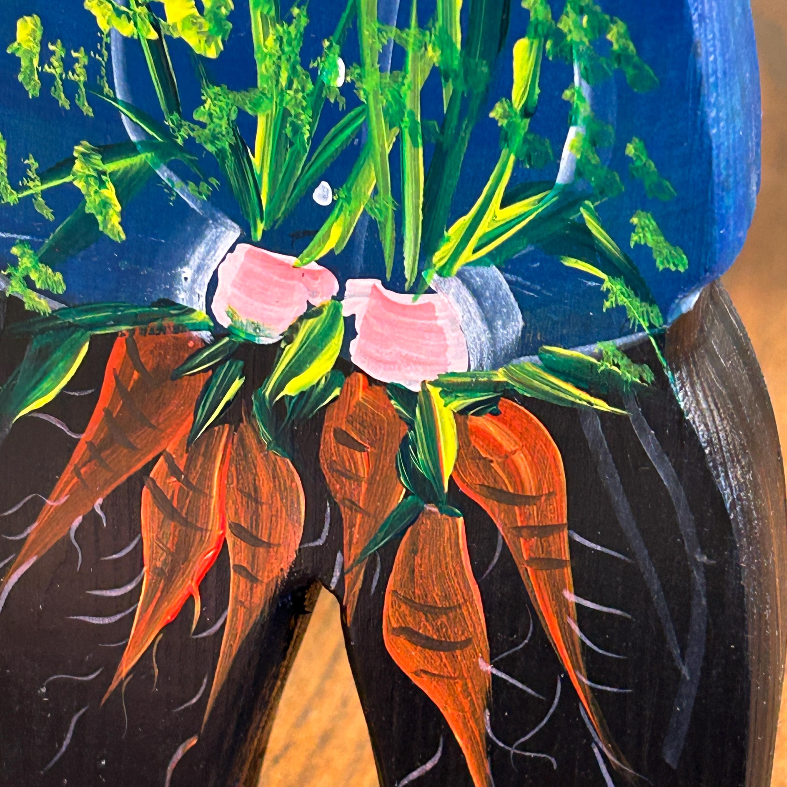 • Each figure holds painted flowers or vegetables