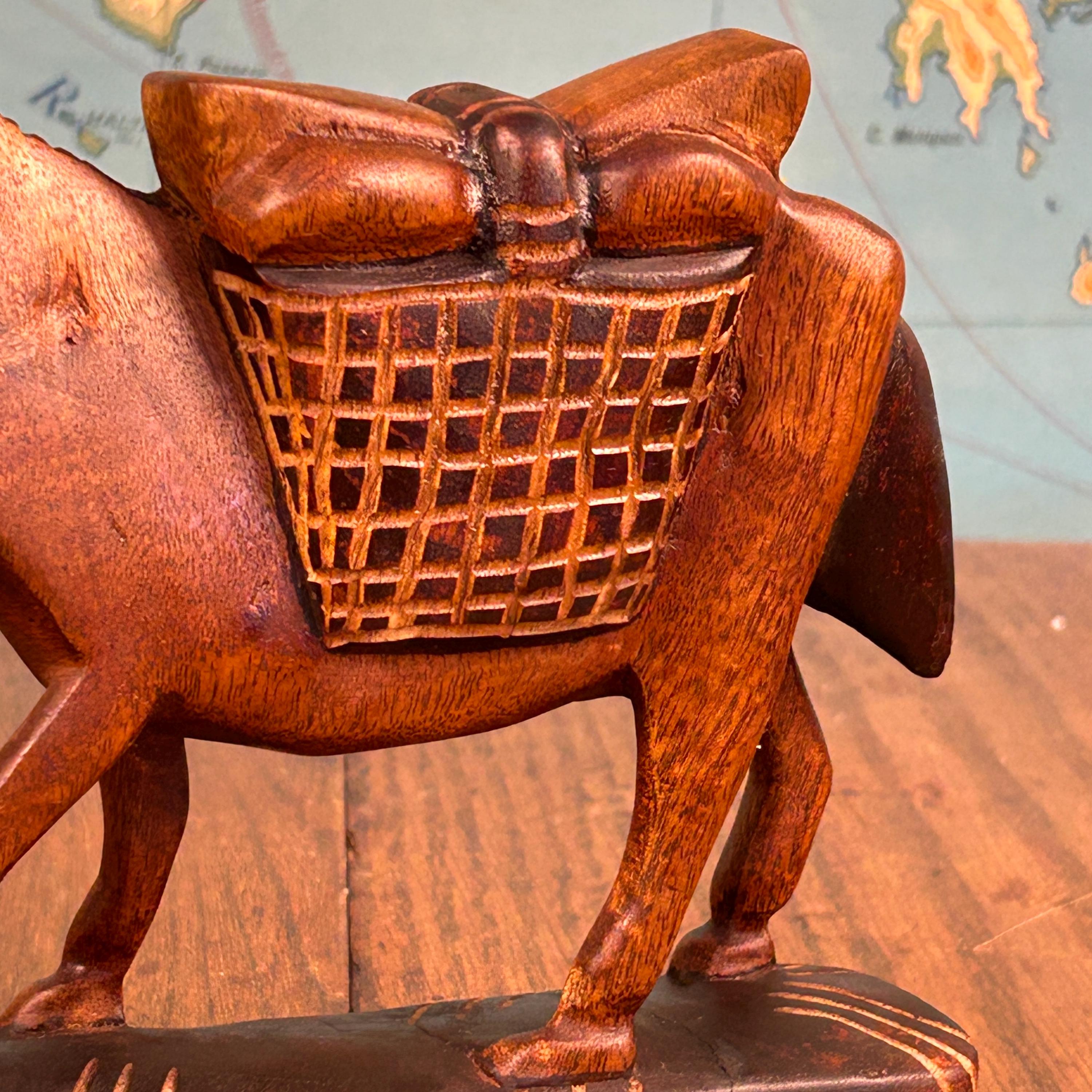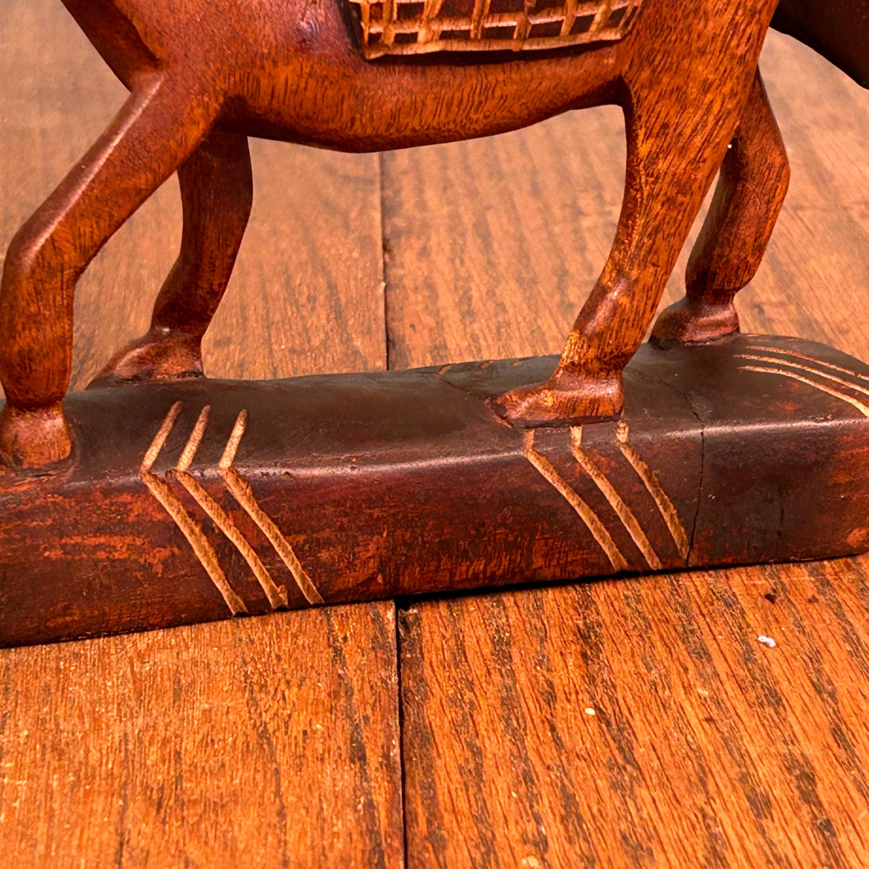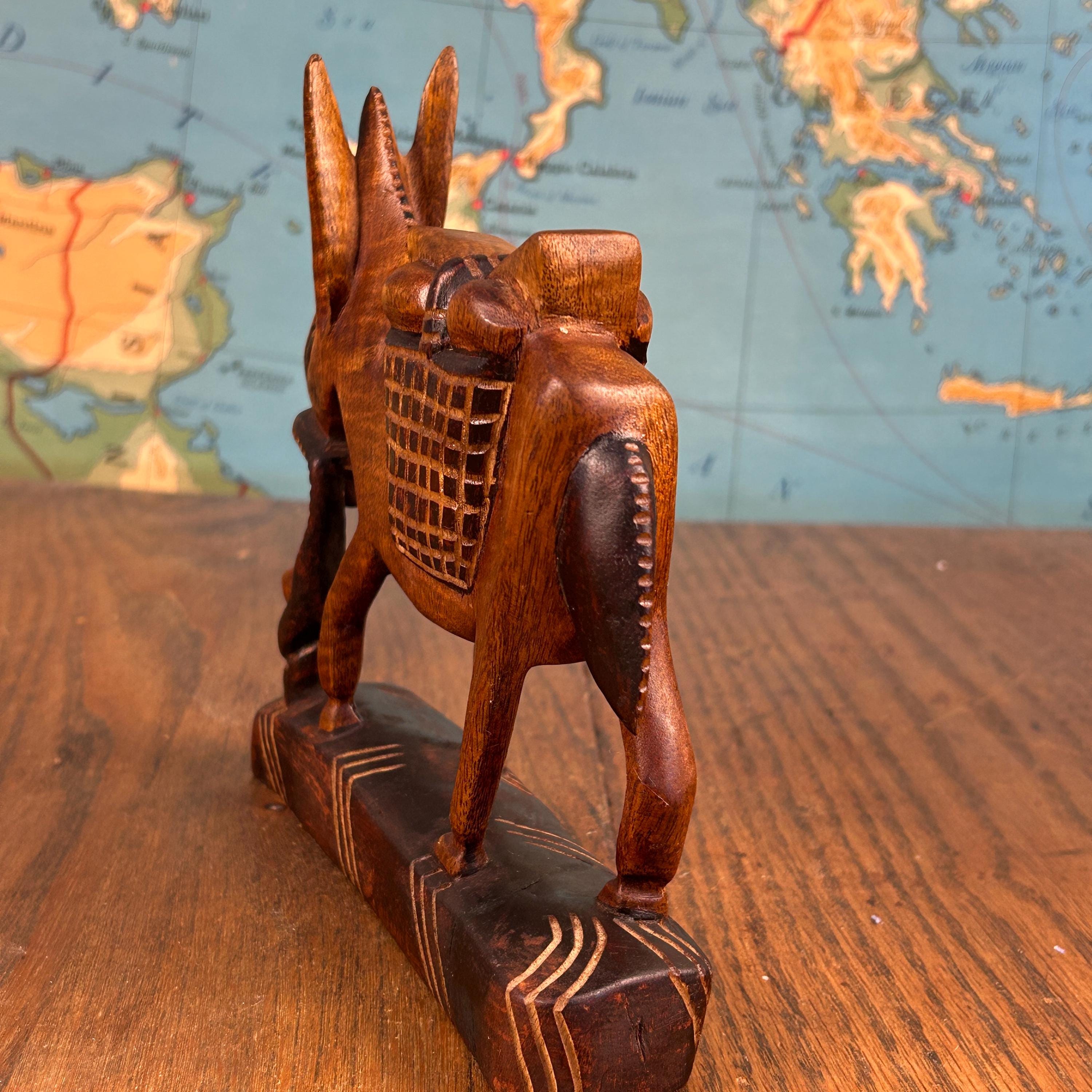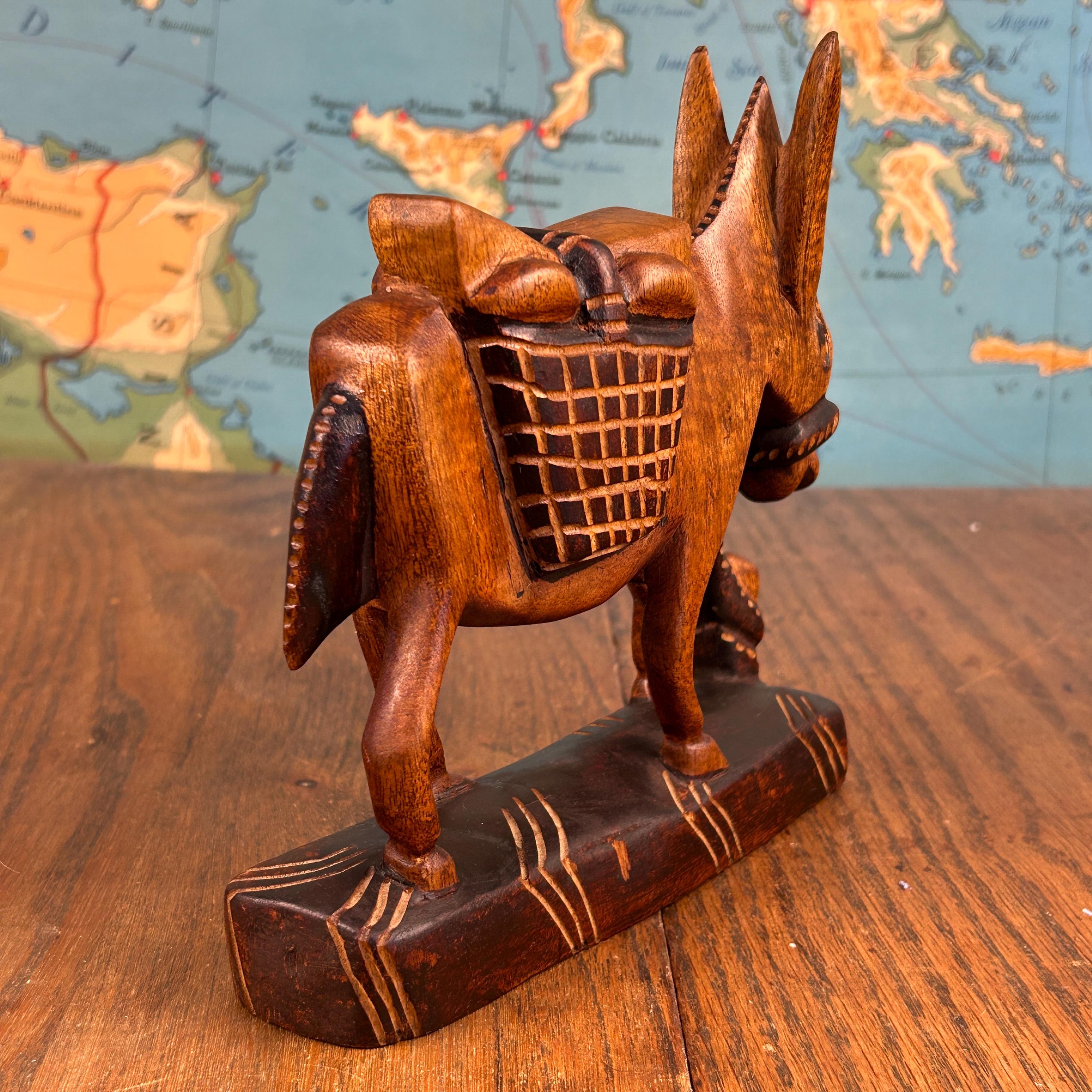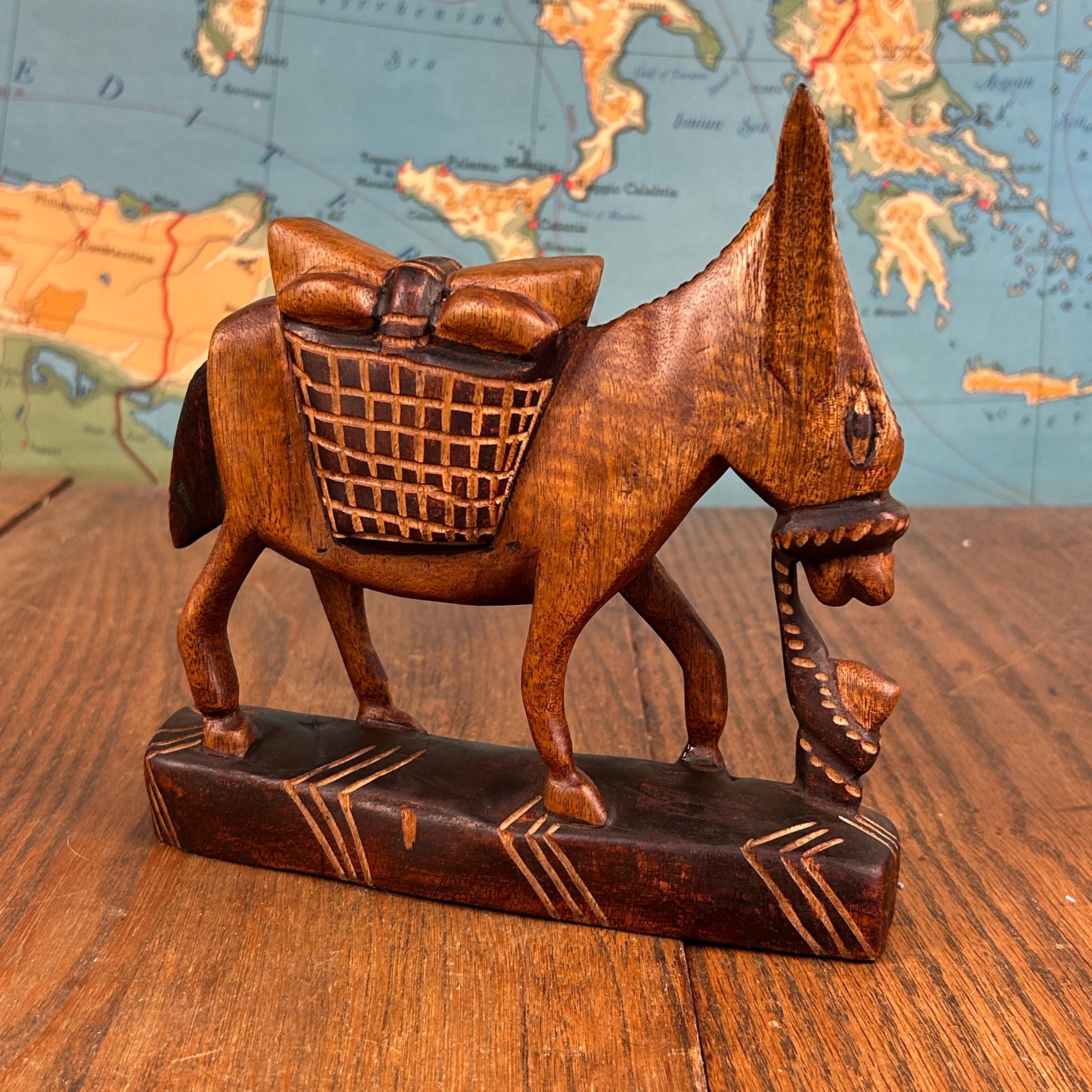 This vintage hand-carved wooden donkey figurine is full of rustic character and old-world charm. The donkey is shown carrying a basket on its back and even has a small pipe in its mouth, giving the piece a whimsical, storytelling feel.