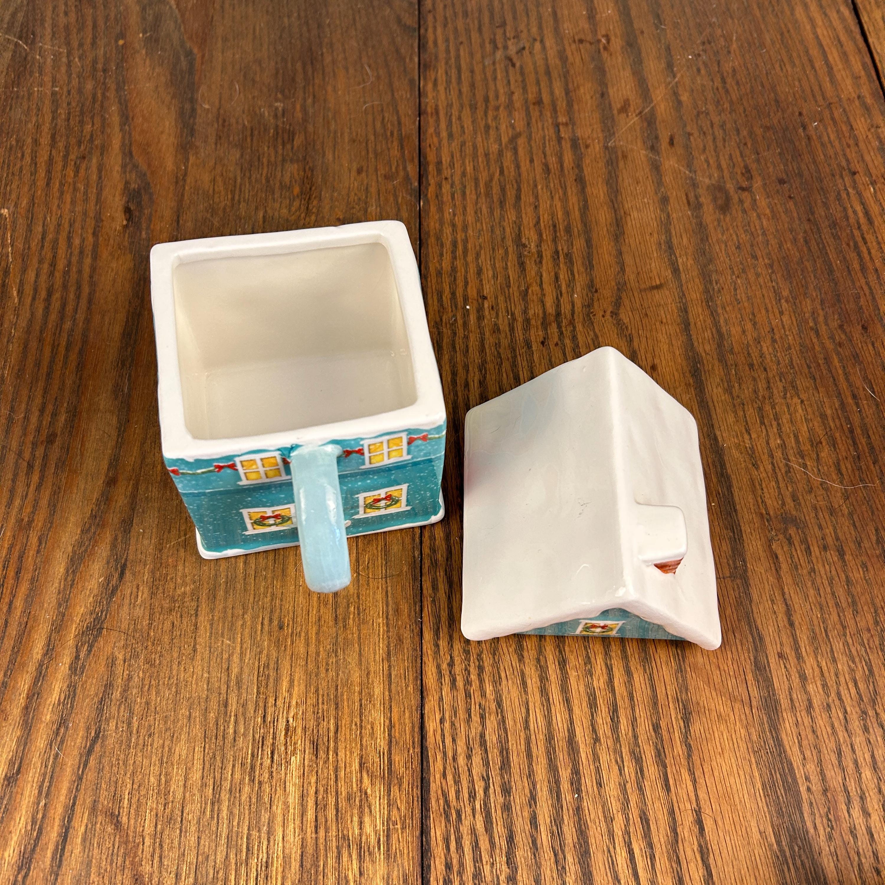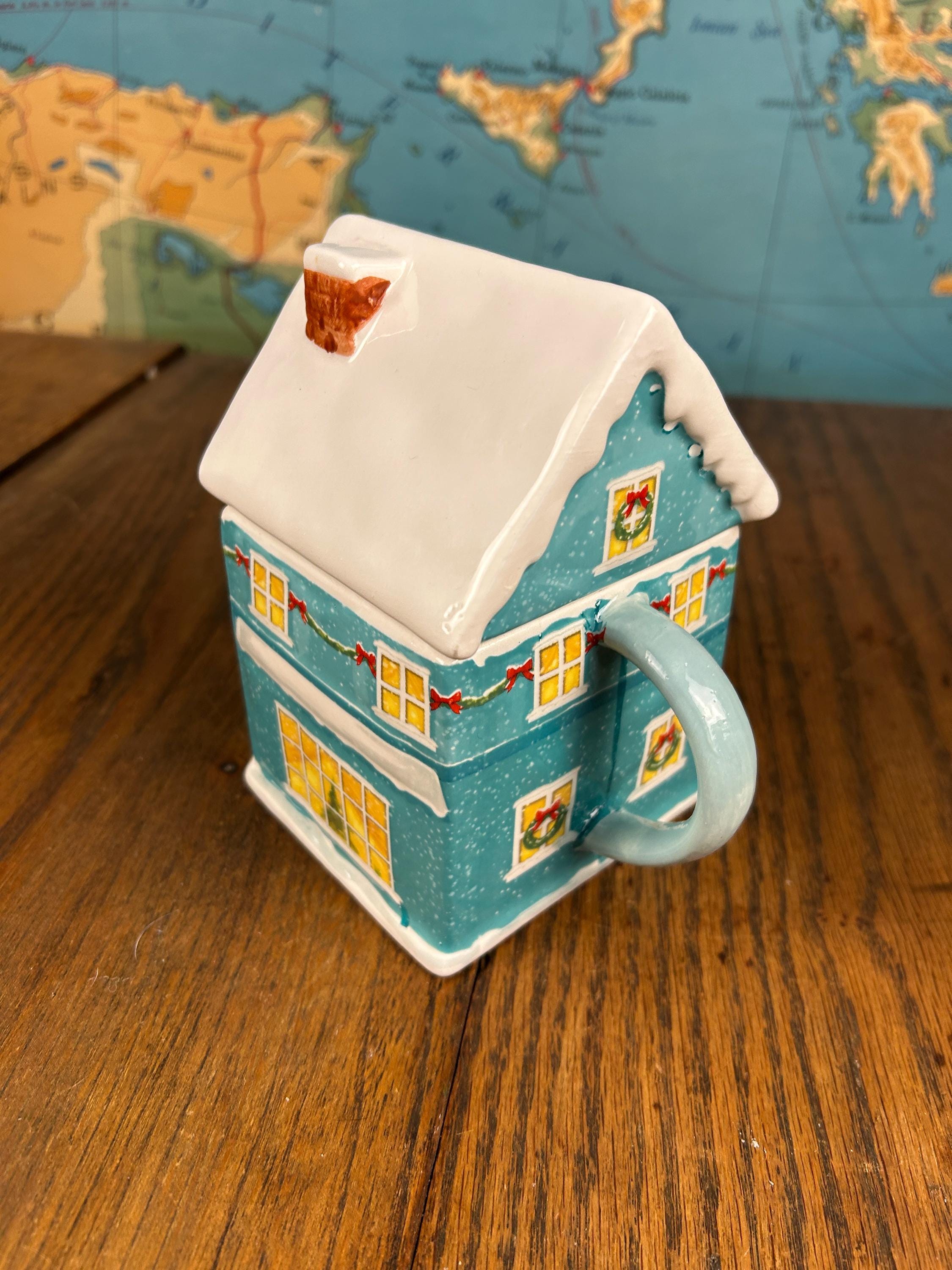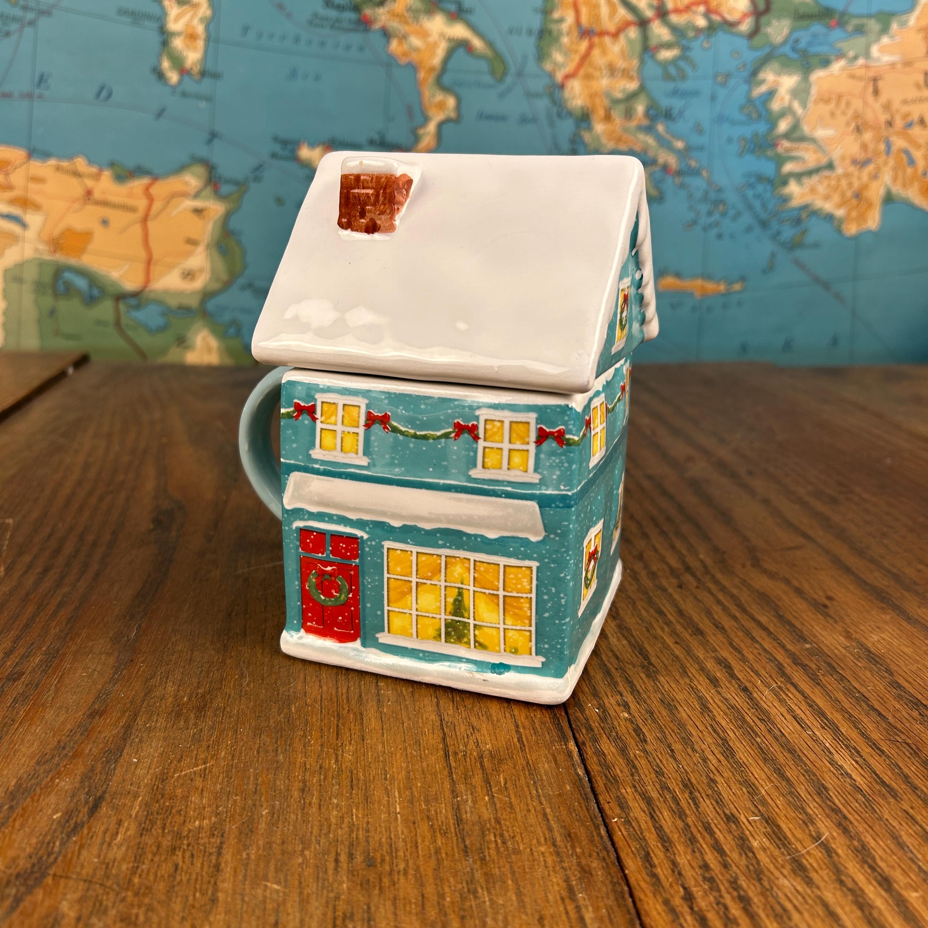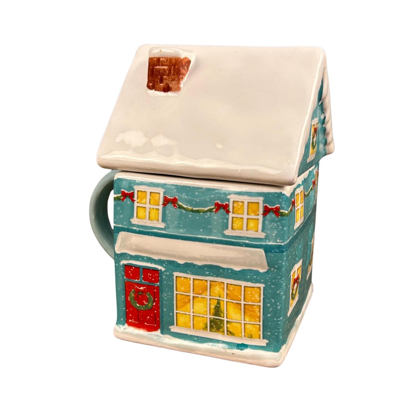 This ceramic mug is designed to look like a festive teal gingerbread-style house, complete with delightful seasonal details. The roof is topped with white “snow,” and the soft light blue handle adds a cheerful pop of color.