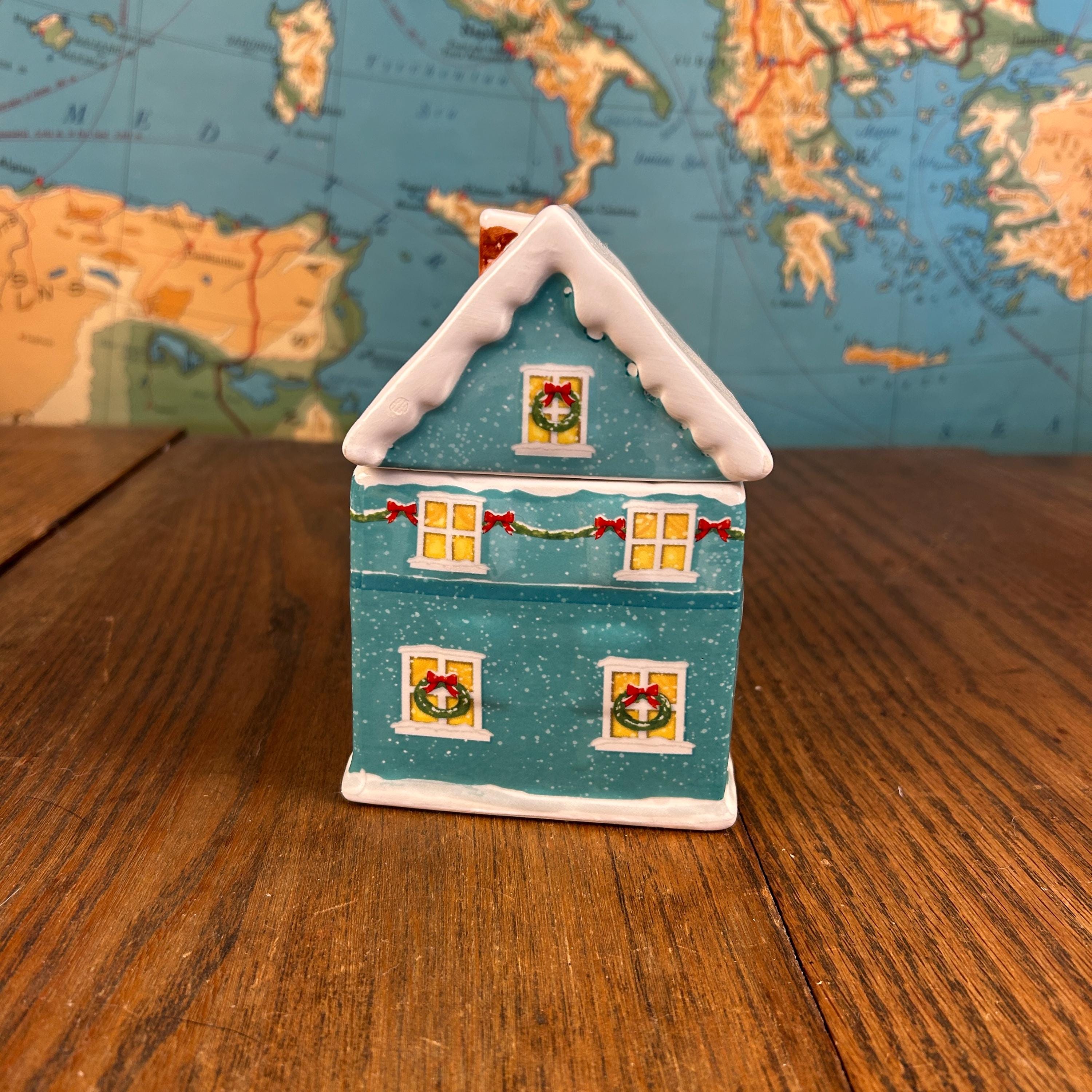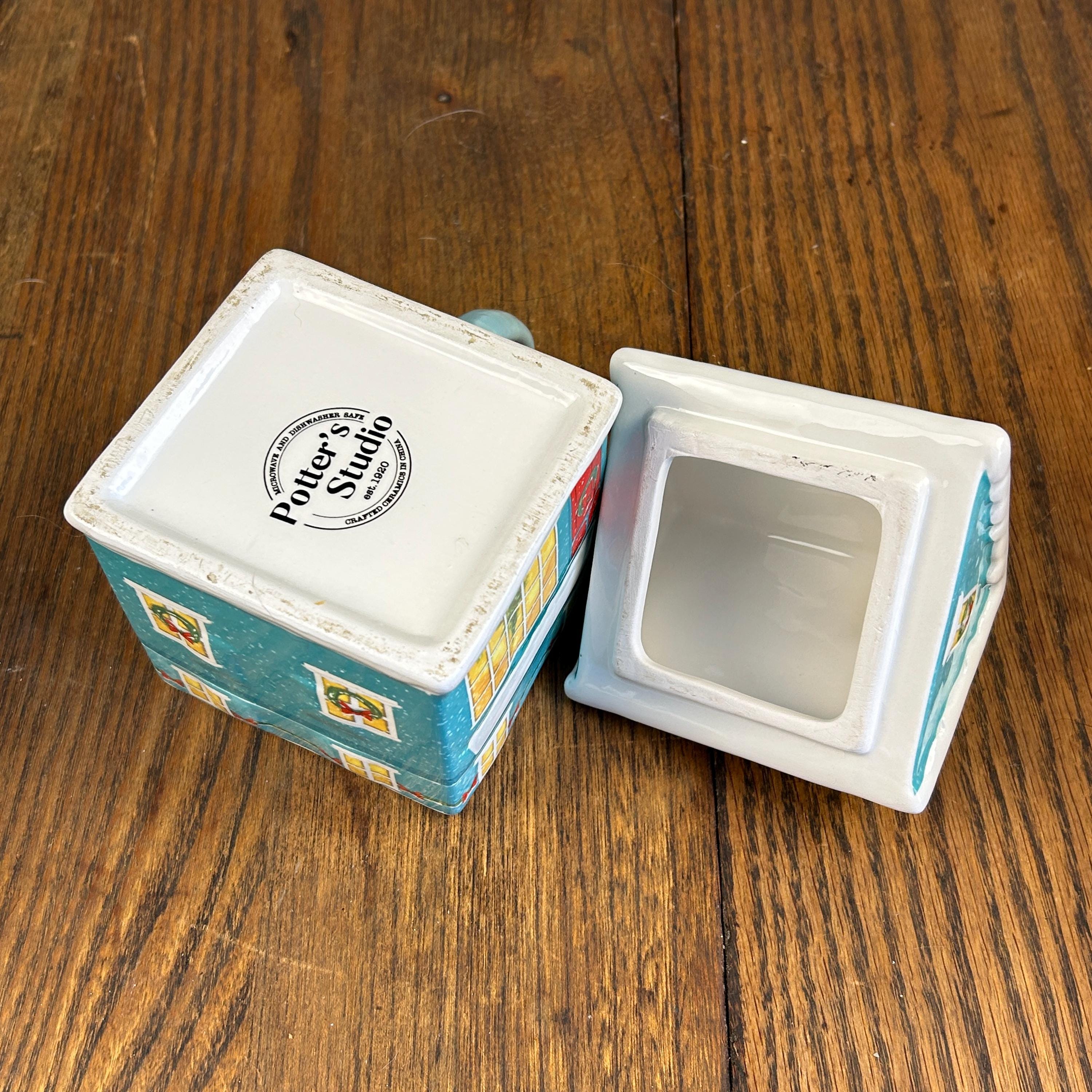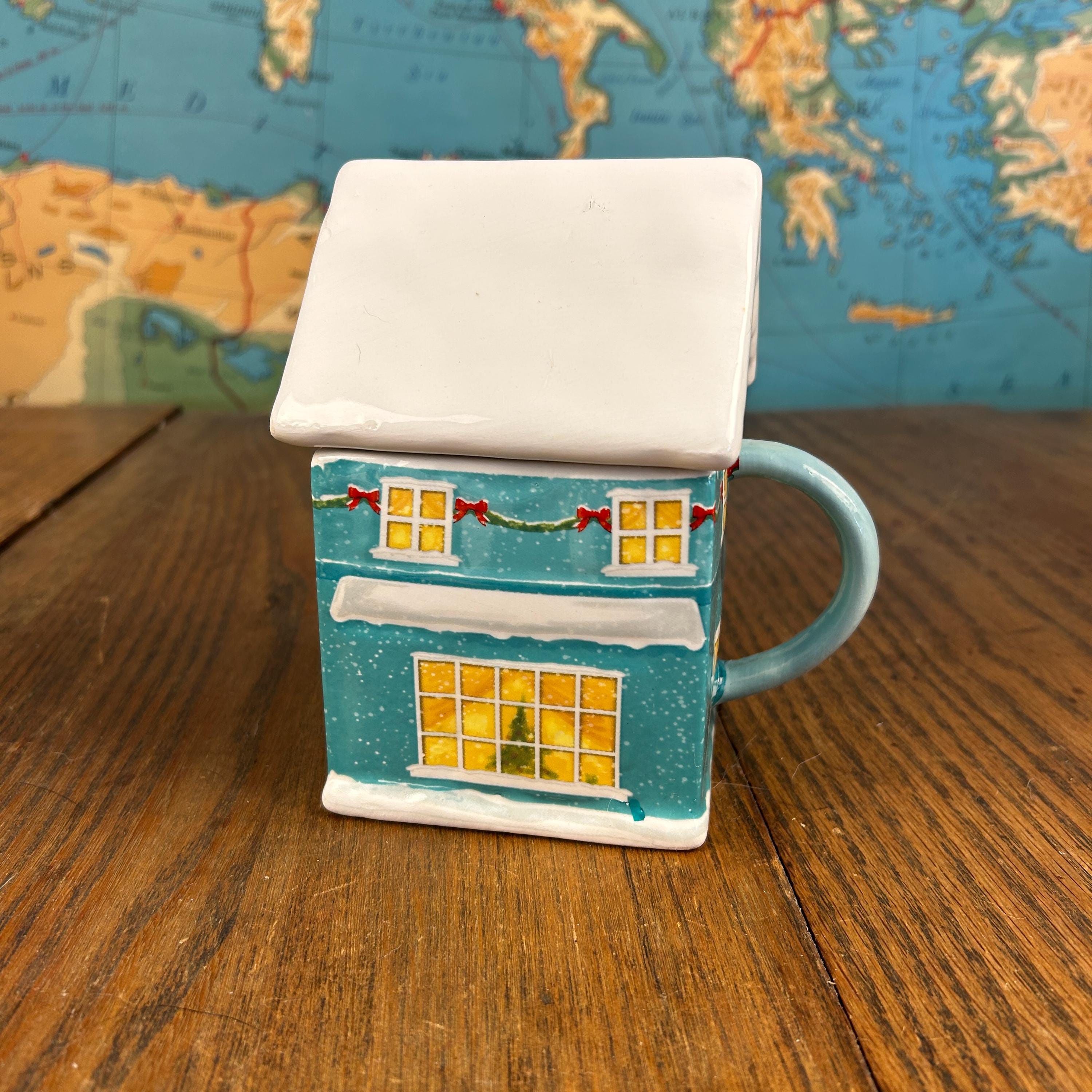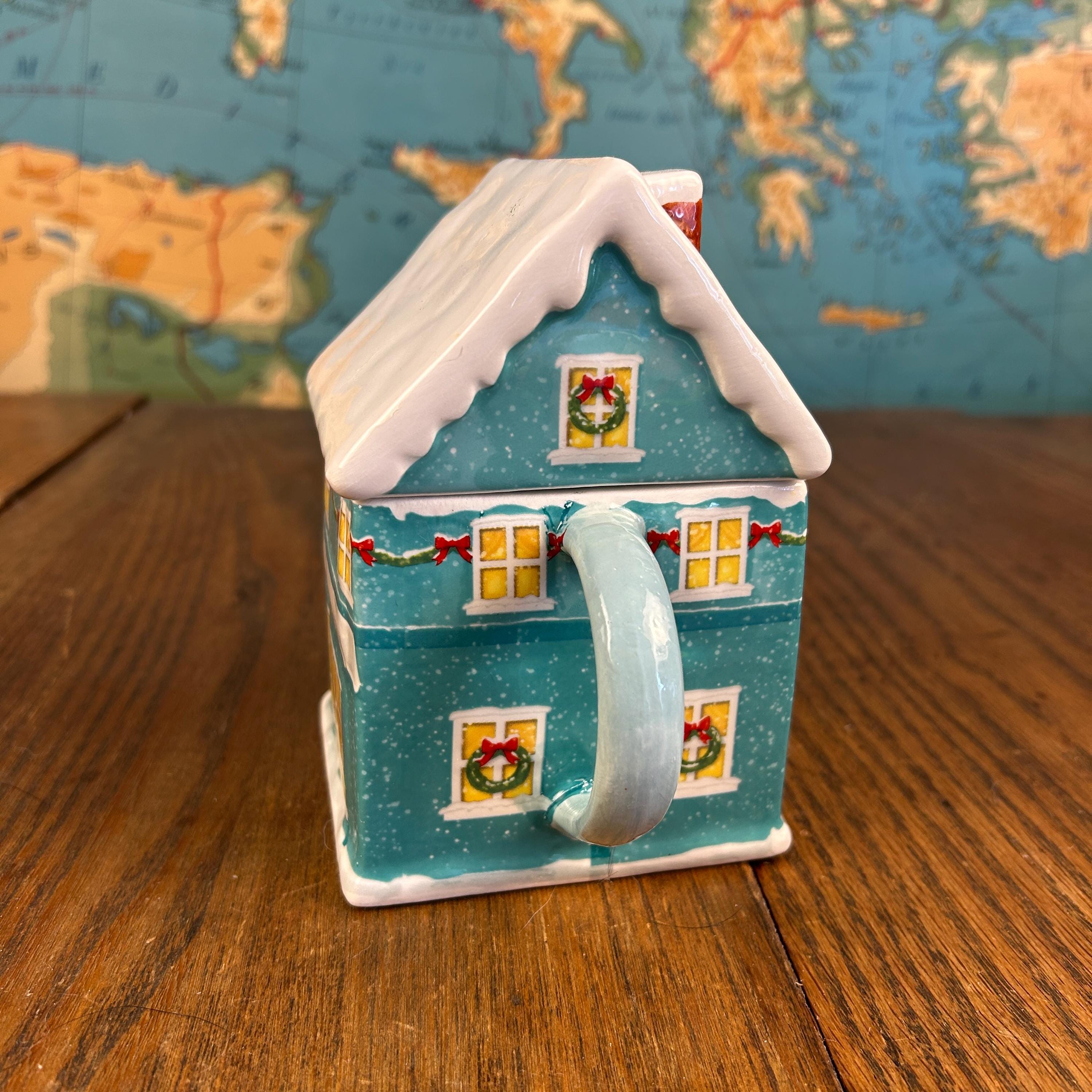 This ceramic mug is designed to look like a festive teal gingerbread-style house, complete with delightful seasonal details. The roof is topped with white “snow,” and the soft light blue handle adds a cheerful pop of color.