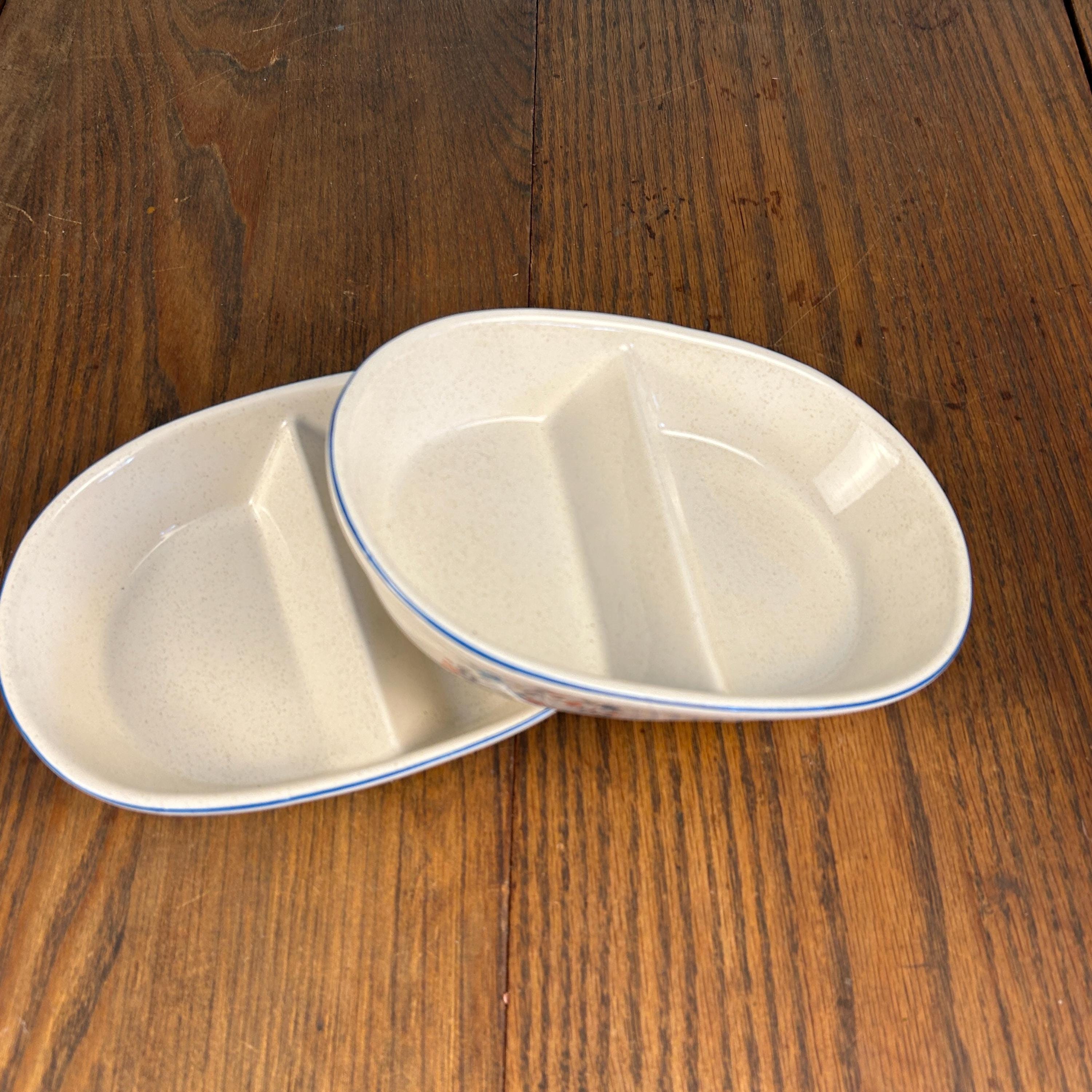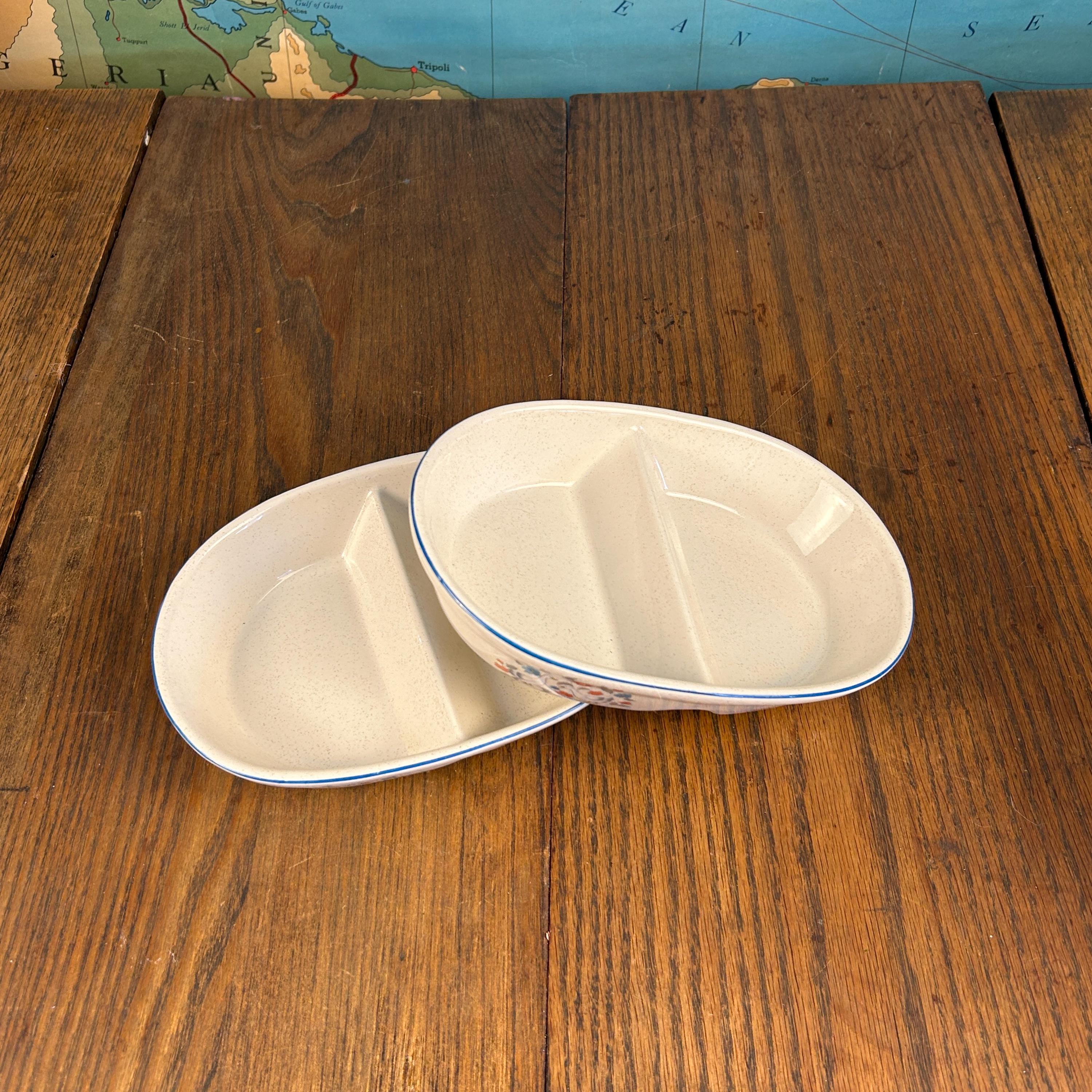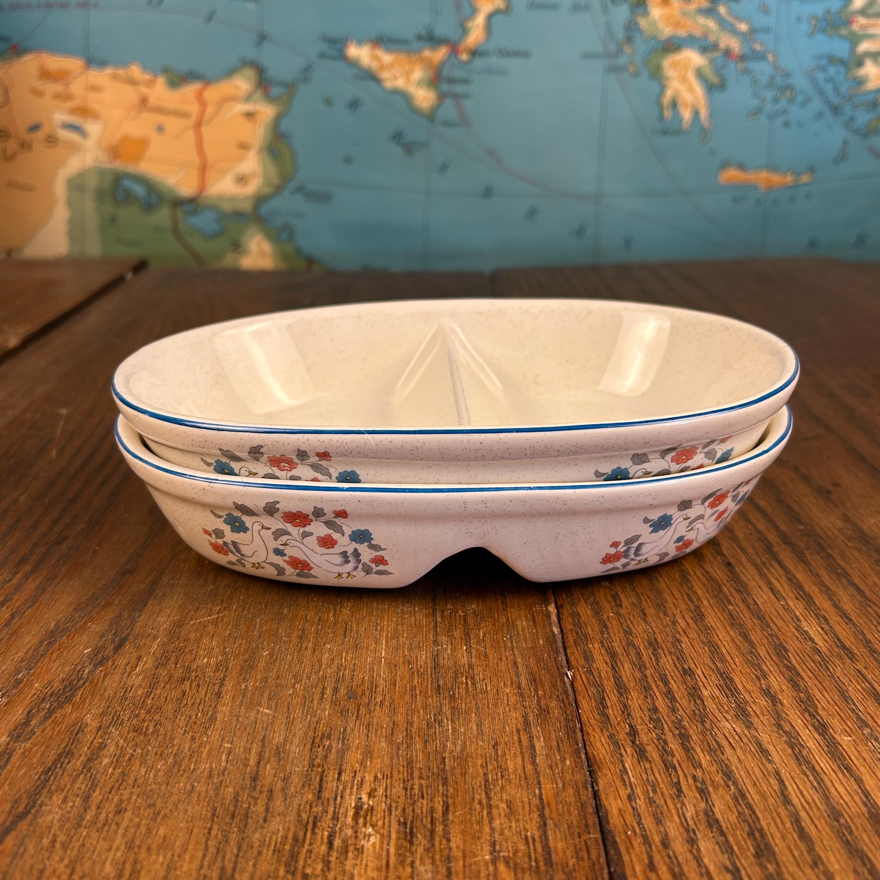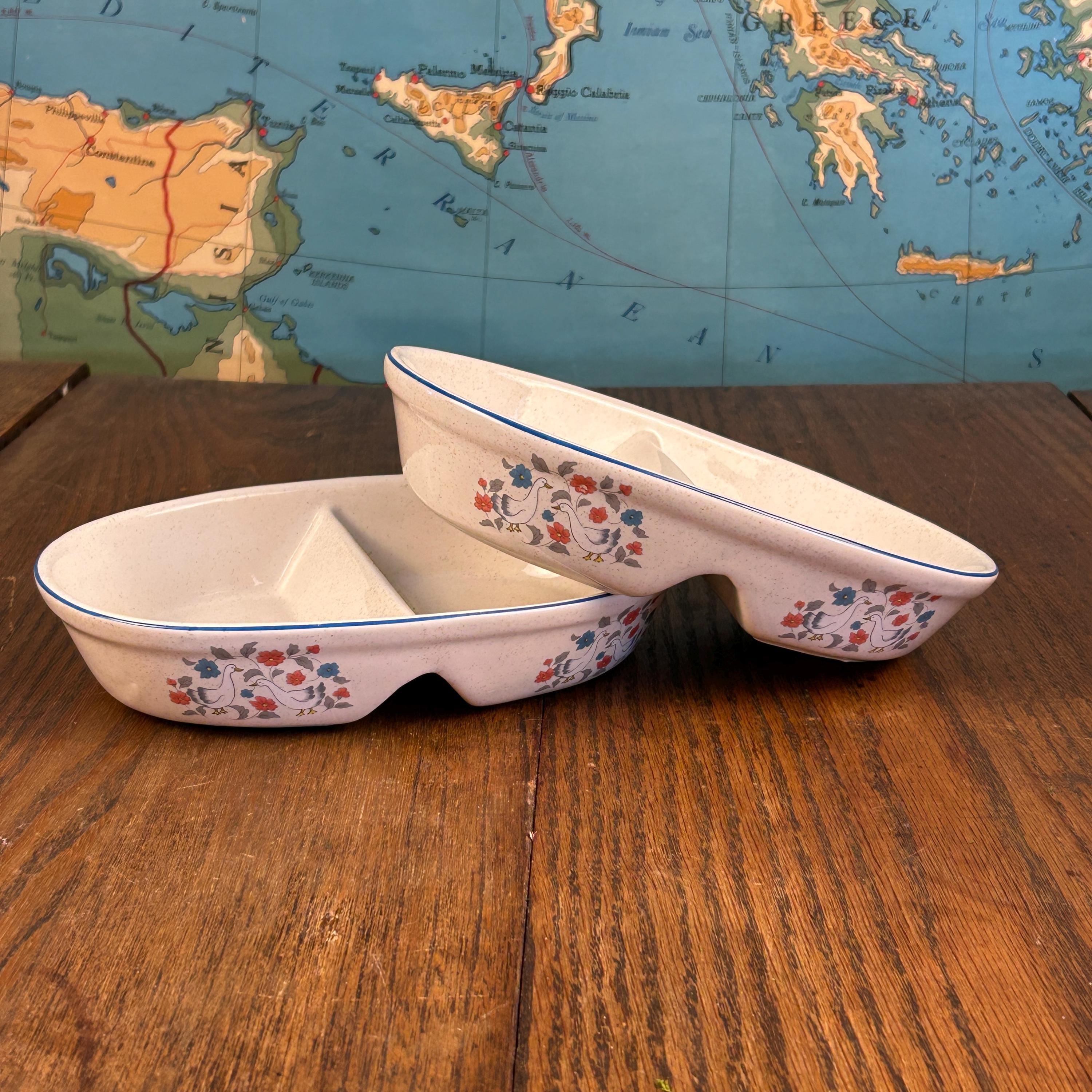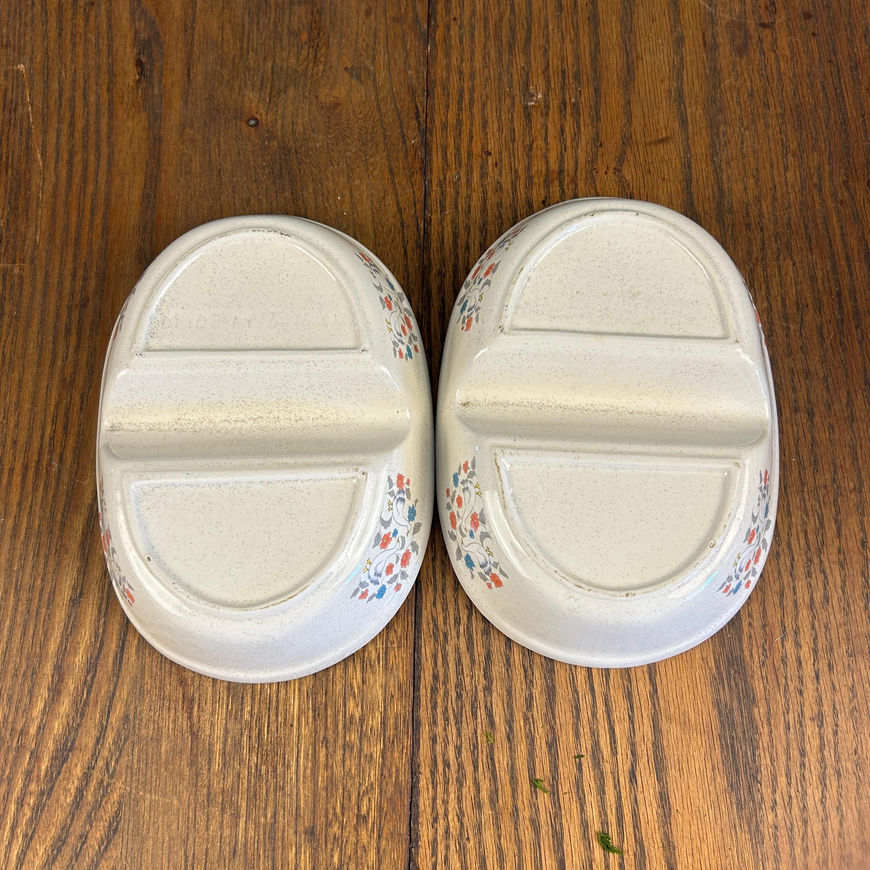 The divided design makes them ideal for serving vegetables, sides, relishes, or snacks, and the sturdy stoneware construction means they’re made to be used—not just displayed. Practical and decorative, they’re a great fit for farmhouse kitchens, country tables, or collectors of 1980s stoneware.