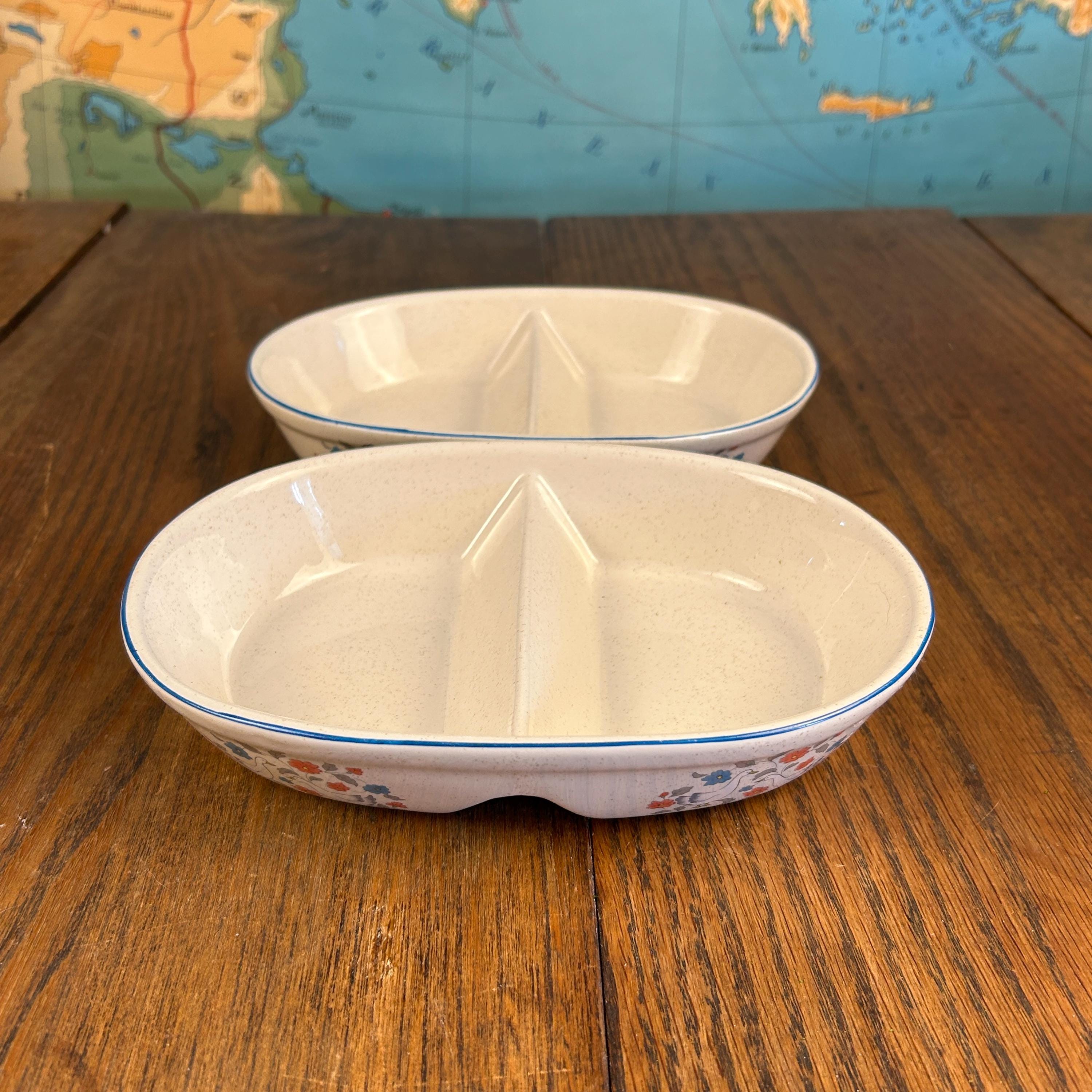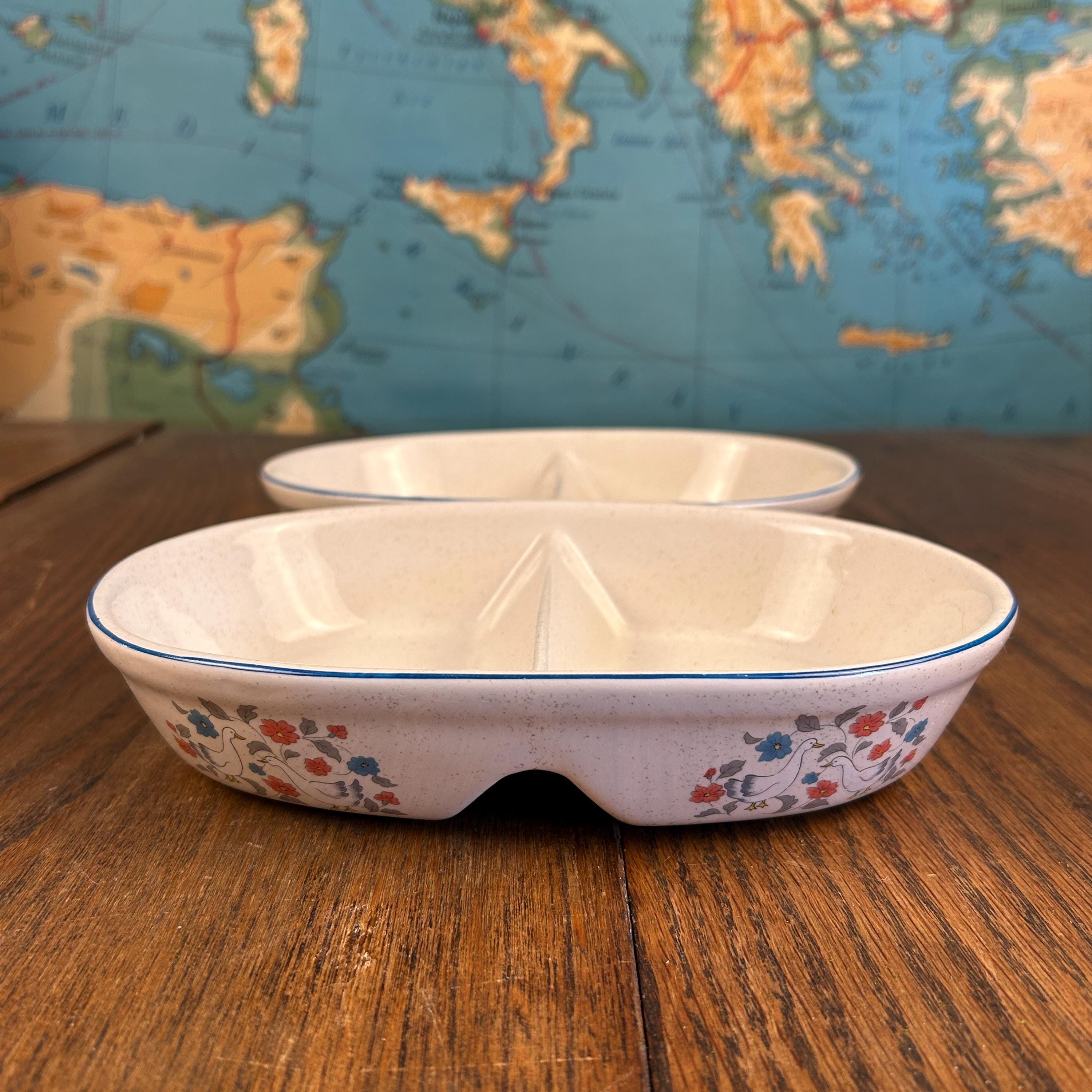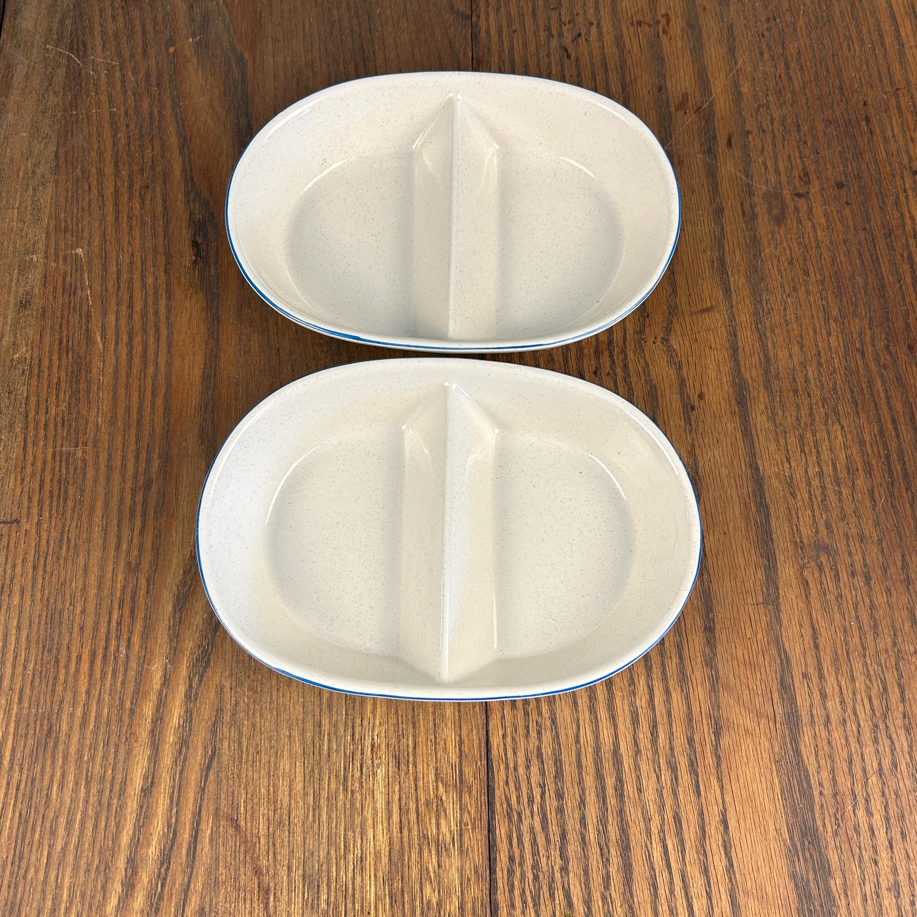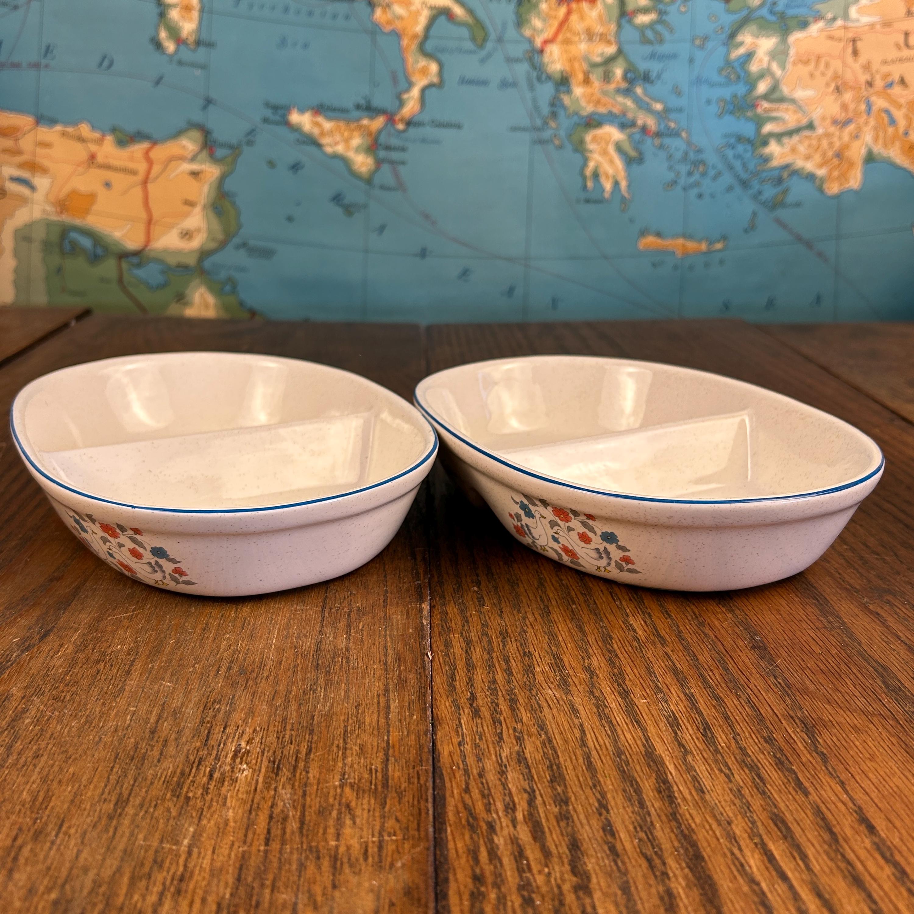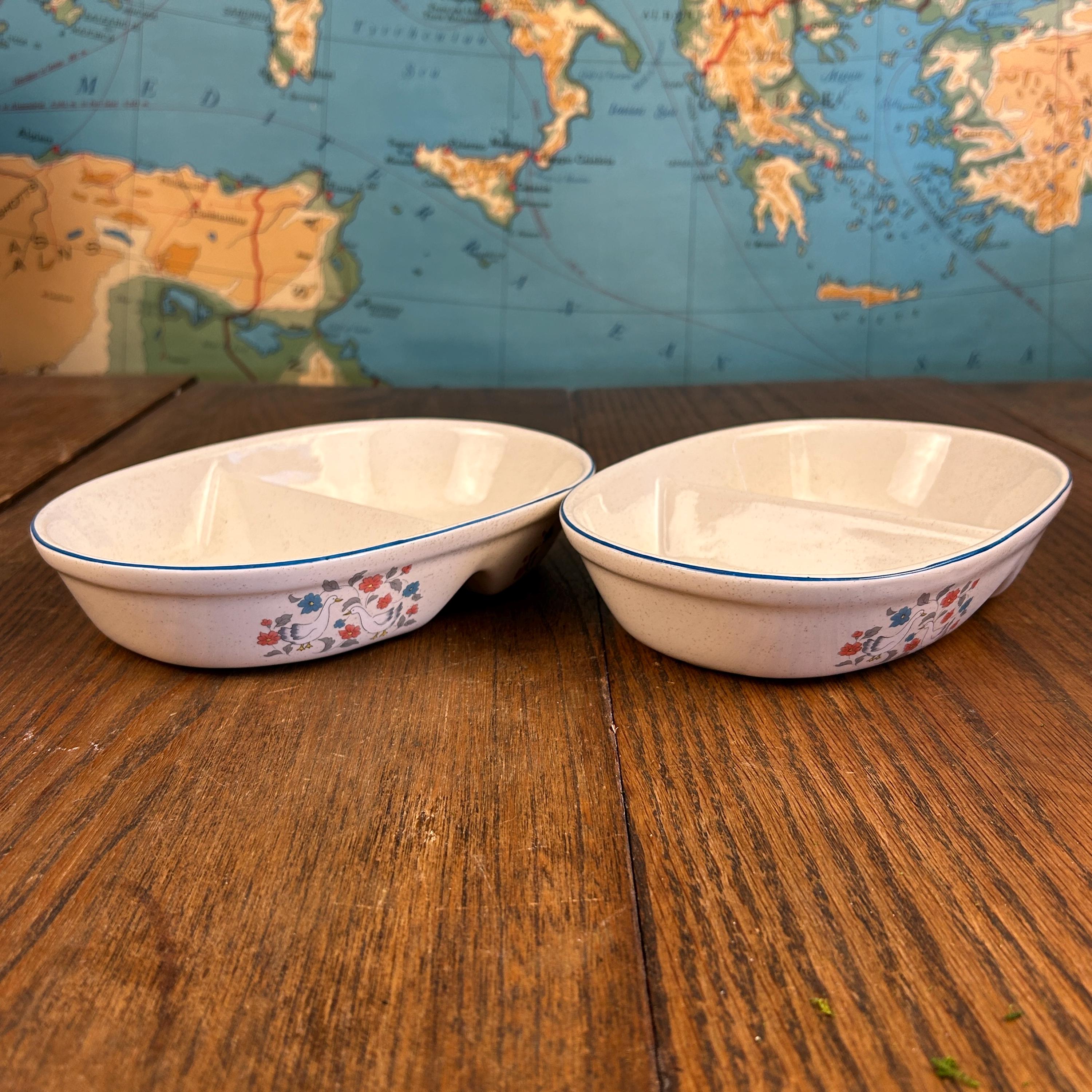 The divided design makes them ideal for serving vegetables, sides, relishes, or snacks, and the sturdy stoneware construction means they’re made to be used—not just displayed. Practical and decorative, they’re a great fit for farmhouse kitchens, country tables, or collectors of 1980s stoneware.
