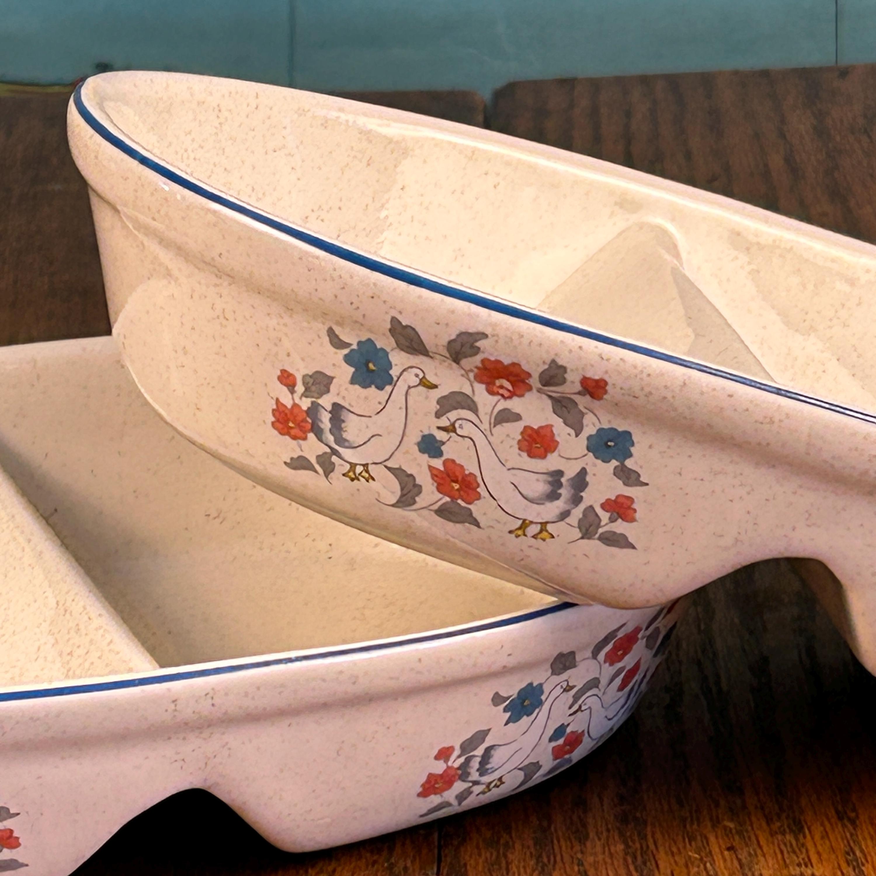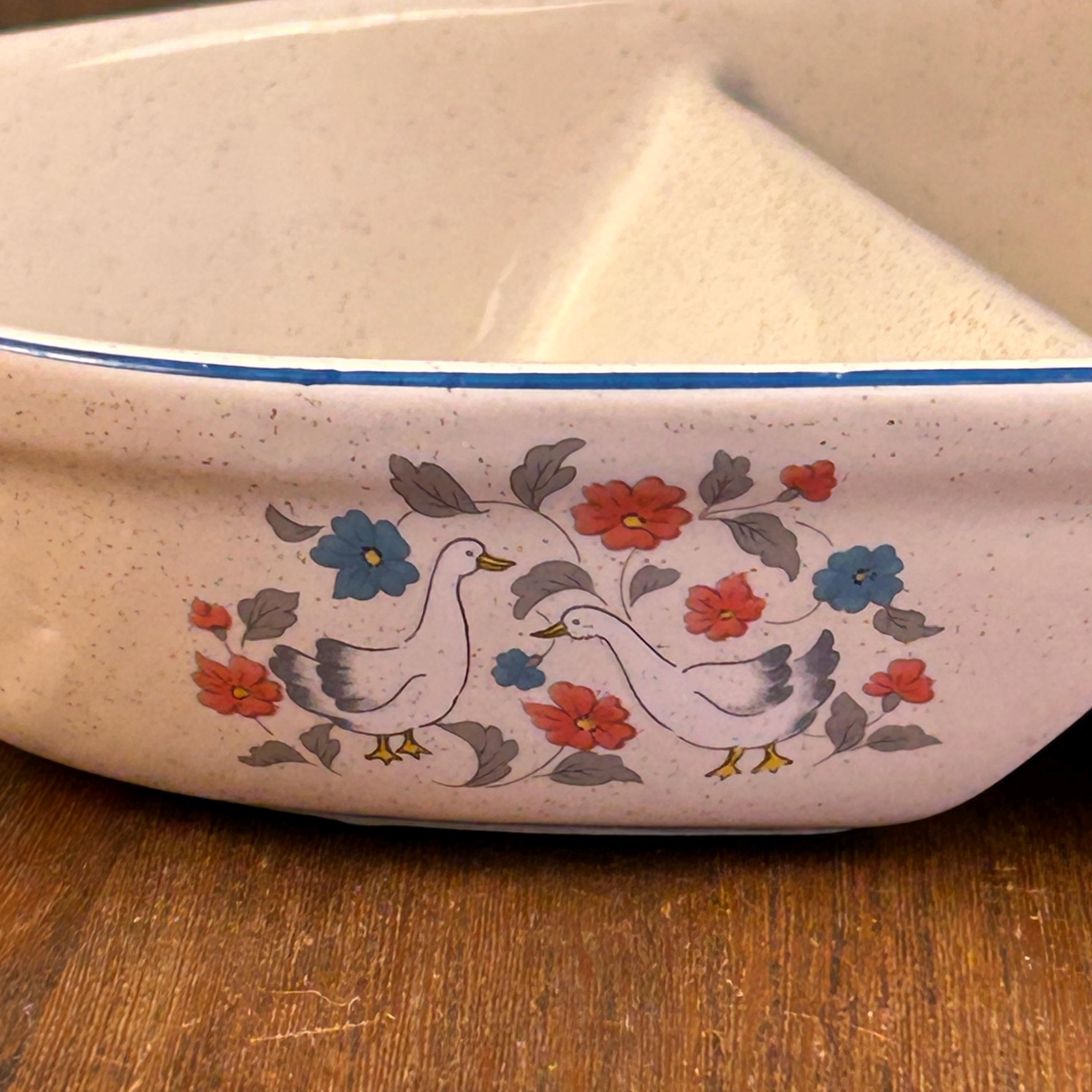 This is a set of vintage Action Stoneware divided serving dishes from the “Country Classics” collection, produced by Action Industries, Inc. in 1988. Made in Japan from heavy stoneware pottery, these pieces feature a charming geese and floral motif that perfectly captures classic country kitchen style.