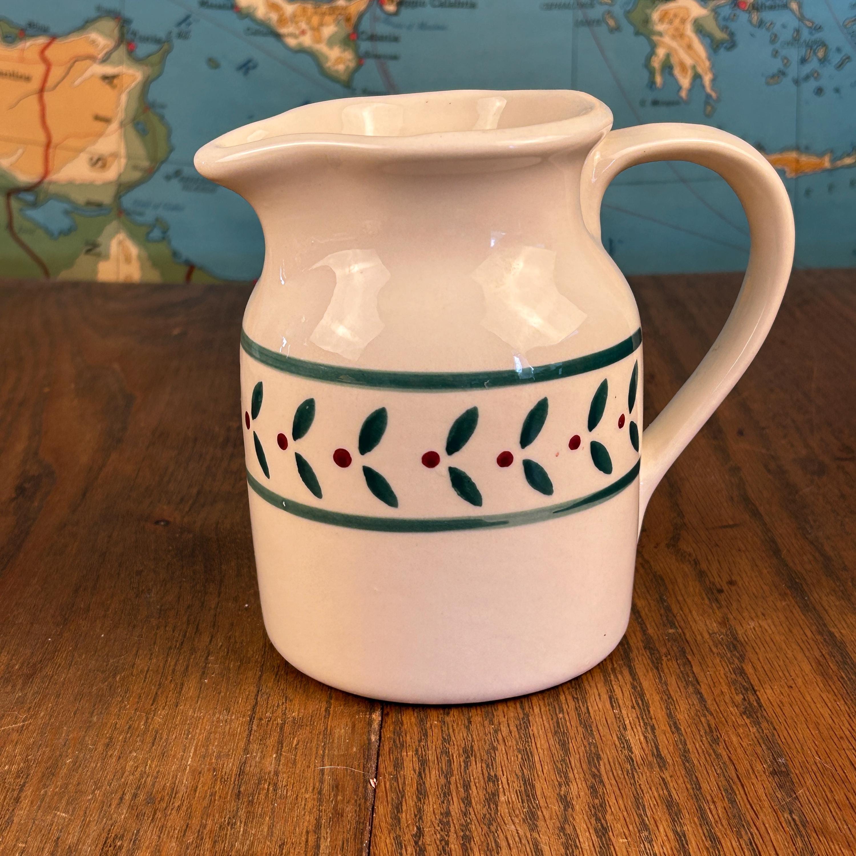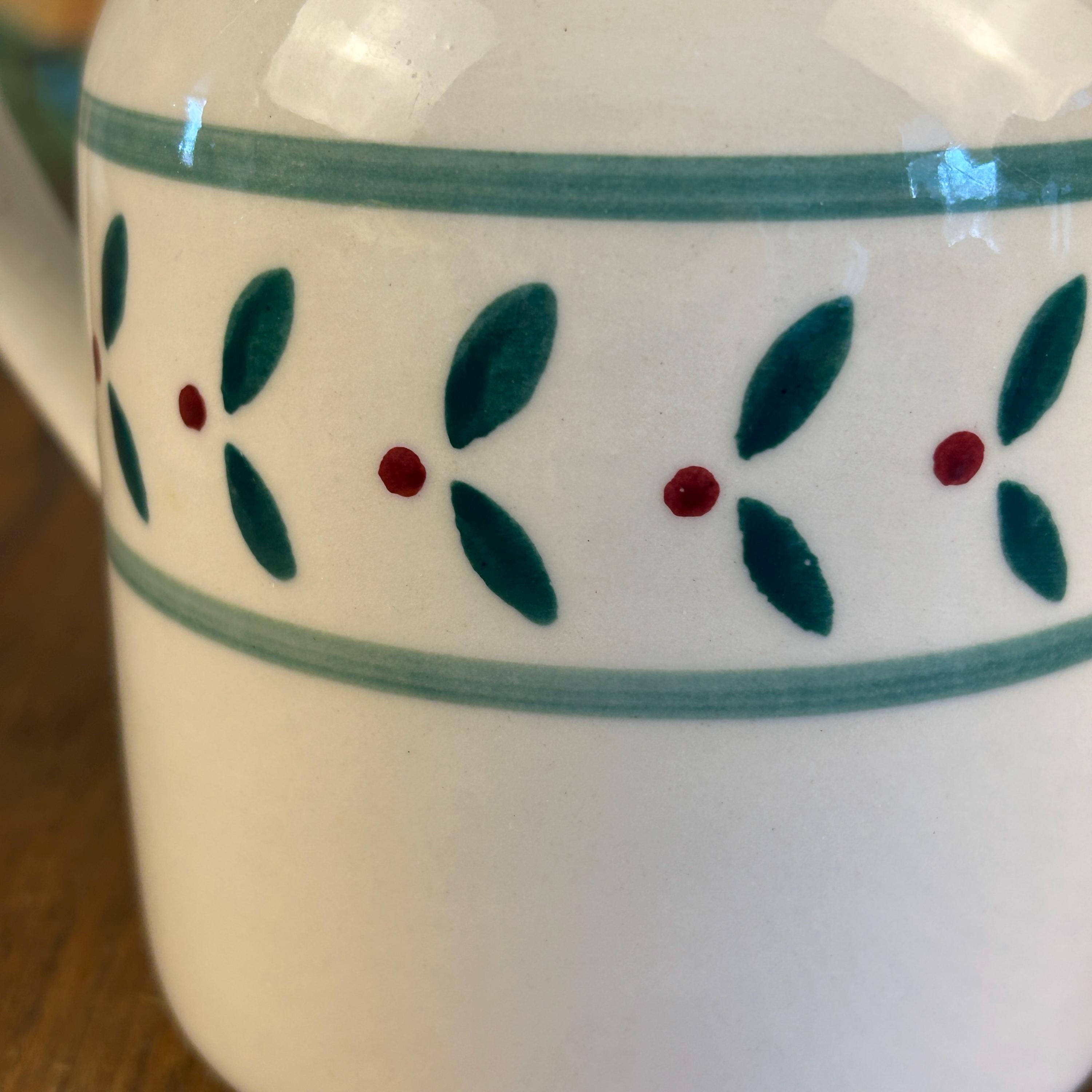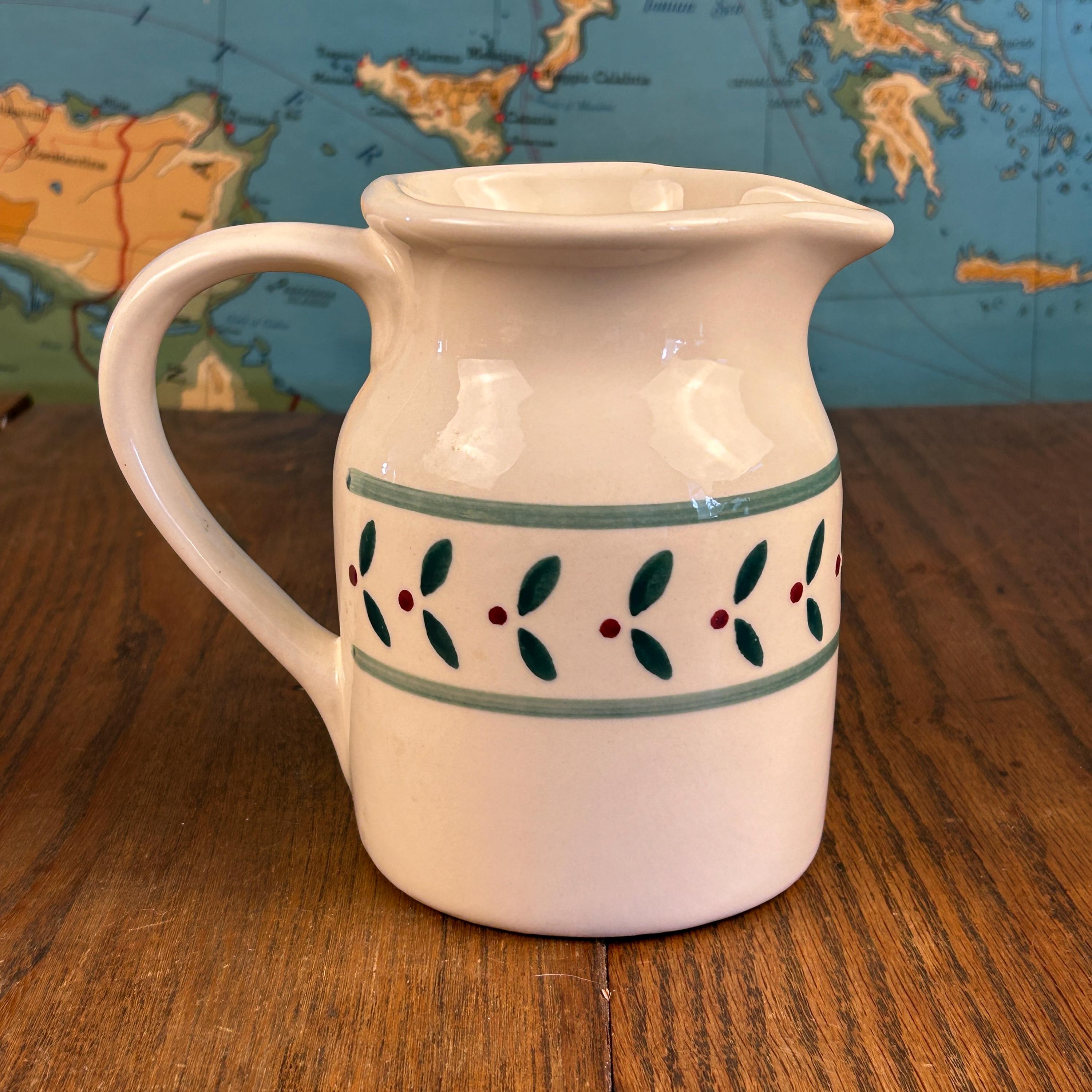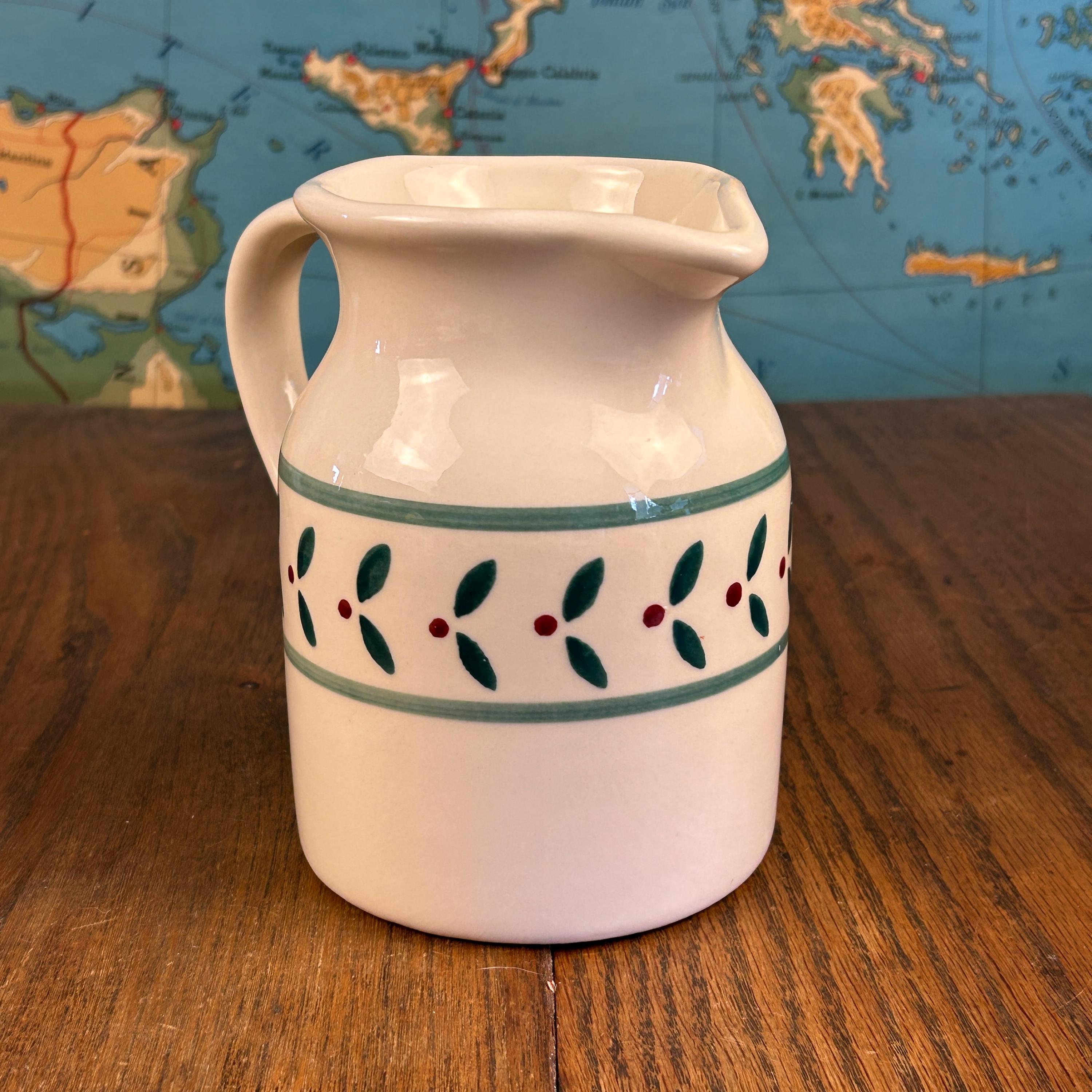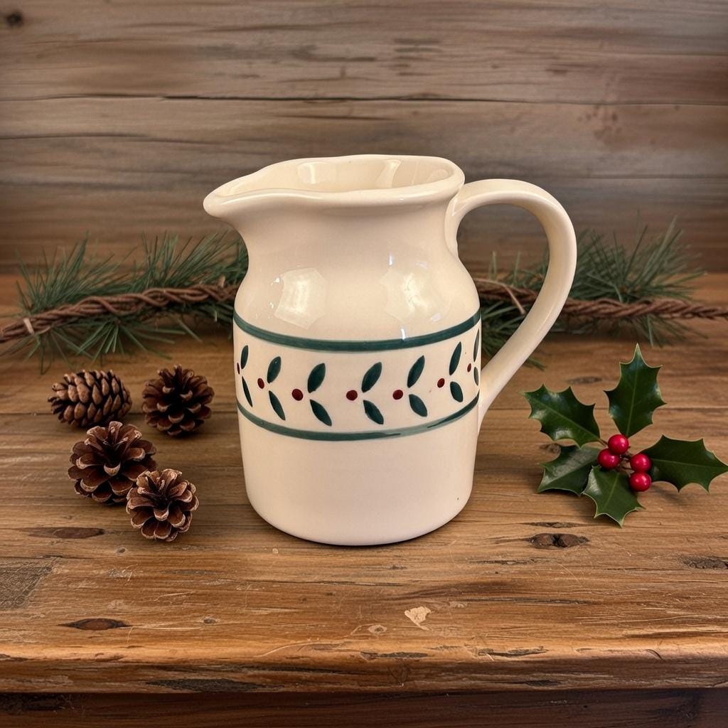 This is a vintage Hartstone Pottery small creamer pitcher in the beloved Holly Berry (Mistletoe) pattern, featuring hand-painted green leaves and bright red berries on durable stoneware. A timeless design that works beautifully for the holidays yet blends effortlessly into year-round farmhouse or traditional kitchens.