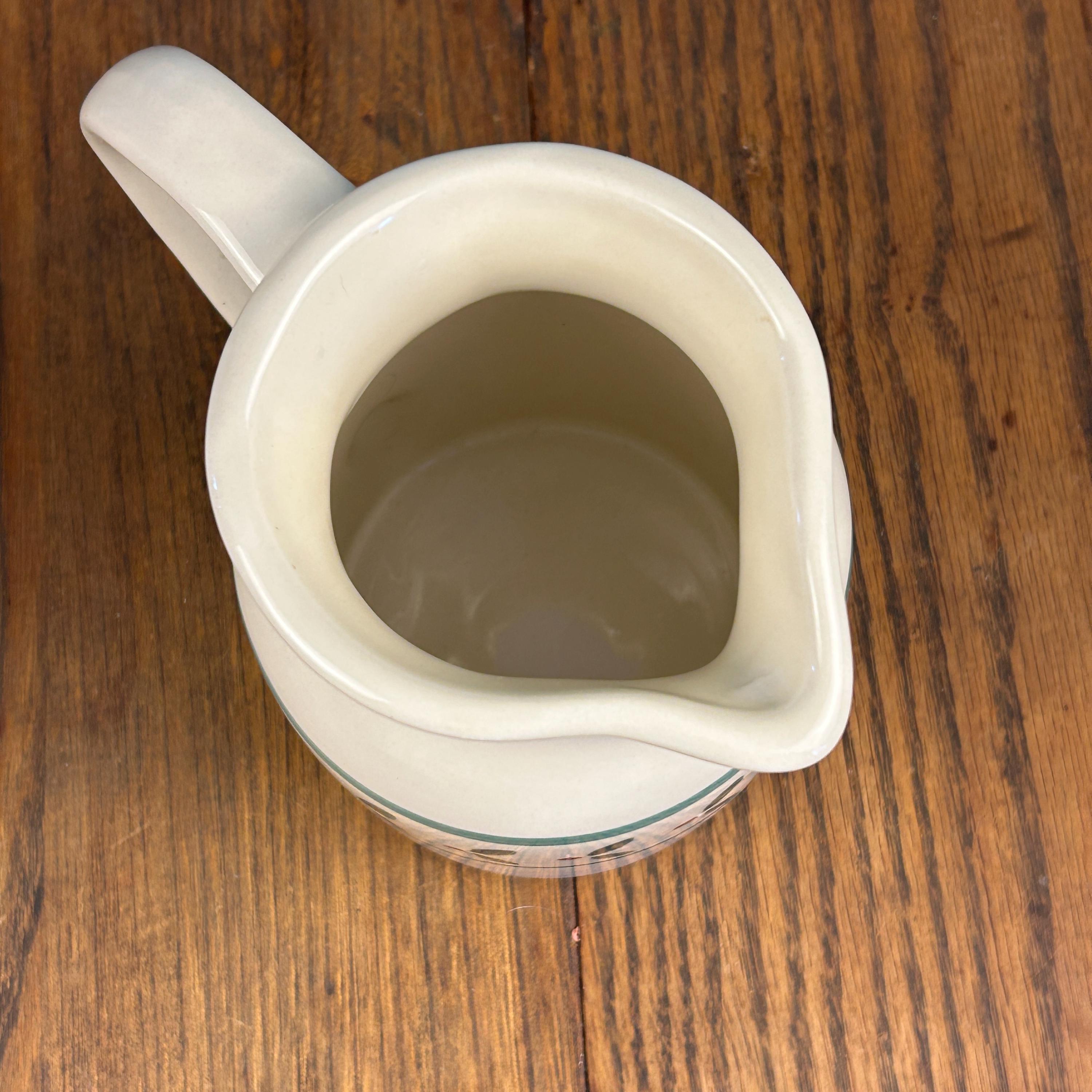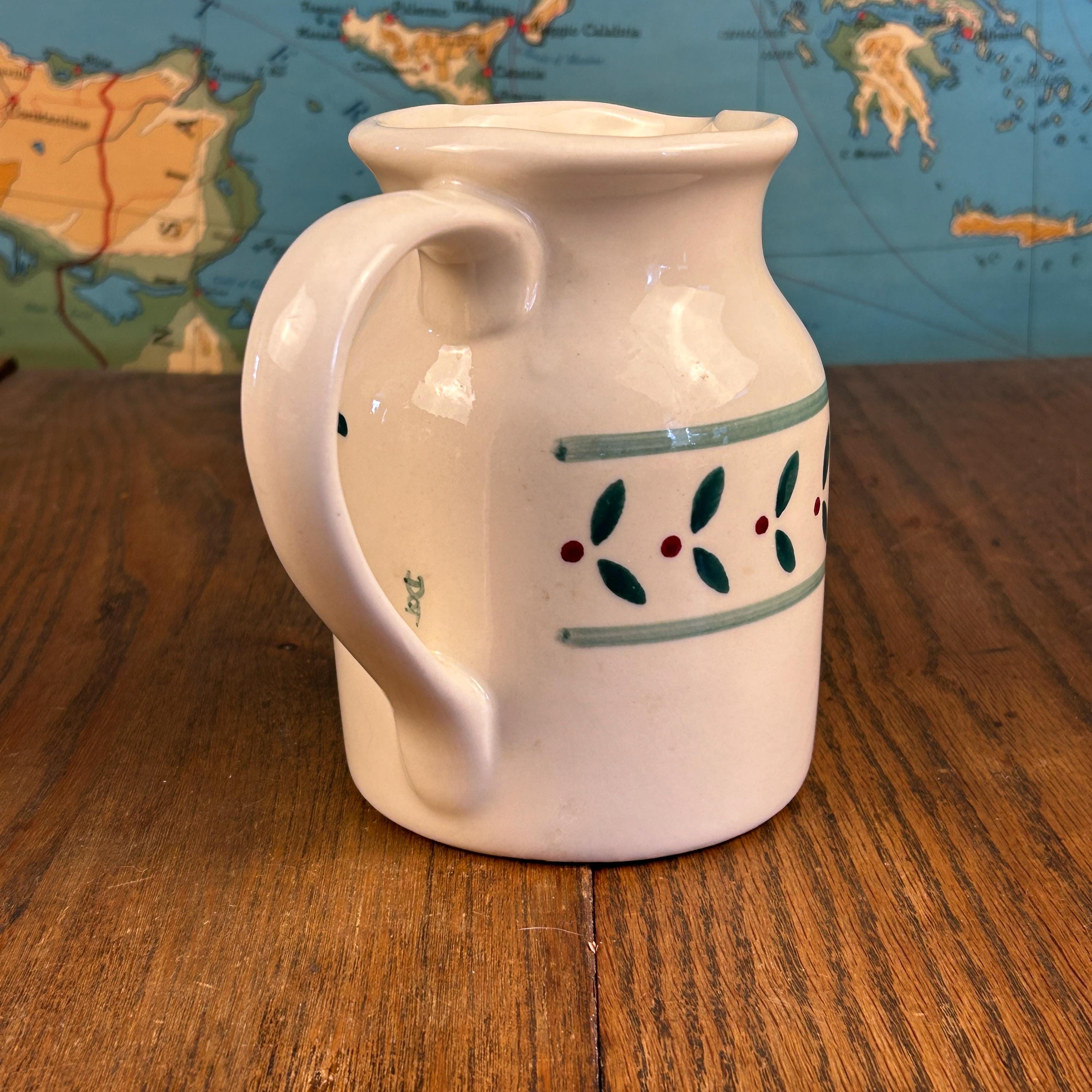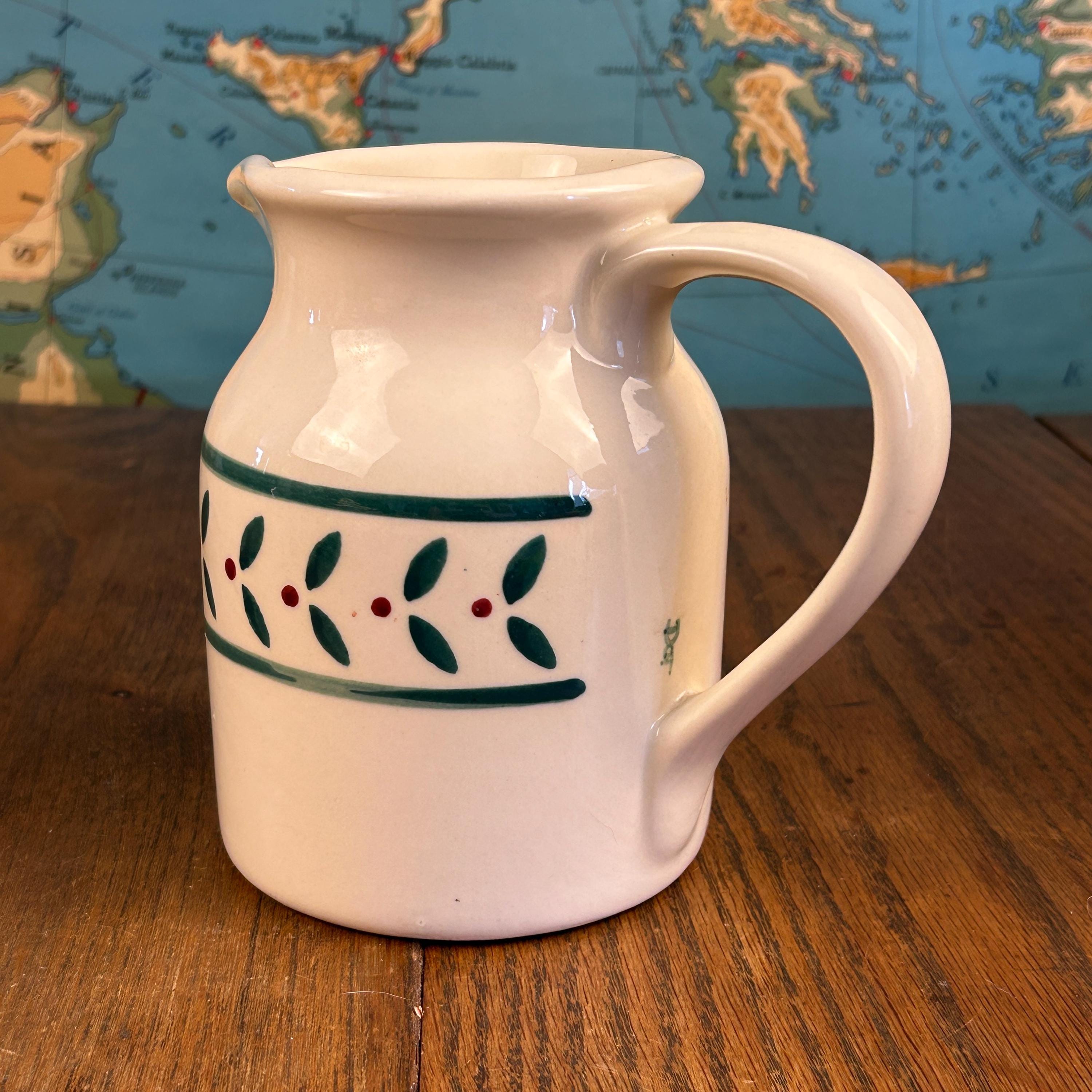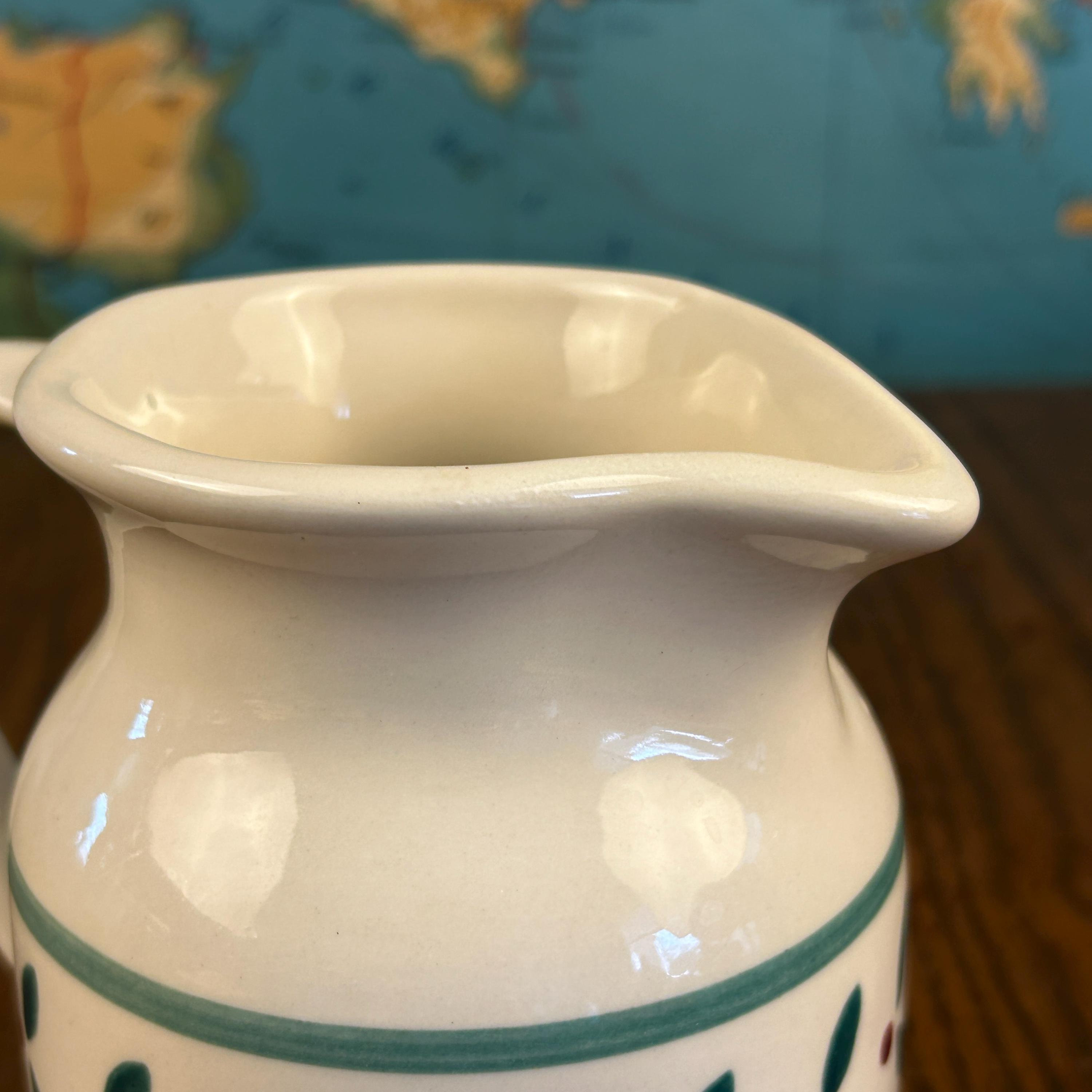 This is a vintage Hartstone Pottery small creamer pitcher in the beloved Holly Berry (Mistletoe) pattern, featuring hand-painted green leaves and bright red berries on durable stoneware. A timeless design that works beautifully for the holidays yet blends effortlessly into year-round farmhouse or traditional kitchens.