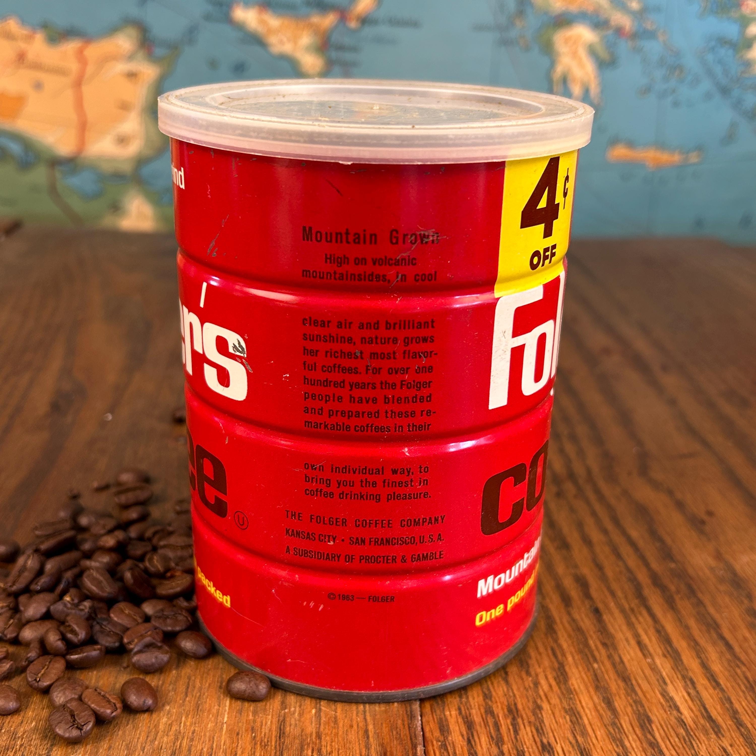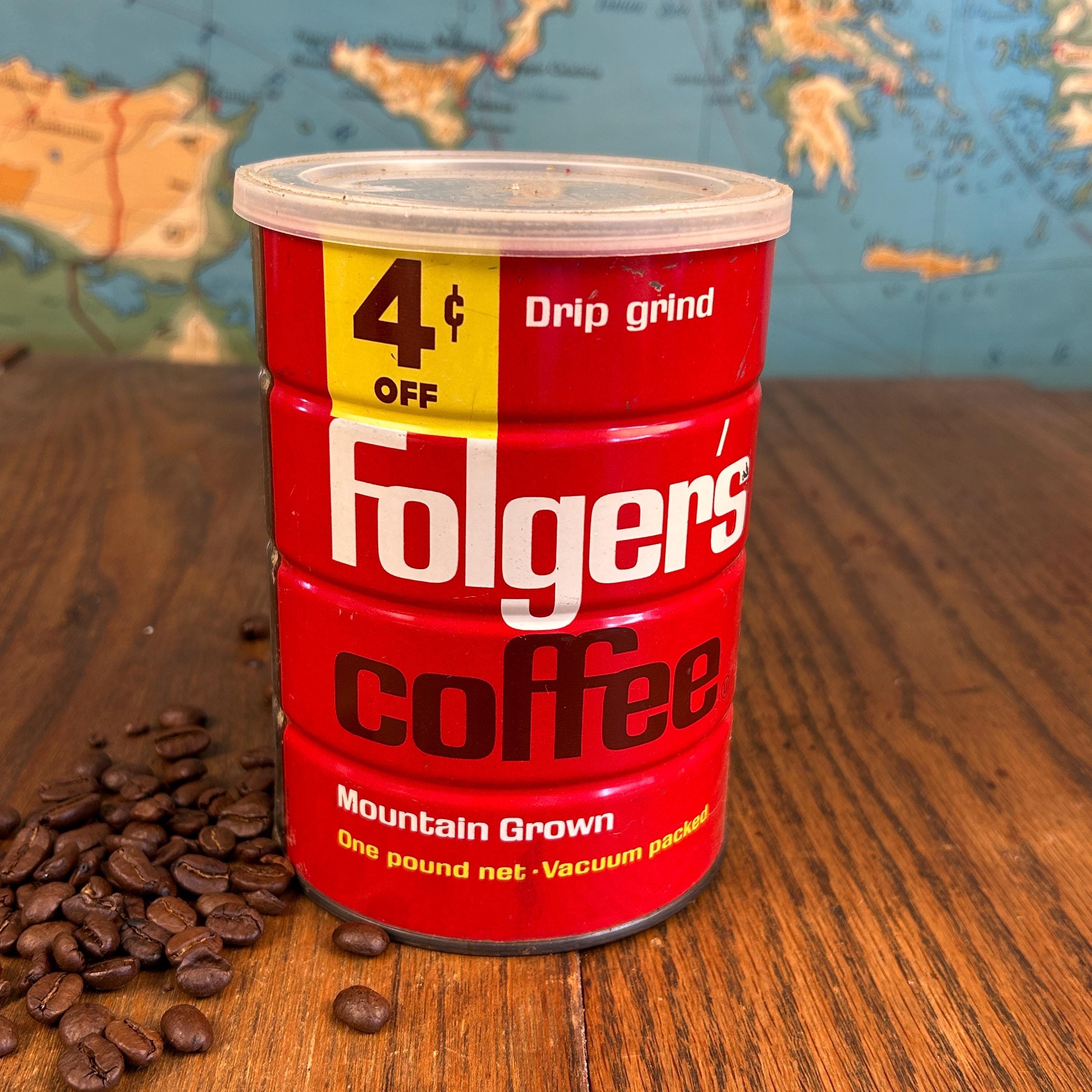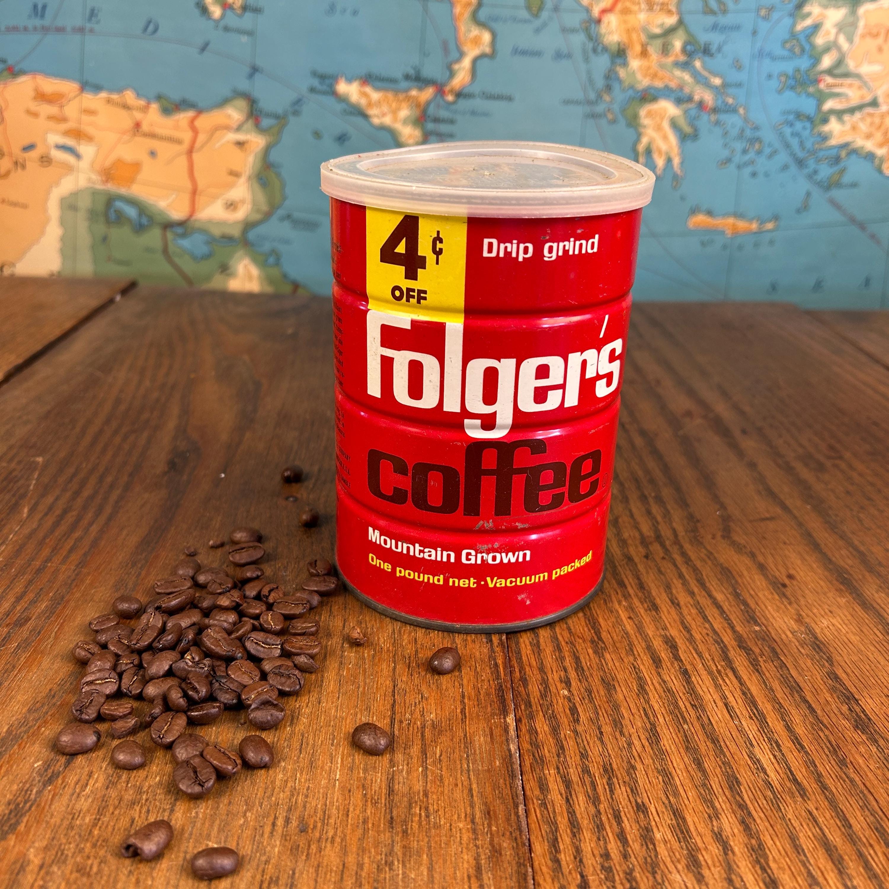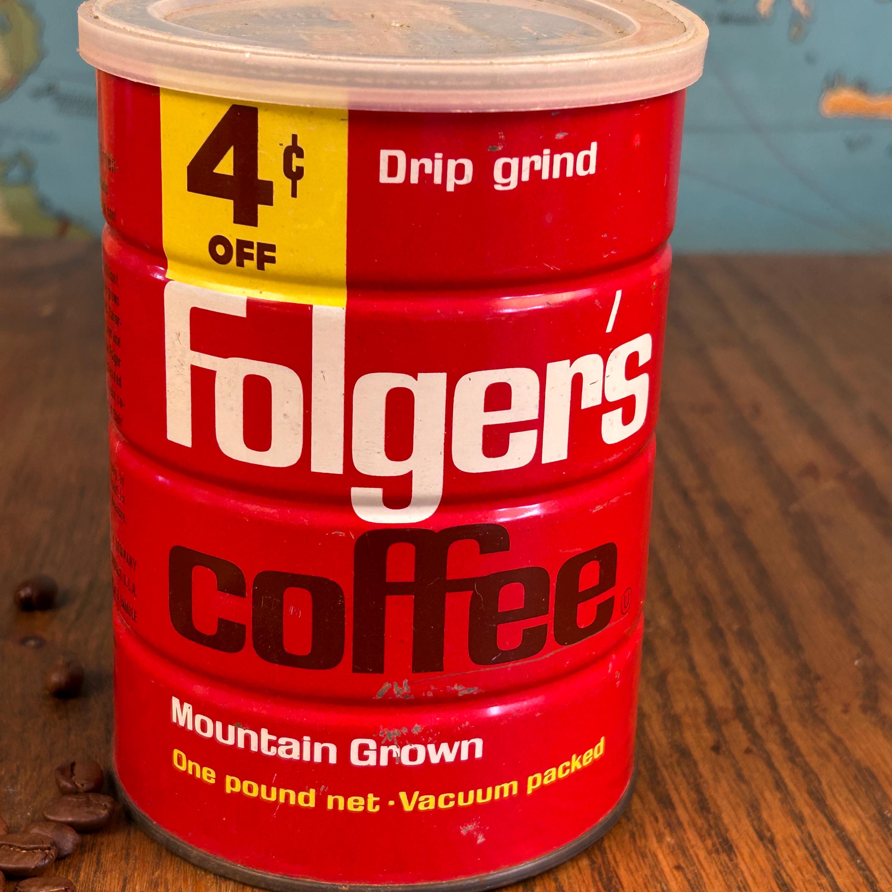It features Folgers’ iconic “Mountain Grown” slogan along with a charming “4¢ OFF” price marker, both hallmarks of mid-century grocery branding. The bold red color and distinctive logo font are unmistakably 1960s, making this can a standout for display in a vintage kitchen, coffee bar, or advertising collection.