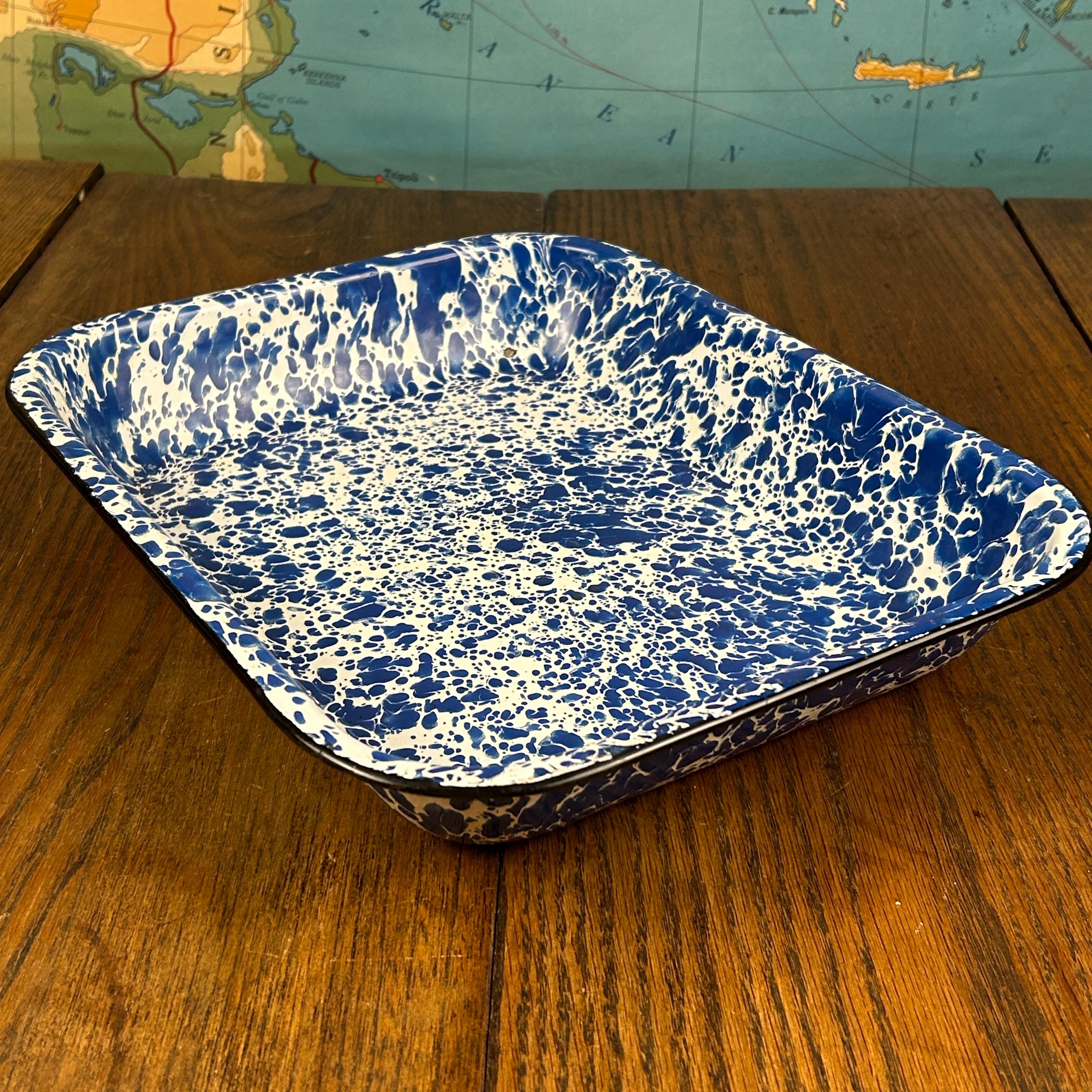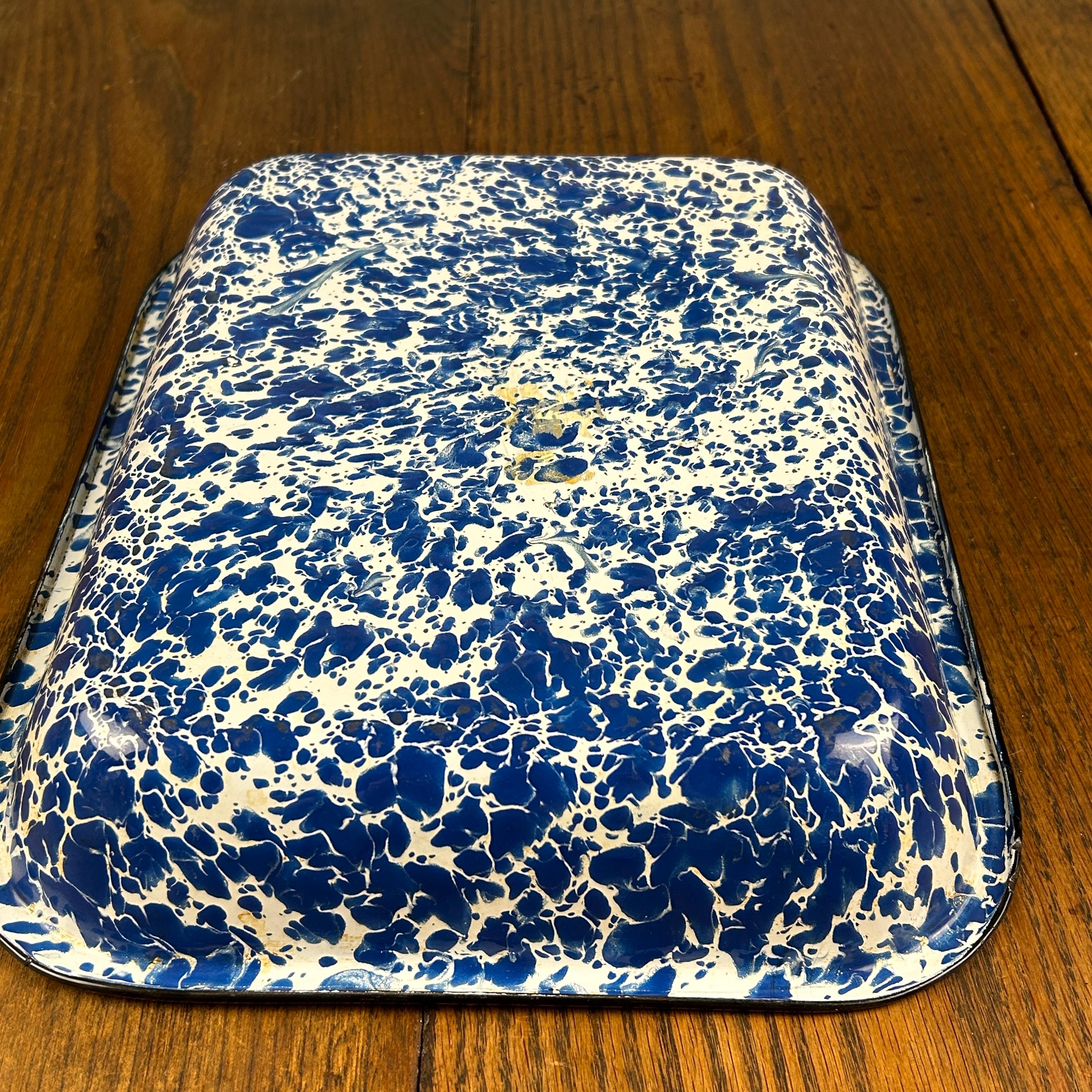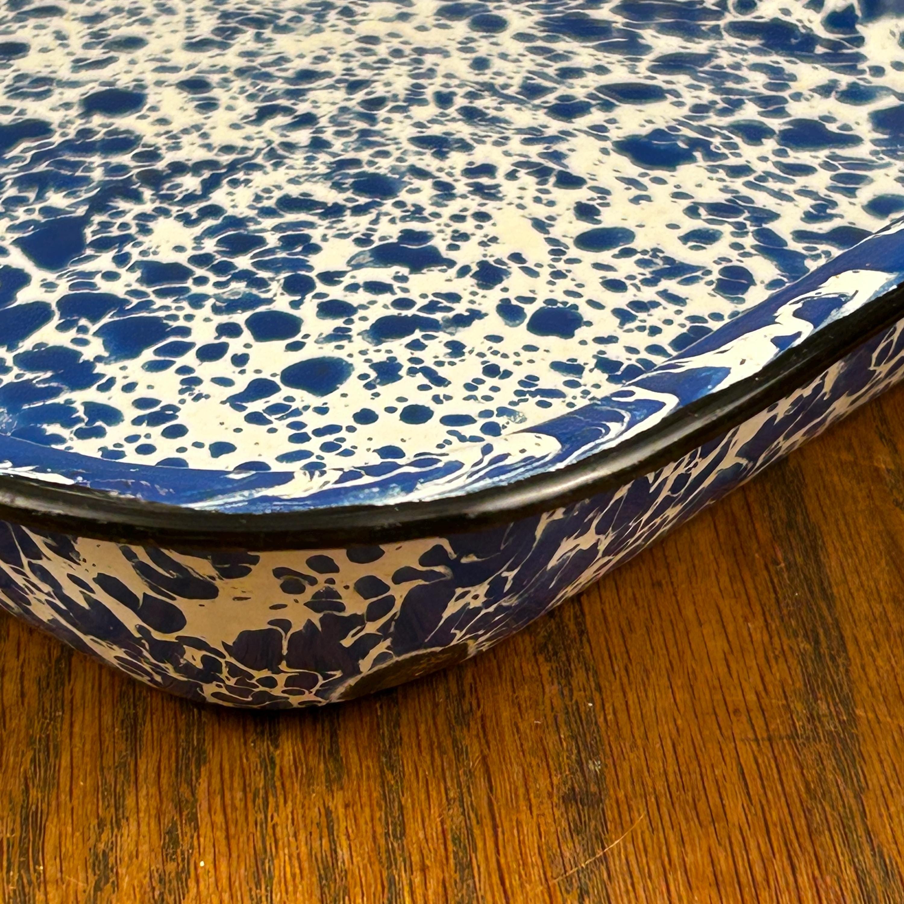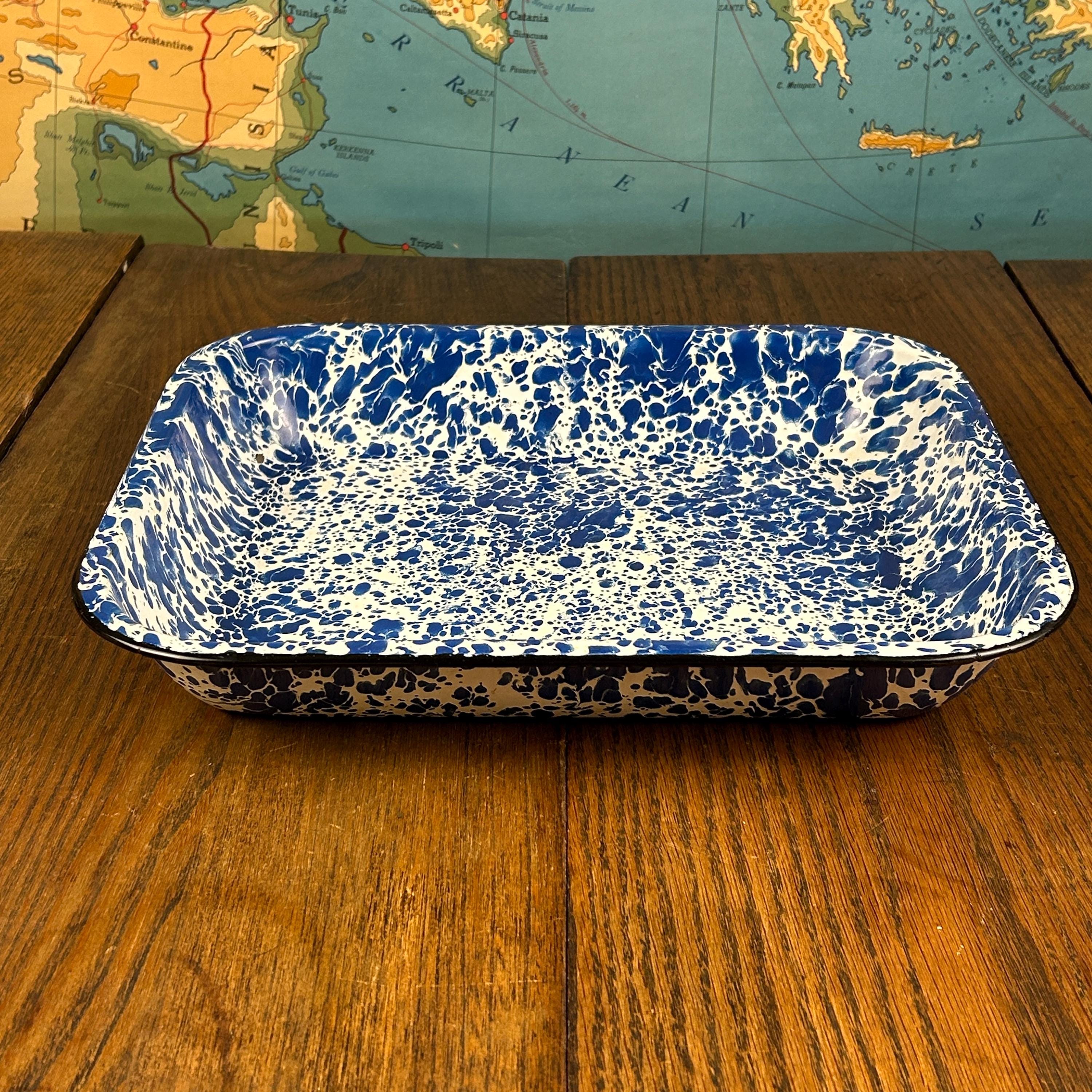 This is a vintage blue and white splatter enamel pan, a timeless piece of classic enamelware. Measuring 13 1/4” long x 10 3/4” wide x 2” deep, this oblong pan is wonderfully versatile—perfect as a splatter pan, serving dish, pudding dish, or vegetable dish.