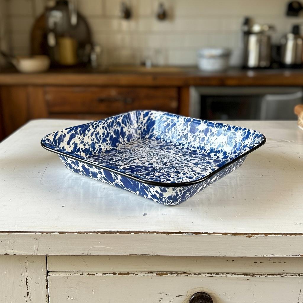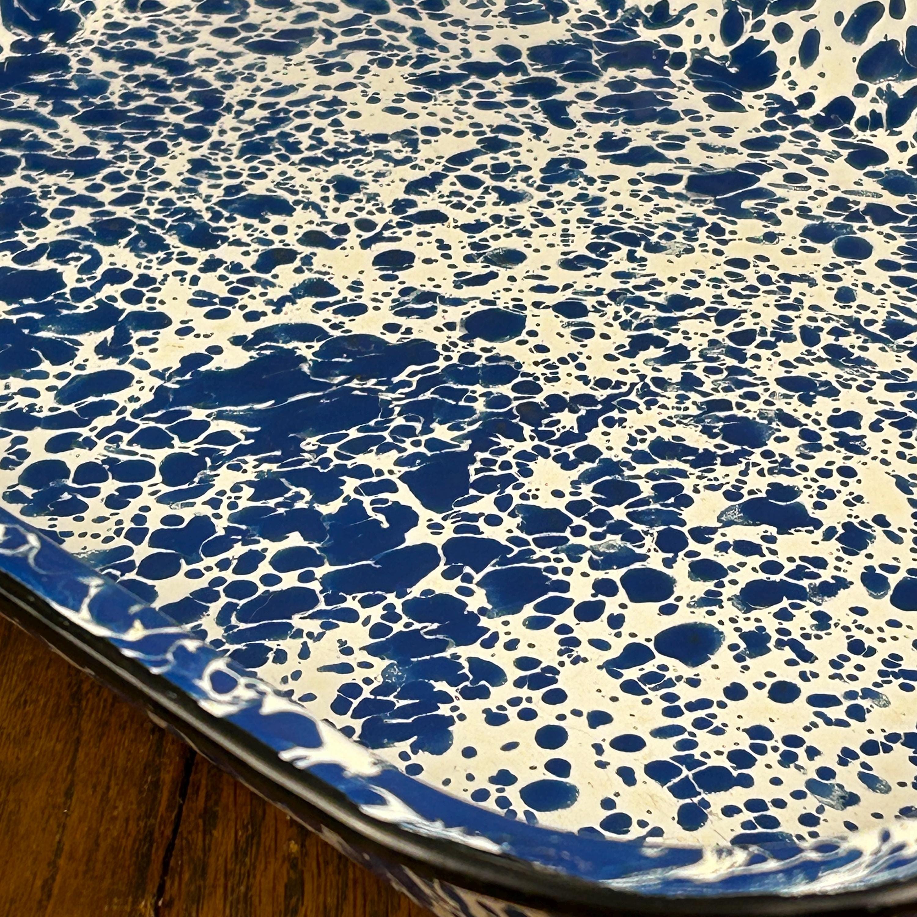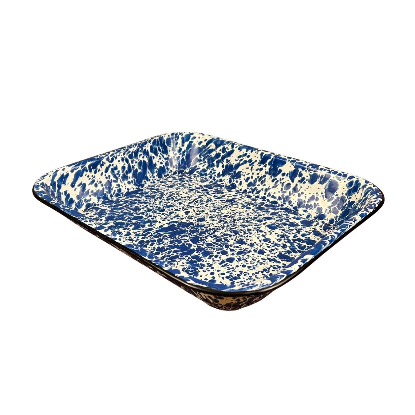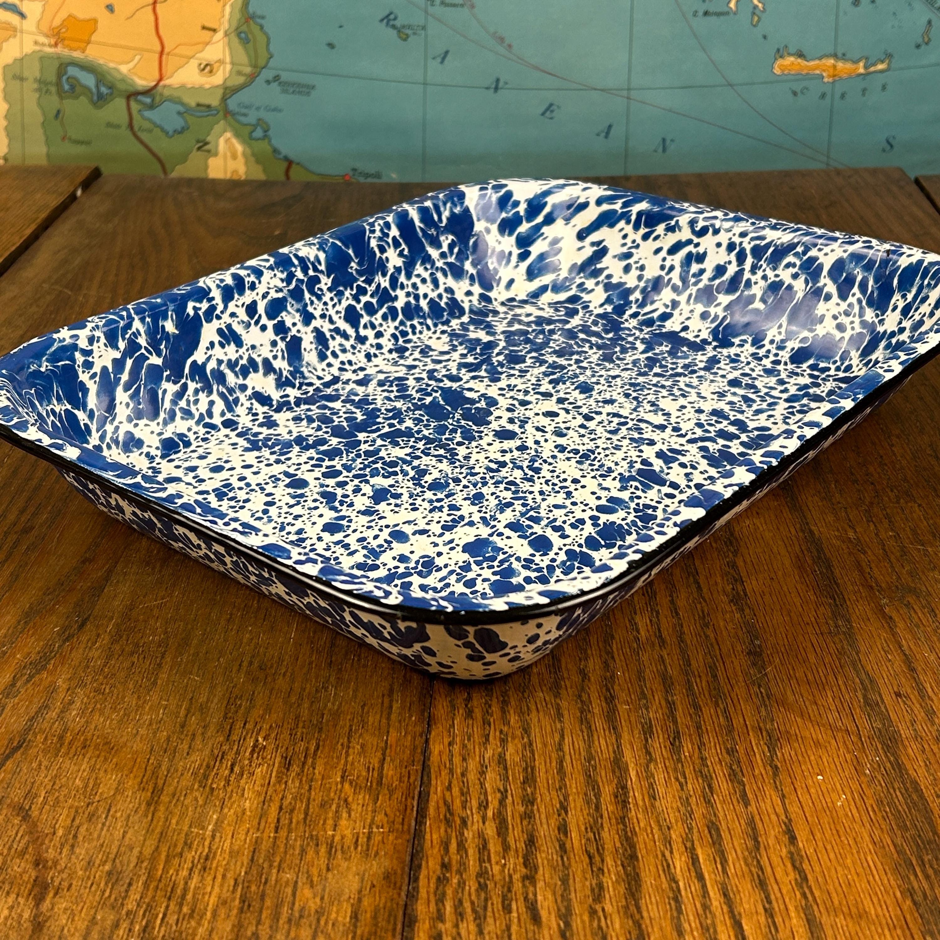 This is a vintage blue and white splatter enamel pan, a timeless piece of classic enamelware. Measuring 13 1/4” long x 10 3/4” wide x 2” deep, this oblong pan is wonderfully versatile—perfect as a splatter pan, serving dish, pudding dish, or vegetable dish.