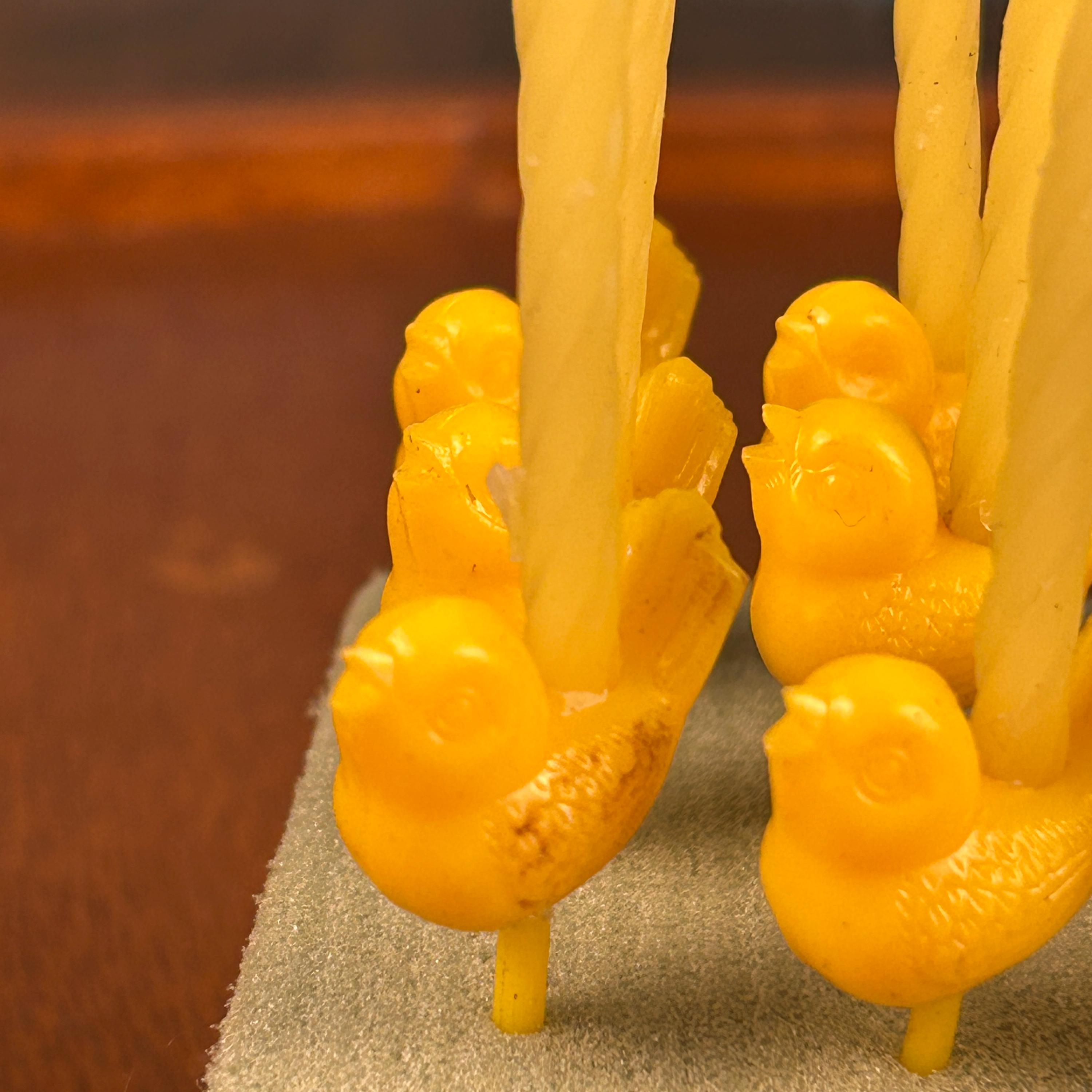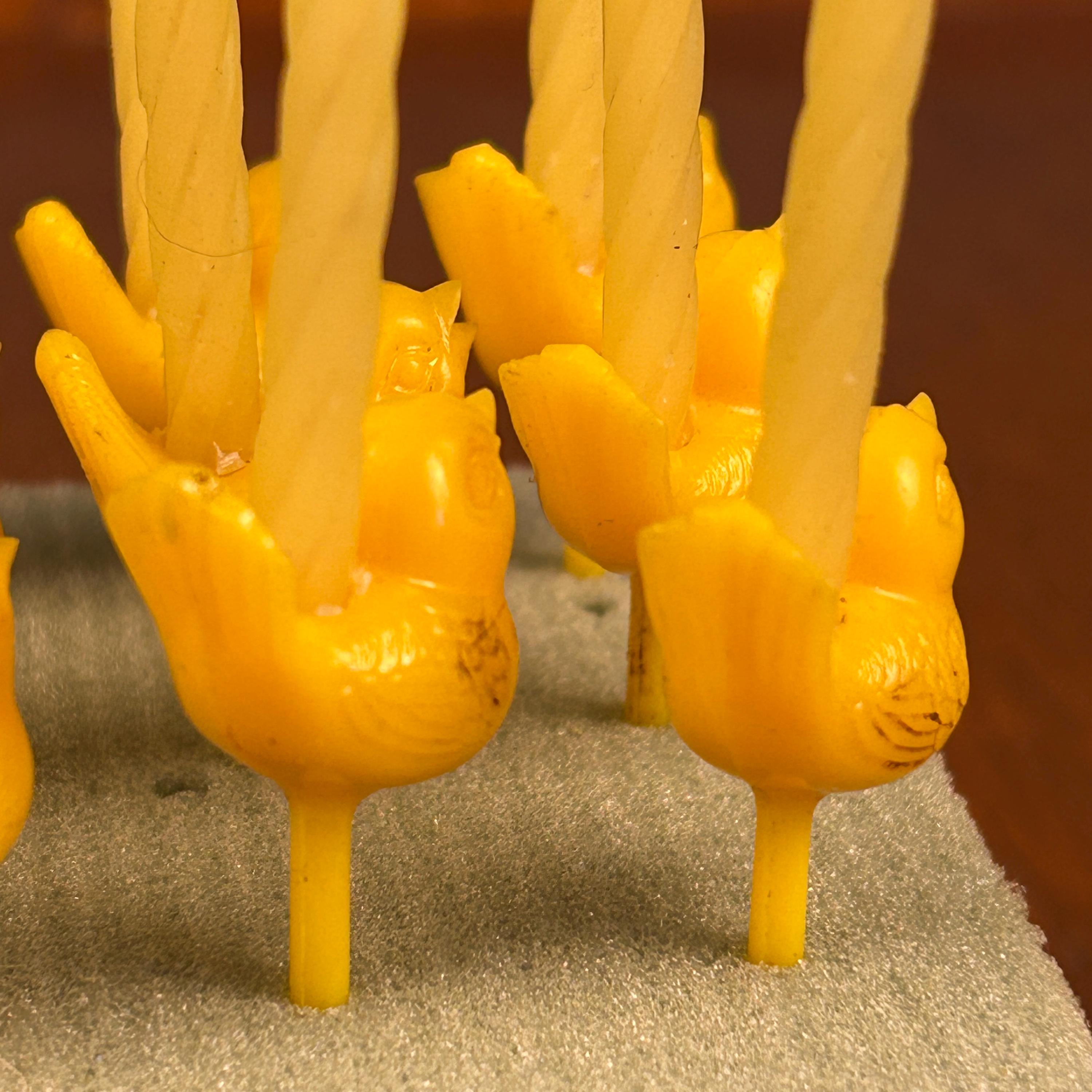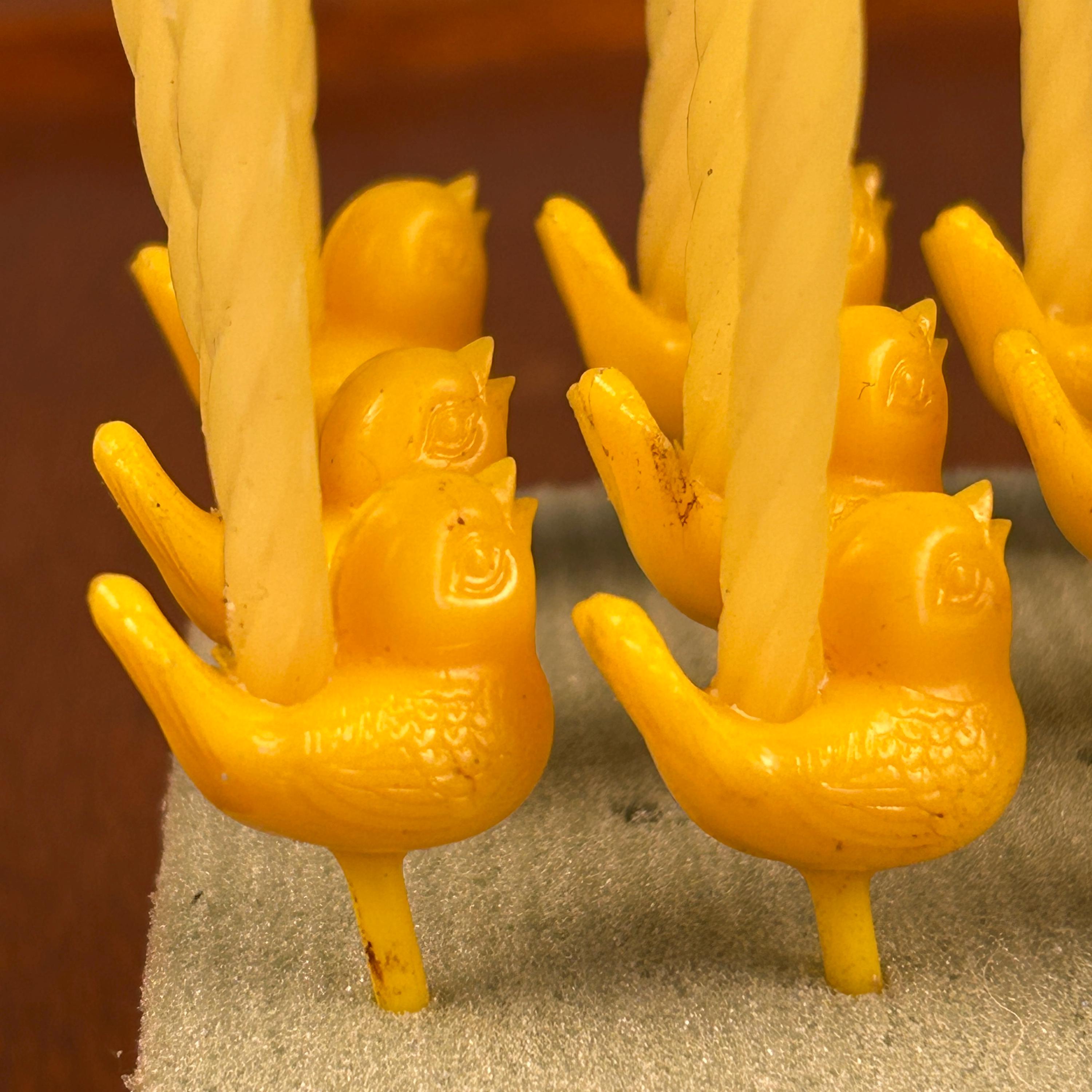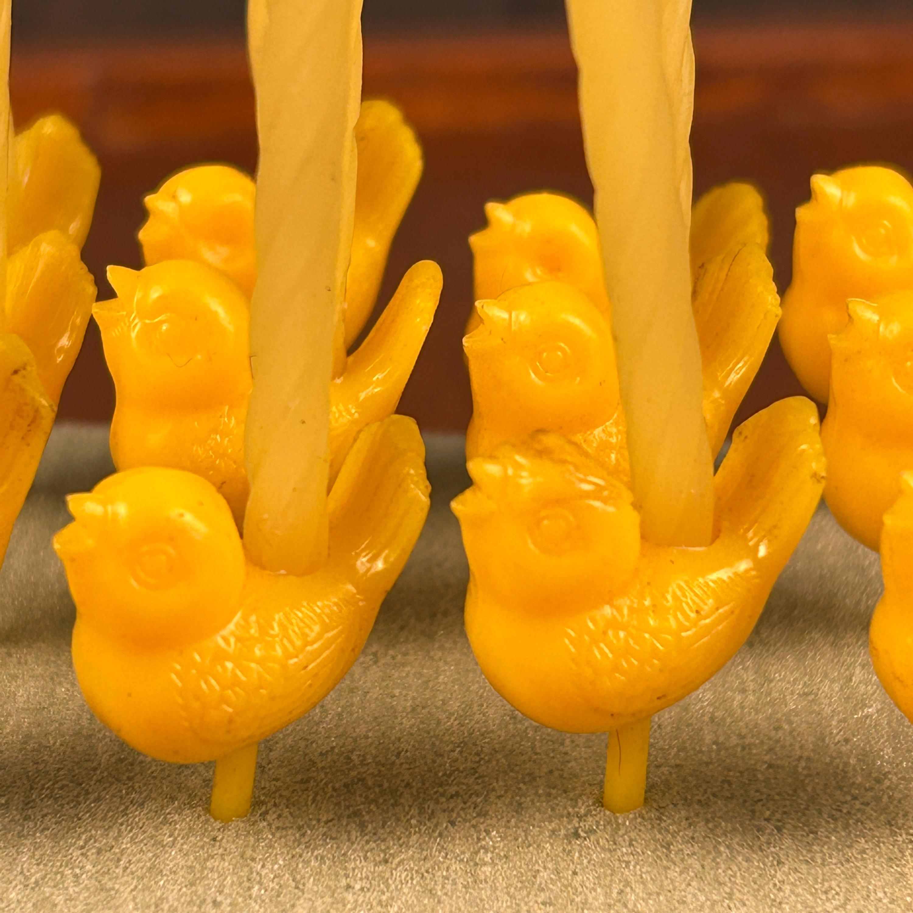 Made of hard molded plastic, the picks feature classic Easter motifs such as chicks, hens, roosters, ducks, and bunnies. Pieces like these were often produced in soft pastel shades and bright spring colors, and similar examples from the era were sometimes made by companies such as Gilbert Plastics.