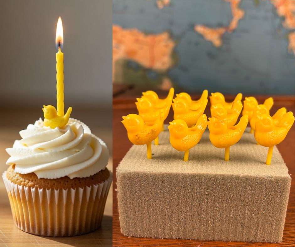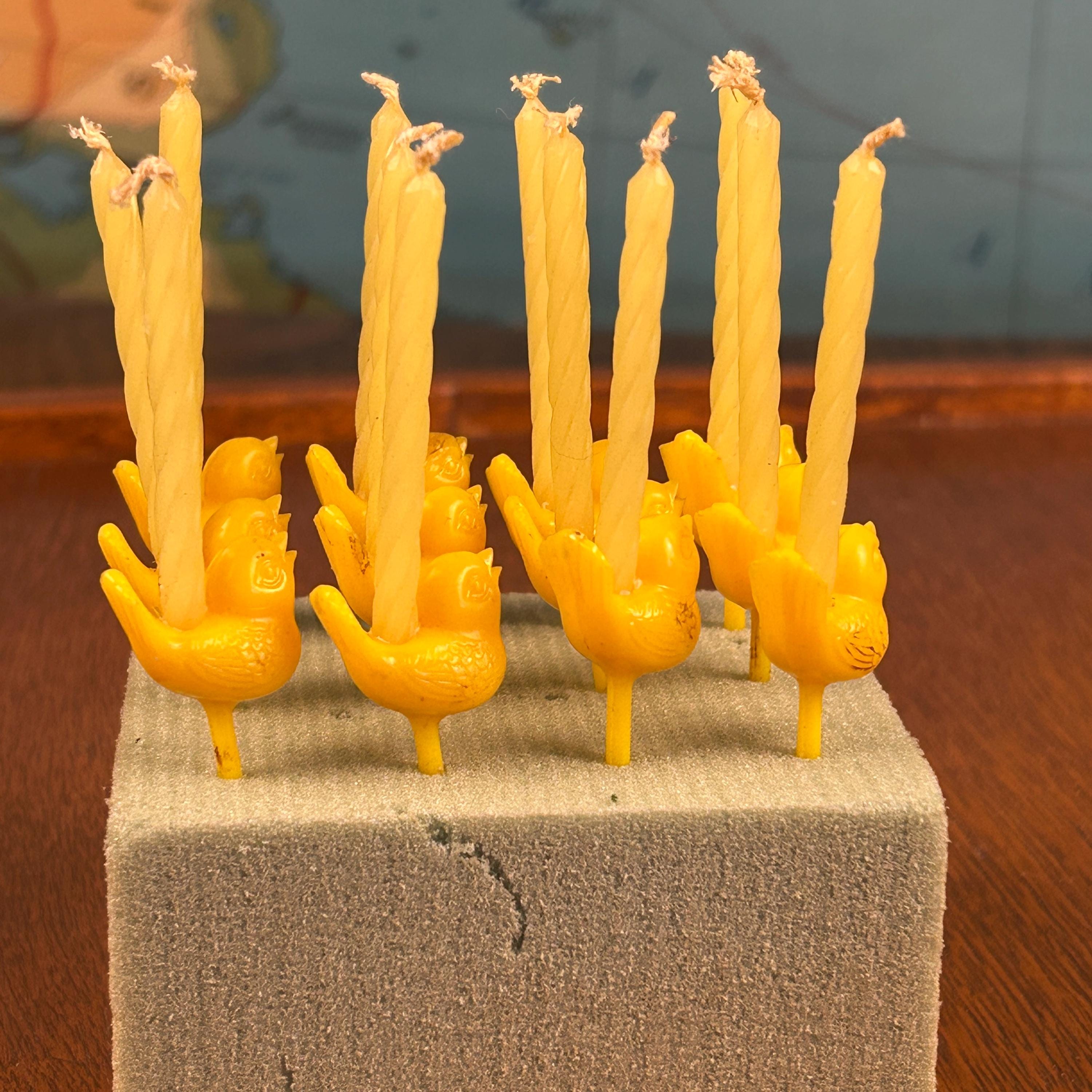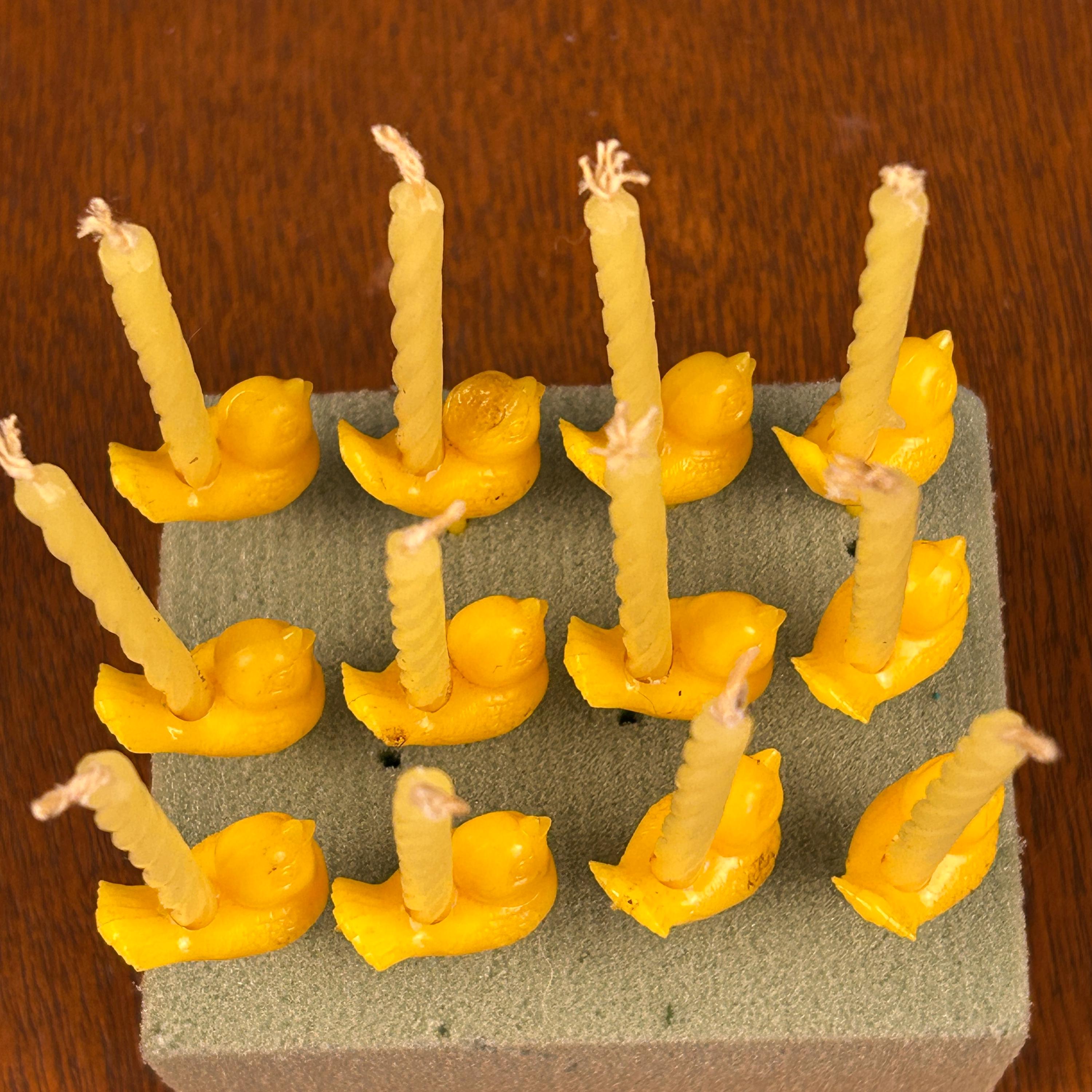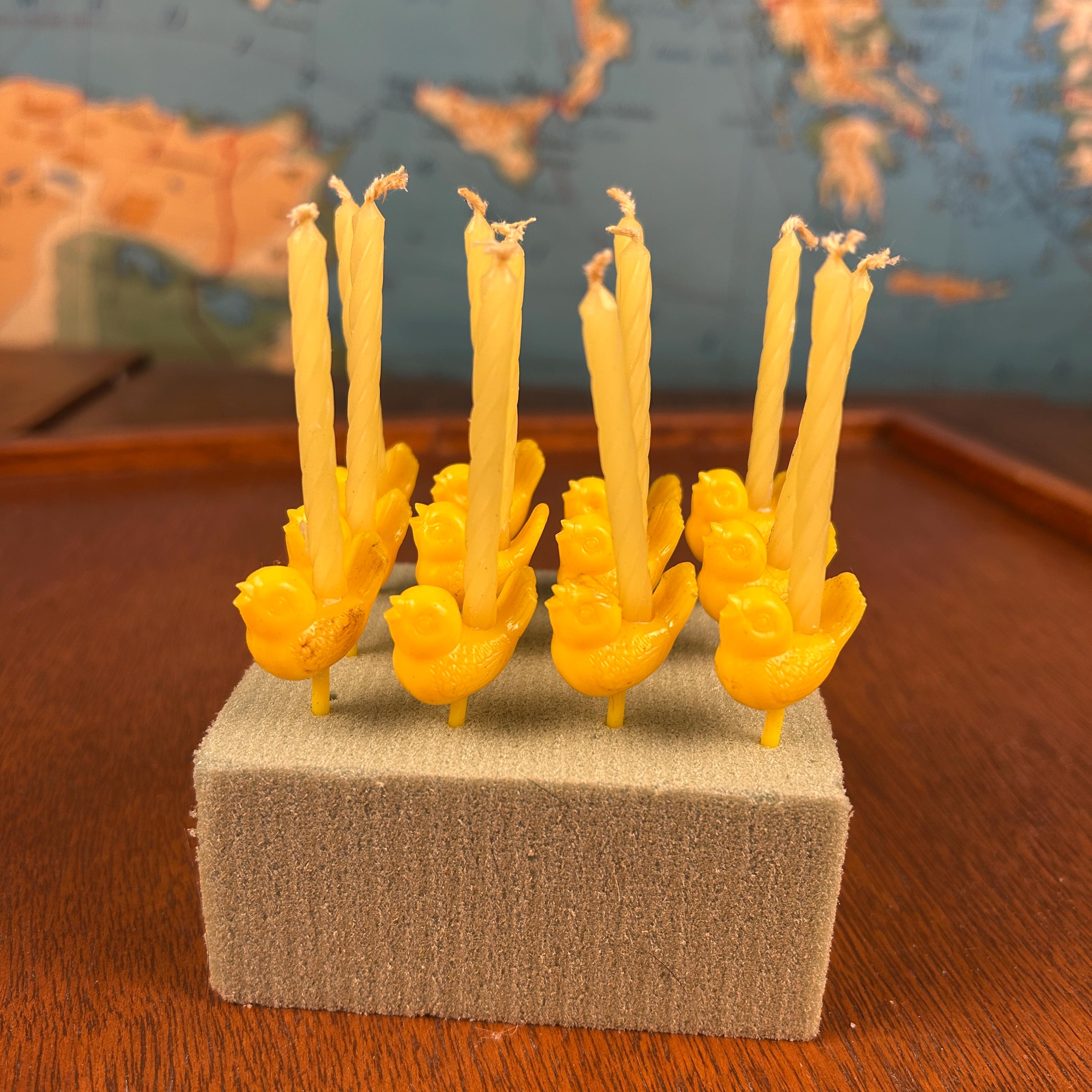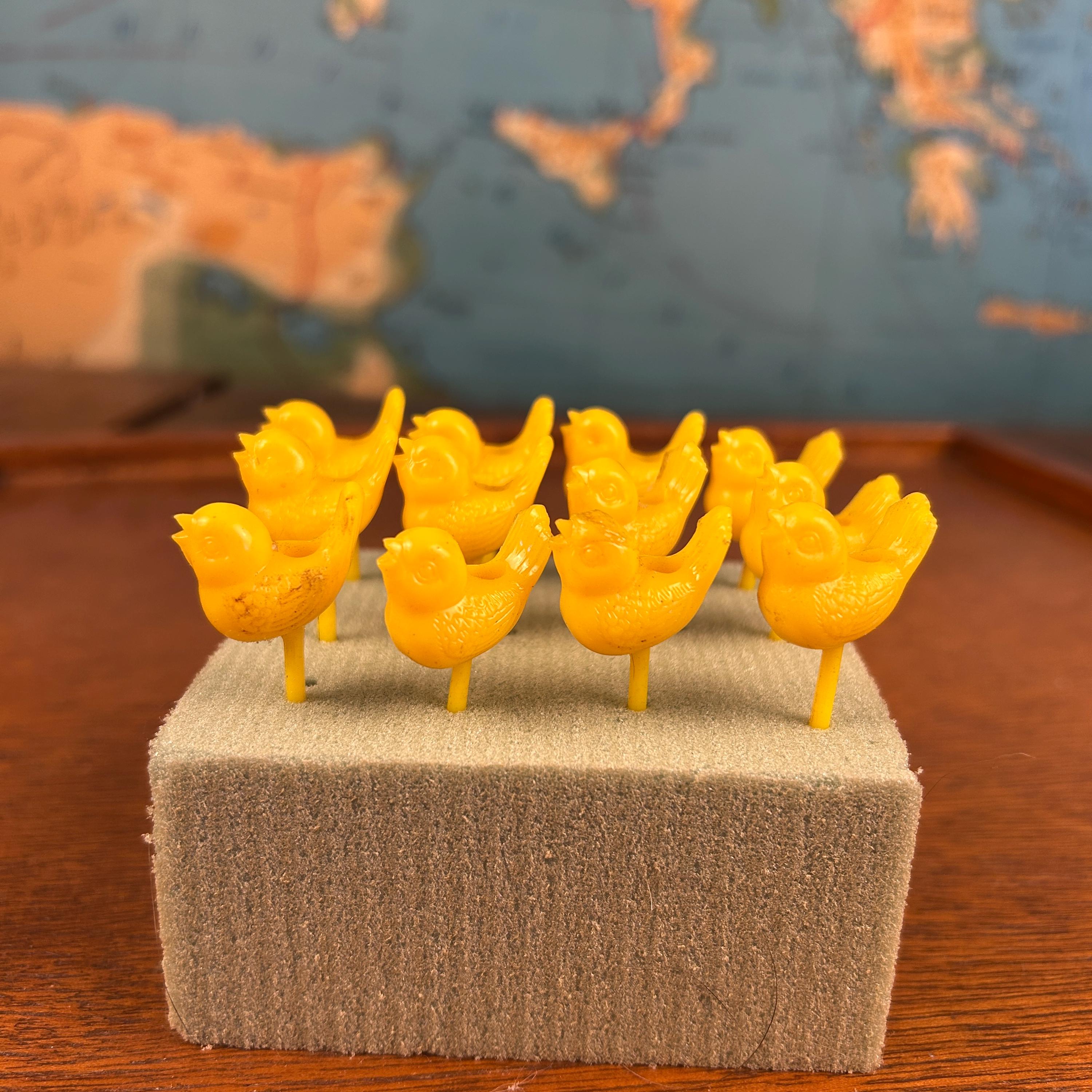 This is a set of 12 vintage hard plastic Easter chick cake topper picks, a sweet nod to mid-century holiday celebrations. These small yellow figurines were especially popular from the 1950s–1970s and were commonly tucked into Easter baskets, used as cupcake toppers, or added to spring party favors.