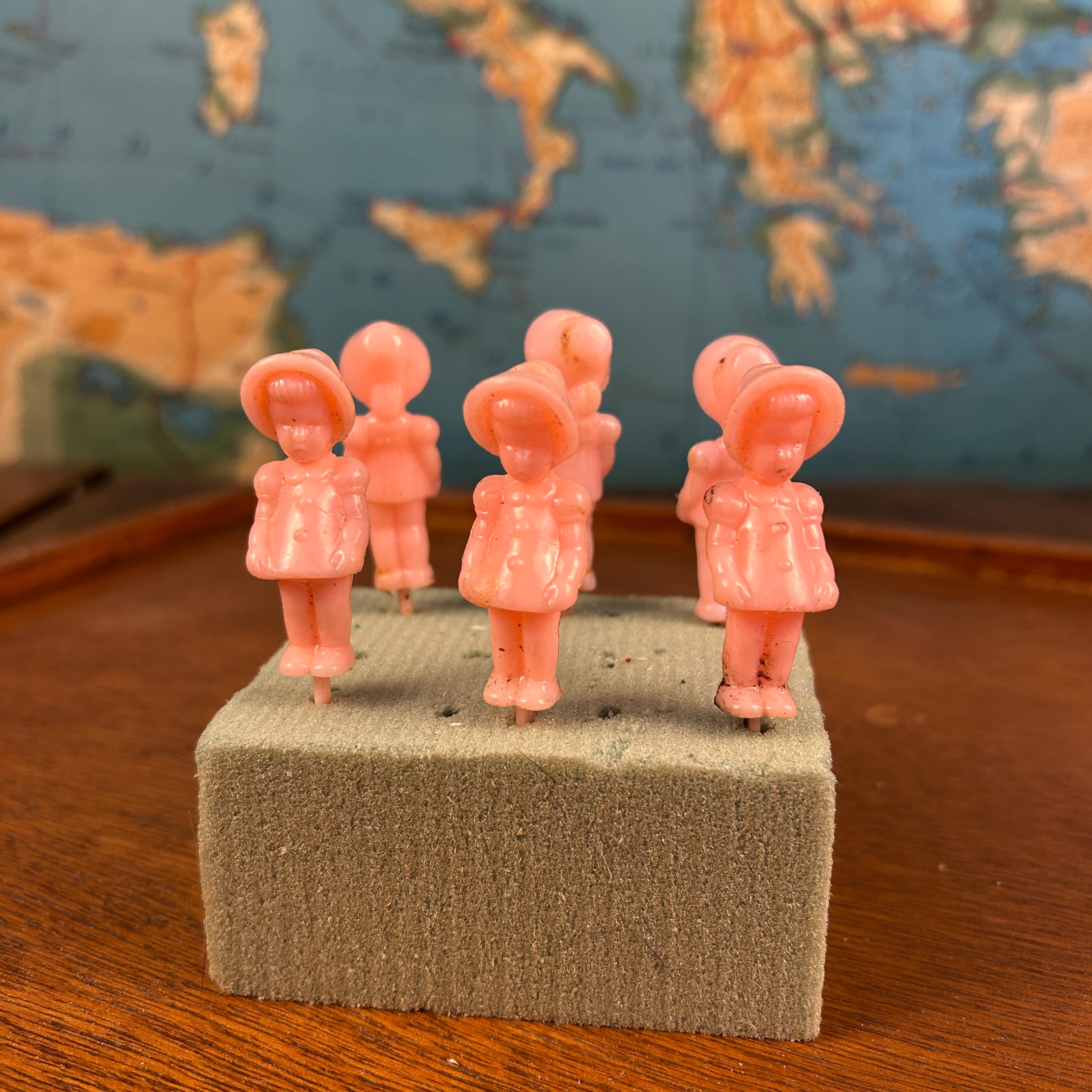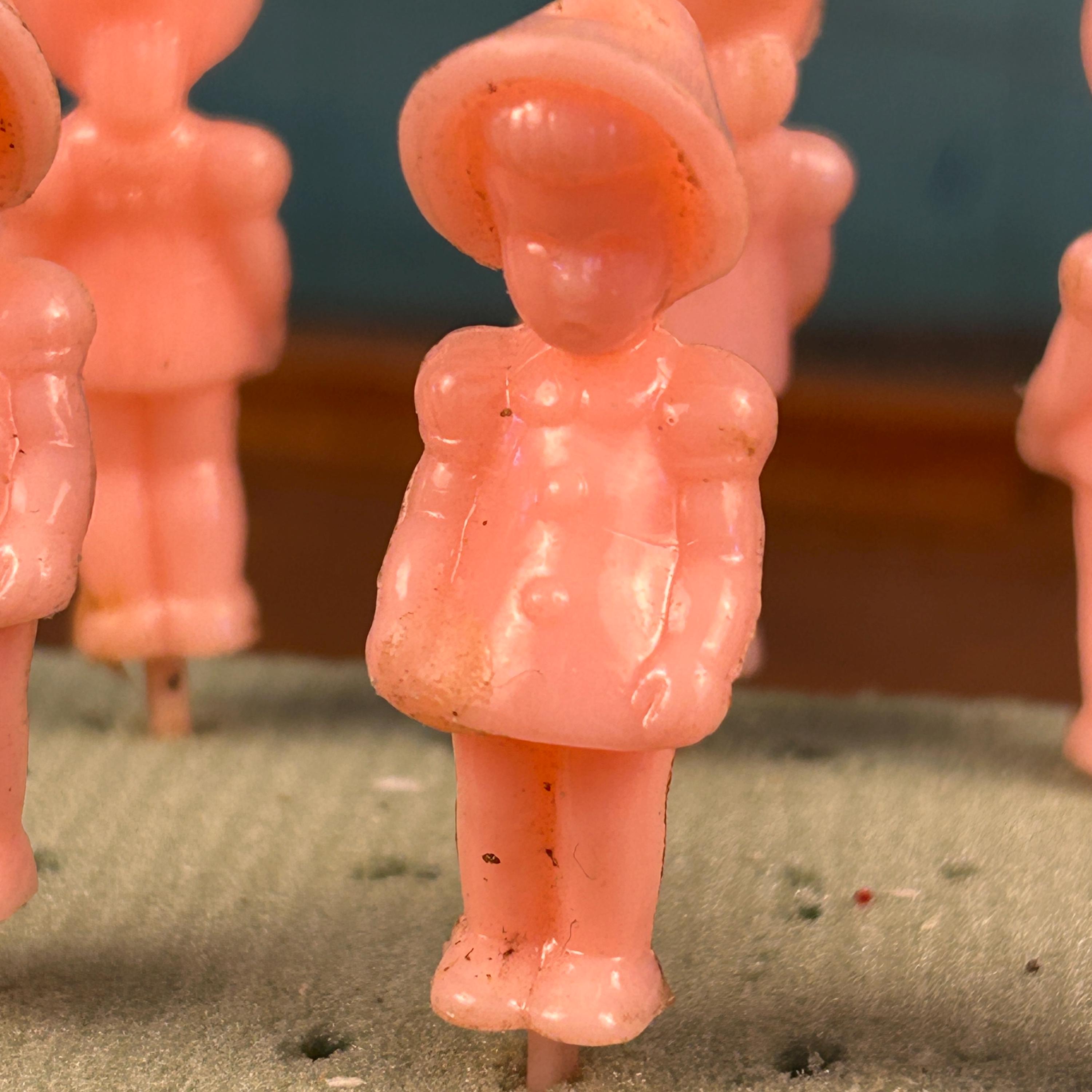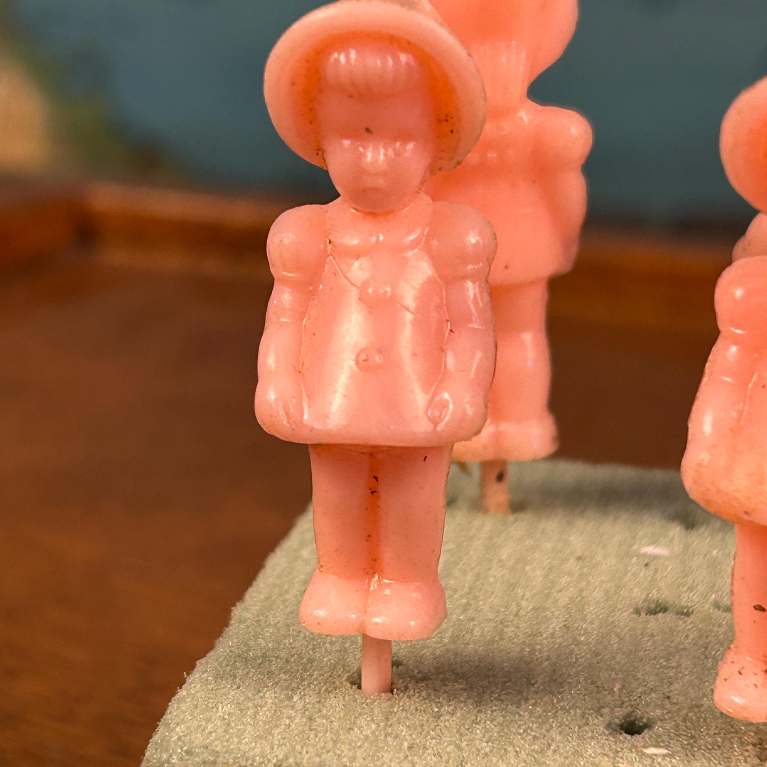 This is a set of 6 vintage hard plastic pink little girl cake topper picks, a charming and harder-to-find variation of mid-century holiday decorations. These petite figurines were popular from the 1950s–1970s and were often tucked into Easter baskets, used as cupcake toppers, or given as small party favors.