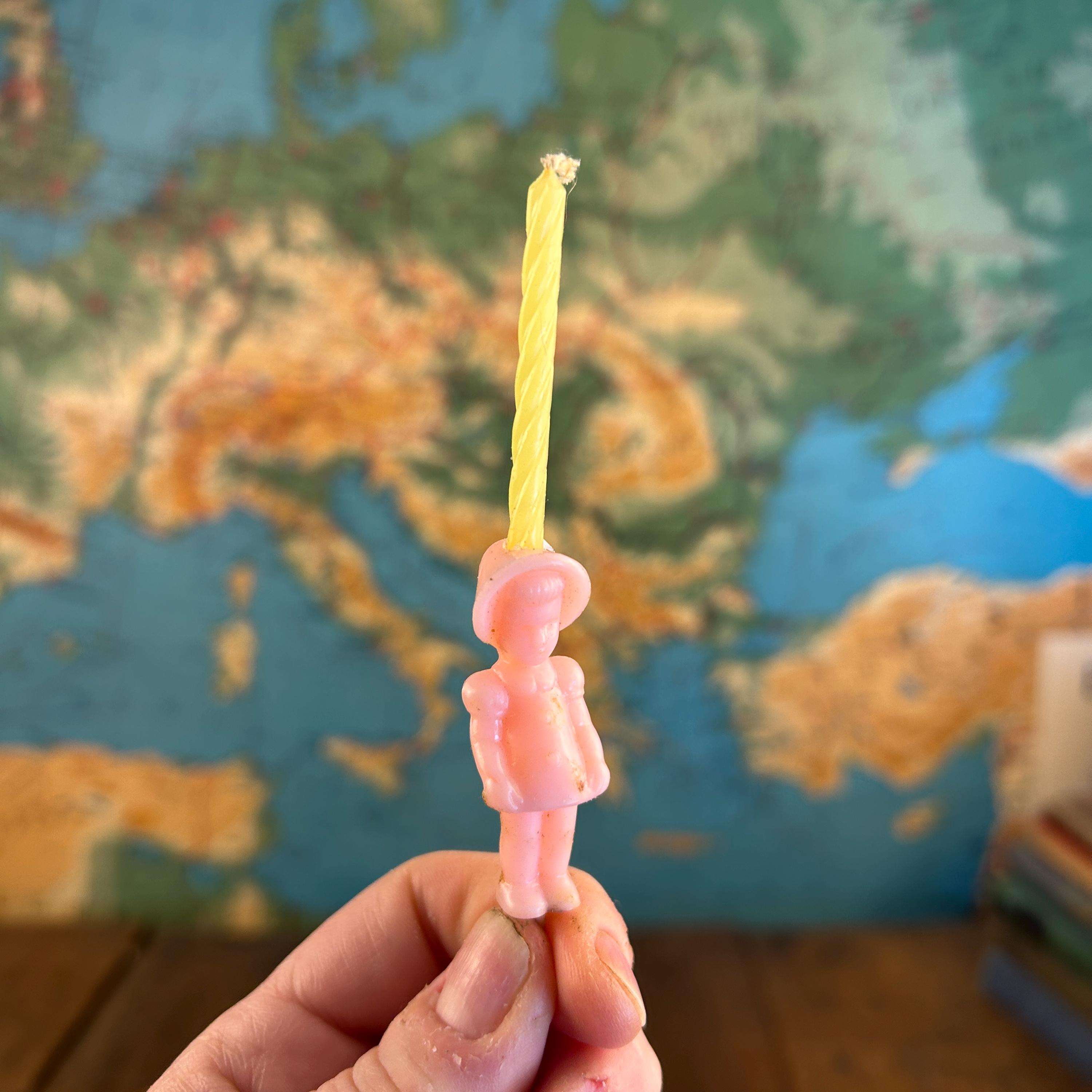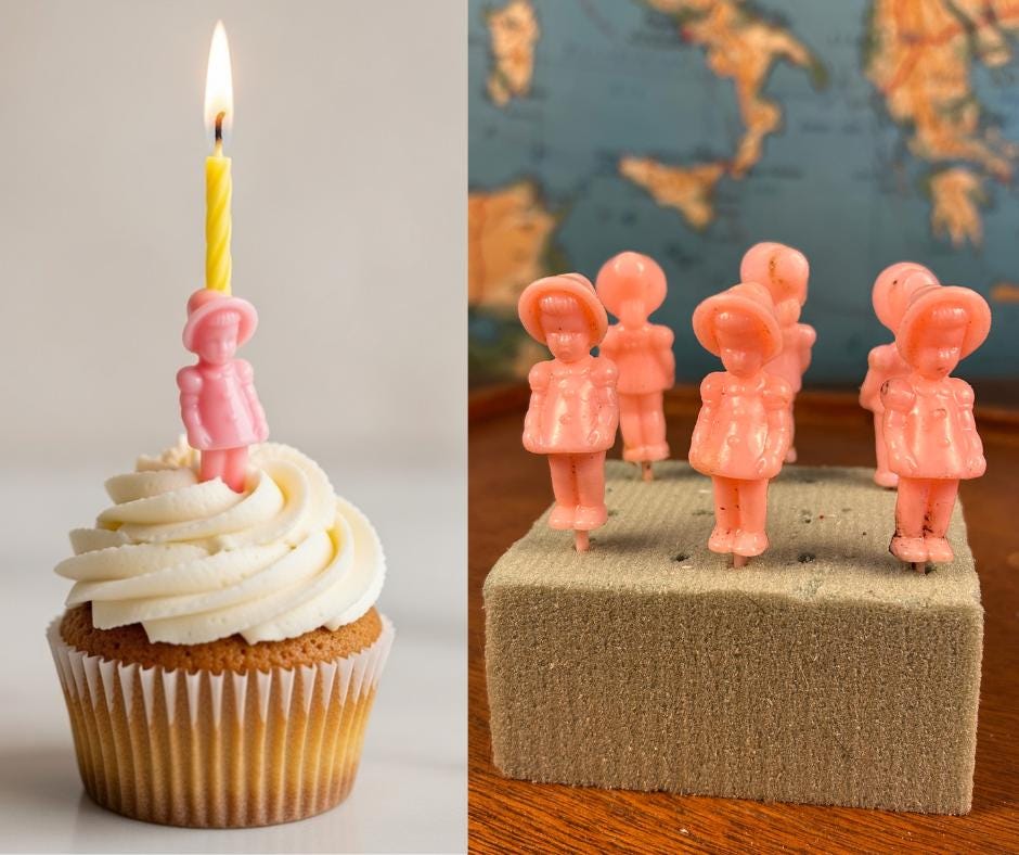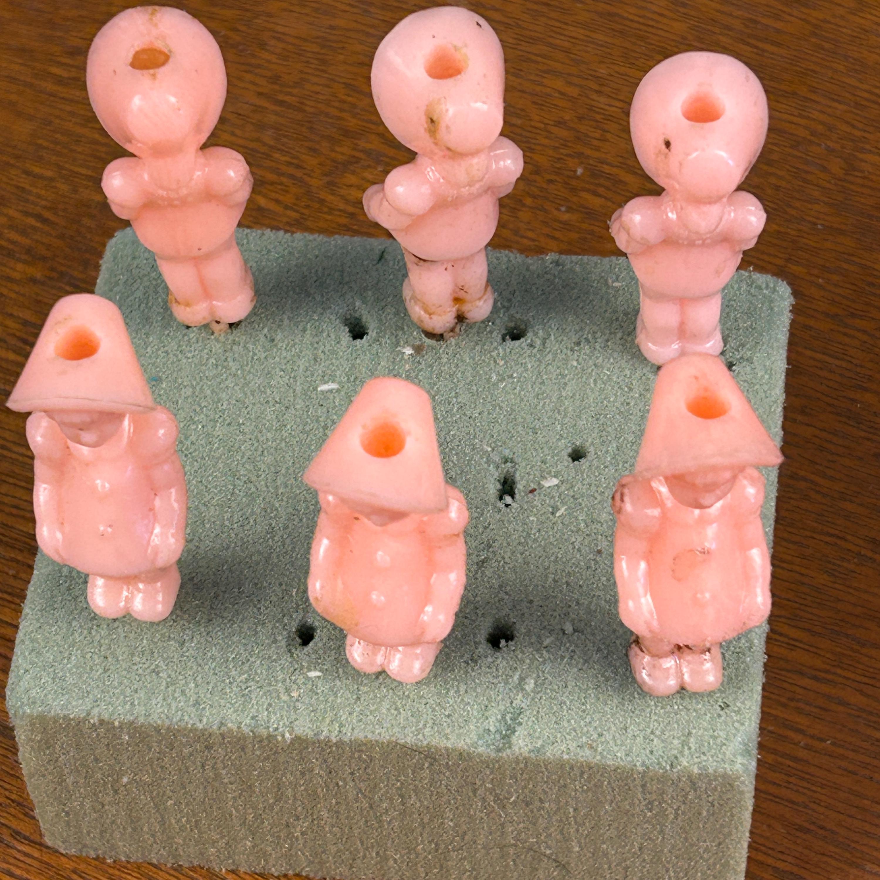 This is a set of 6 vintage hard plastic pink little girl cake topper picks, a charming and harder-to-find variation of mid-century holiday decorations. These petite figurines were popular from the 1950s–1970s and were often tucked into Easter baskets, used as cupcake toppers, or given as small party favors.