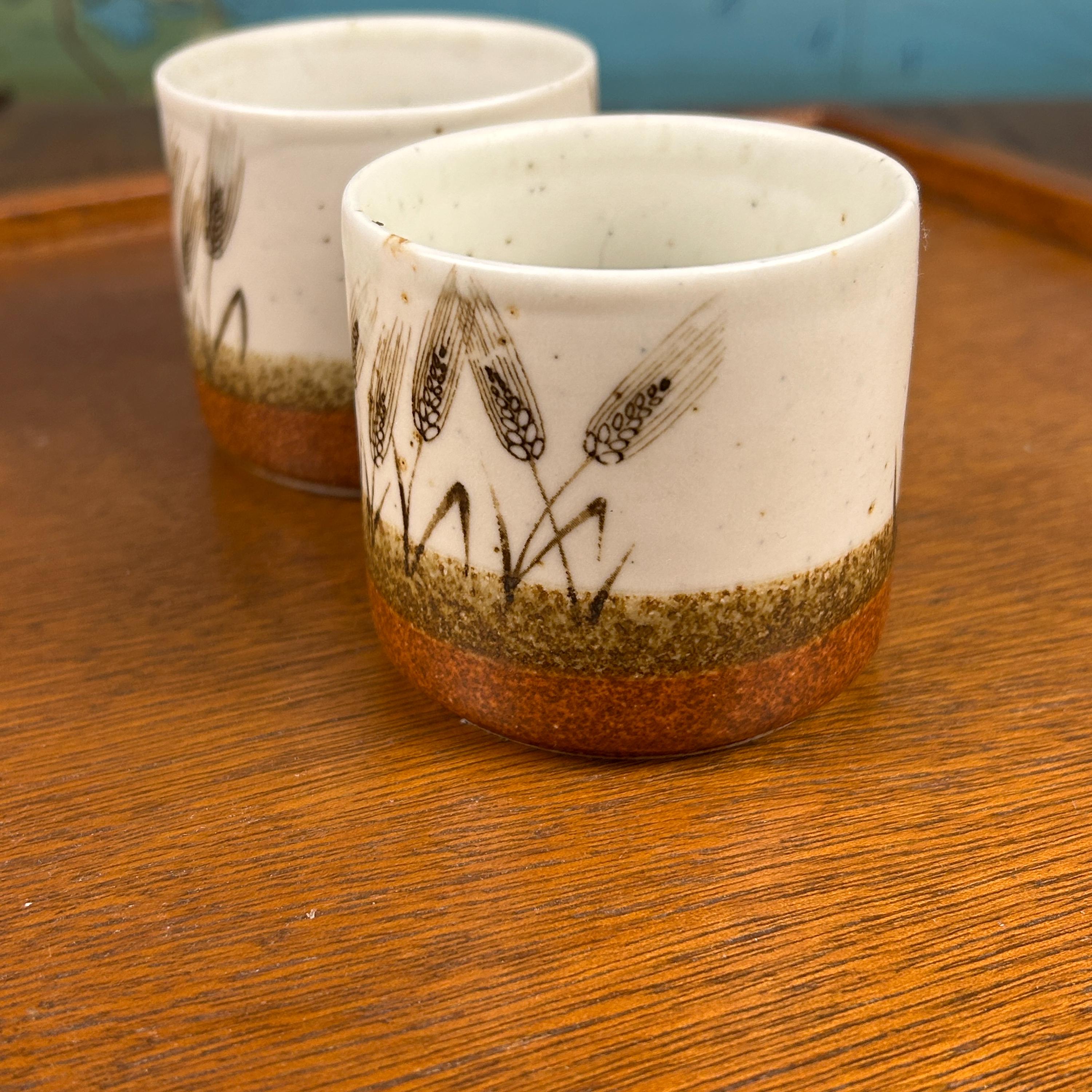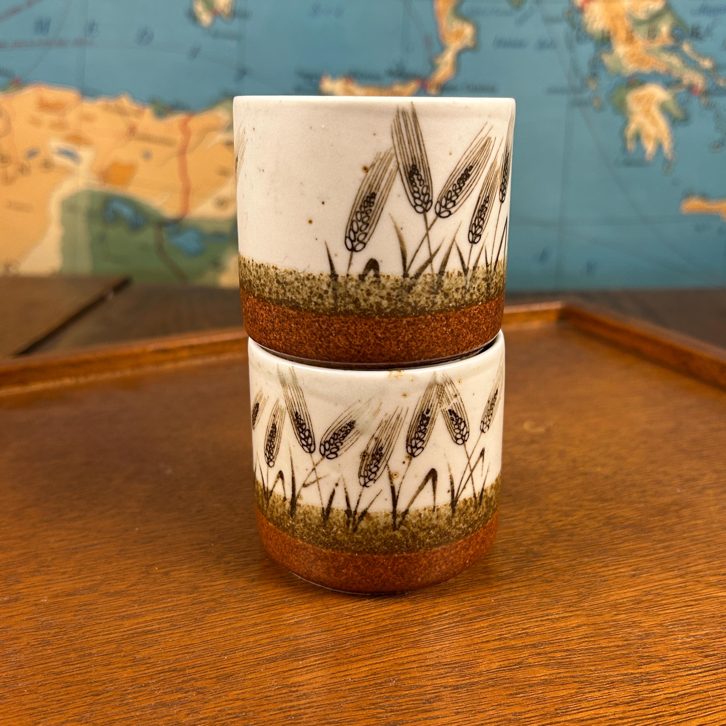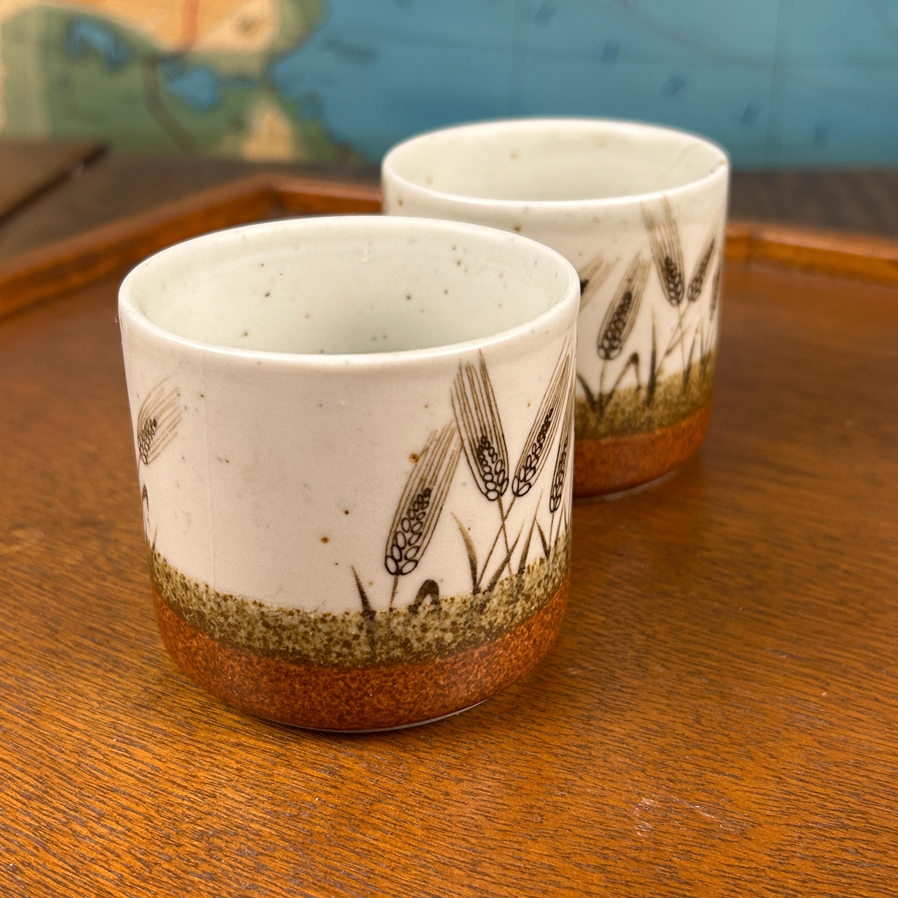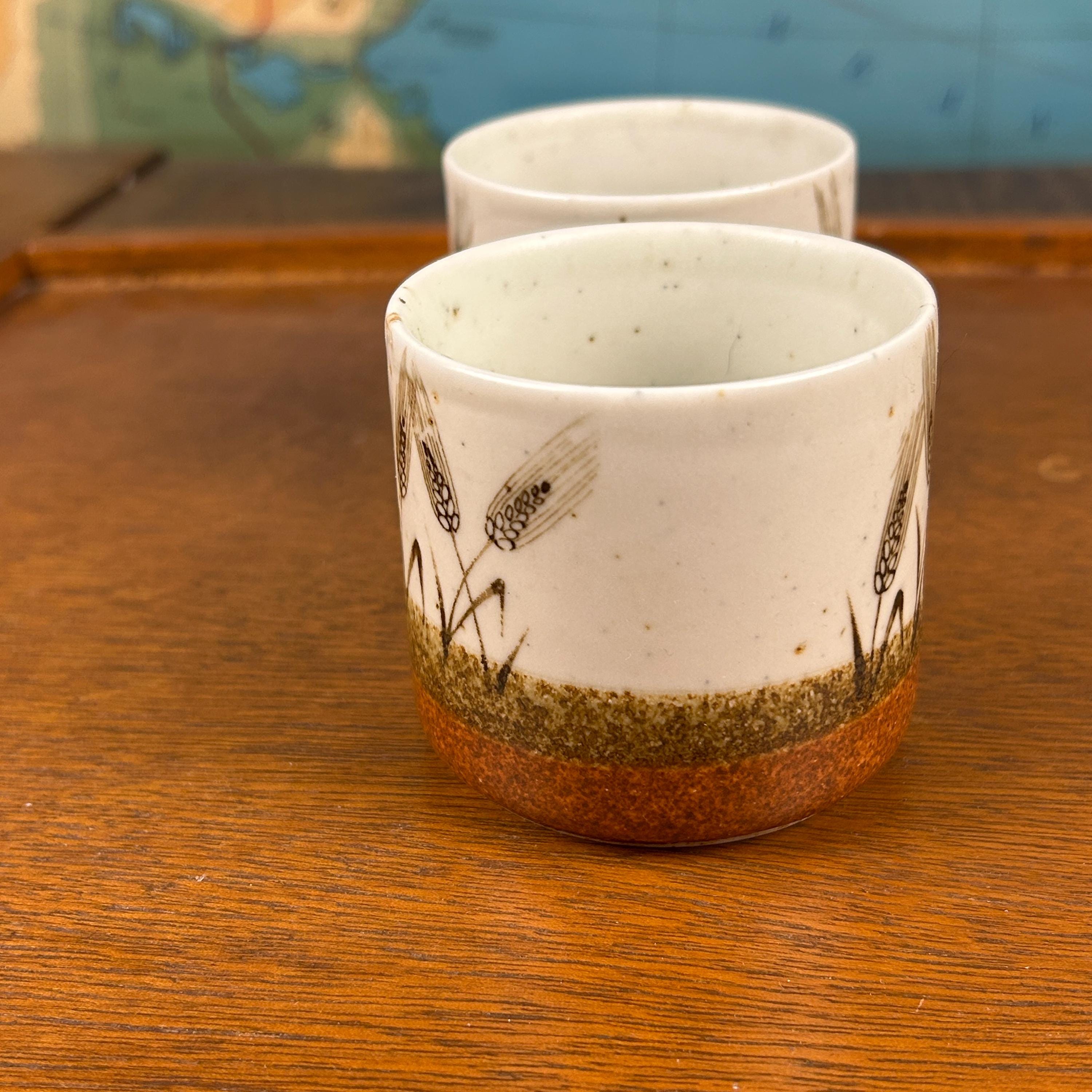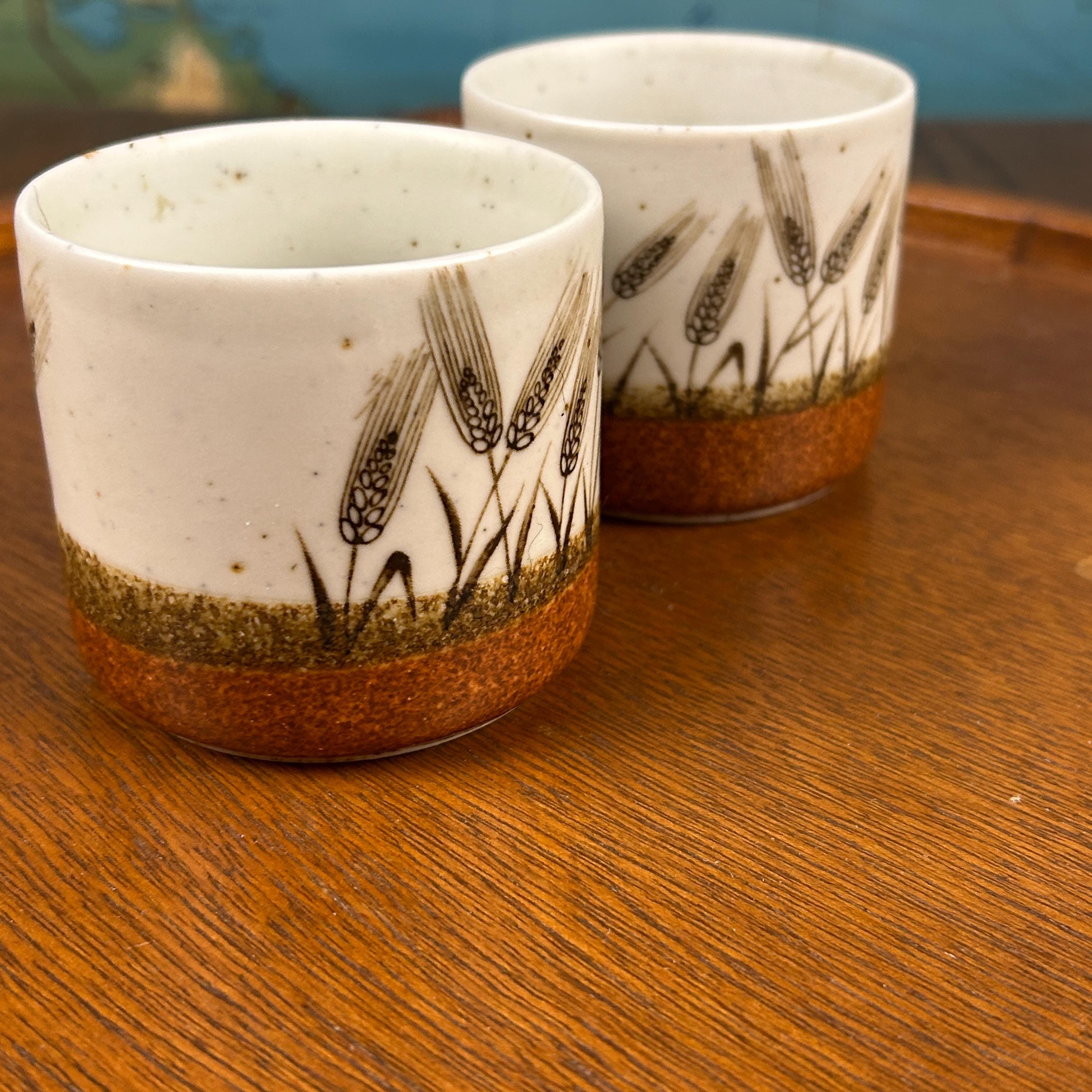 These are vintage stoneware cups by Otagiri Mercantile Company (OMC), made in Japan and featuring a beautifully hand-crafted wheat stalk design painted around the exterior.