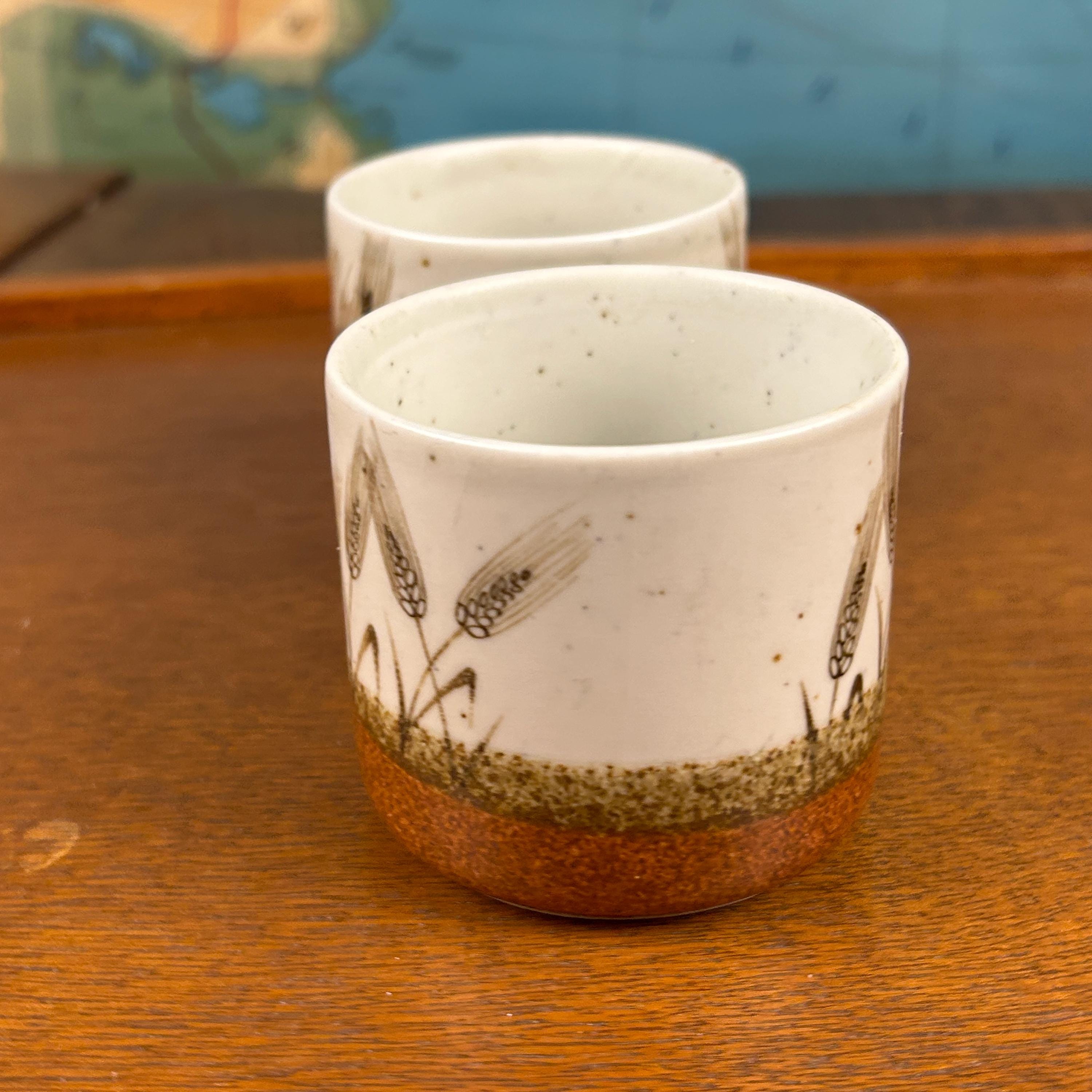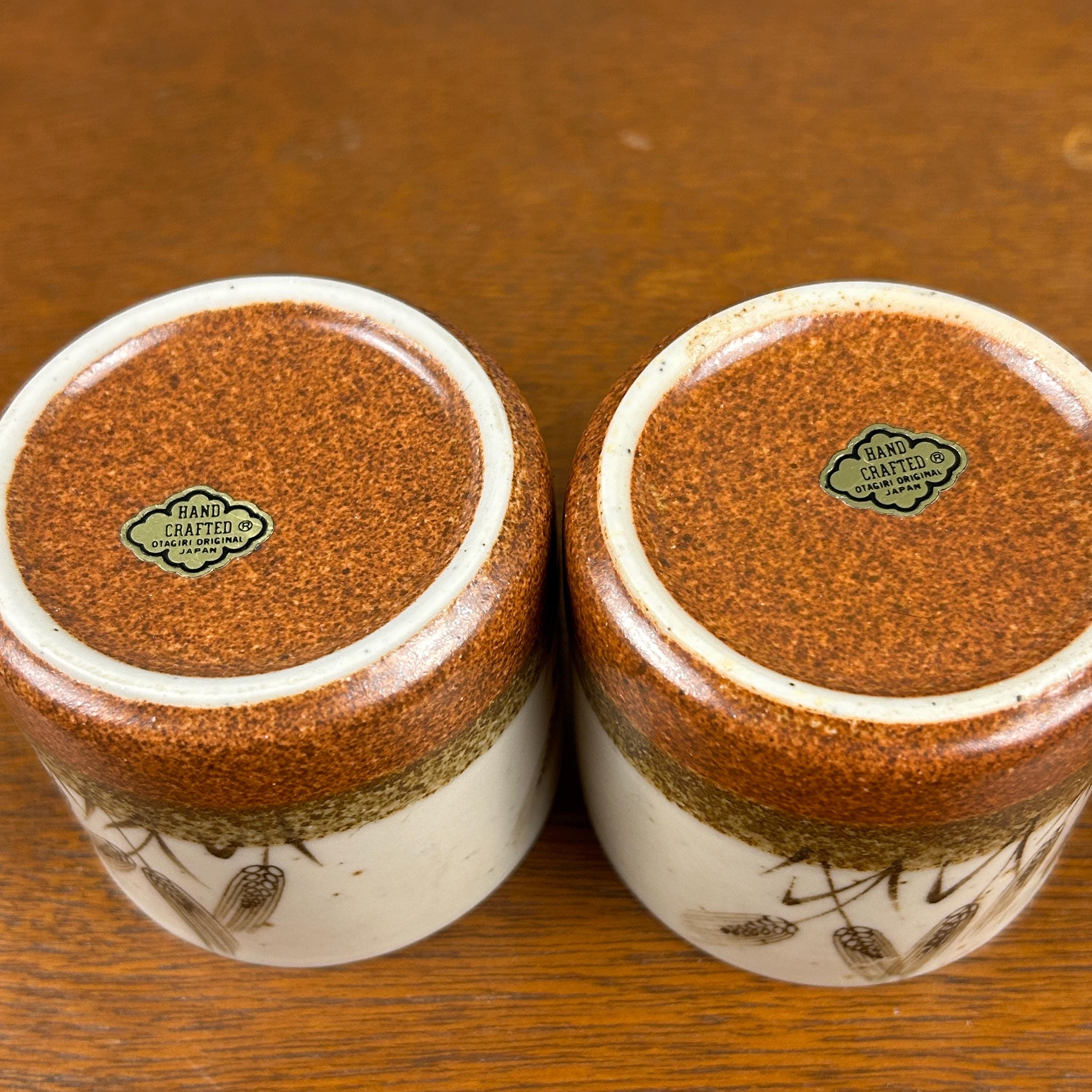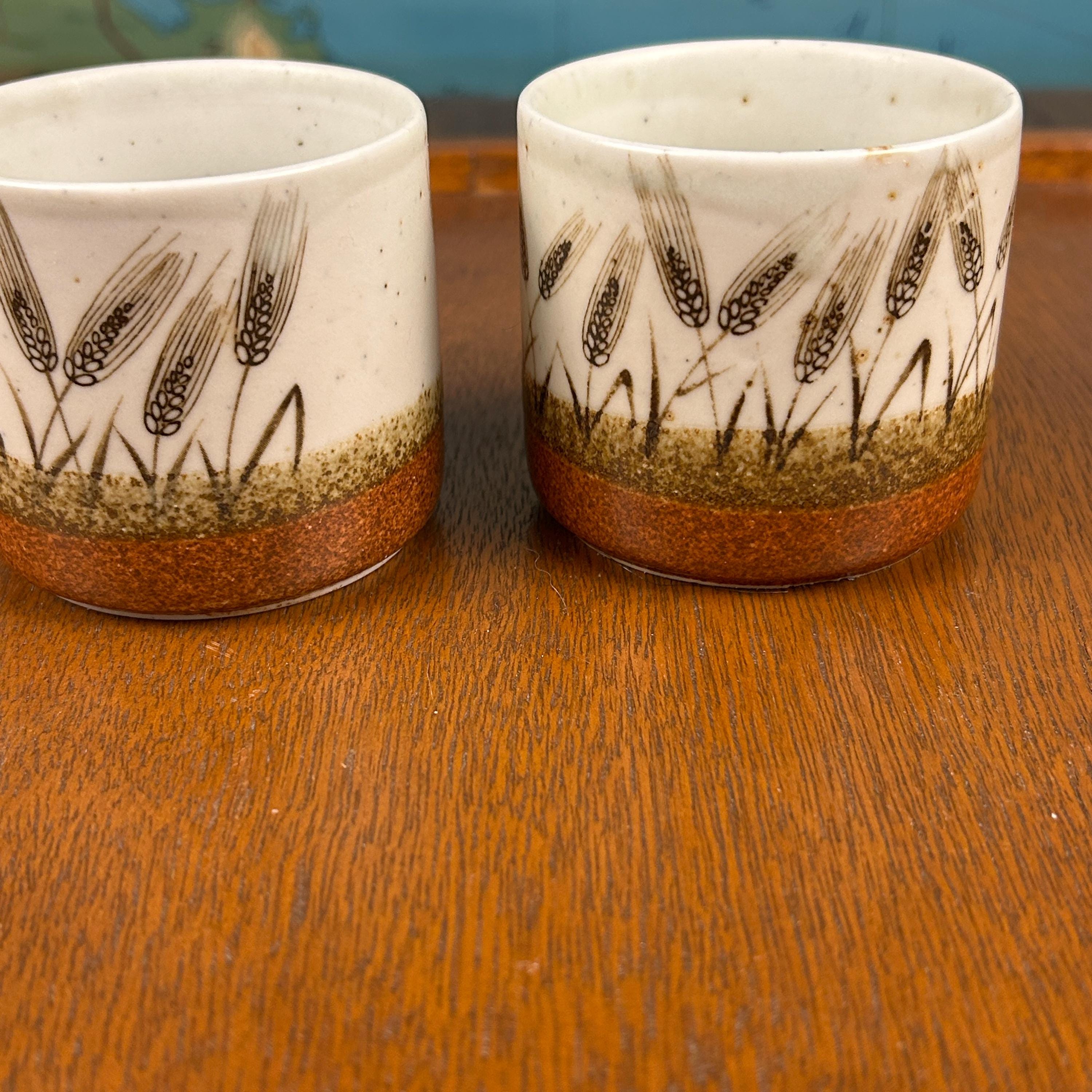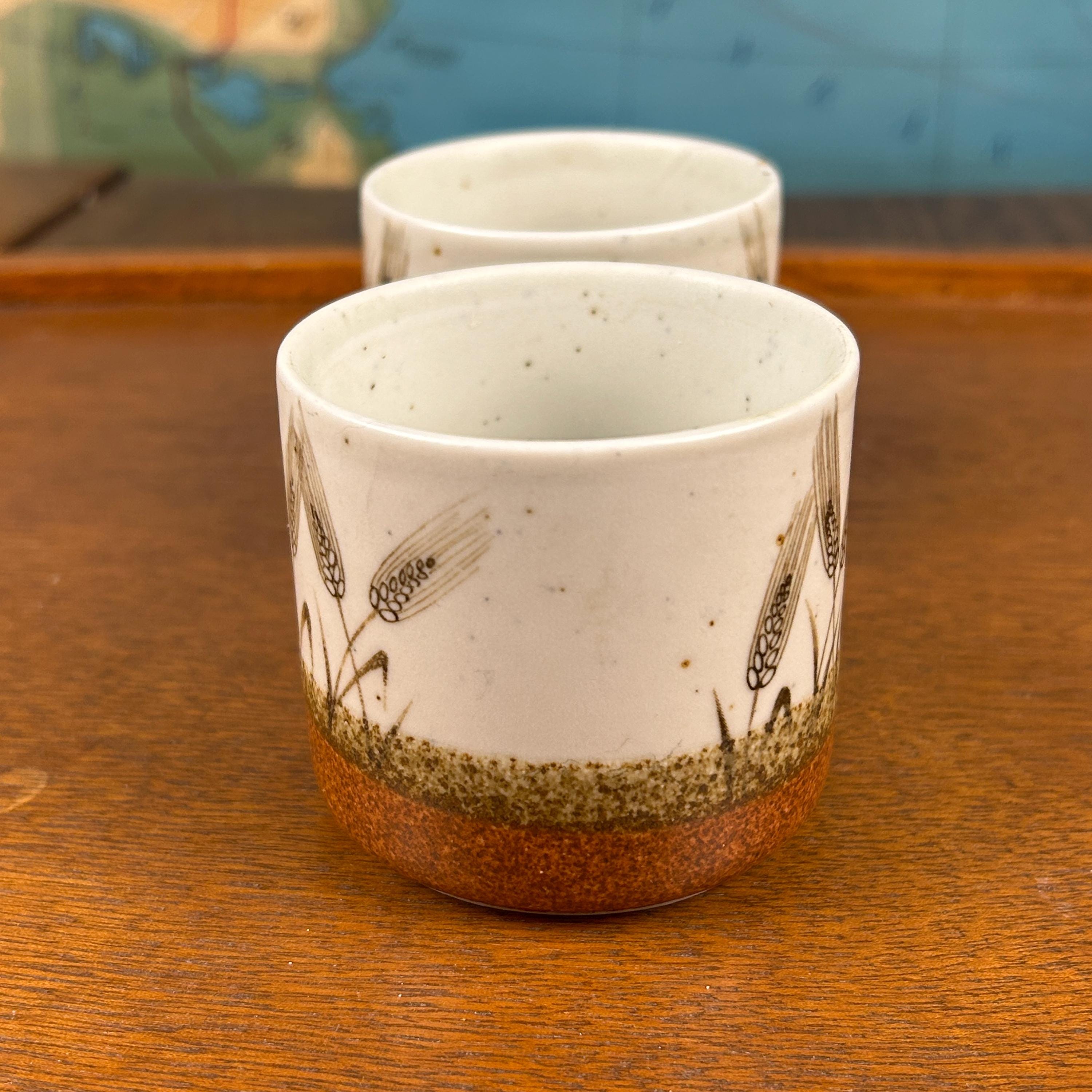 These are vintage stoneware cups by Otagiri Mercantile Company (OMC), made in Japan and featuring a beautifully hand-crafted wheat stalk design painted around the exterior.