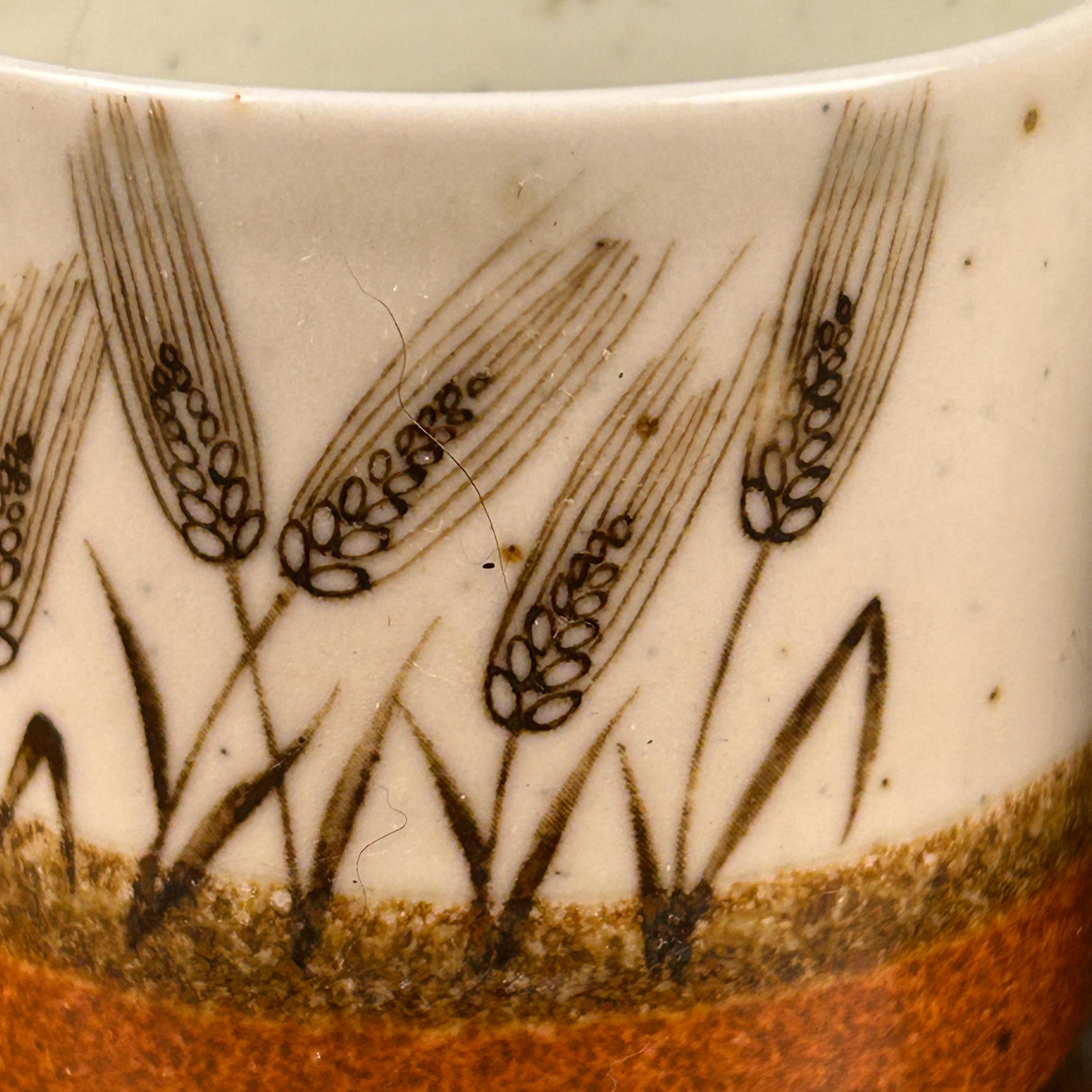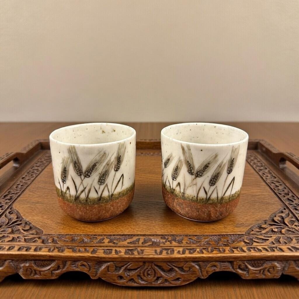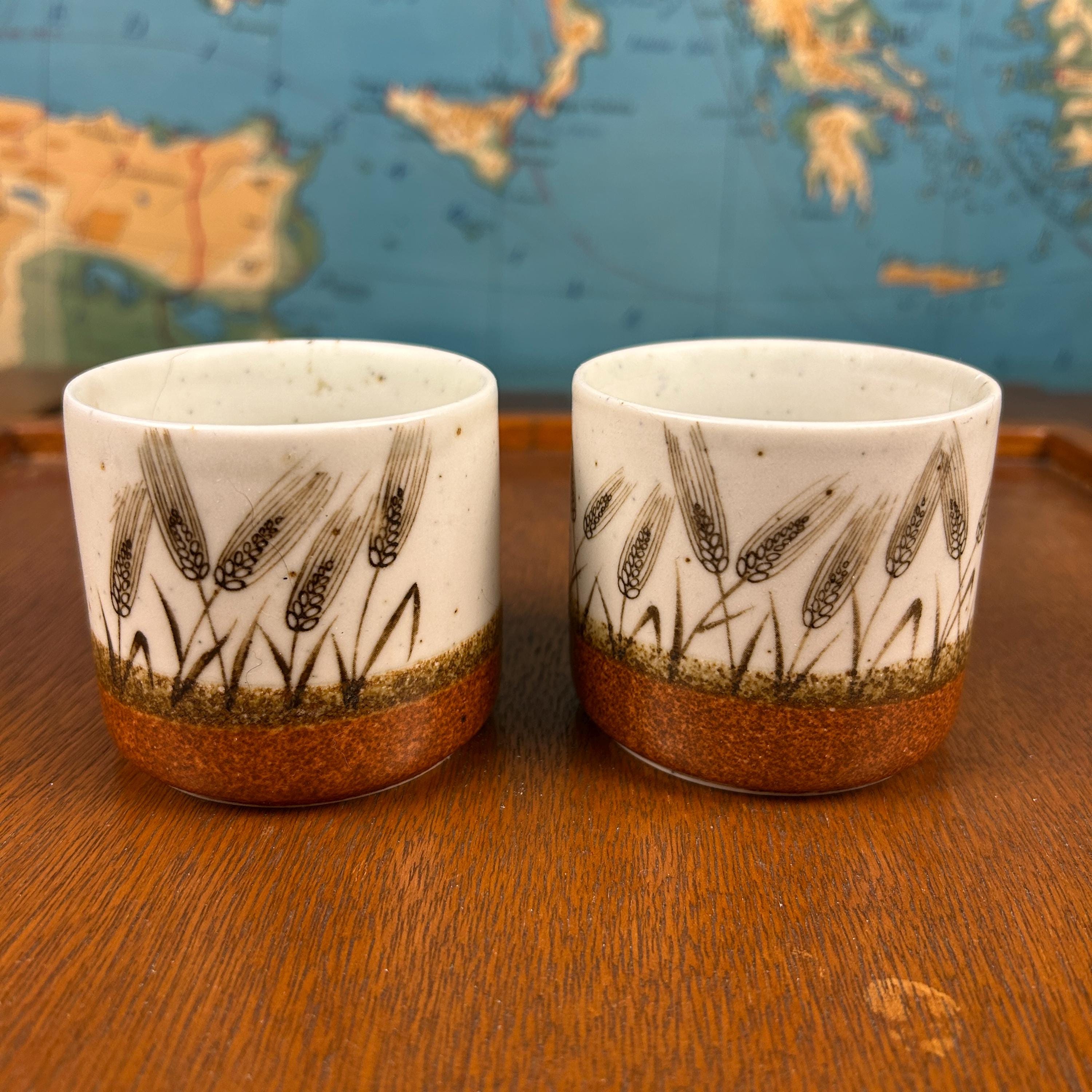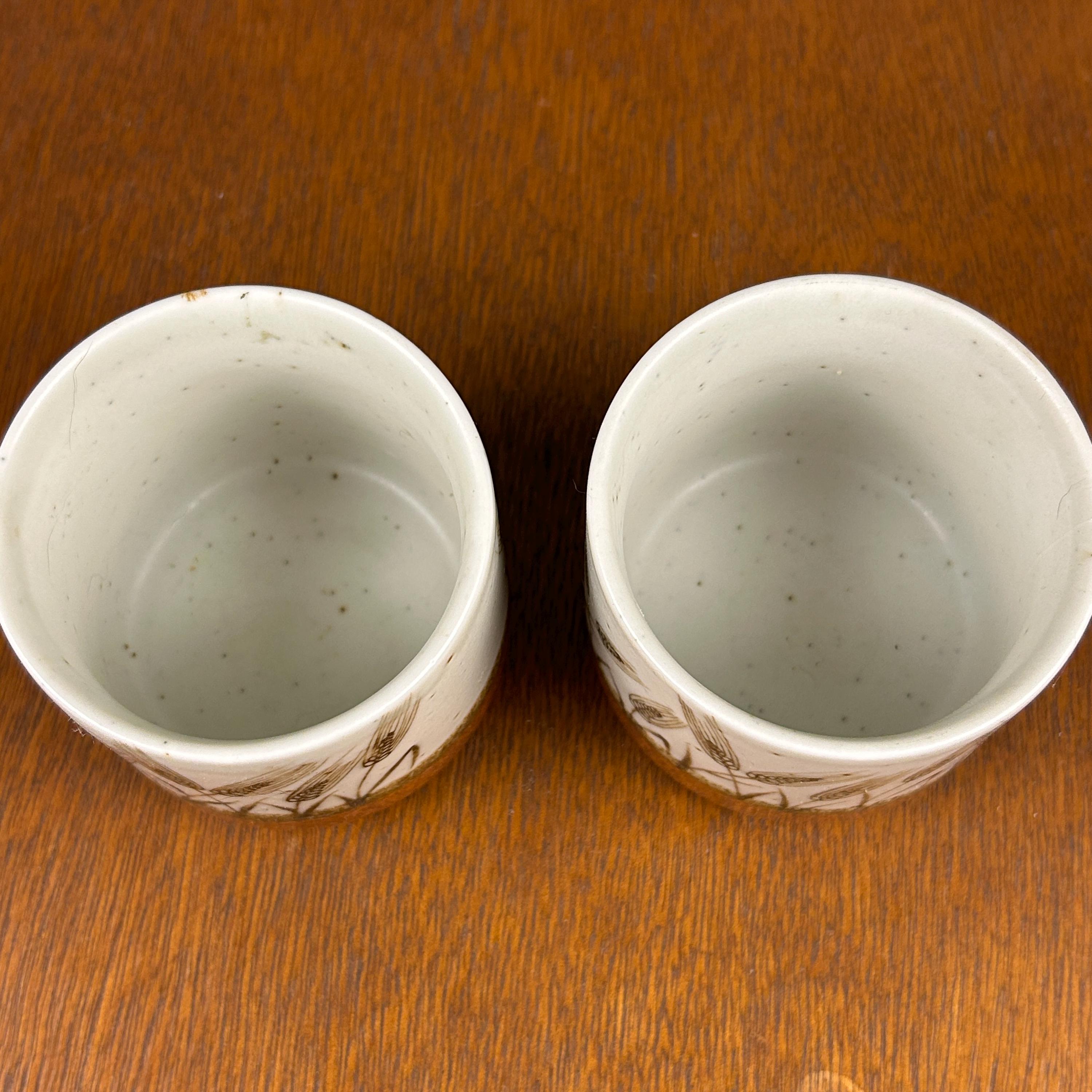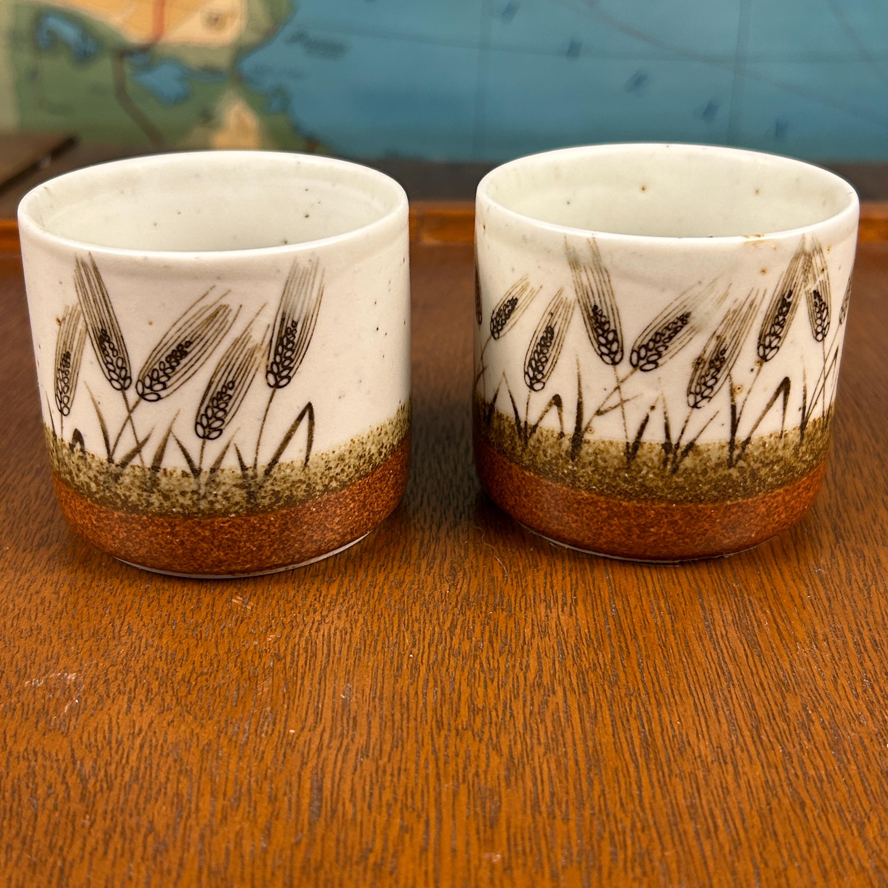 These are vintage stoneware cups by Otagiri Mercantile Company (OMC), made in Japan and featuring a beautifully hand-crafted wheat stalk design painted around the exterior.