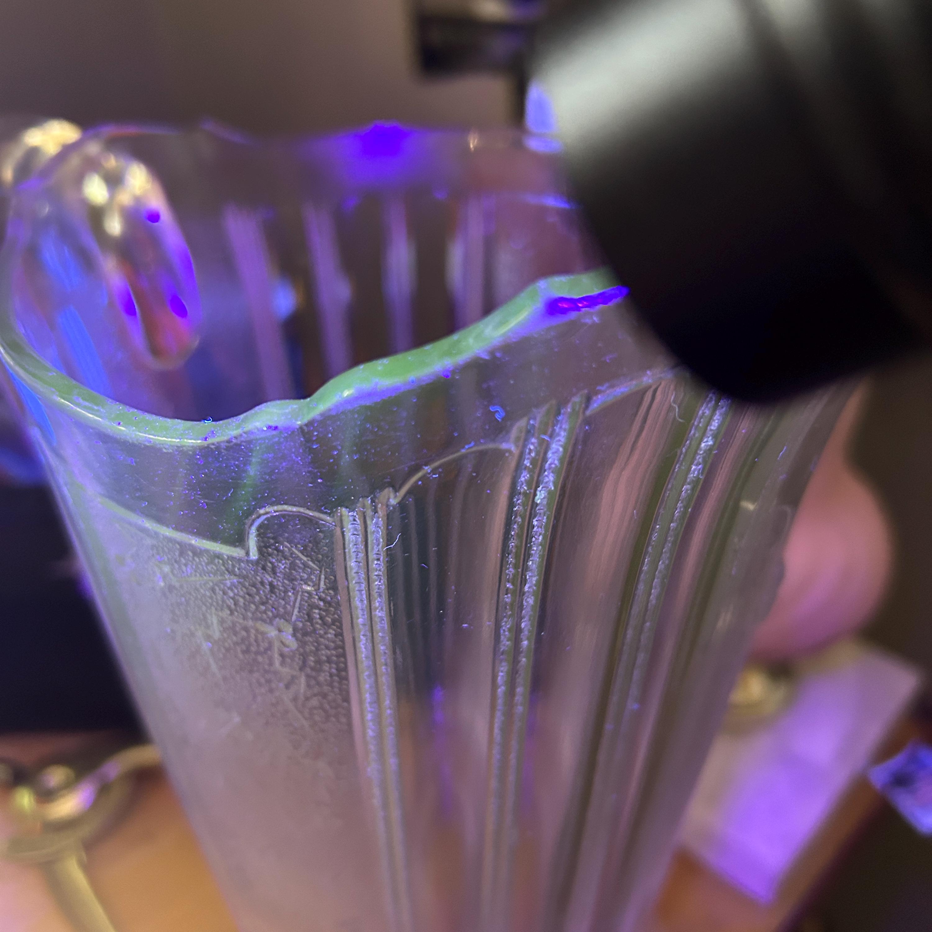 Made of clear pressed glass, the pitcher features the crisp, repeating botanical motif that made this pattern popular in the late 19th century. A particularly desirable feature of this piece is that the glass fluoresces a yellow-green color under long-wave UV light, a trait prized by collectors of antique and uranium-adjacent glass.