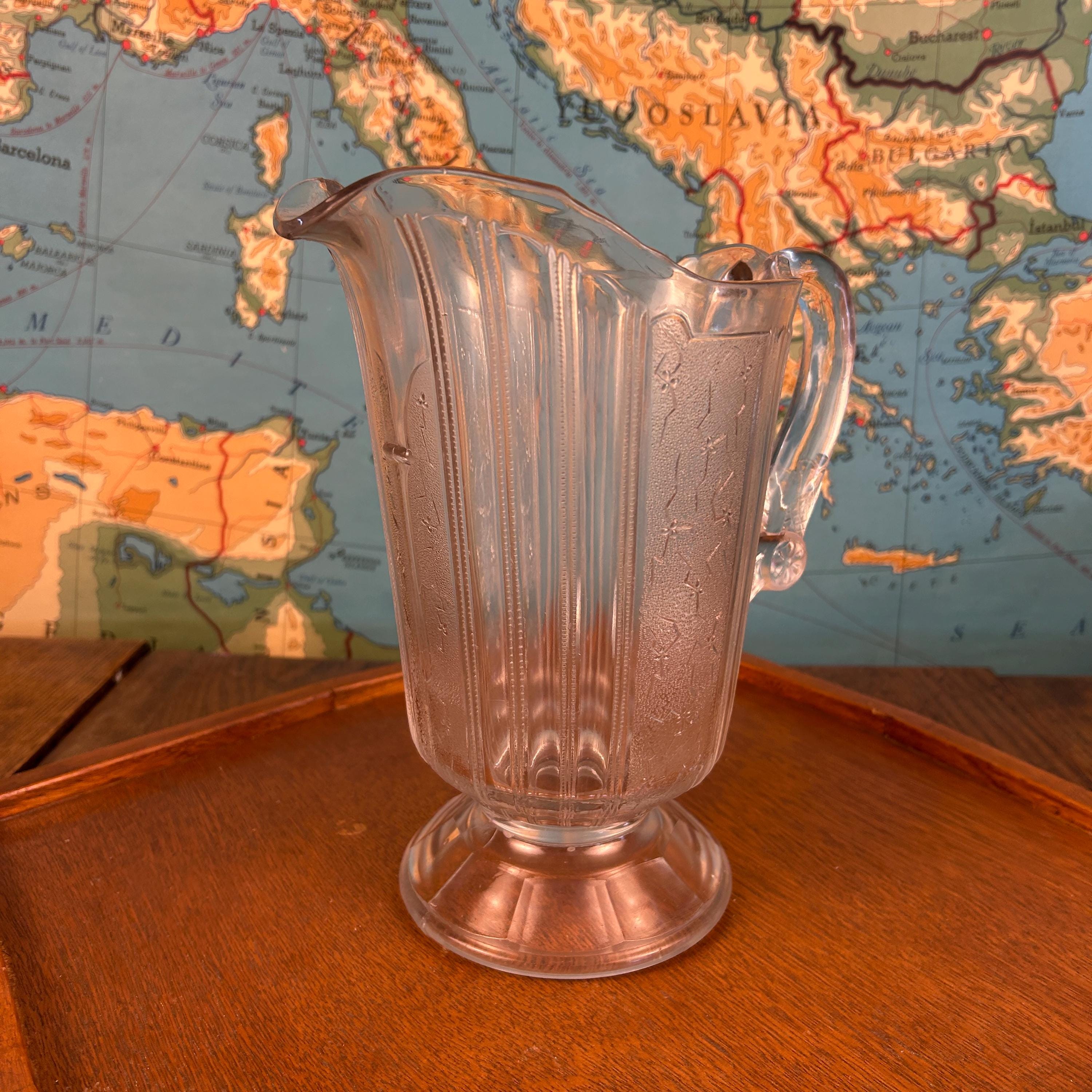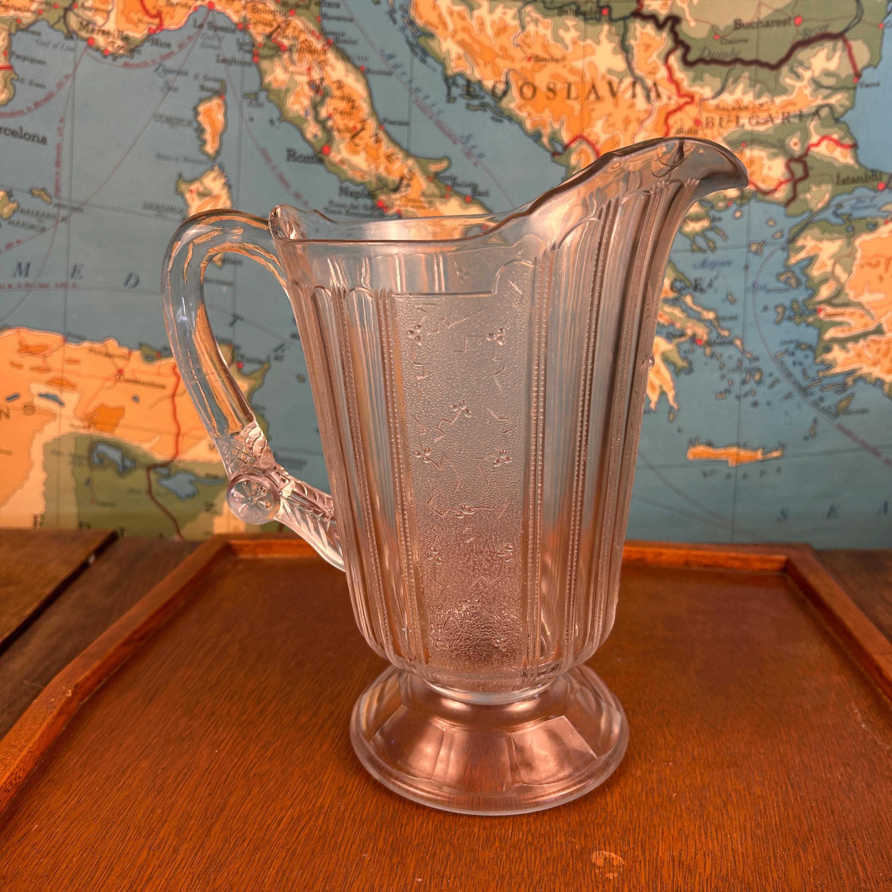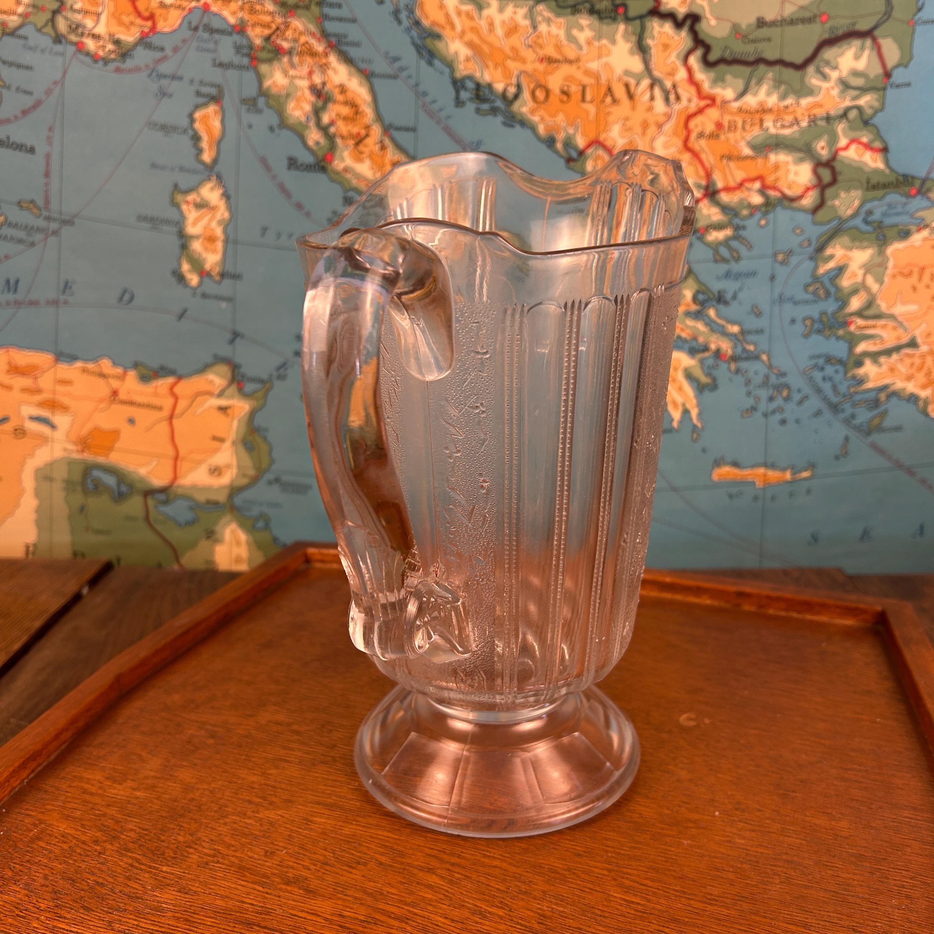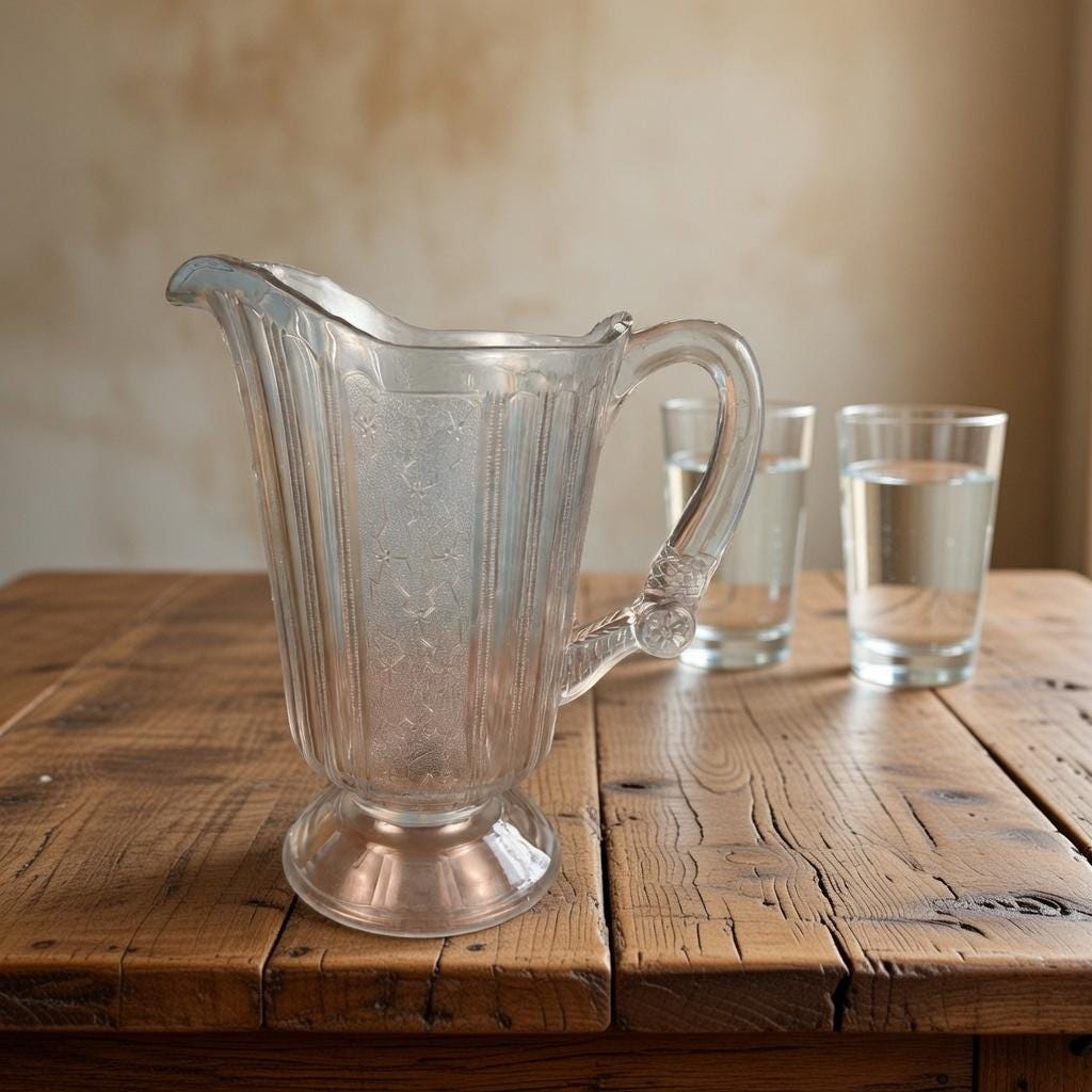 Originally intended for table use, this pitcher is now best appreciated as a collectible display piece, representing the craftsmanship and decorative style of Victorian-era American glassmaking.
