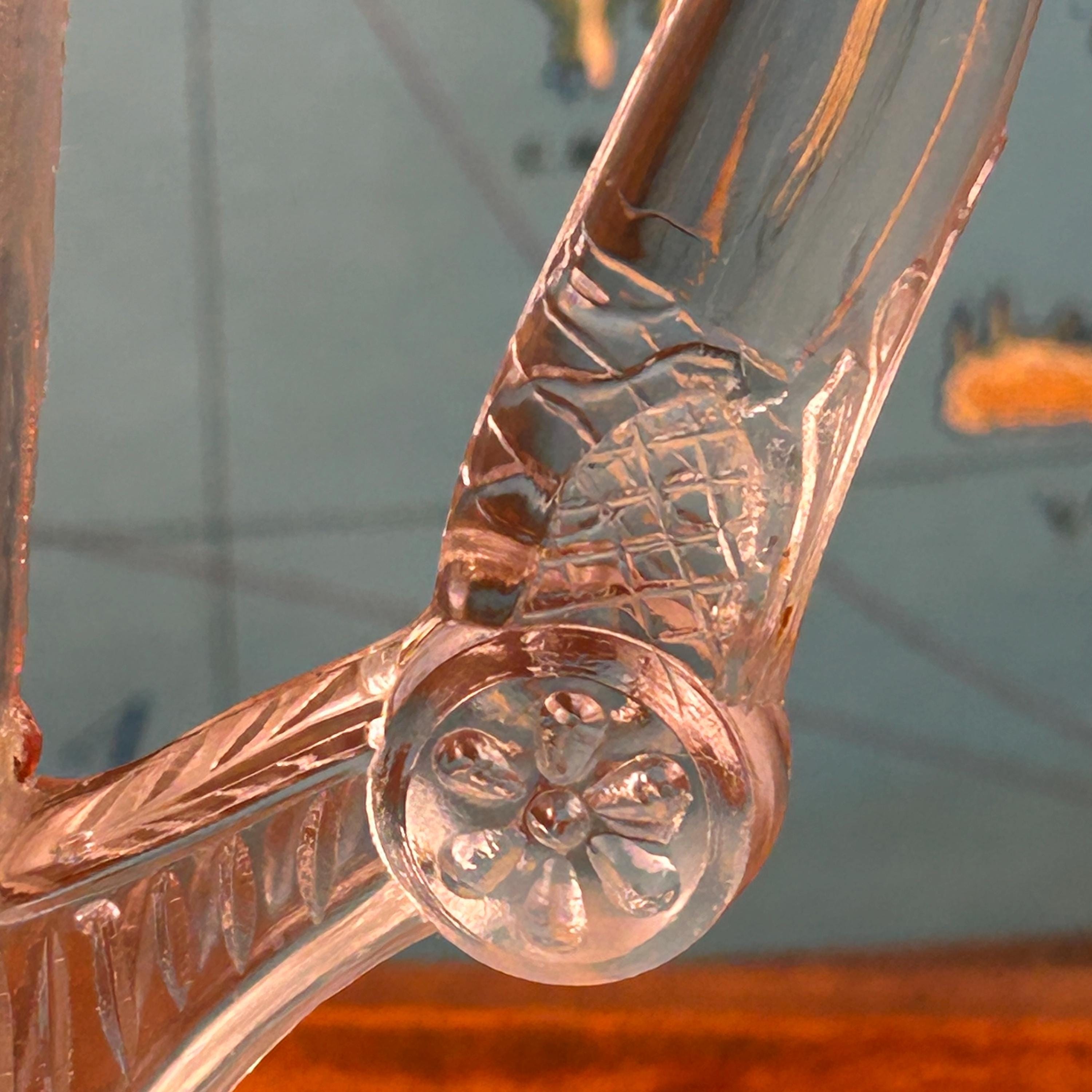 Good antique condition with wear consistent with age and use. There is a chip on the edge of one side of the spout. Please see photos. Minor surface marks or manufacturing irregularities typical of early pressed glass may be present. Please review all photos carefully, as they are part of the description.