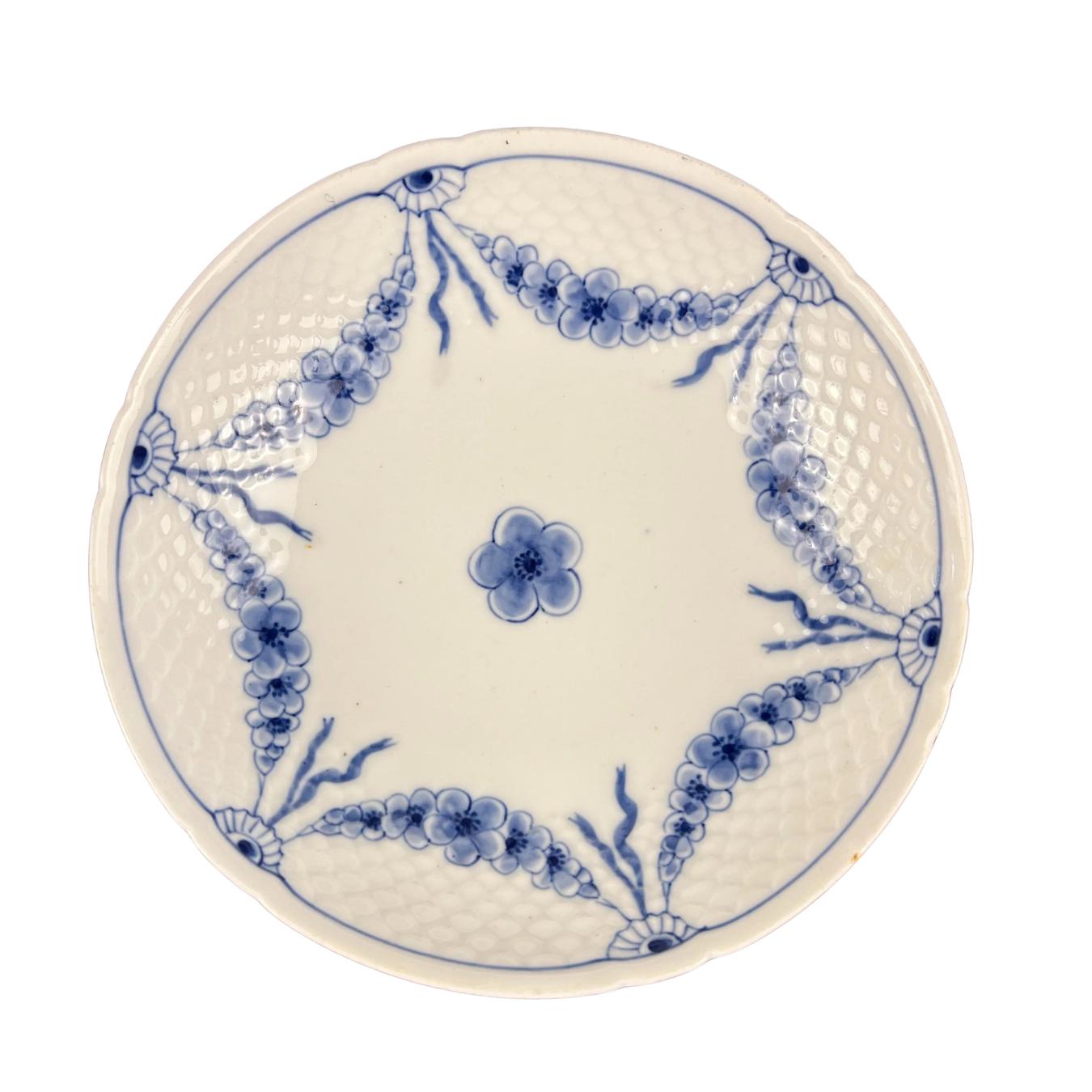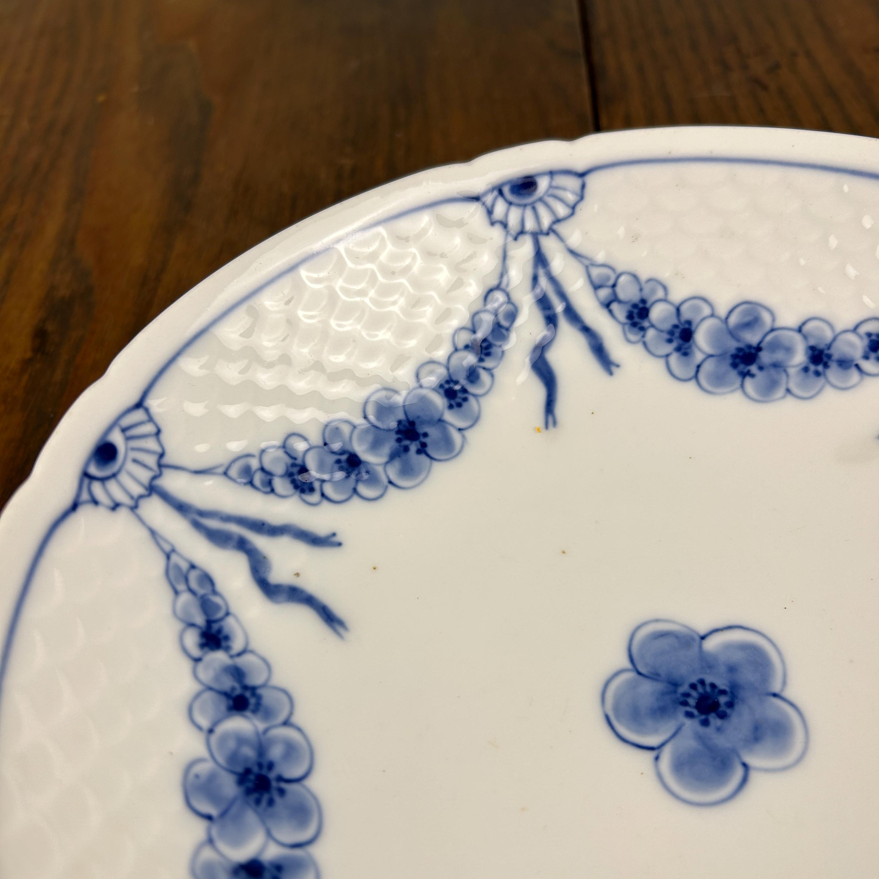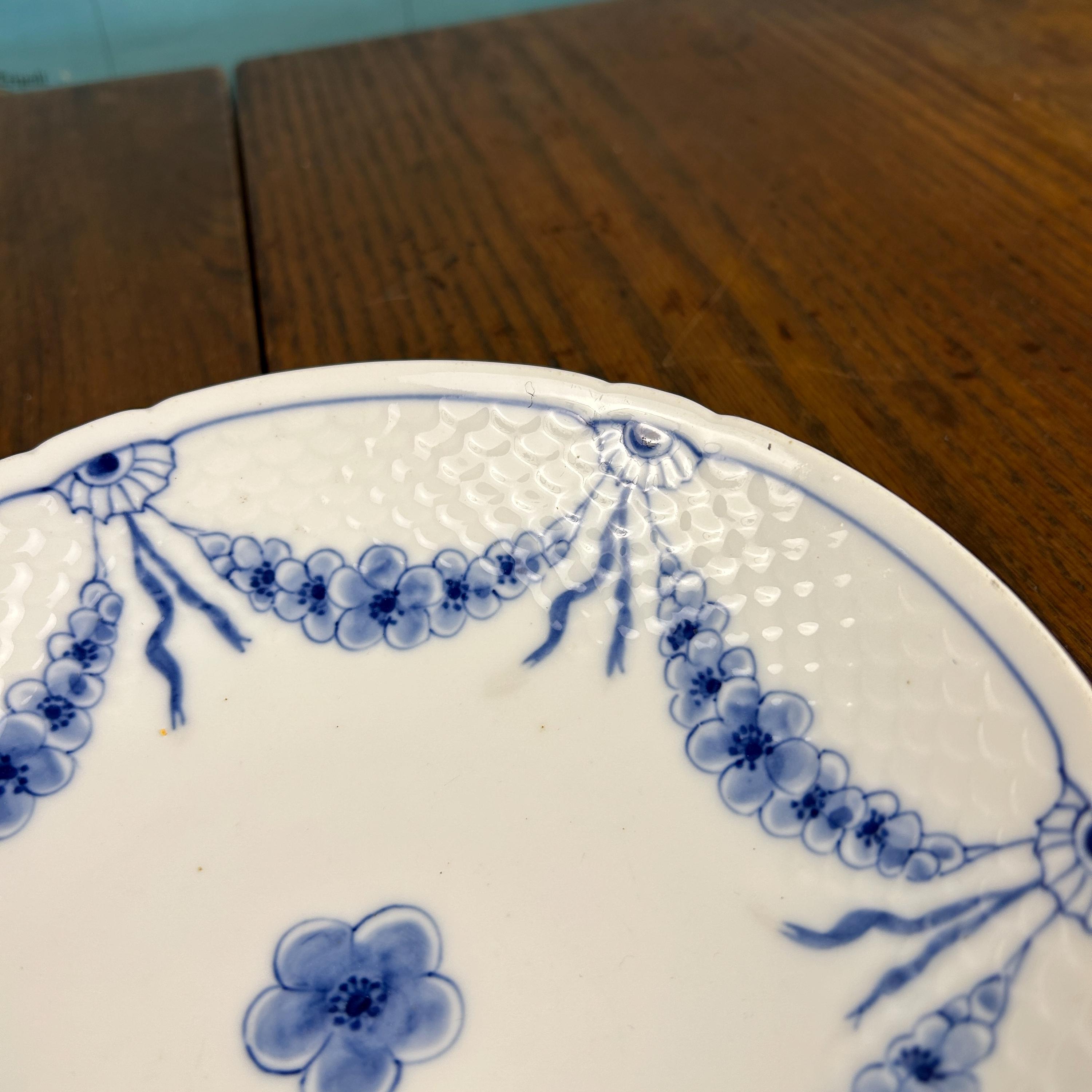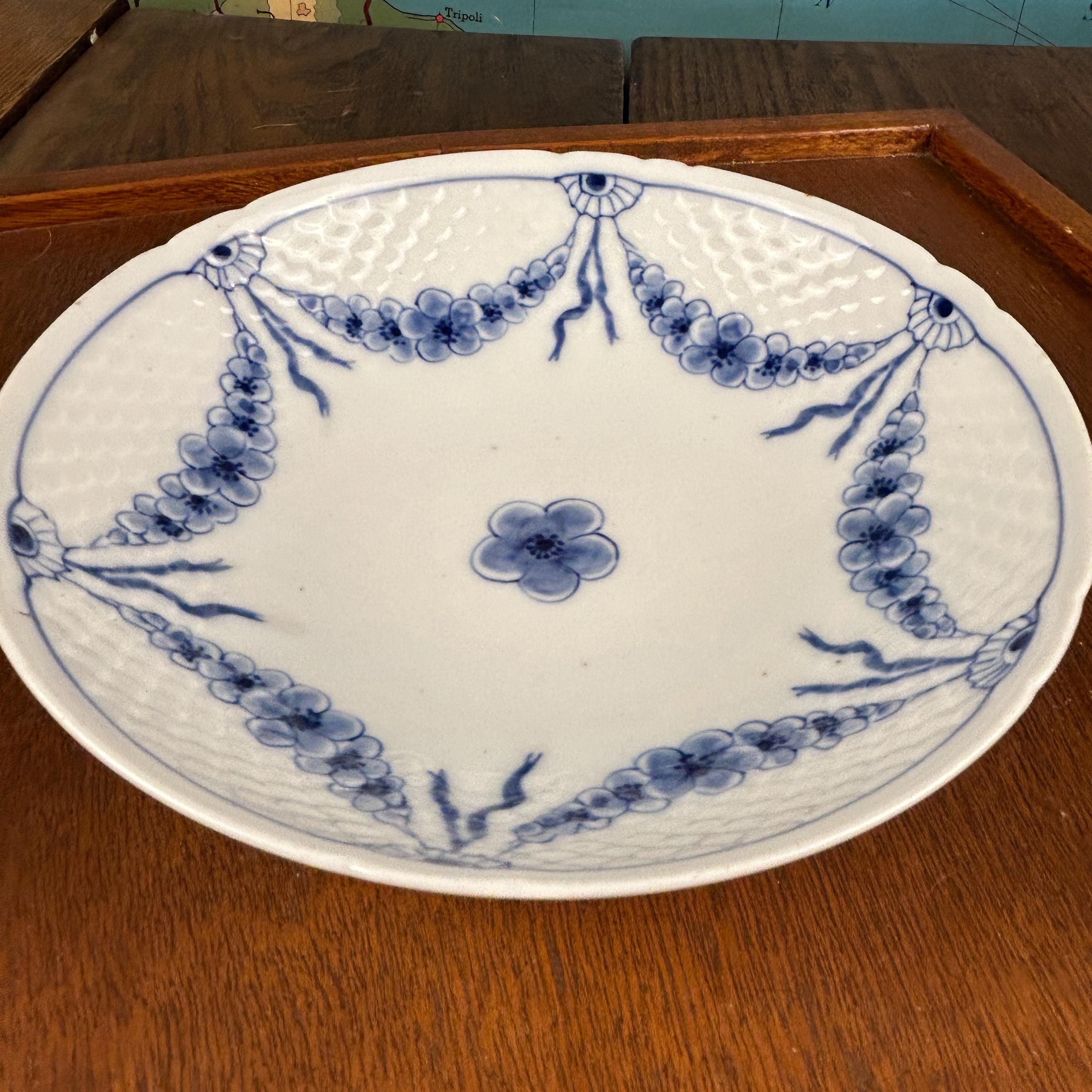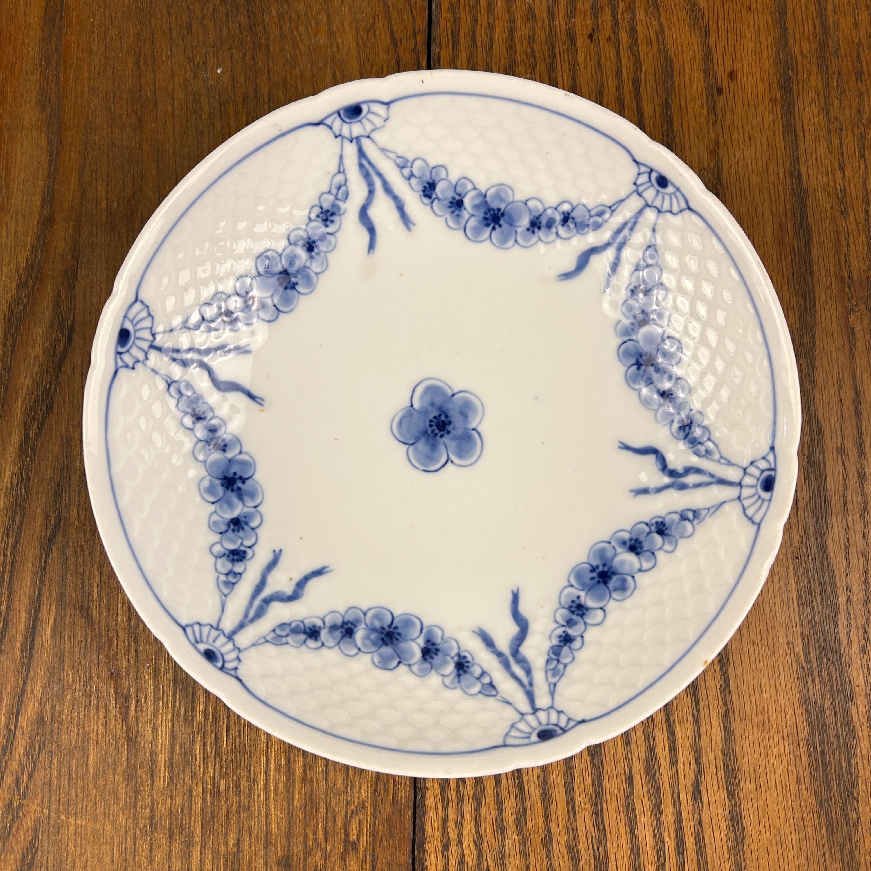 The plate features a crisp white ground with a distinctive molded scale border, accented by hand-painted blue floral swags—a signature look of the Empire Blue and White pattern. This pattern was discontinued circa 1969, making it a desirable piece for collectors of Scandinavian porcelain.