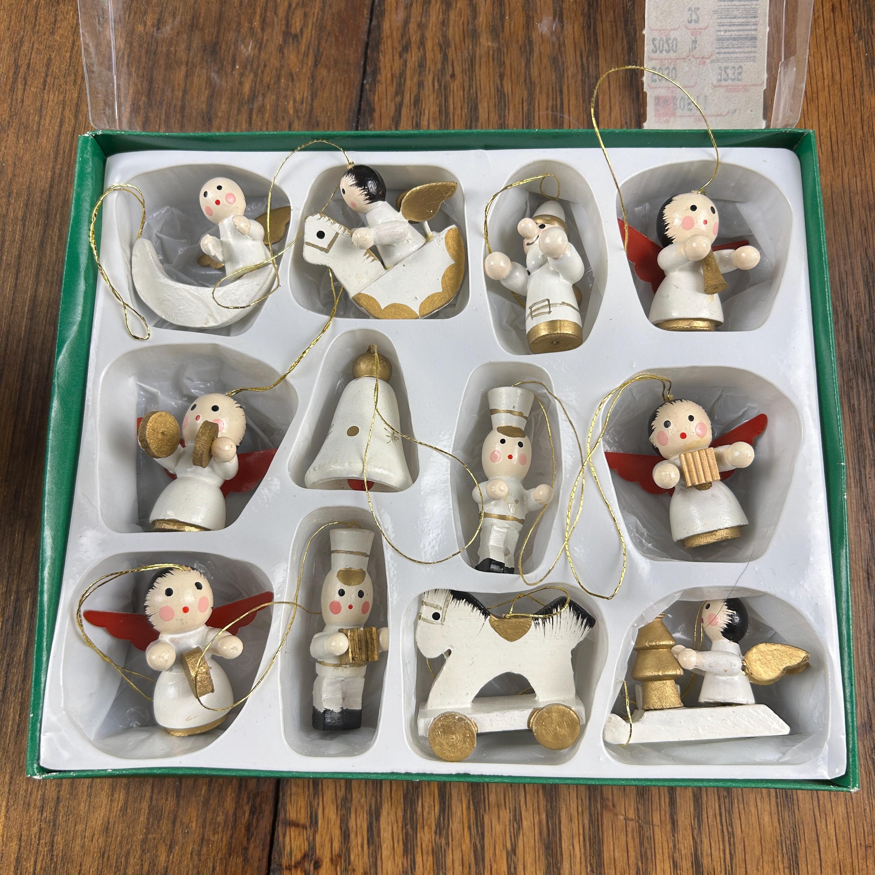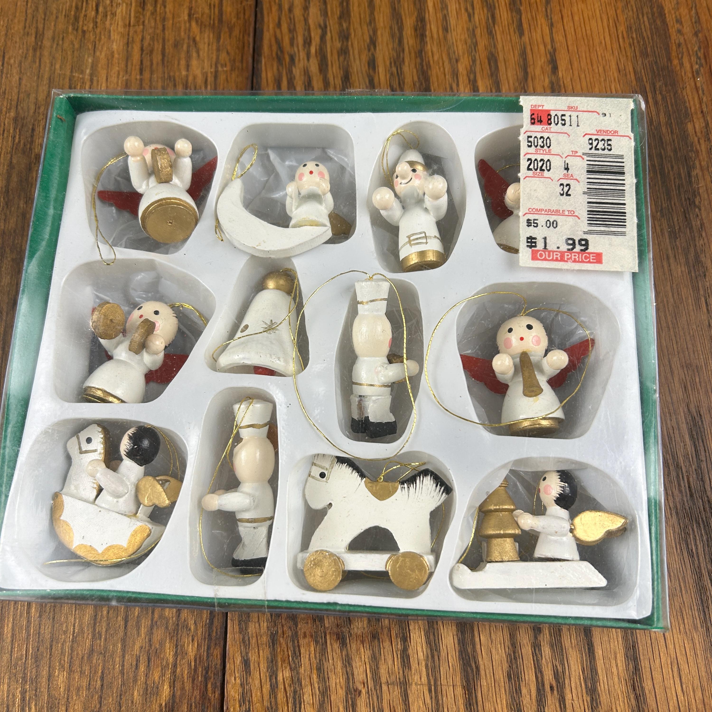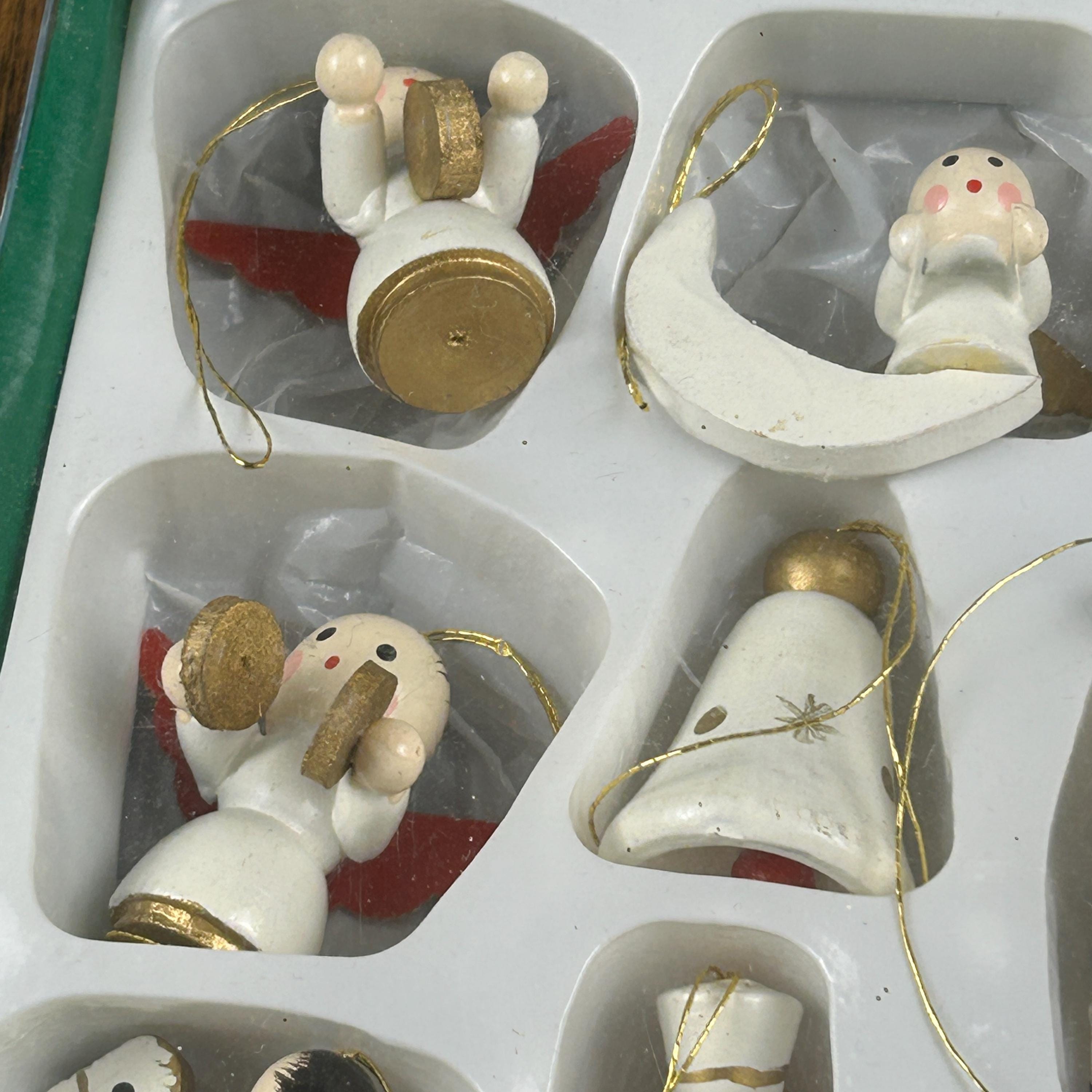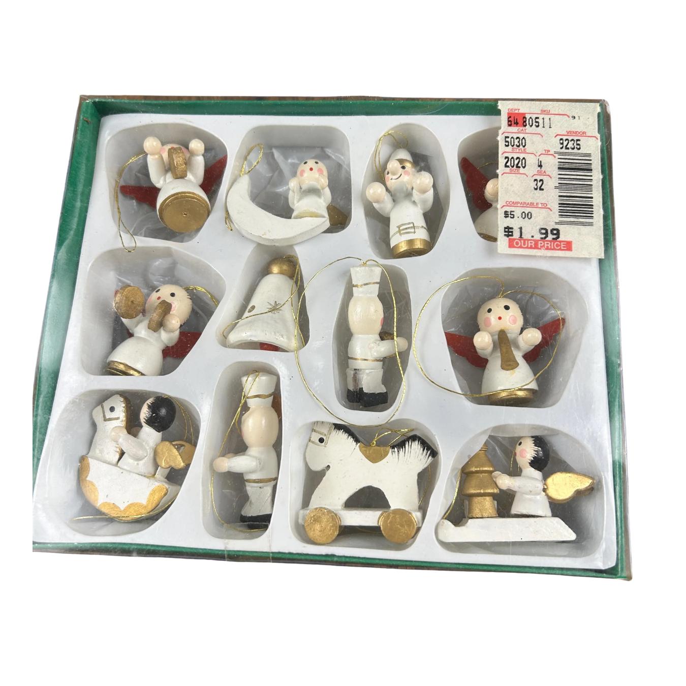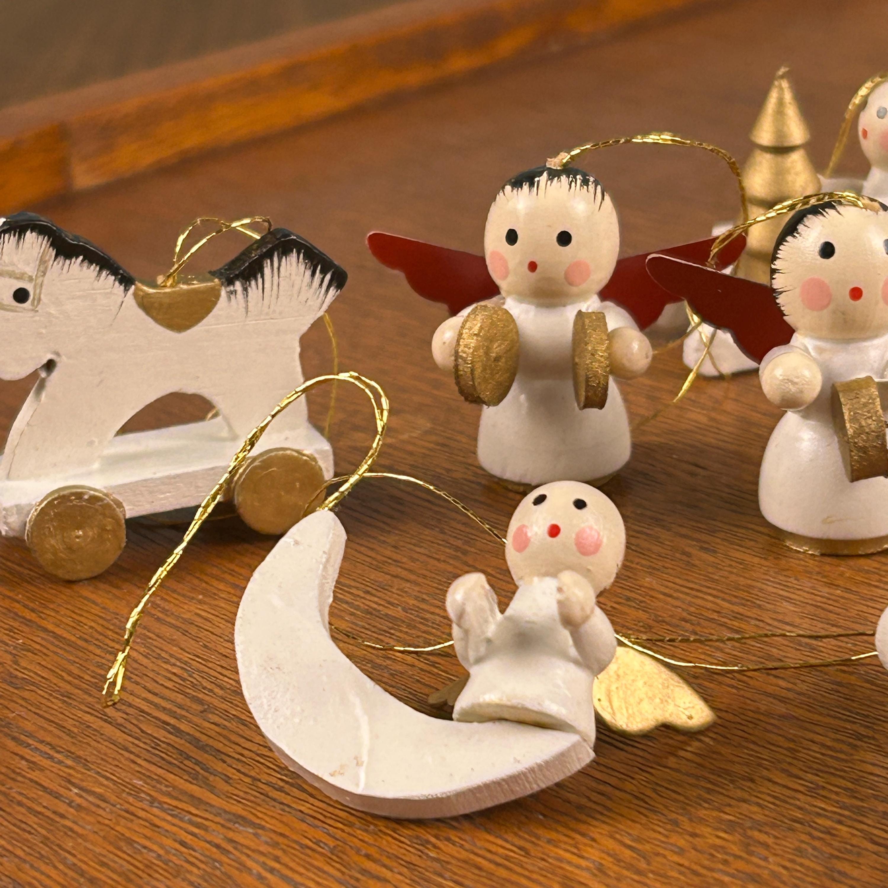 This is a beautiful set of 12 hand-painted wooden Christmas tree ornaments from Brubaker, featuring a charming Guardian Angel theme. Designed in Germany, these ornaments reflect traditional European Christmas style with delicate painting and timeless symbolism.