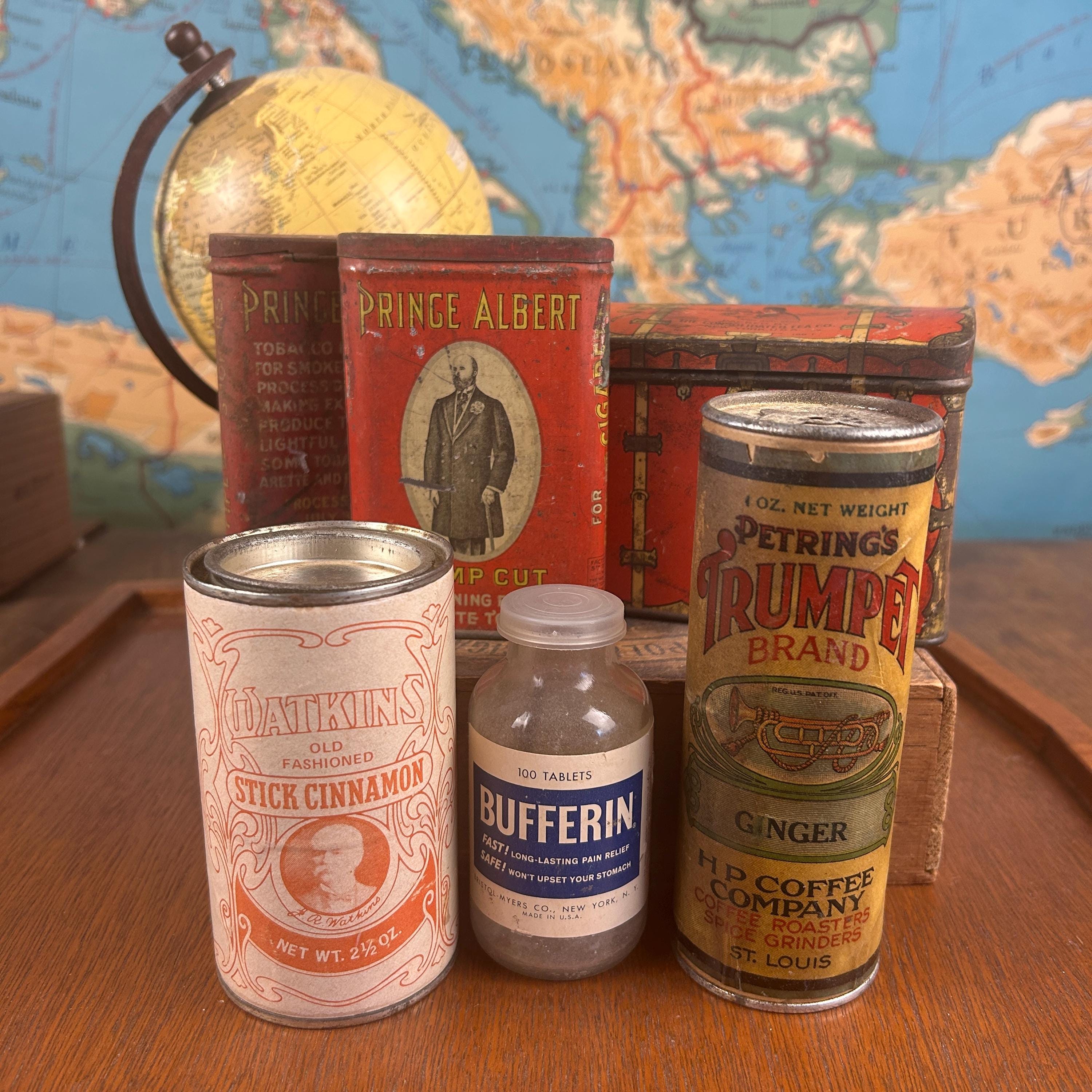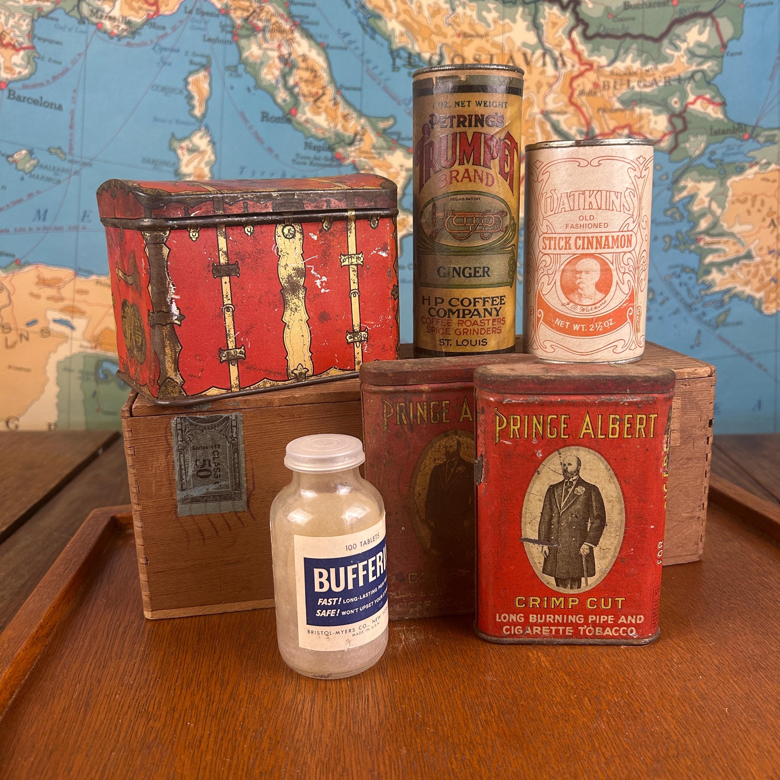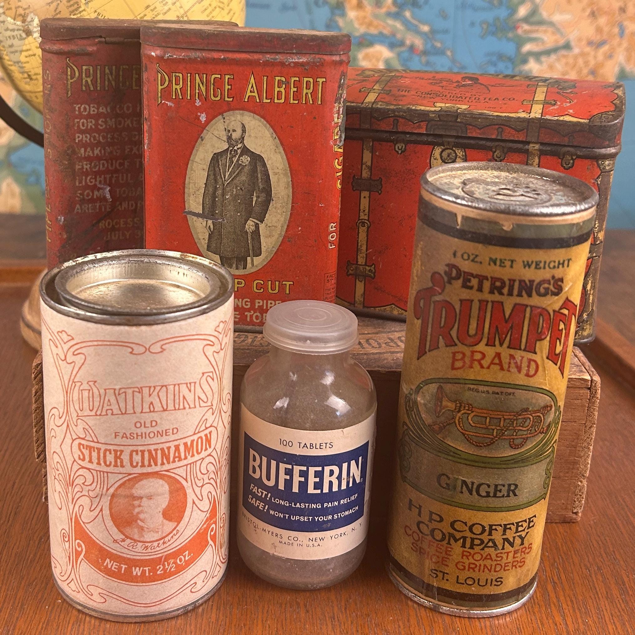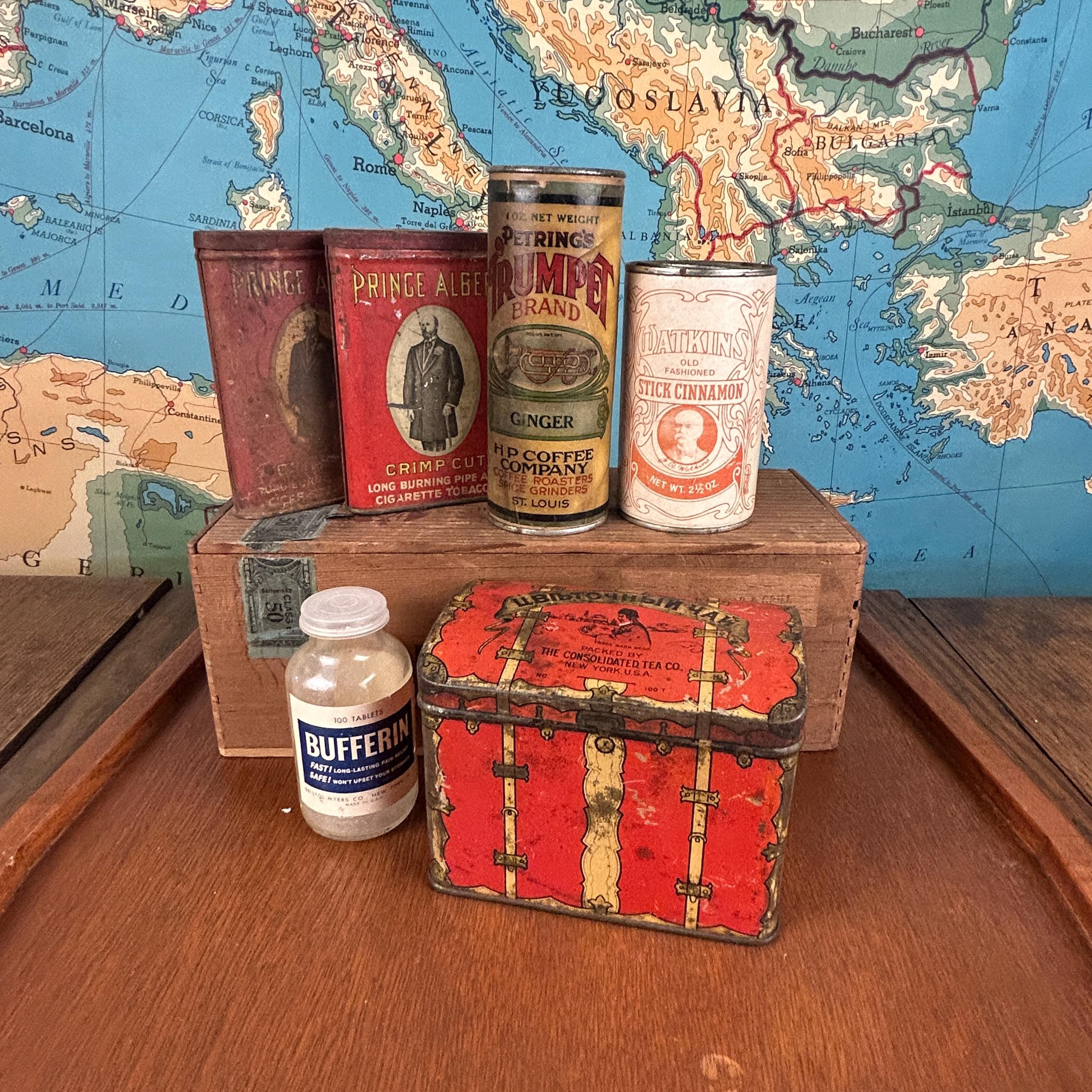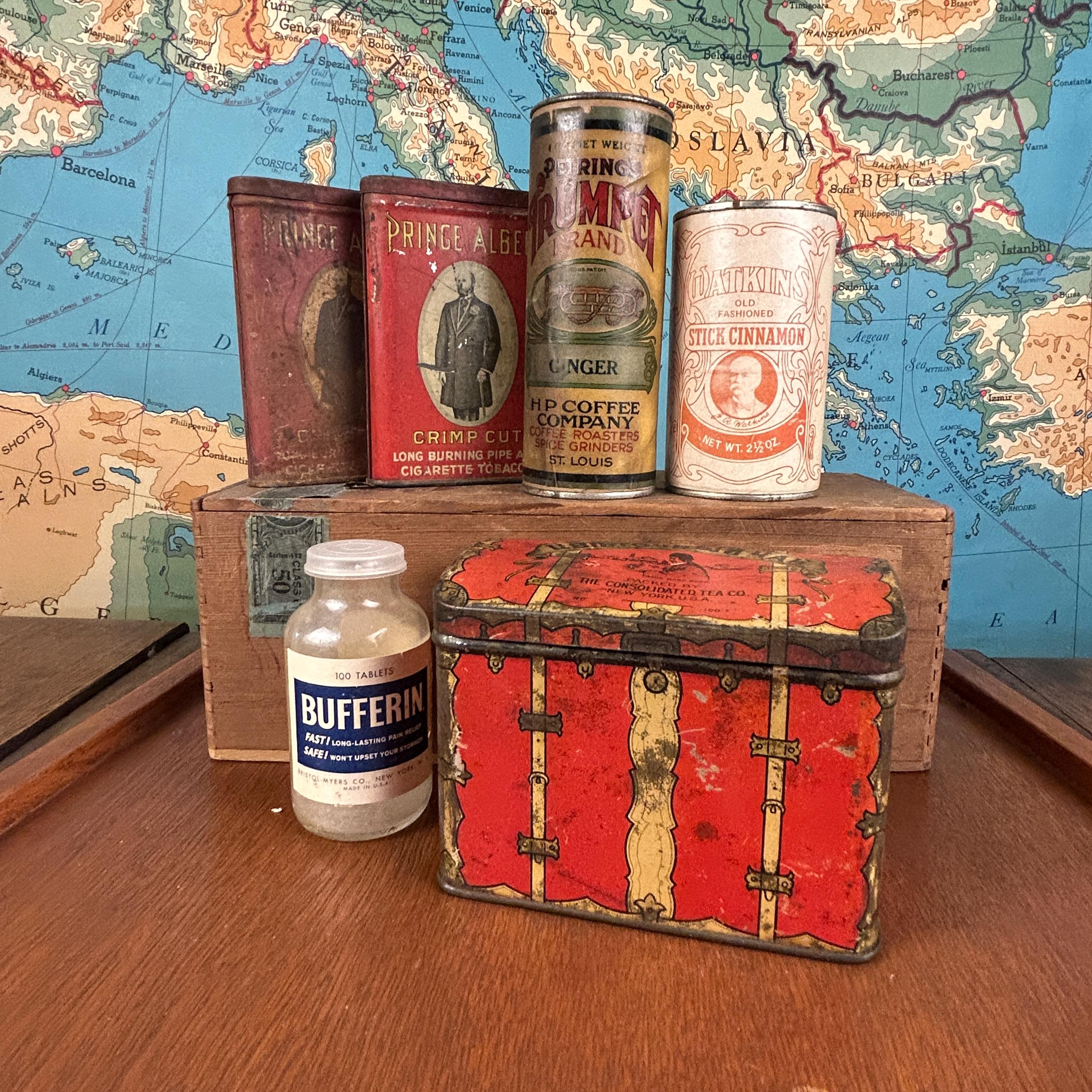 All tins are in vintage/antique condition with visible wear, surface rust, fading, and imperfections consistent with age and use. These signs of wear are part of their charm and authenticity. Please review all photos carefully, as they are part of the description.