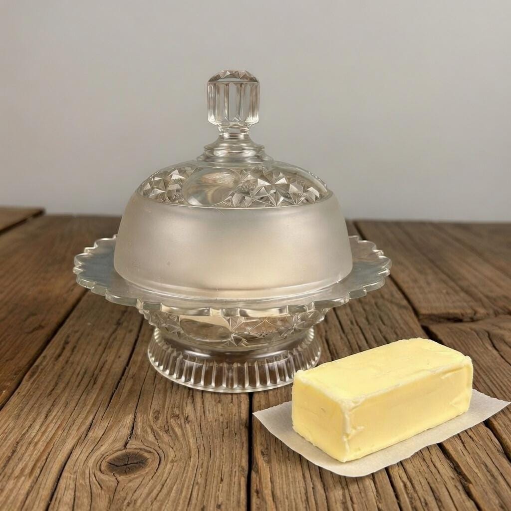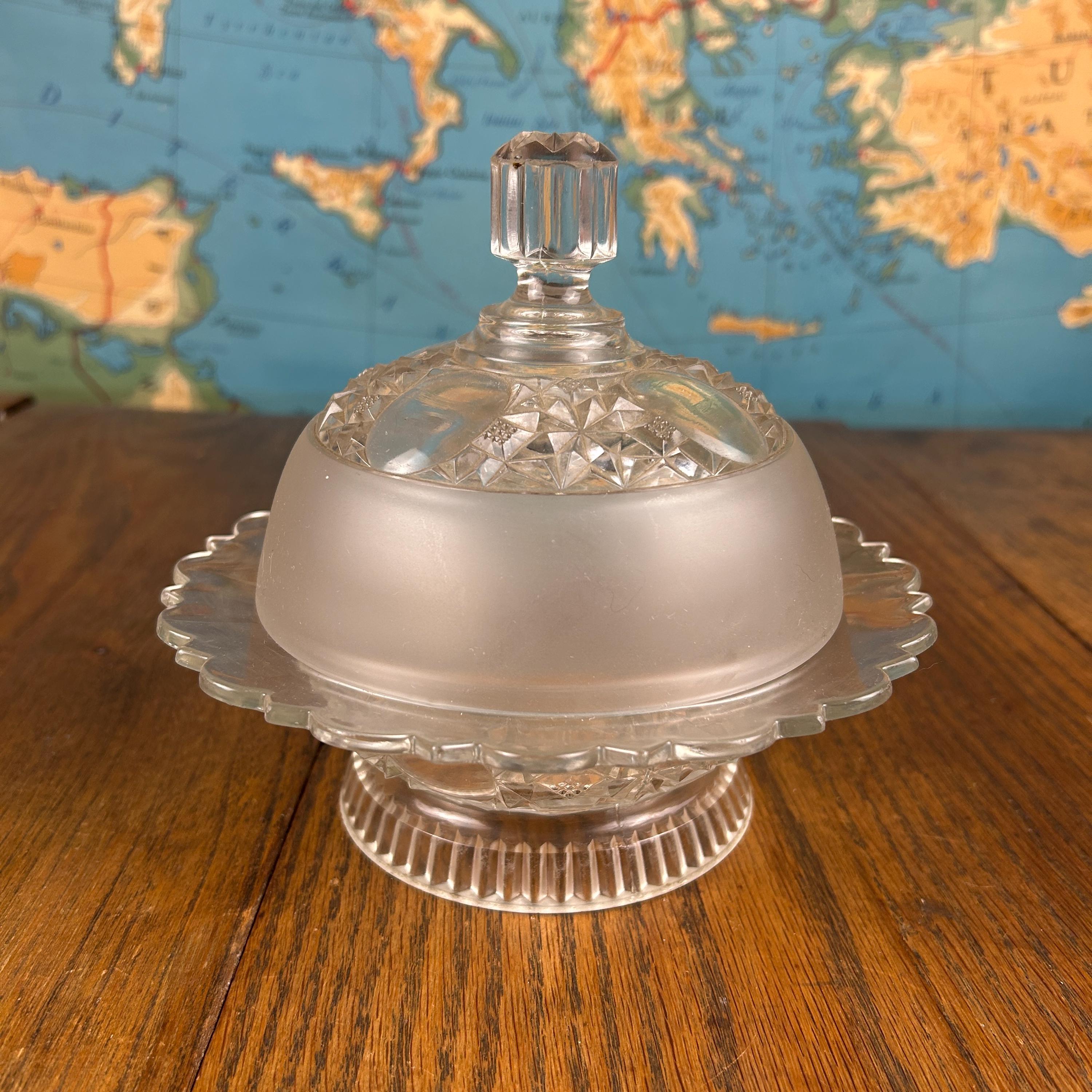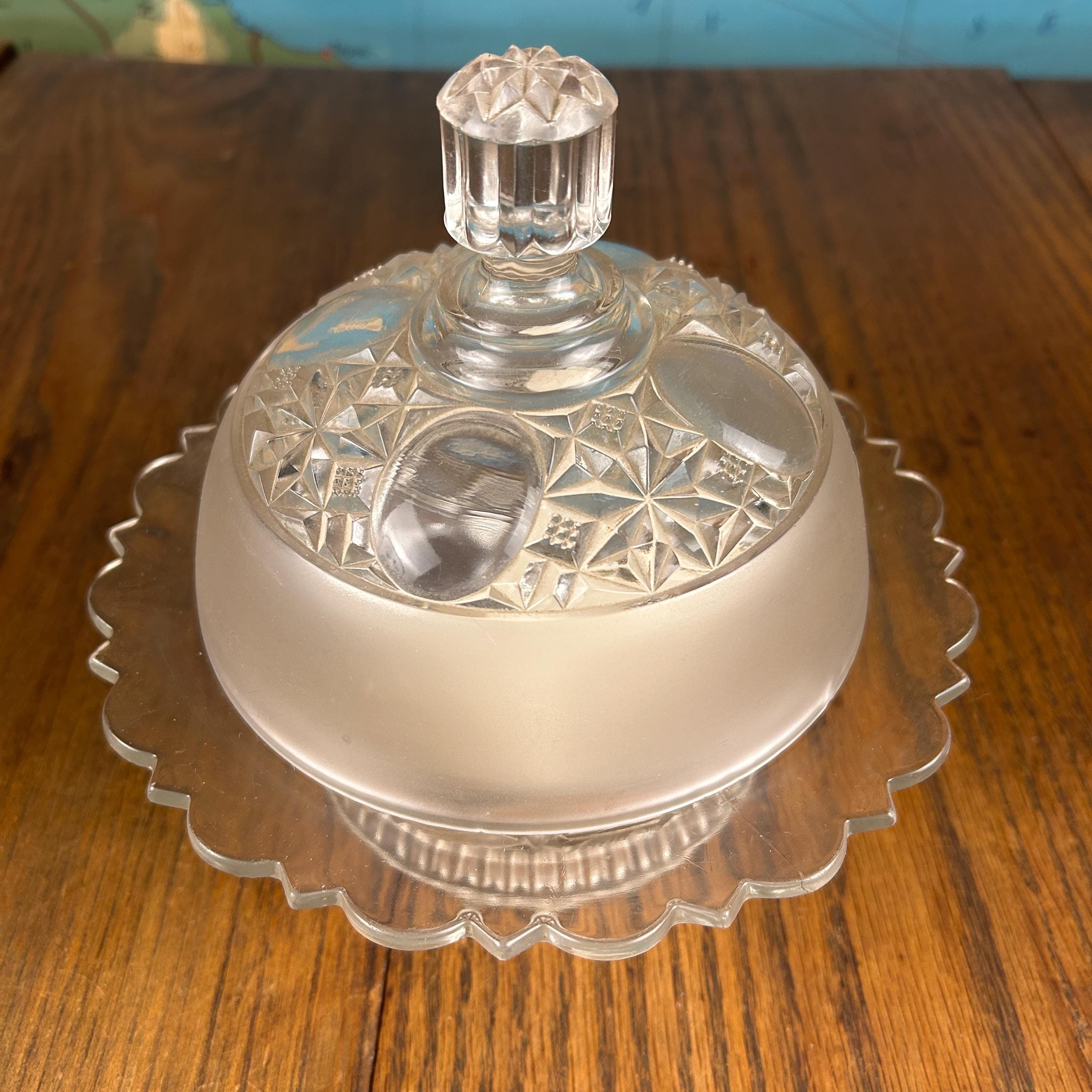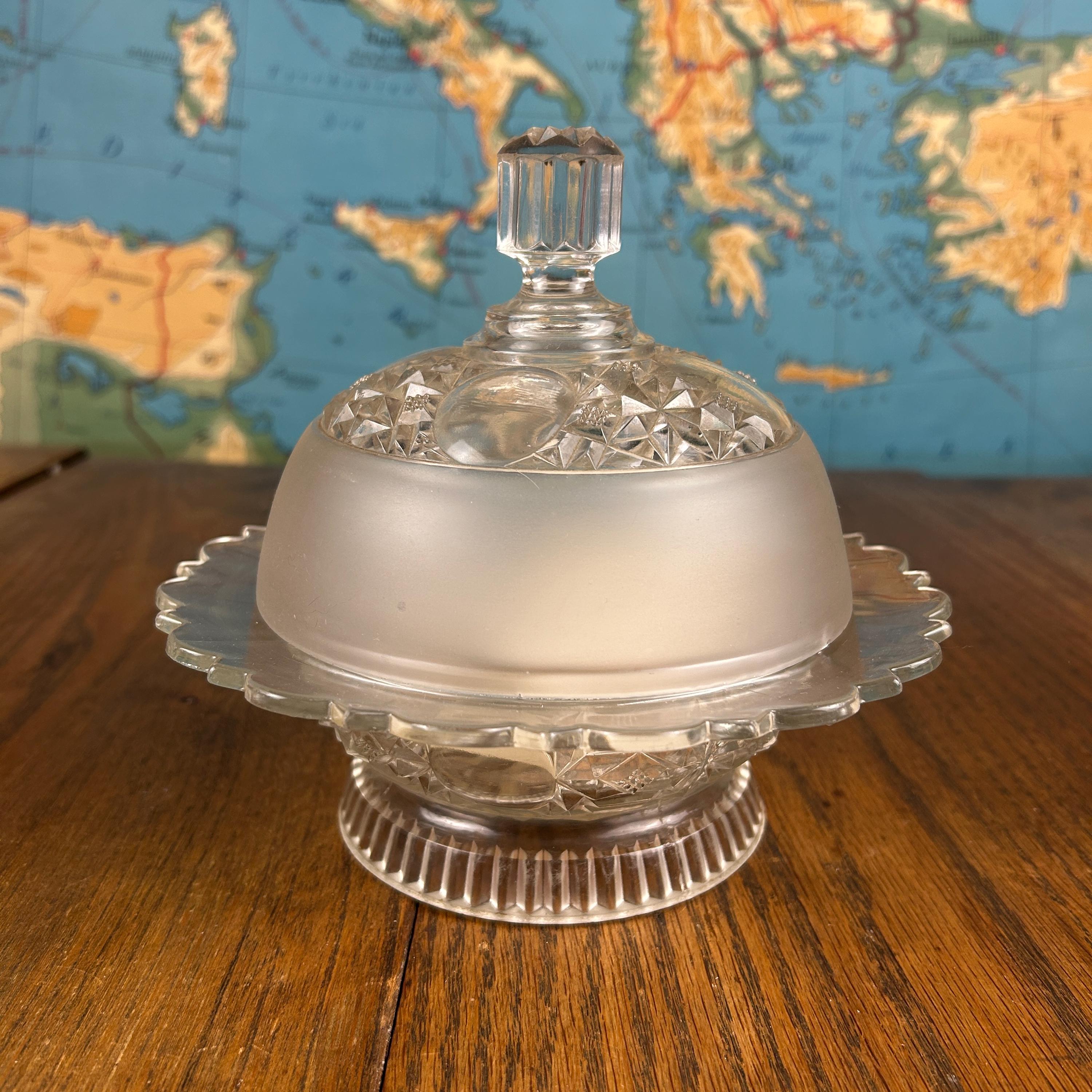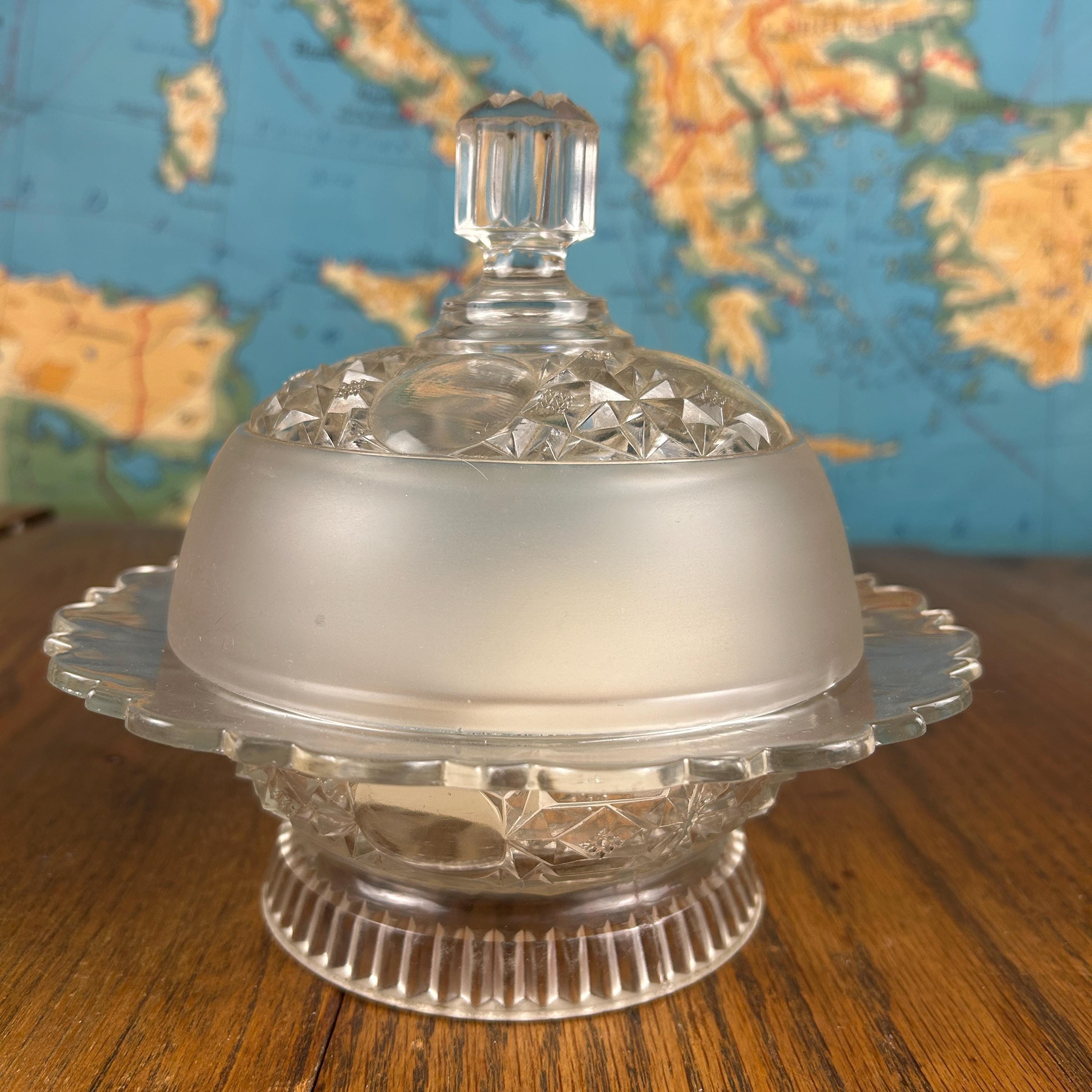 This is a vintage pressed glass covered dish, traditionally used as a butter, cheese, or candy dish. The piece features a beautiful combination of clear and frosted pressed glass, decorated with geometric and star-like patterns that catch and reflect the light.