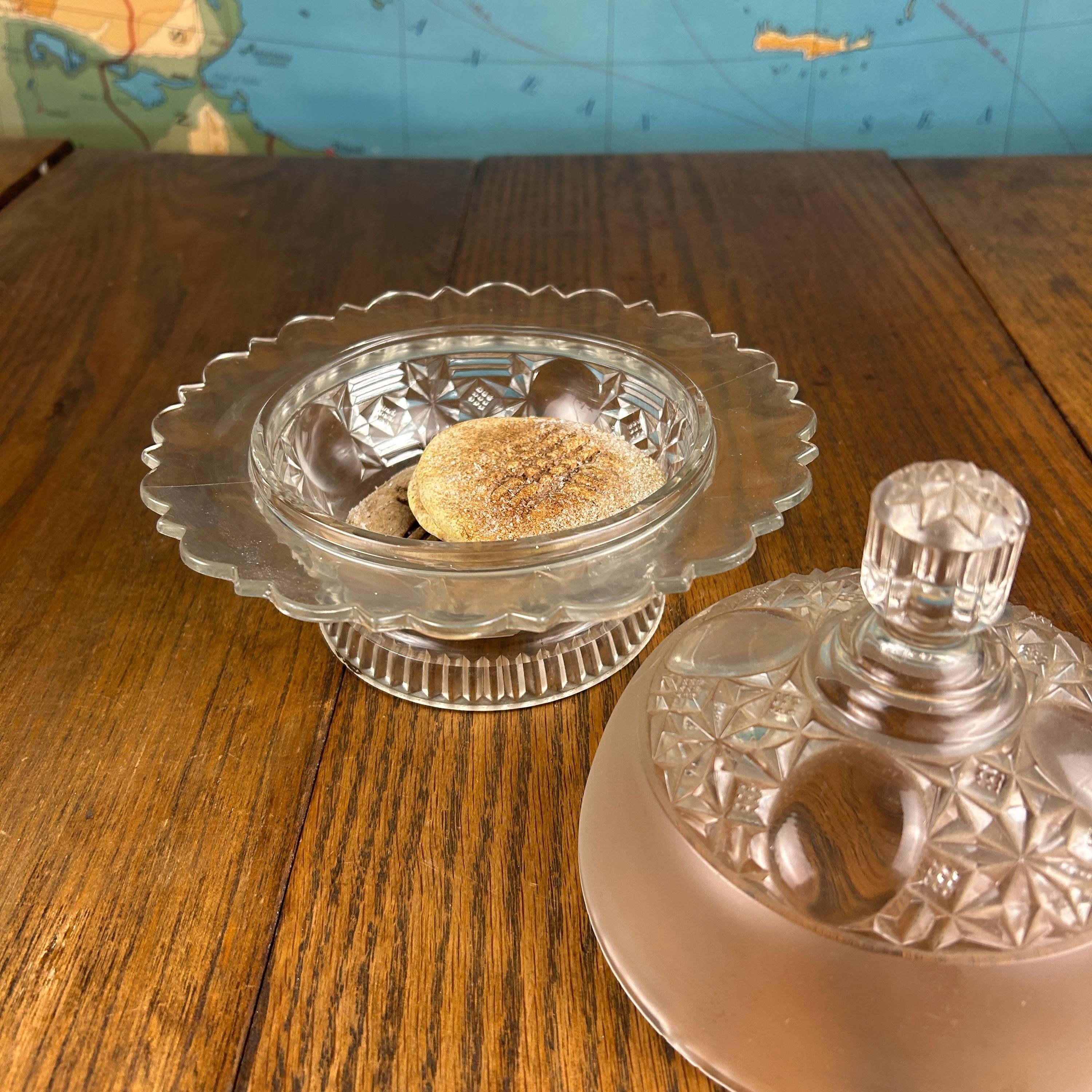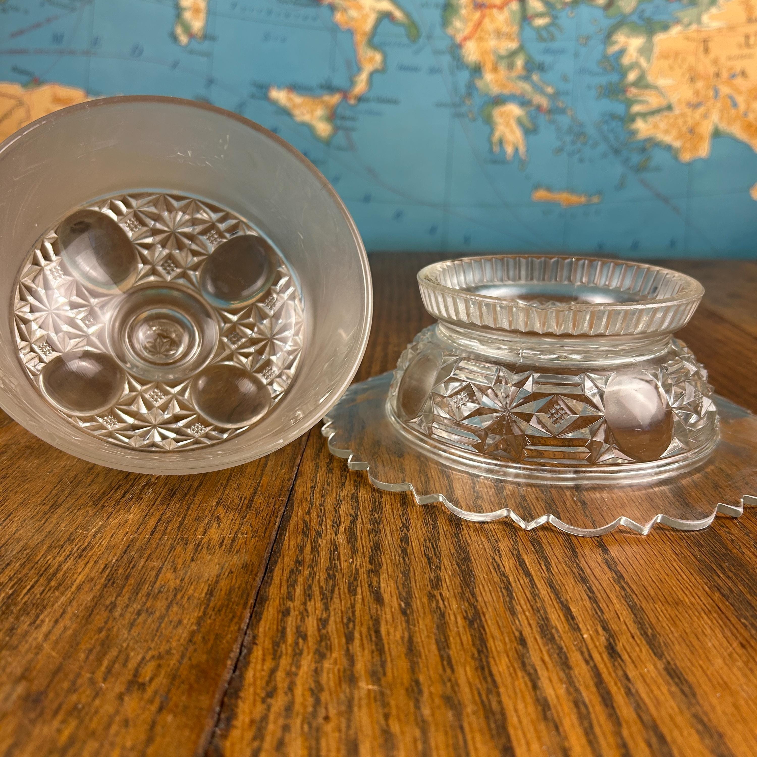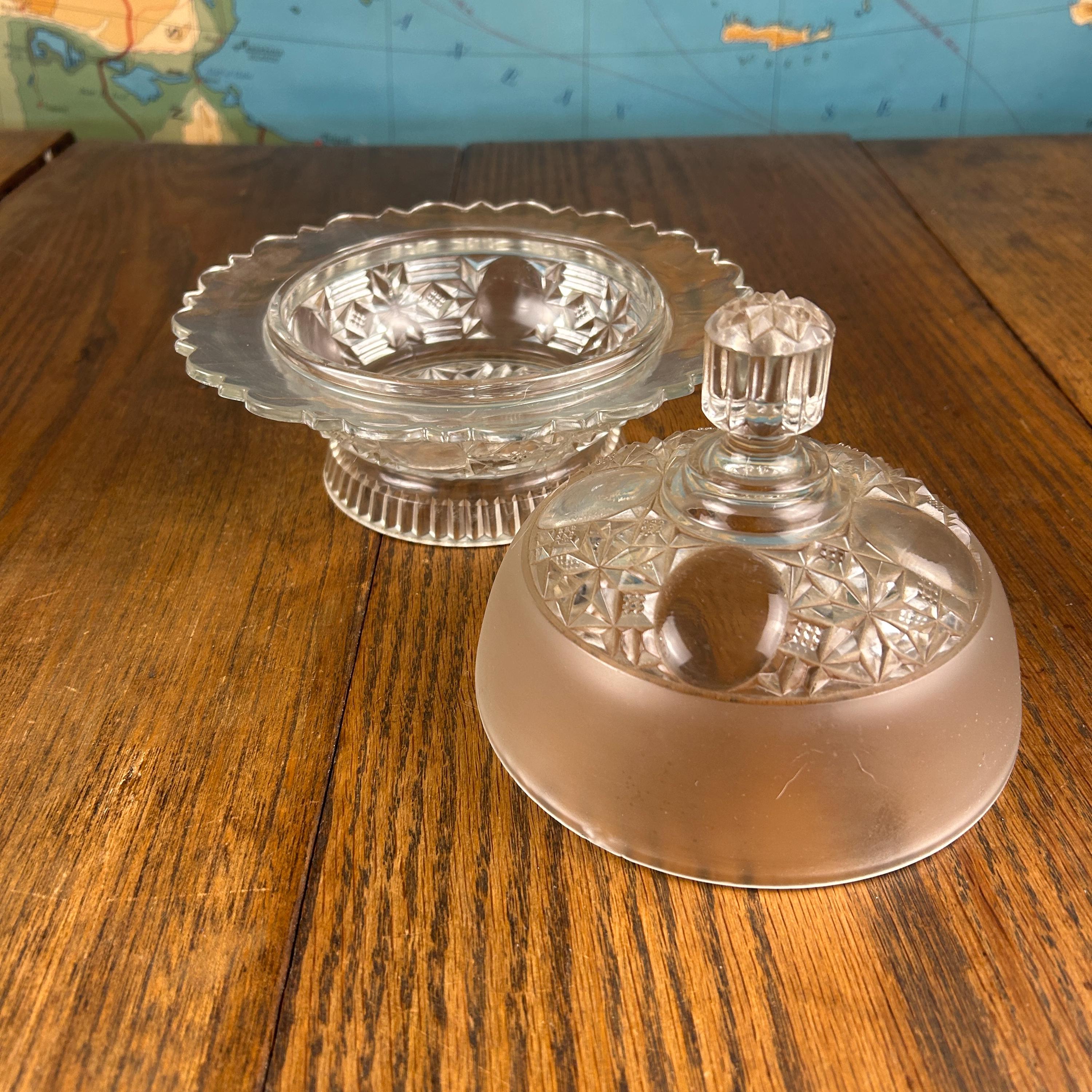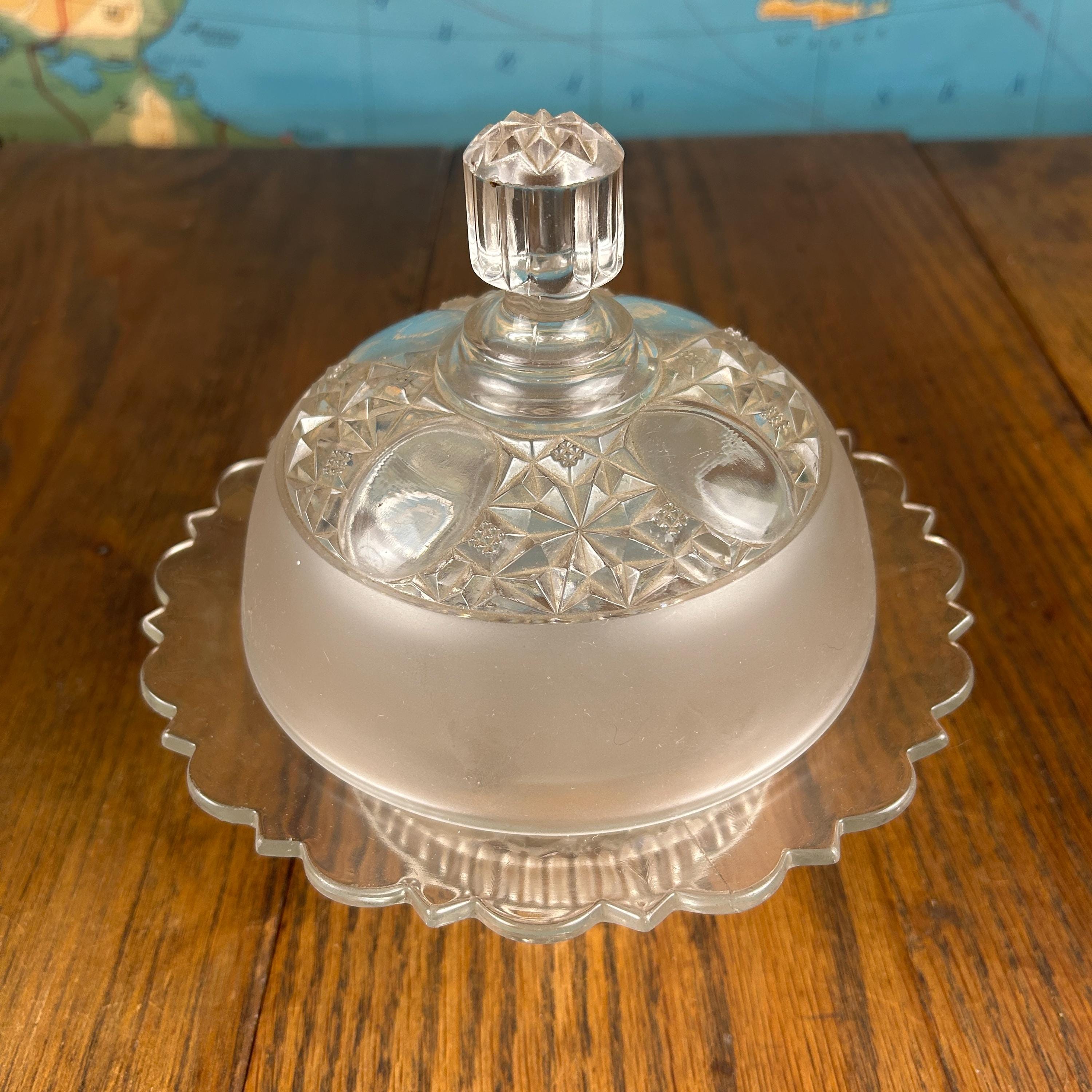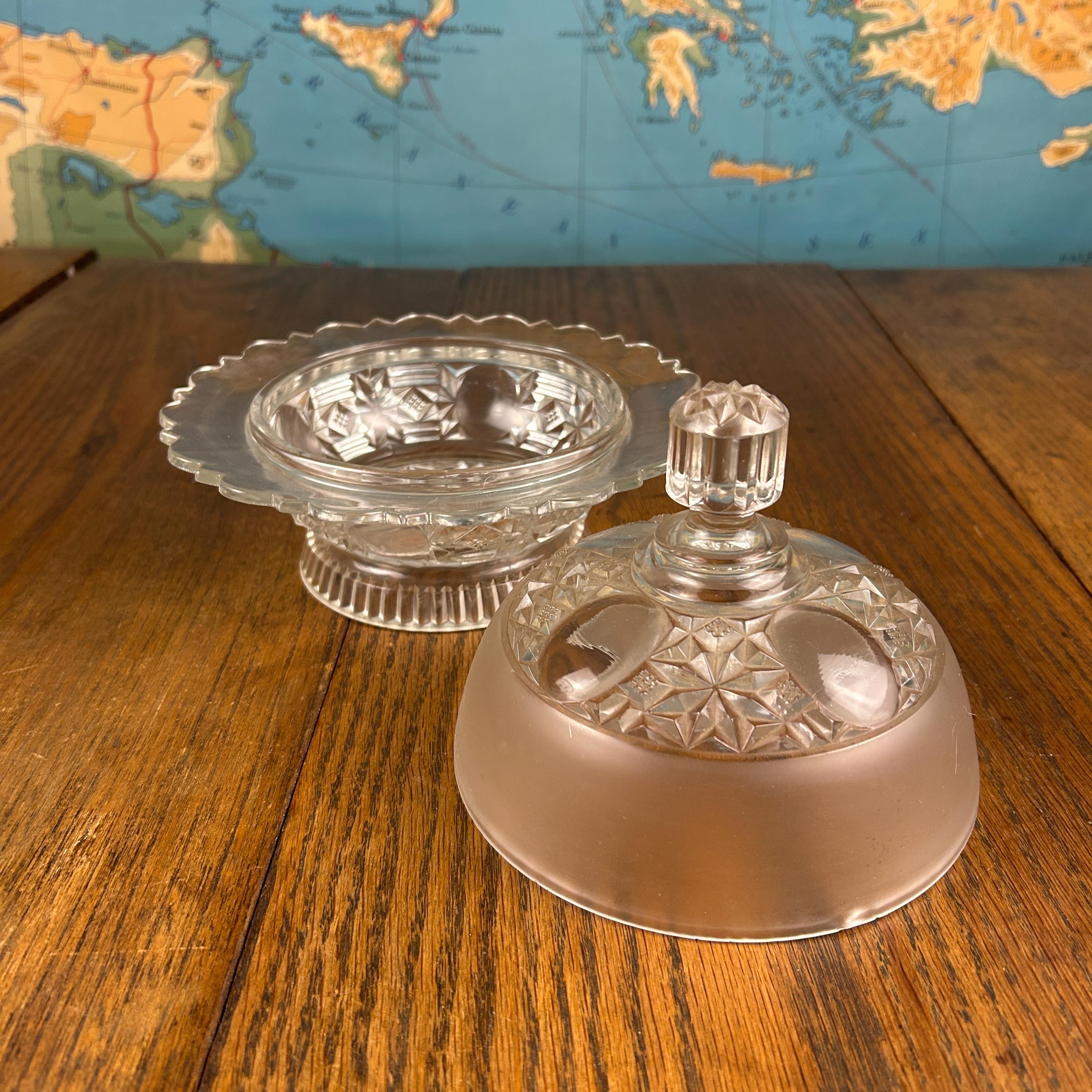 This is a vintage pressed glass covered dish, traditionally used as a butter, cheese, or candy dish. The piece features a beautiful combination of clear and frosted pressed glass, decorated with geometric and star-like patterns that catch and reflect the light.