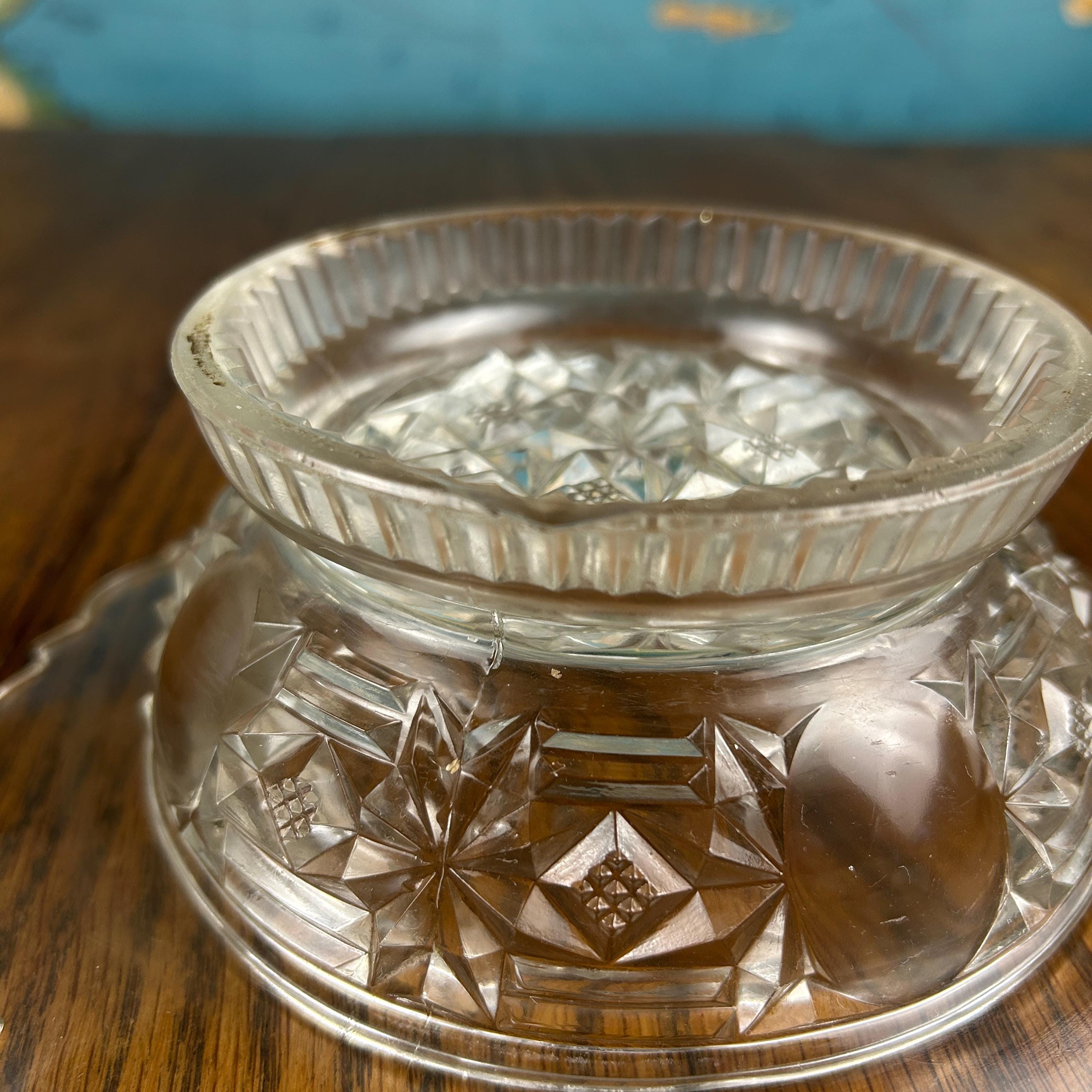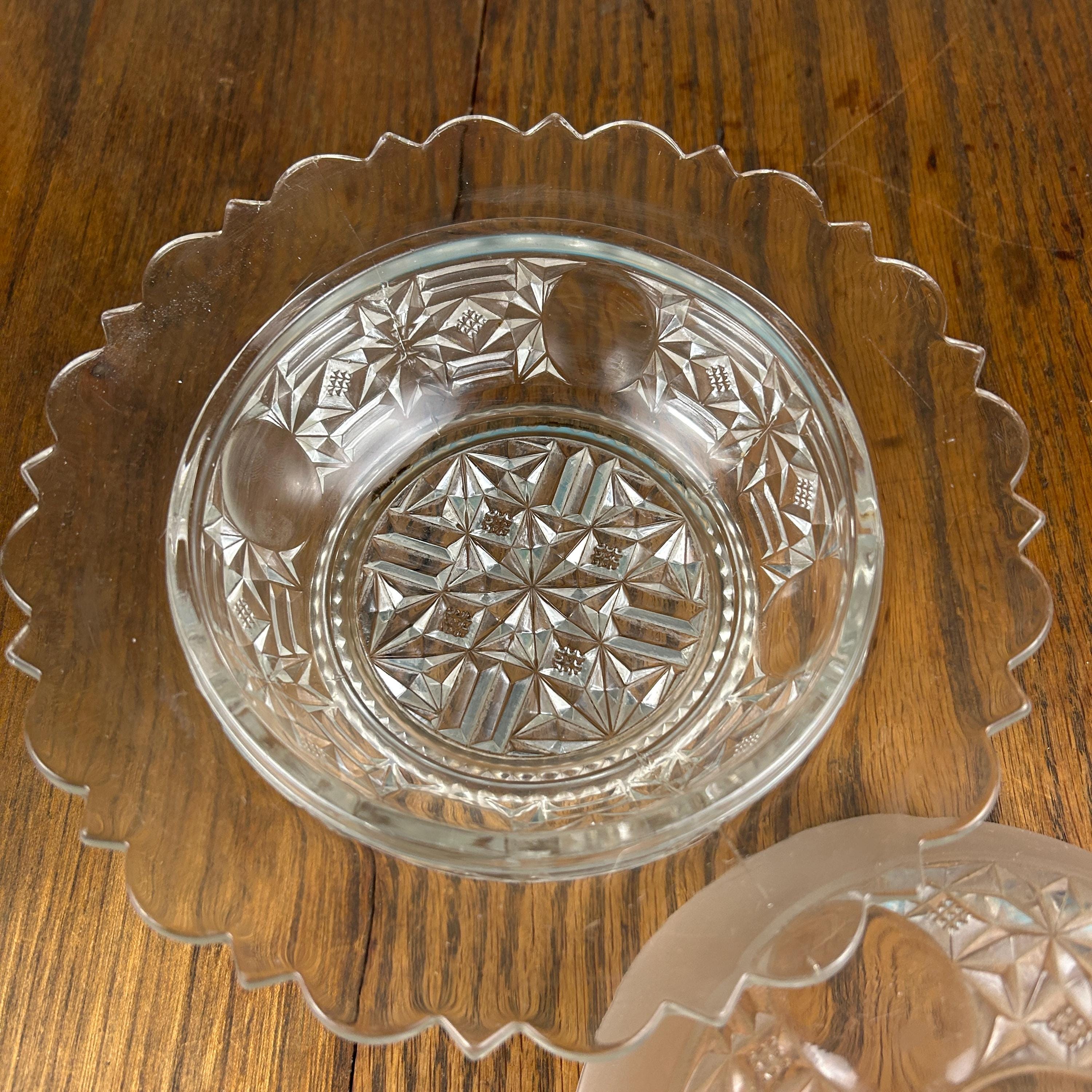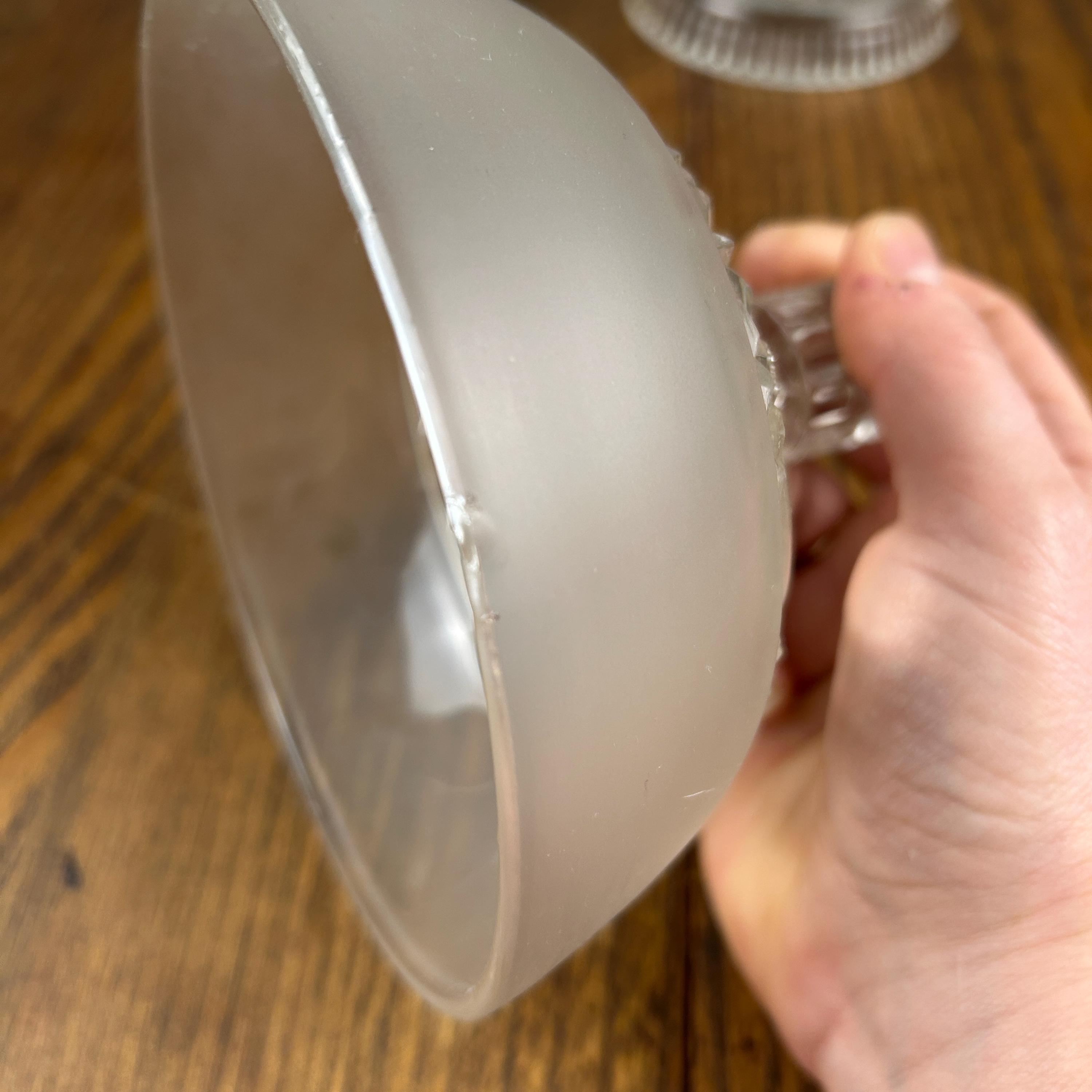 Good antique condition with light wear consistent with age. There is a small chip on the bottom edge of the bowl and either a small chip or a manufacturer's defect along the lip. Please see photos above. Neither chip/crack is noticeable with sitting. Minor manufacturing marks typical of pressed glass may be present. Please review all photos carefully, as they are part of the description.