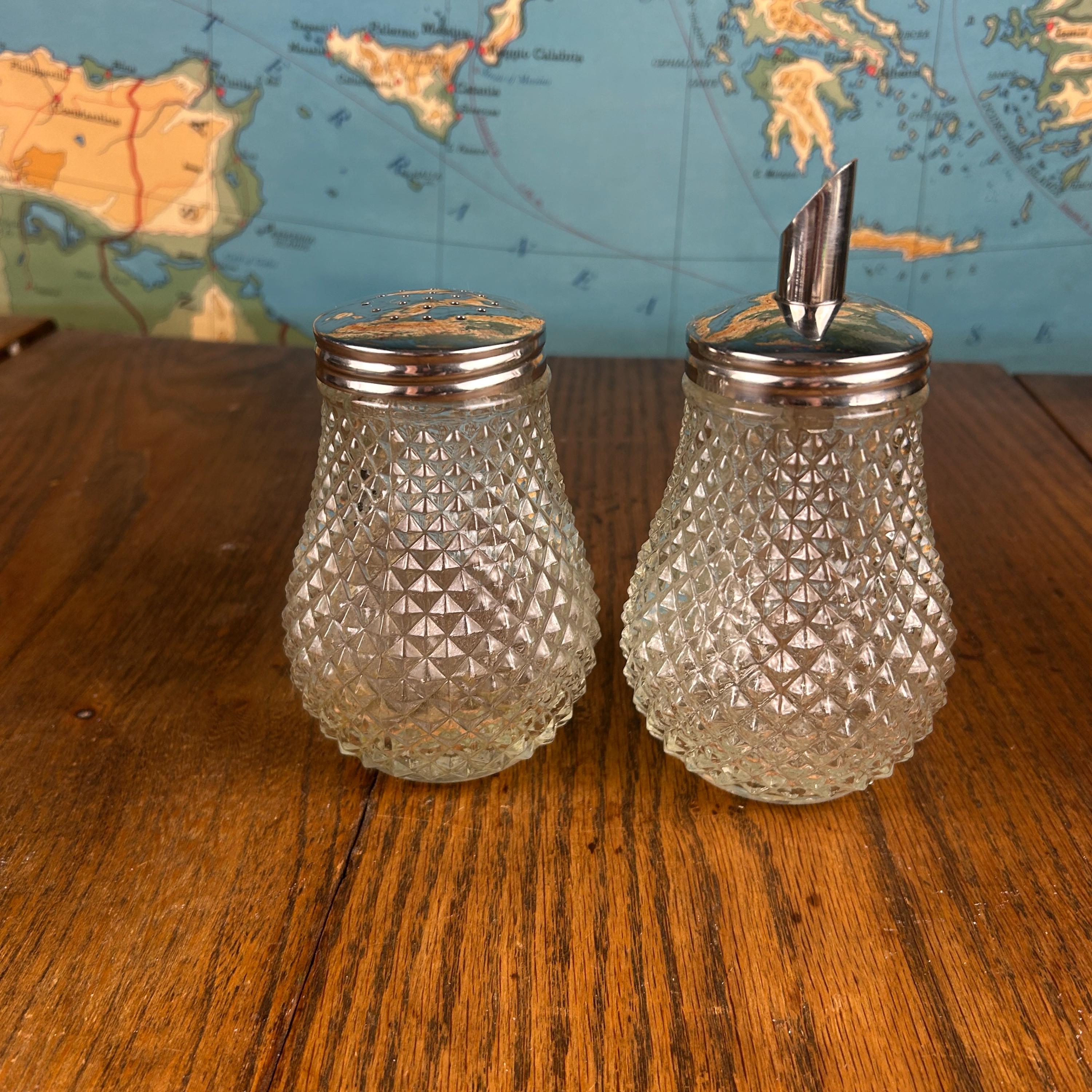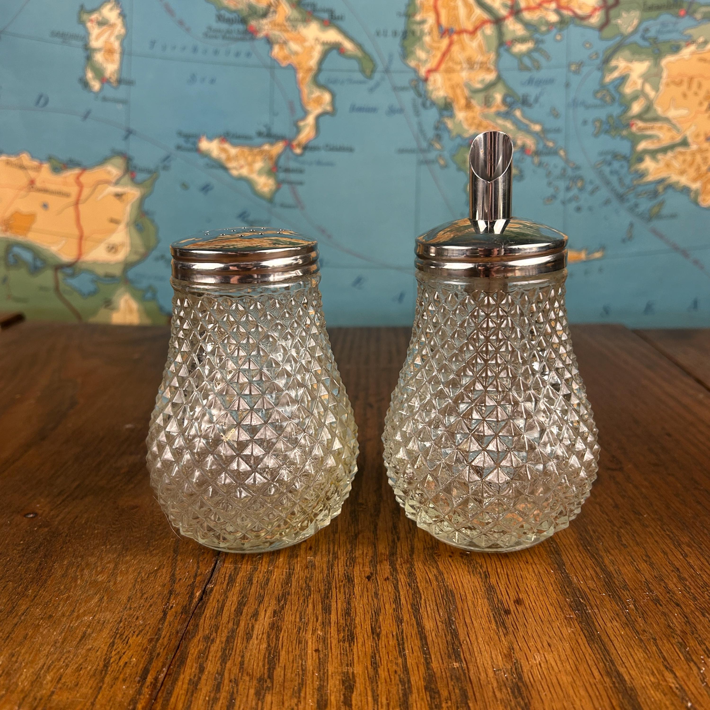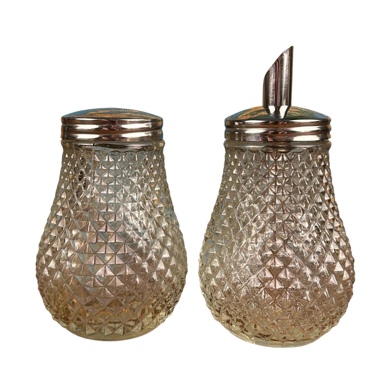 The set typically includes a sugar dispenser with pour spout and a matching shaker, each topped with chrome lids that complete the clean, functional design. Diamond Point glass was especially popular during the 1950s and 1960s, making these pieces a perfect fit for vintage kitchens, breakfast tables, or collectors of retro glassware.