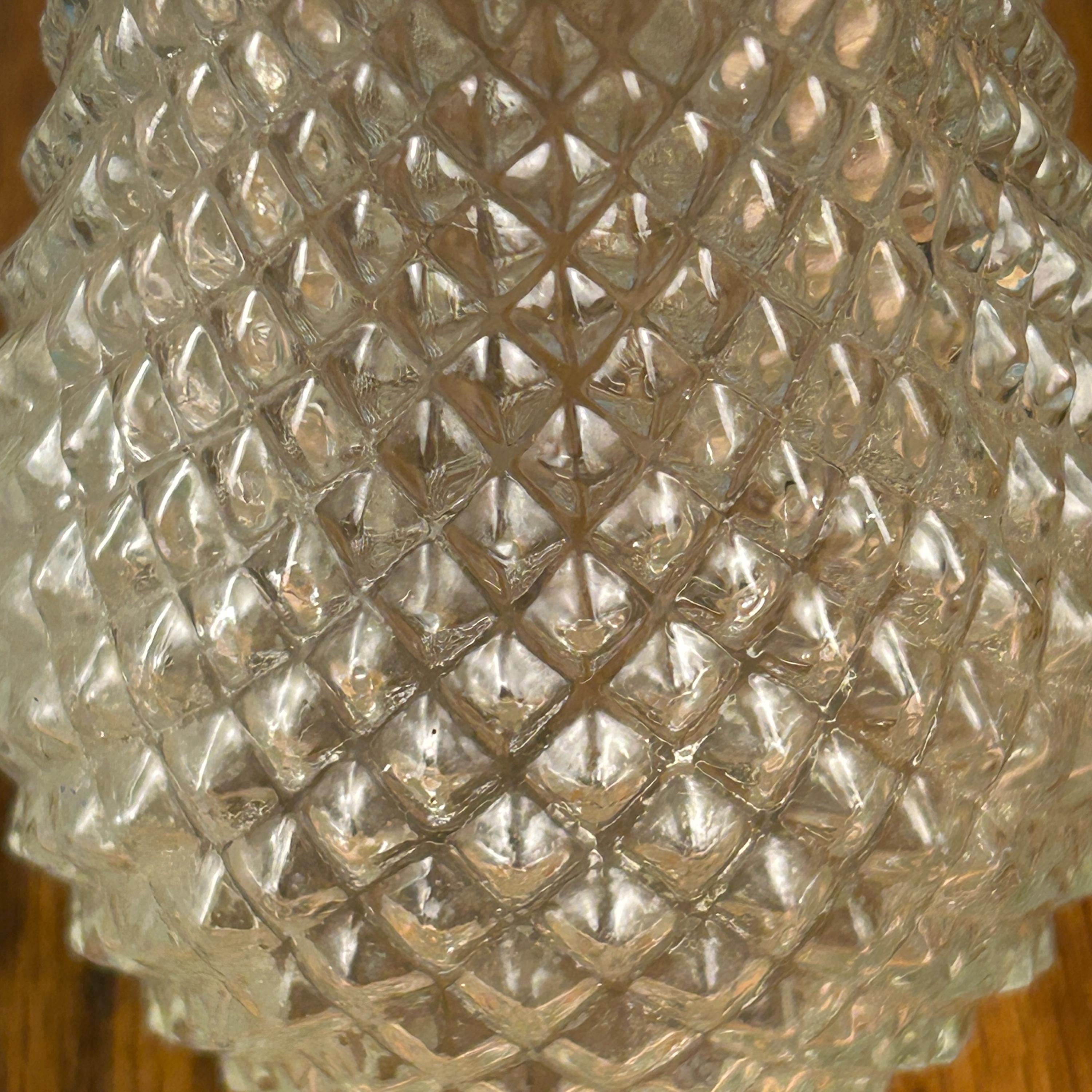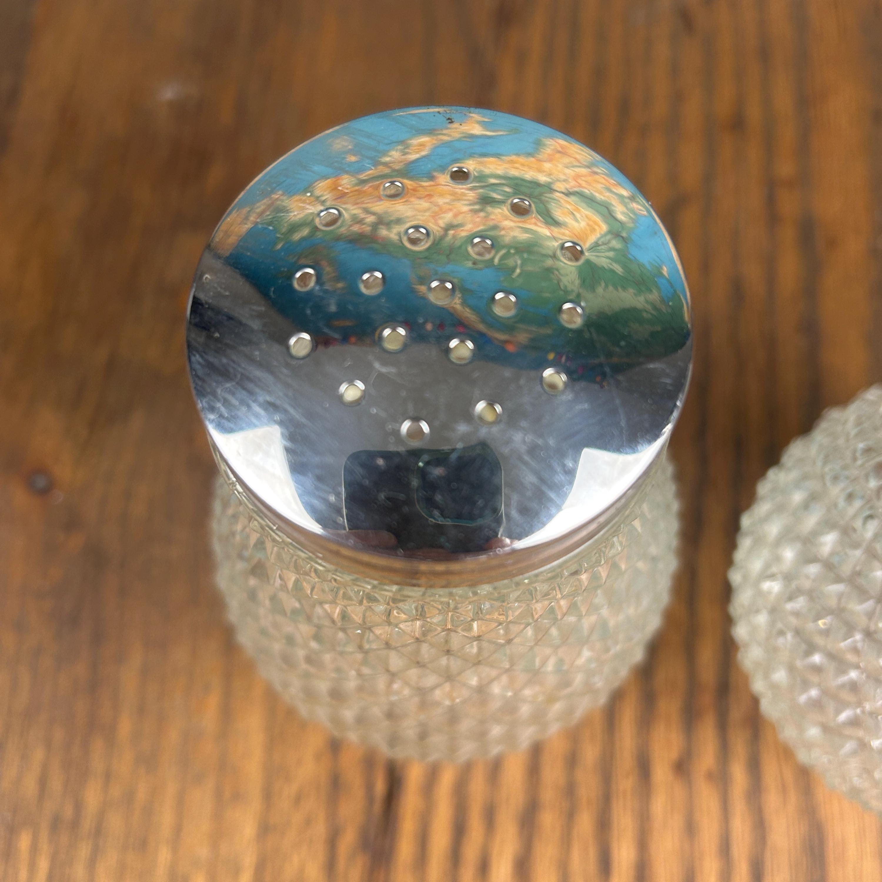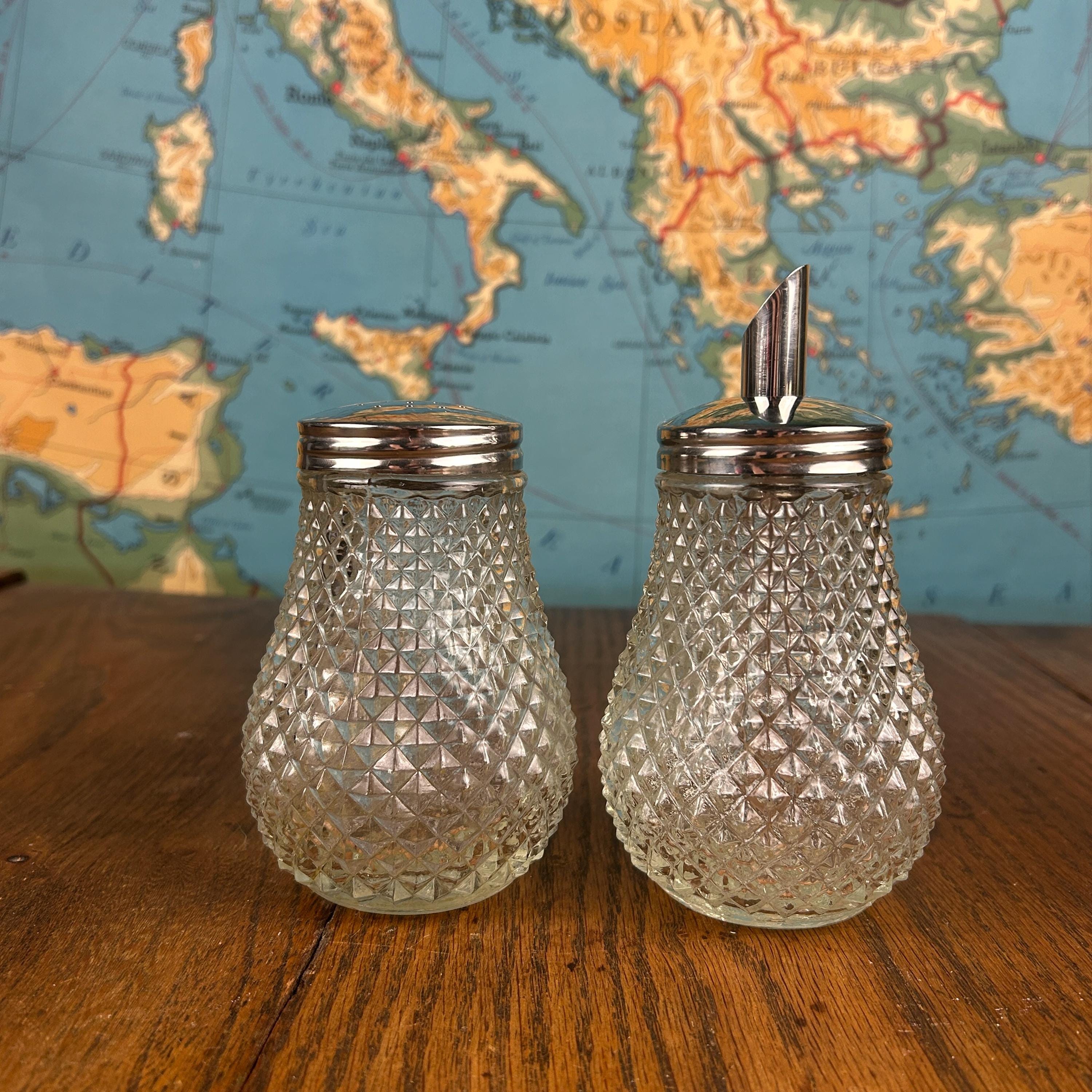 The set typically includes a sugar dispenser with pour spout and a matching shaker, each topped with chrome lids that complete the clean, functional design. Diamond Point glass was especially popular during the 1950s and 1960s, making these pieces a perfect fit for vintage kitchens, breakfast tables, or collectors of retro glassware.