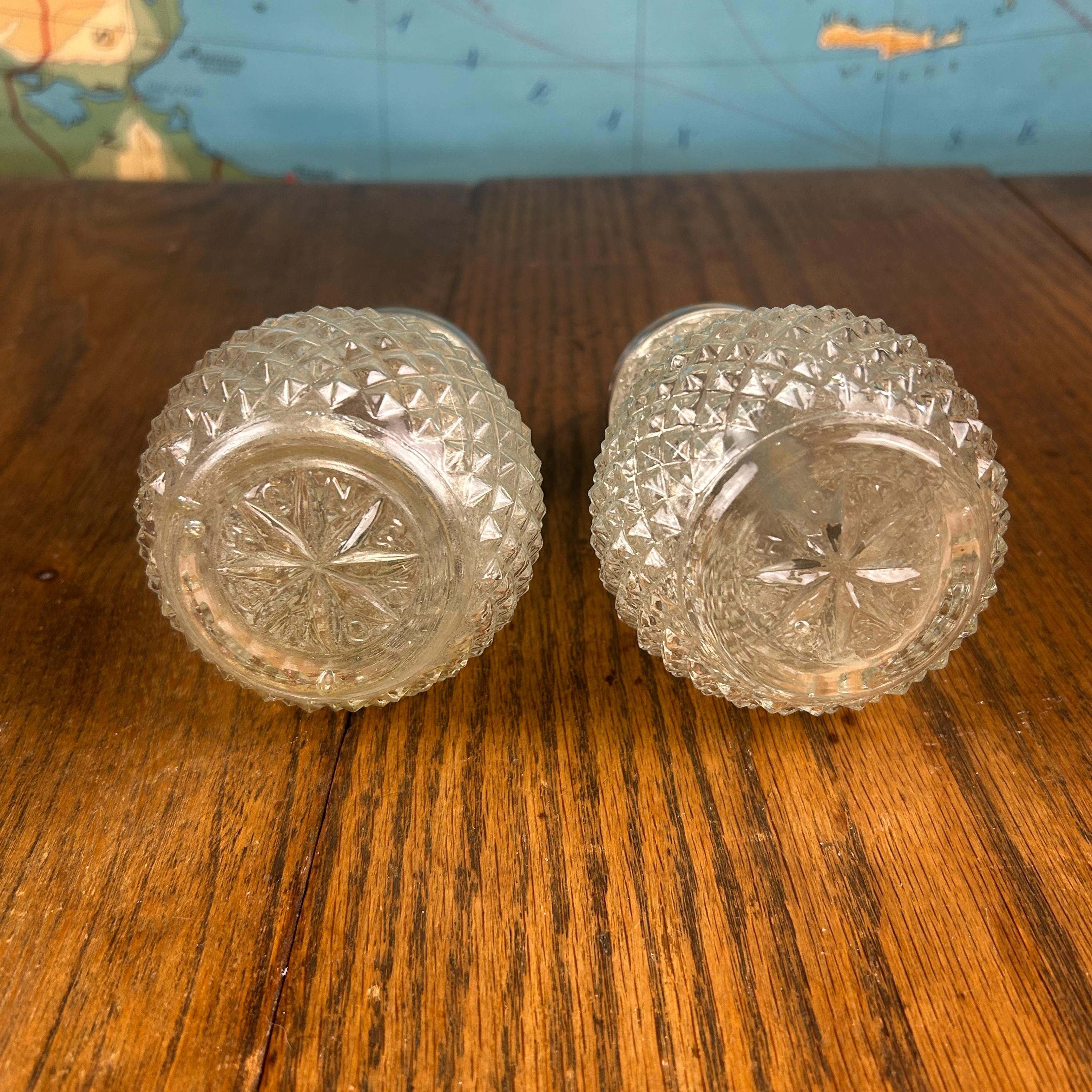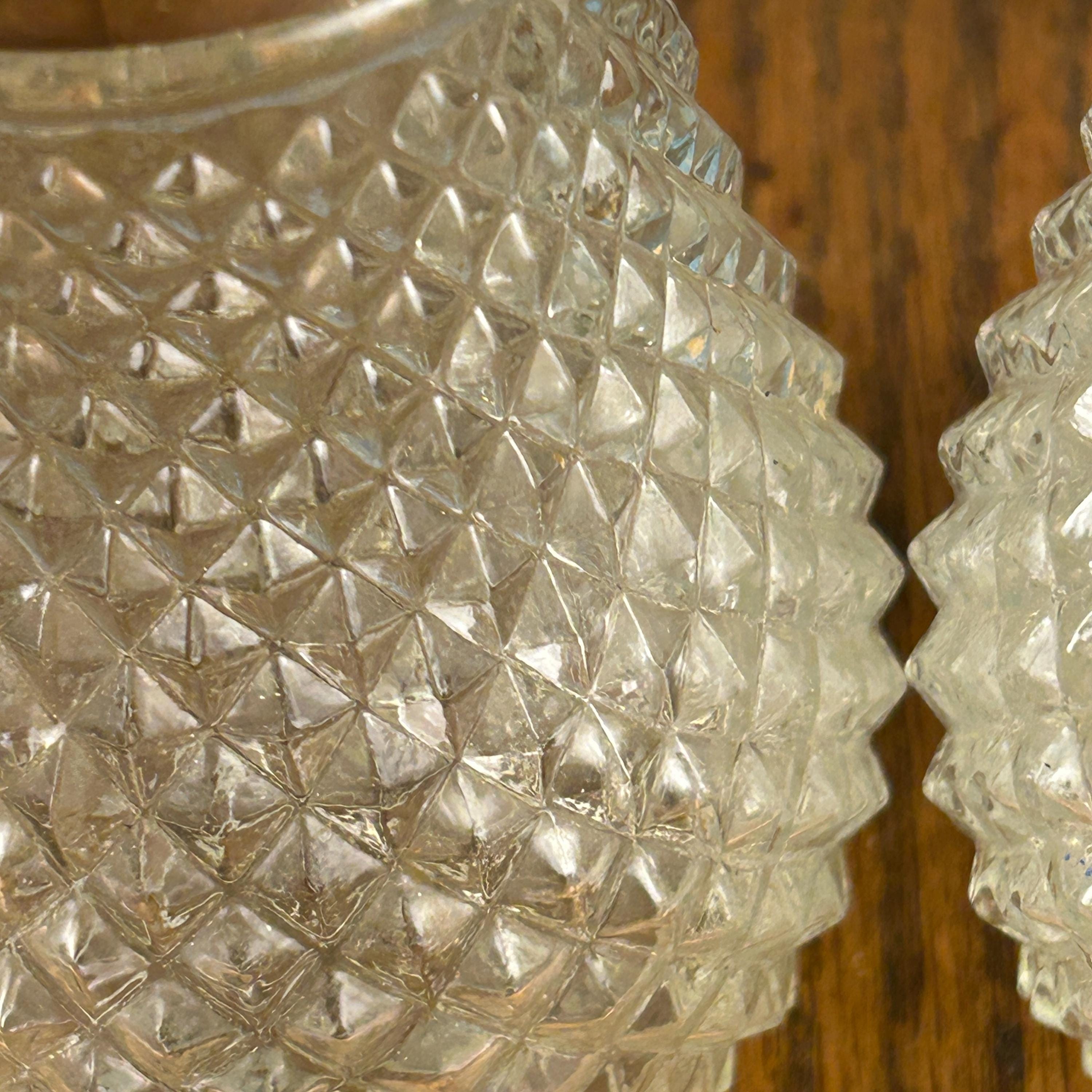 These are vintage Indiana Glass Diamond Point condiment set pieces, often referred to as a muffineer or sugar shaker set. Featuring the classic pressed Diamond Point crystal pattern, these pieces sparkle beautifully and reflect the timeless appeal of mid-century American glassware.
