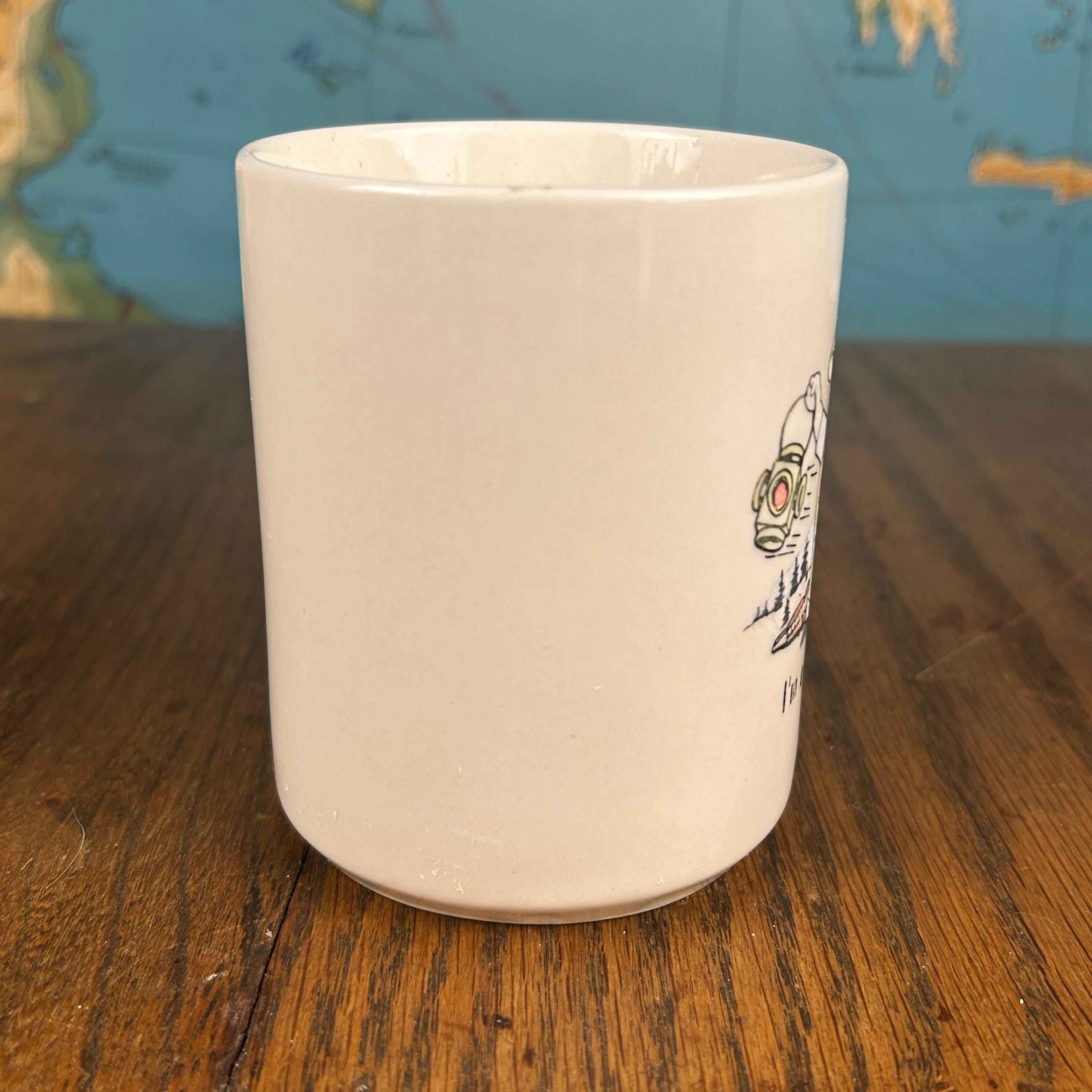Perfect for morning cocoa, coffee, or simply for display, this mug makes a wonderful addition to a child’s themed collection, a train enthusiast’s shelf, or a cozy vintage kitchen. Its classic illustration and gentle humor capture the charm of mid-century–style novelty mugs.
