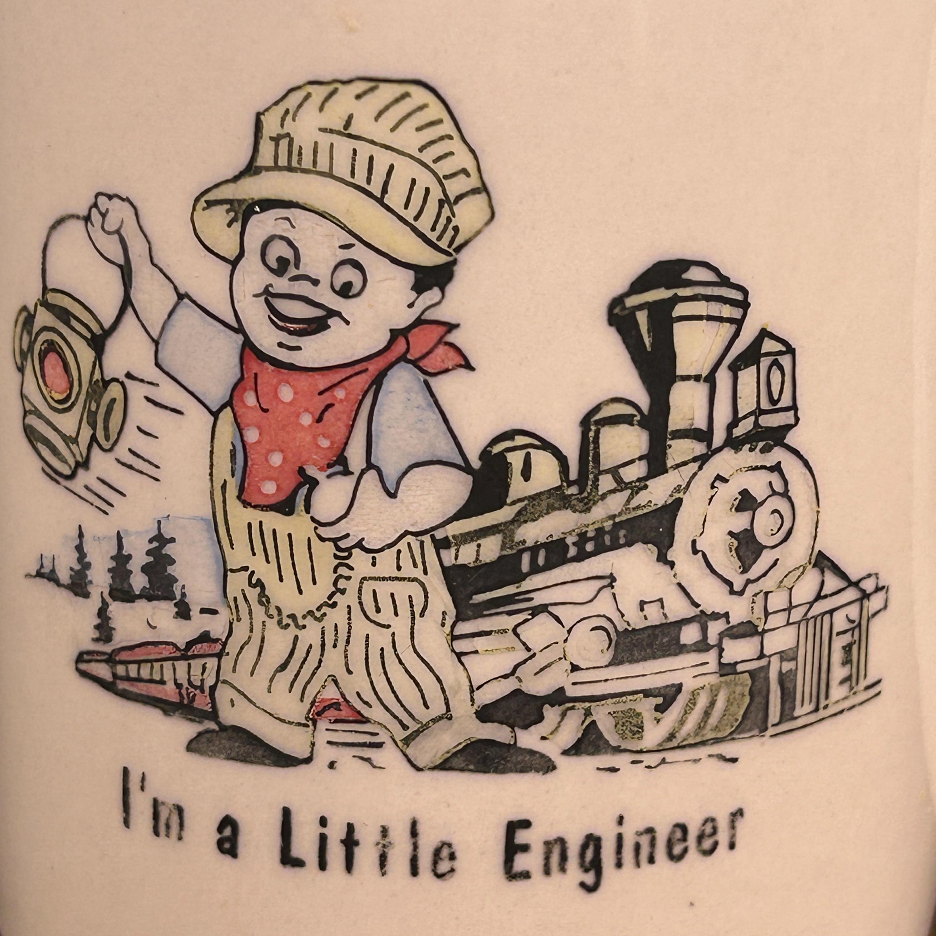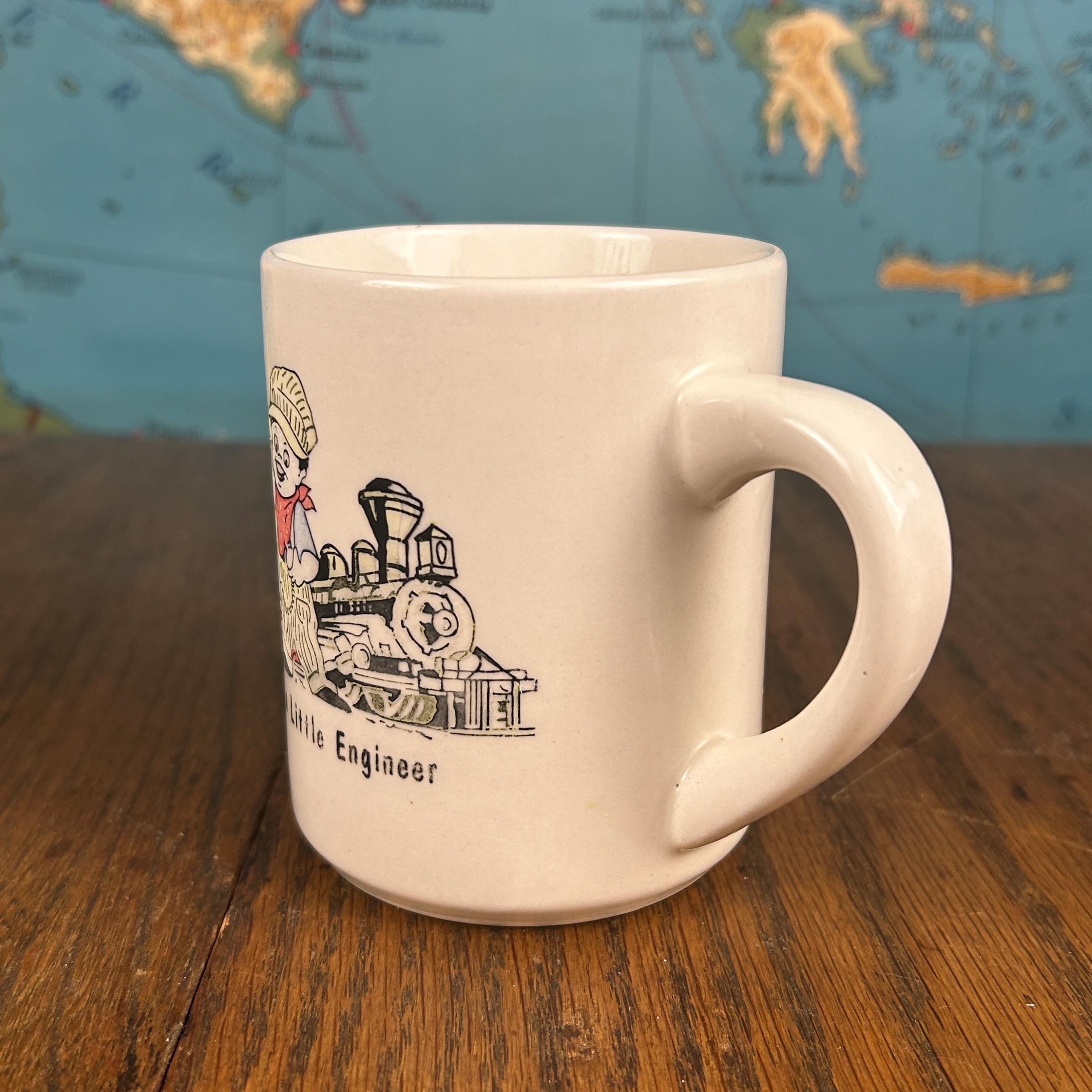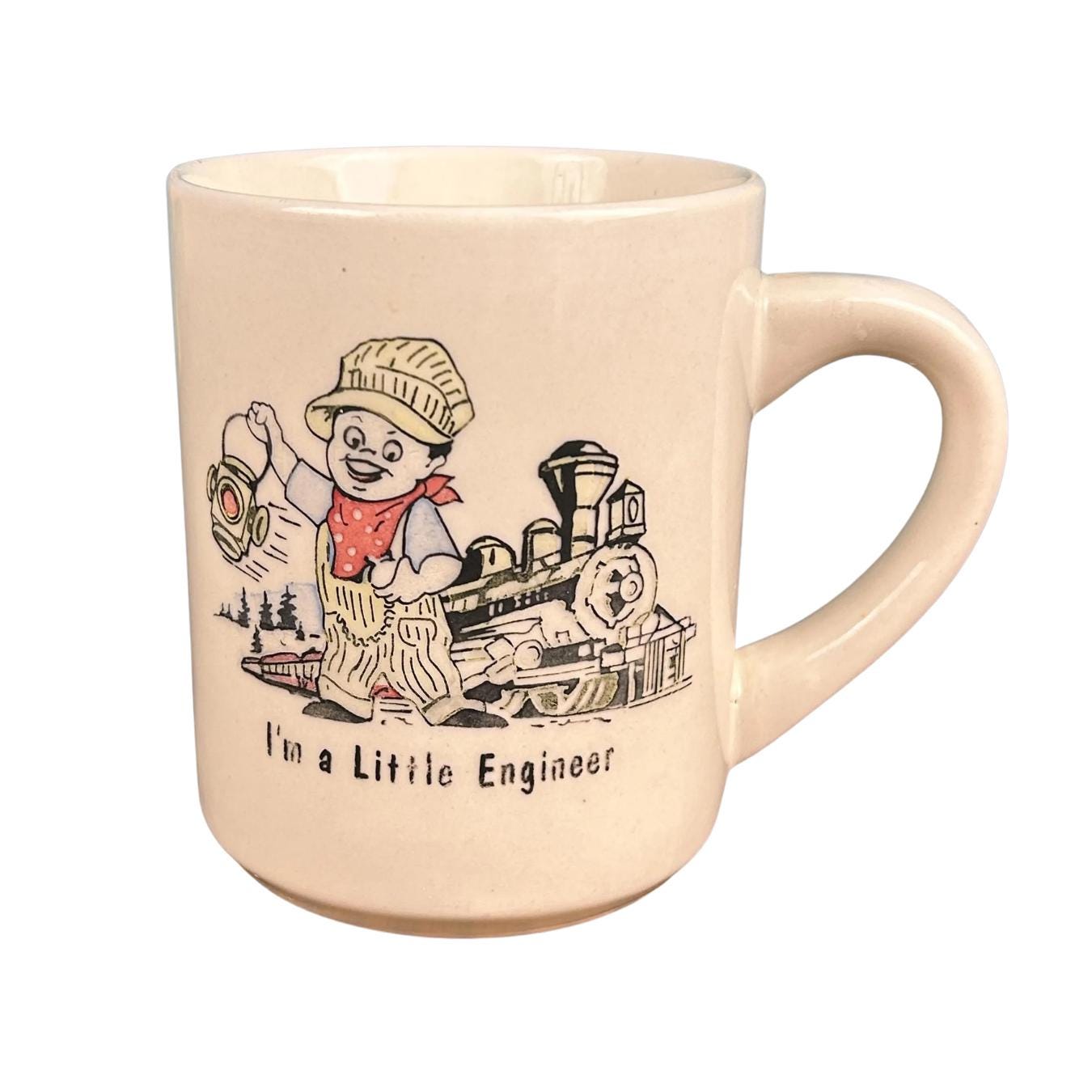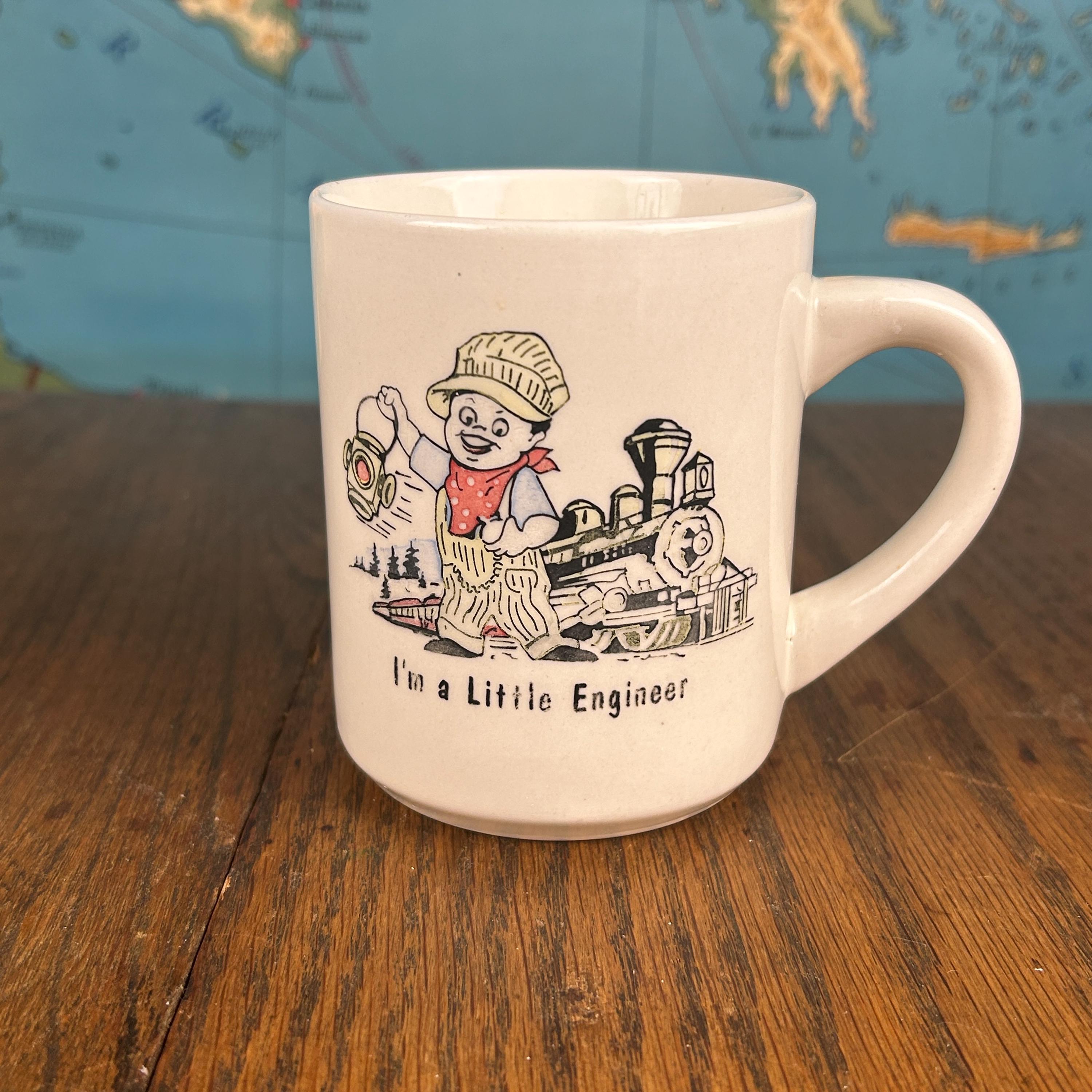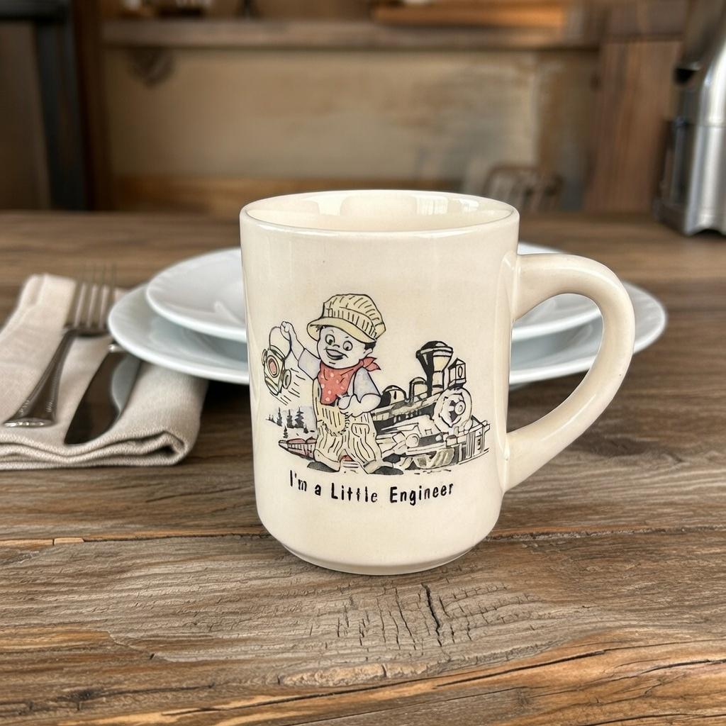 This is a vintage cream-colored ceramic coffee mug featuring an adorable illustration of a boy engineer with a train, along with the charming phrase “I’m a Little Engineer.” With its playful design and warm vintage feel, this mug is a delightful collectible for train lovers and nostalgic décor fans alike.