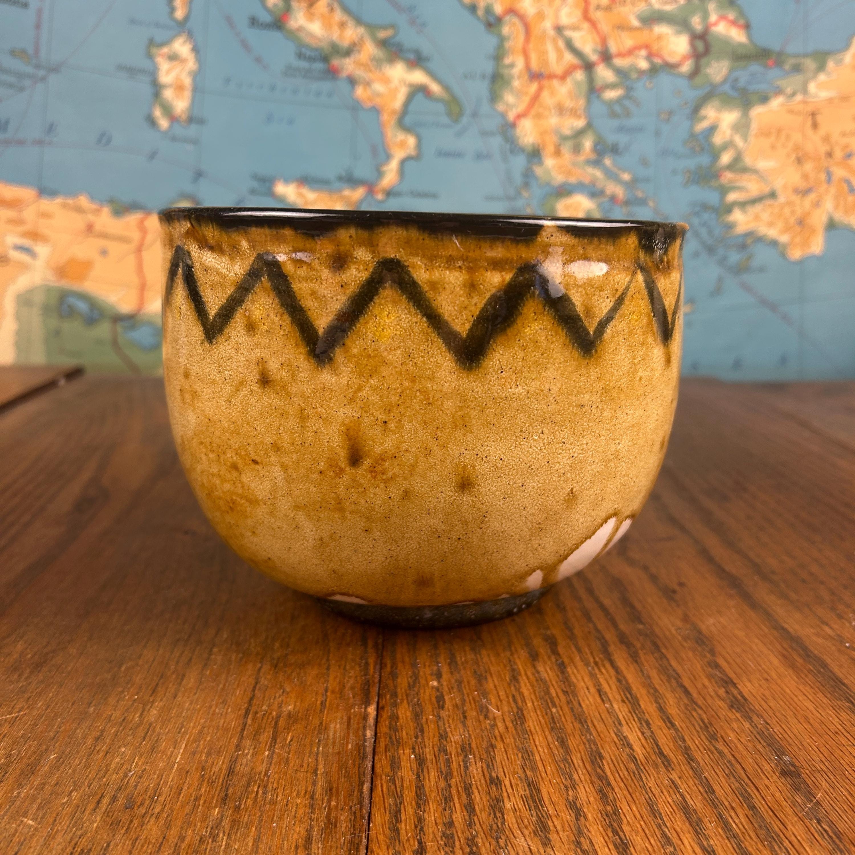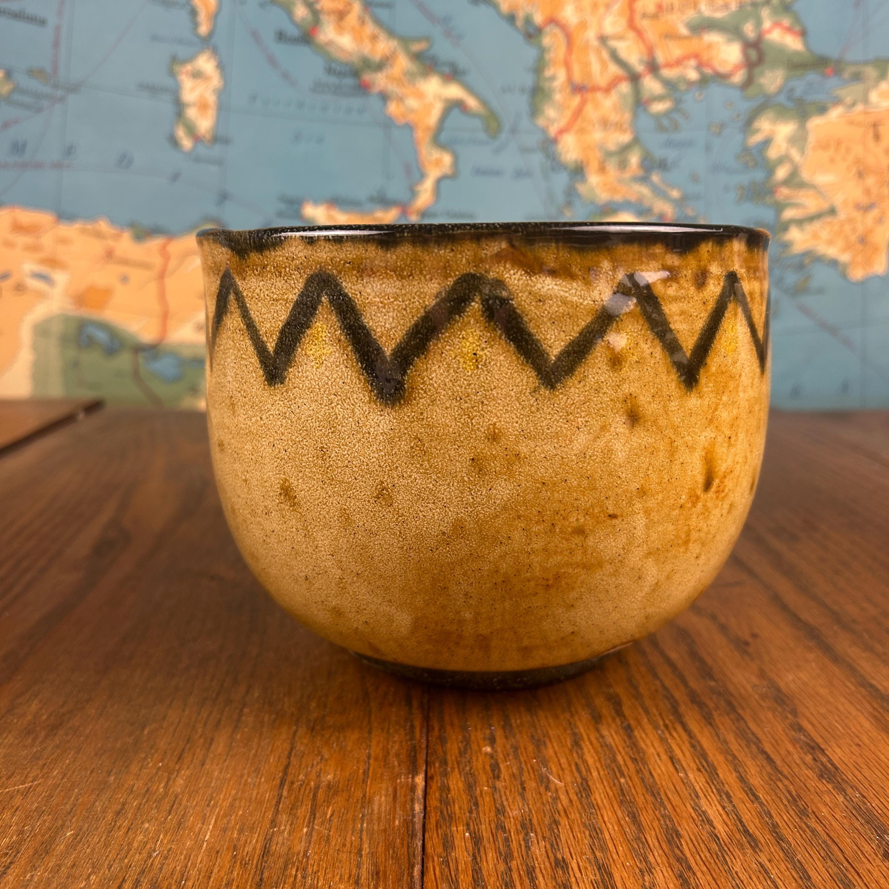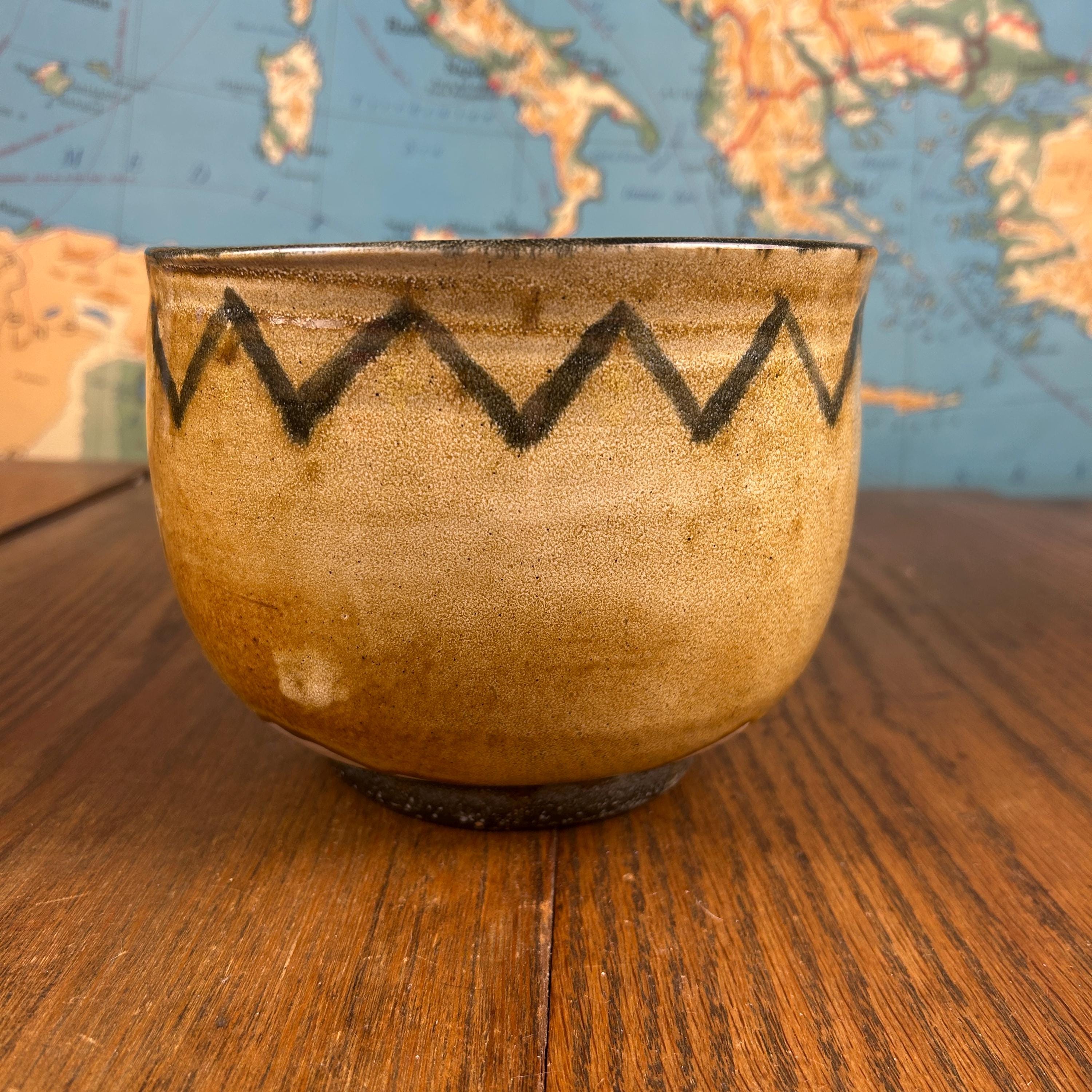 The bowl features an earthy mottled brown and beige glaze, with a distinctive zig-zag / chevron pattern circling the upper edge. The interior shows subtle variations and texture from the forming process, adding depth and character that only handmade pottery can offer.