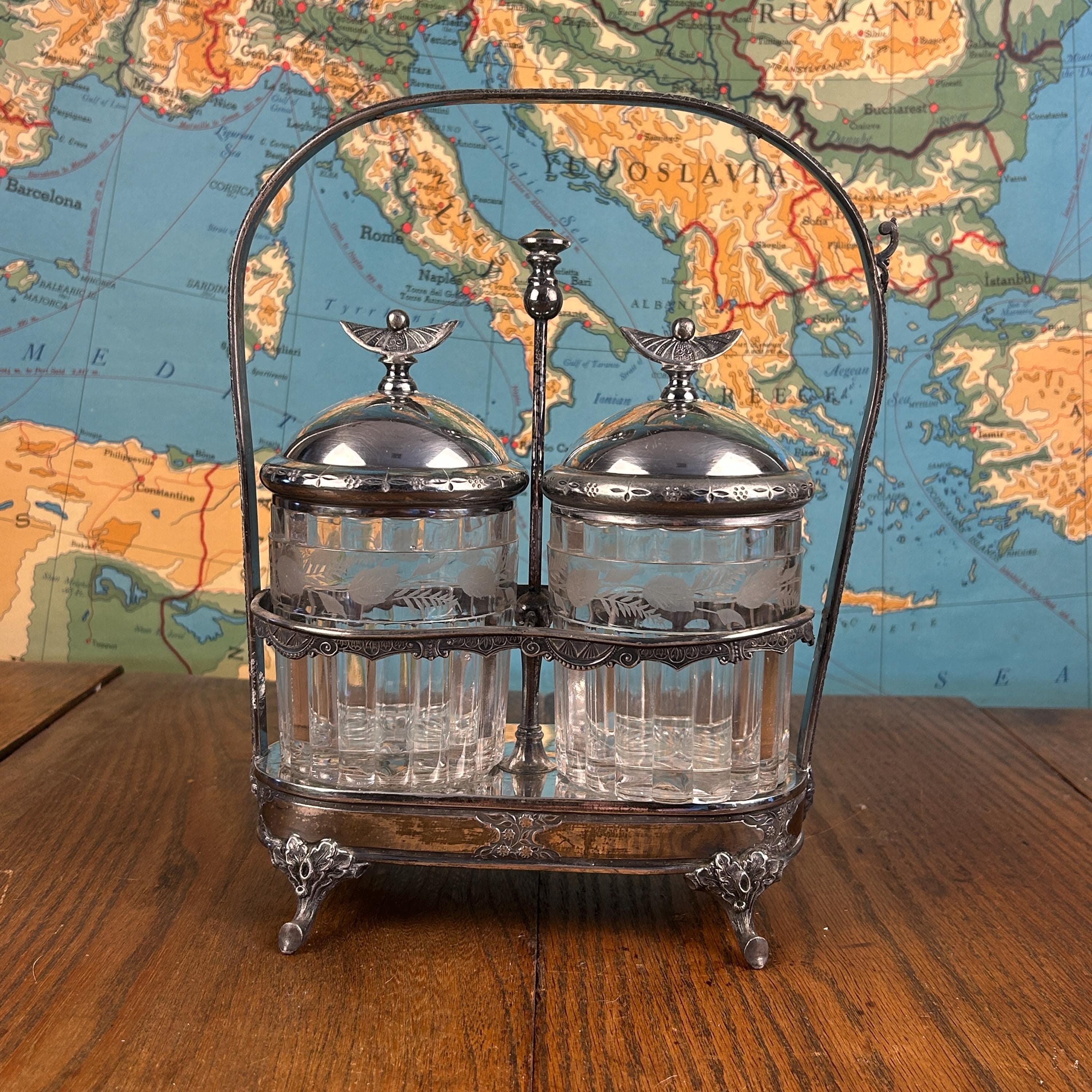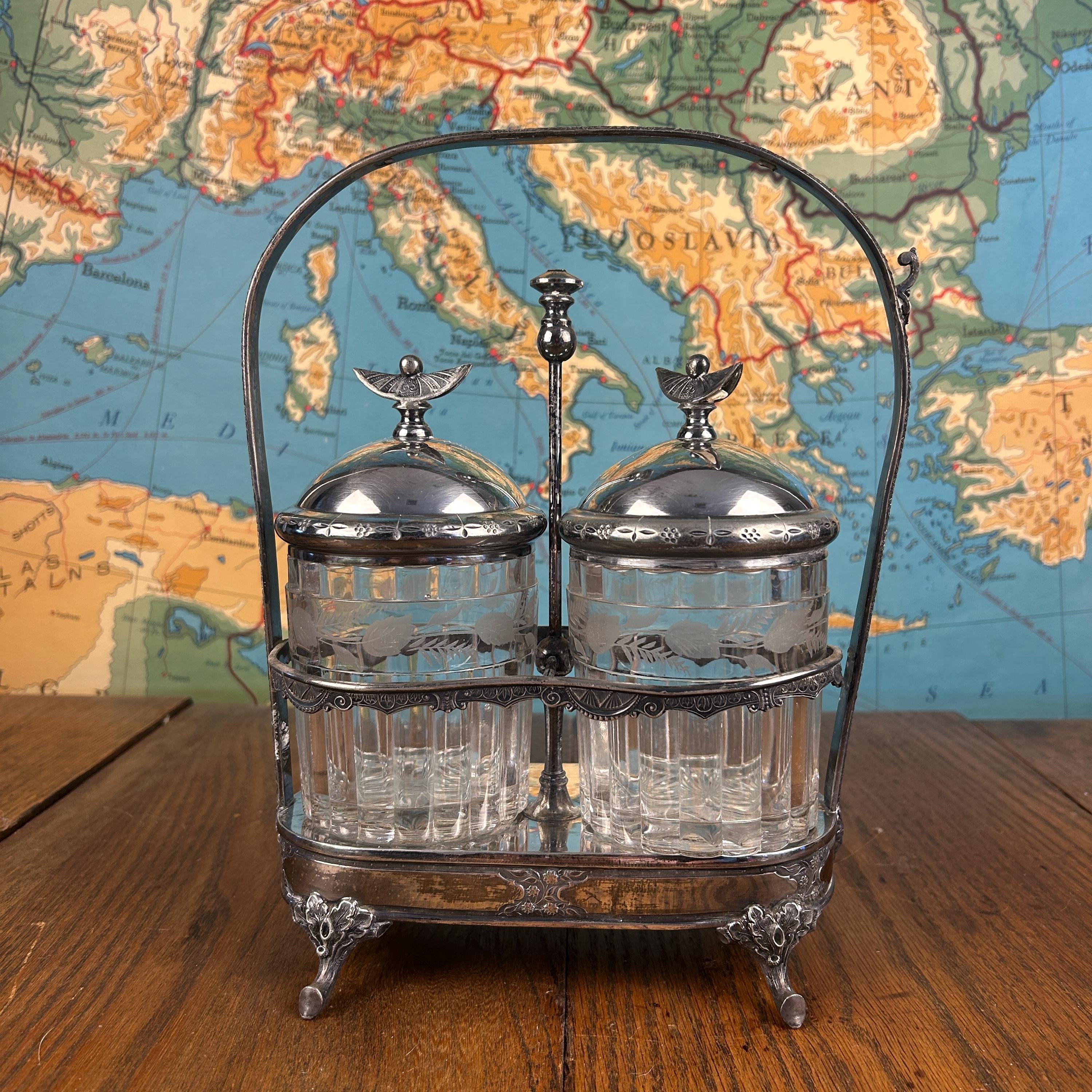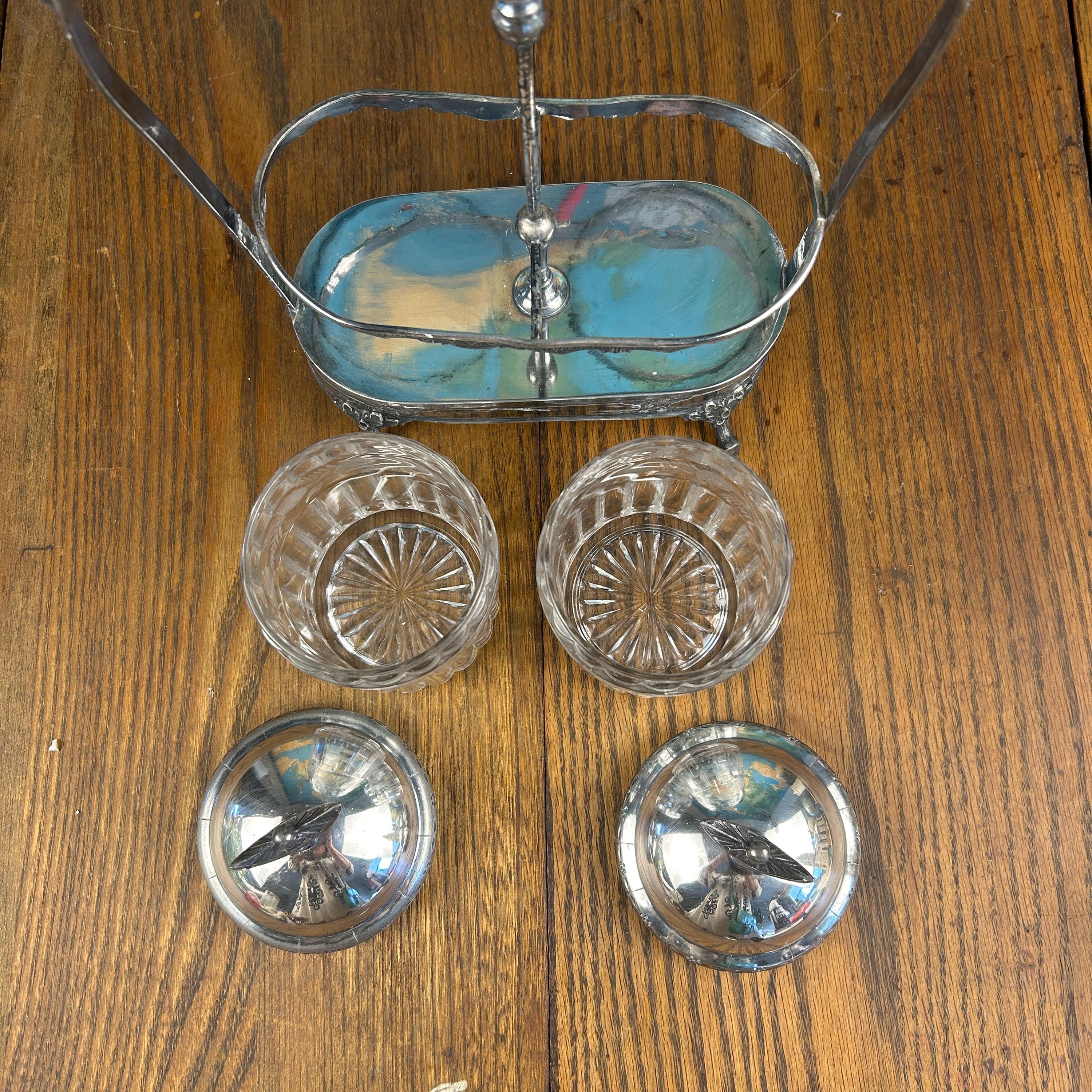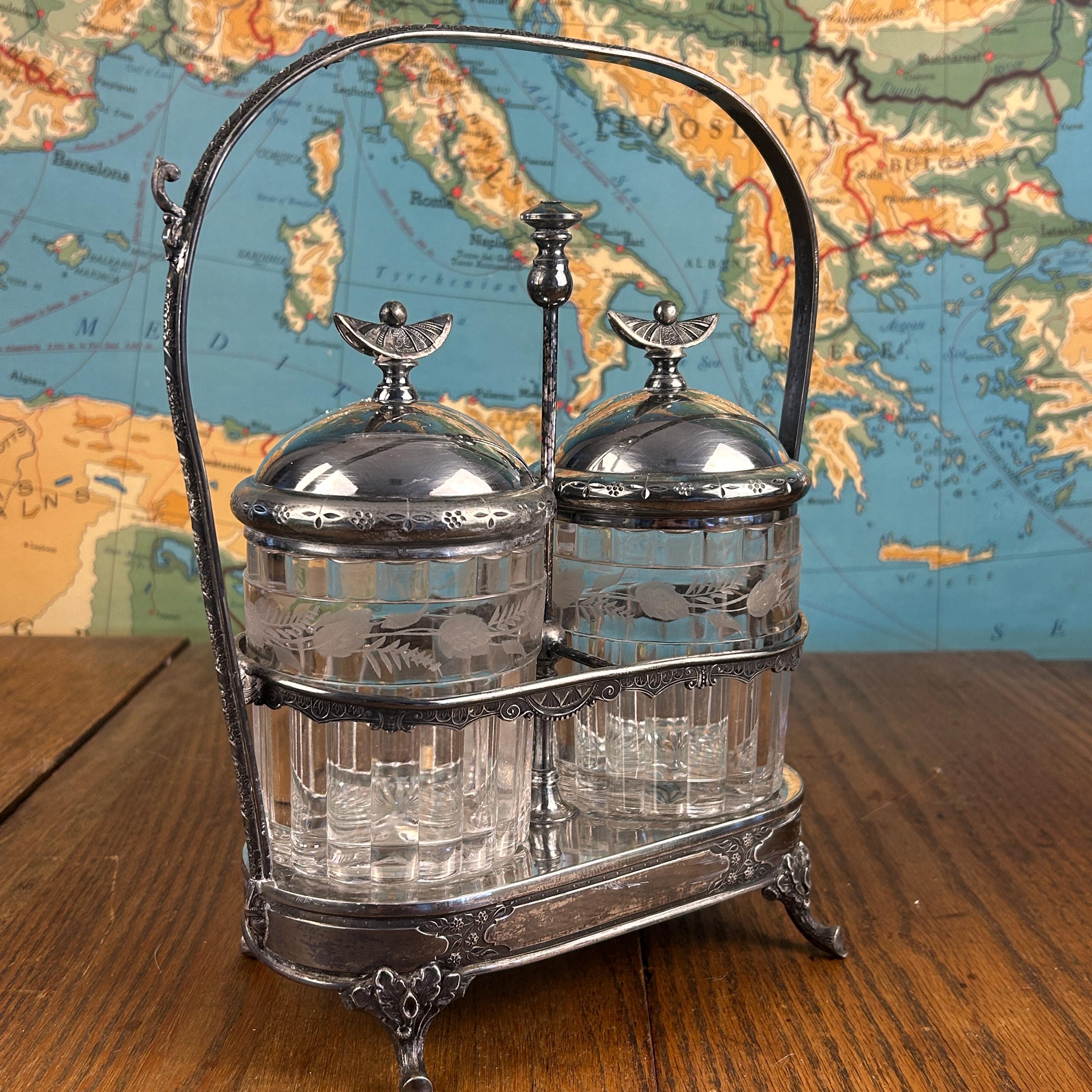 Very Good antique condition with wear consistent with age and use. Silver plate shows patina and light wear, adding to its character without any dings or dents. Glass jars are intact without chips or cracks. Please review all photos carefully, as they are part of the description.