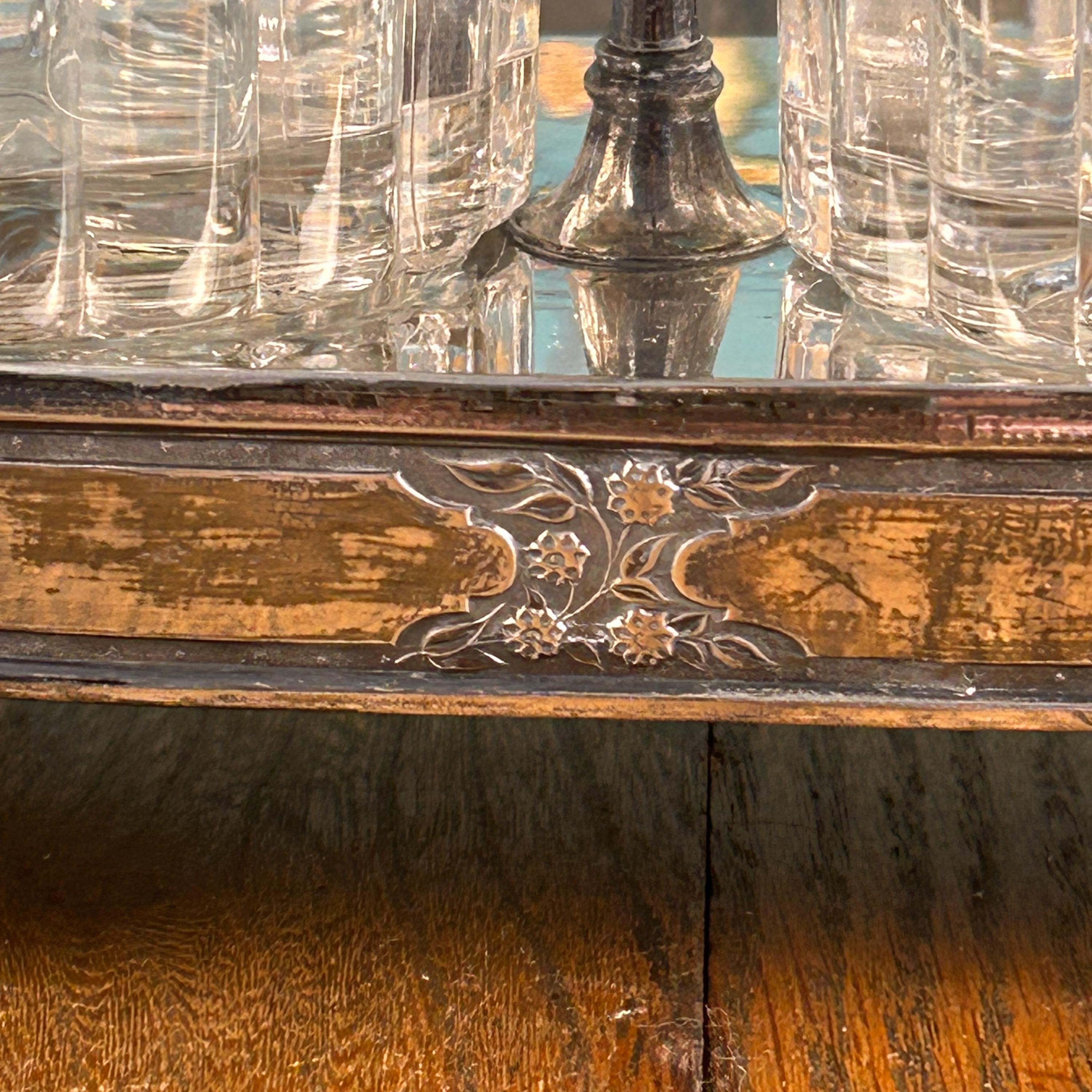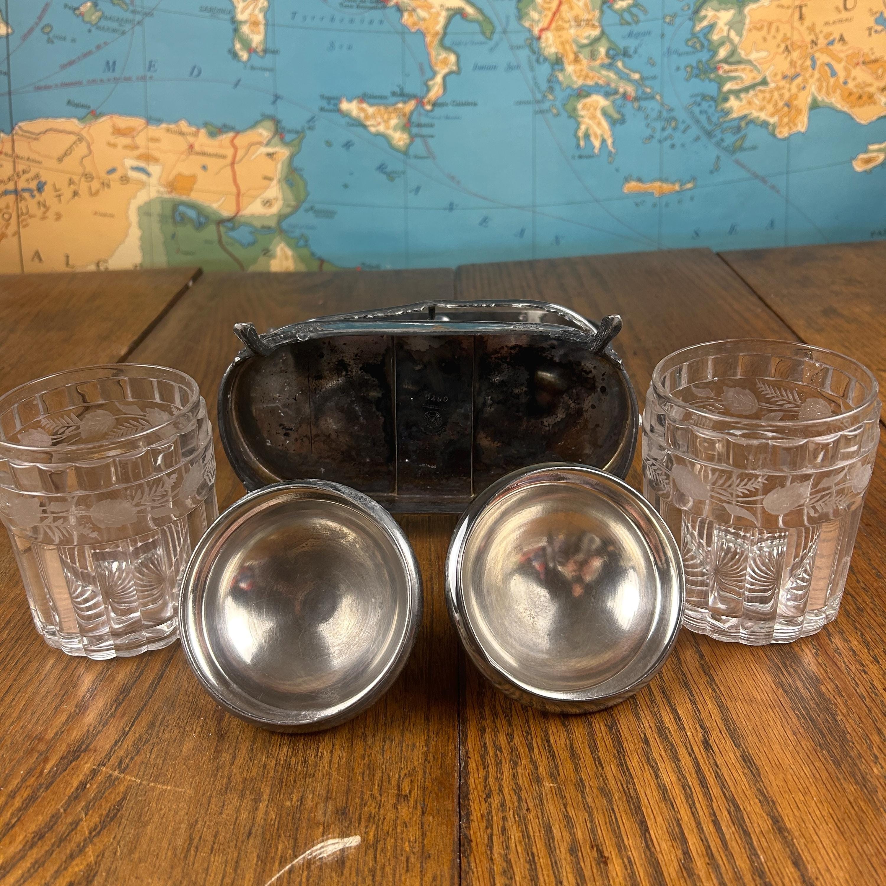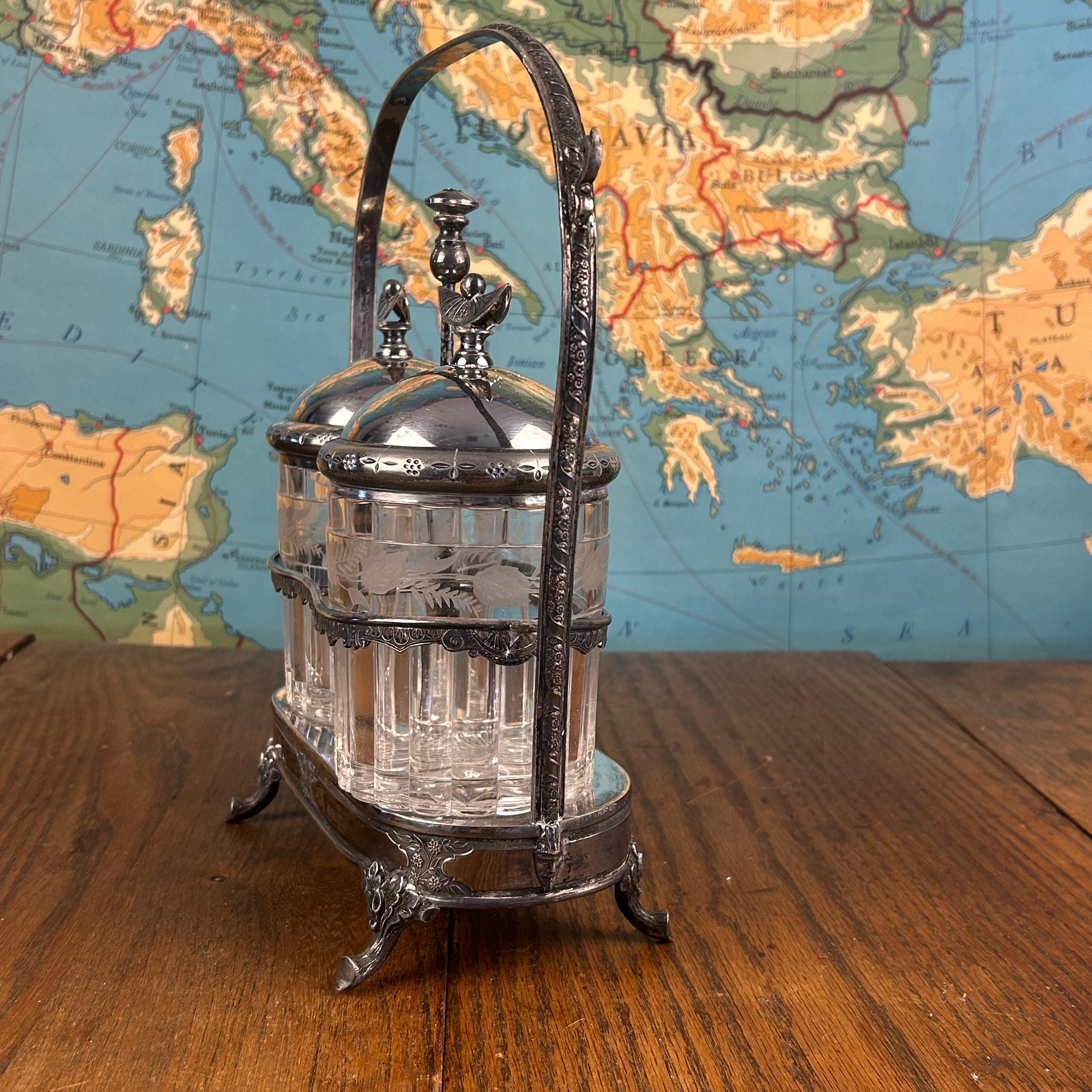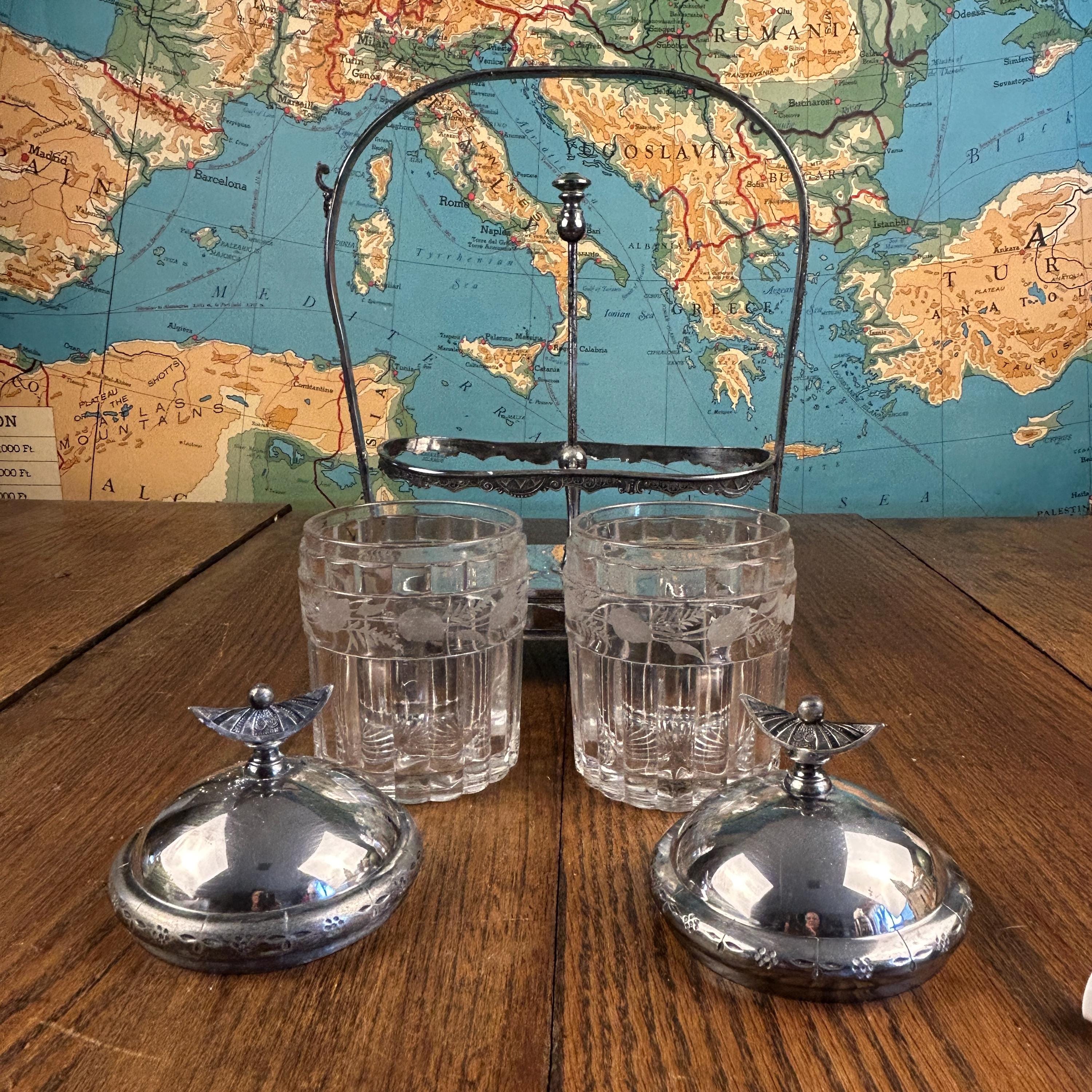 Very Good antique condition with wear consistent with age and use. Silver plate shows patina and light wear, adding to its character without any dings or dents. Glass jars are intact without chips or cracks. Please review all photos carefully, as they are part of the description.