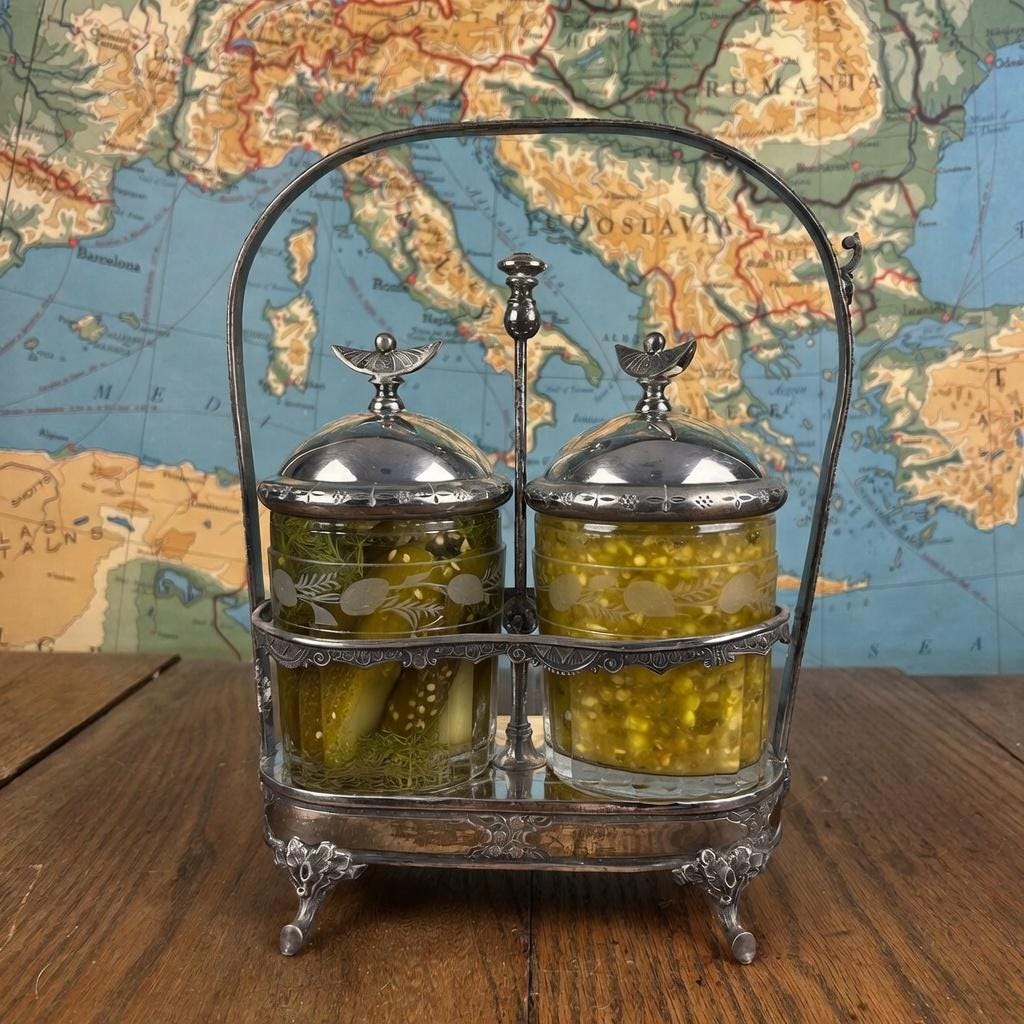 Originally used for serving pickles, jams, relishes, or condiments, this set now shines as an elegant antique centerpiece for a dining table, sideboard, or china cabinet.