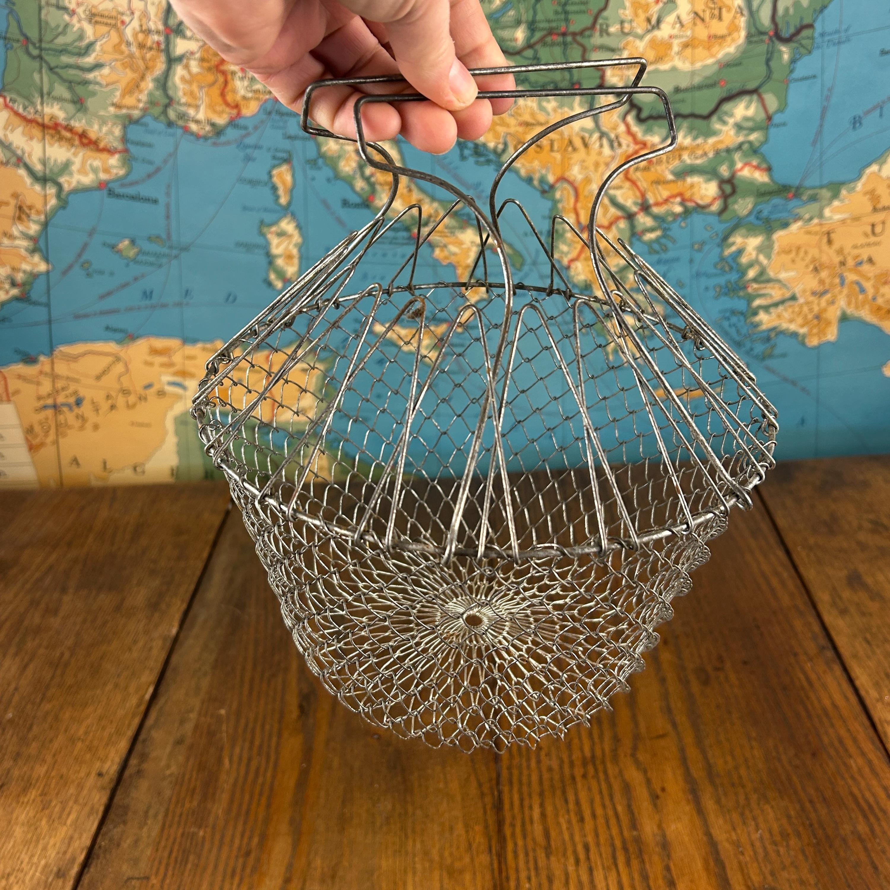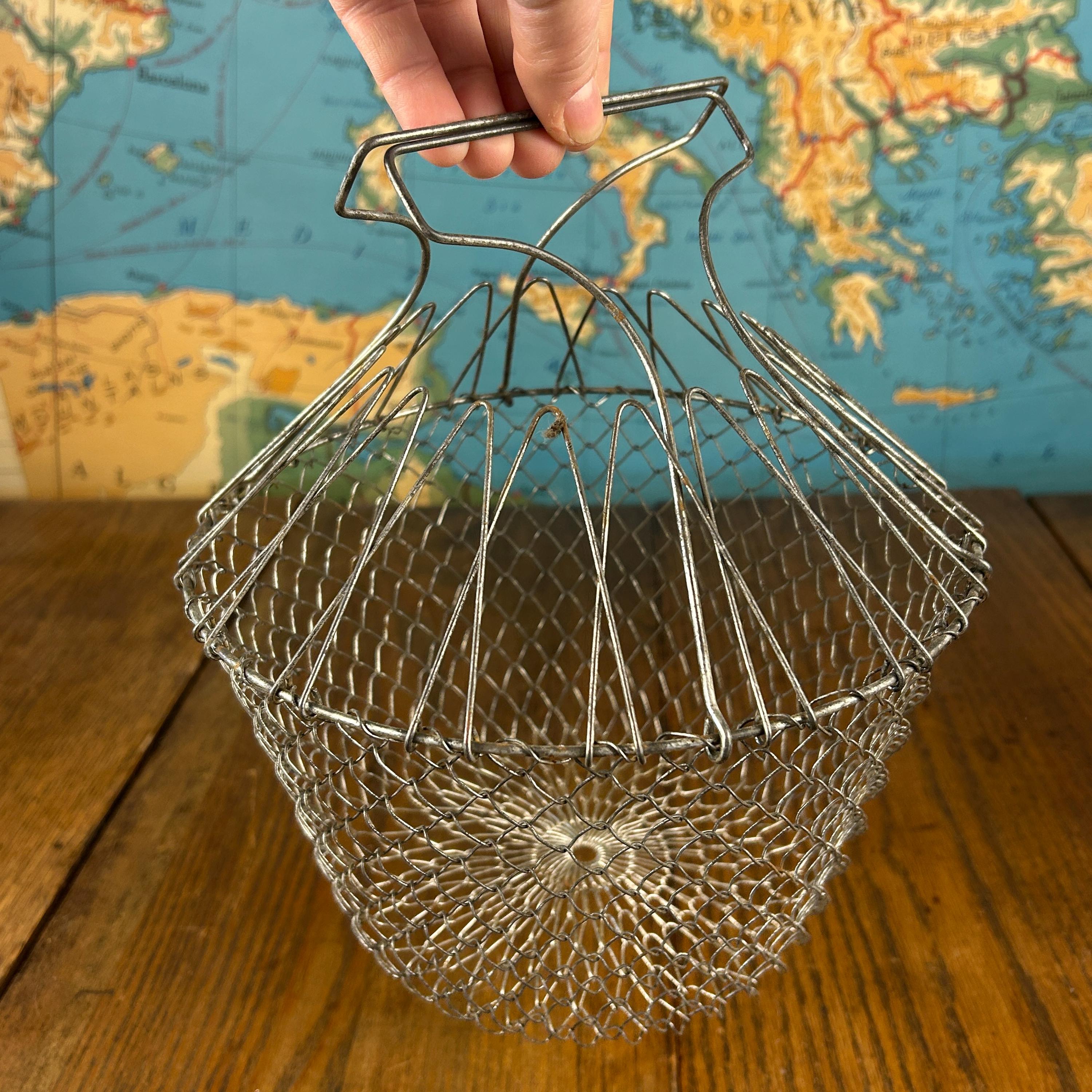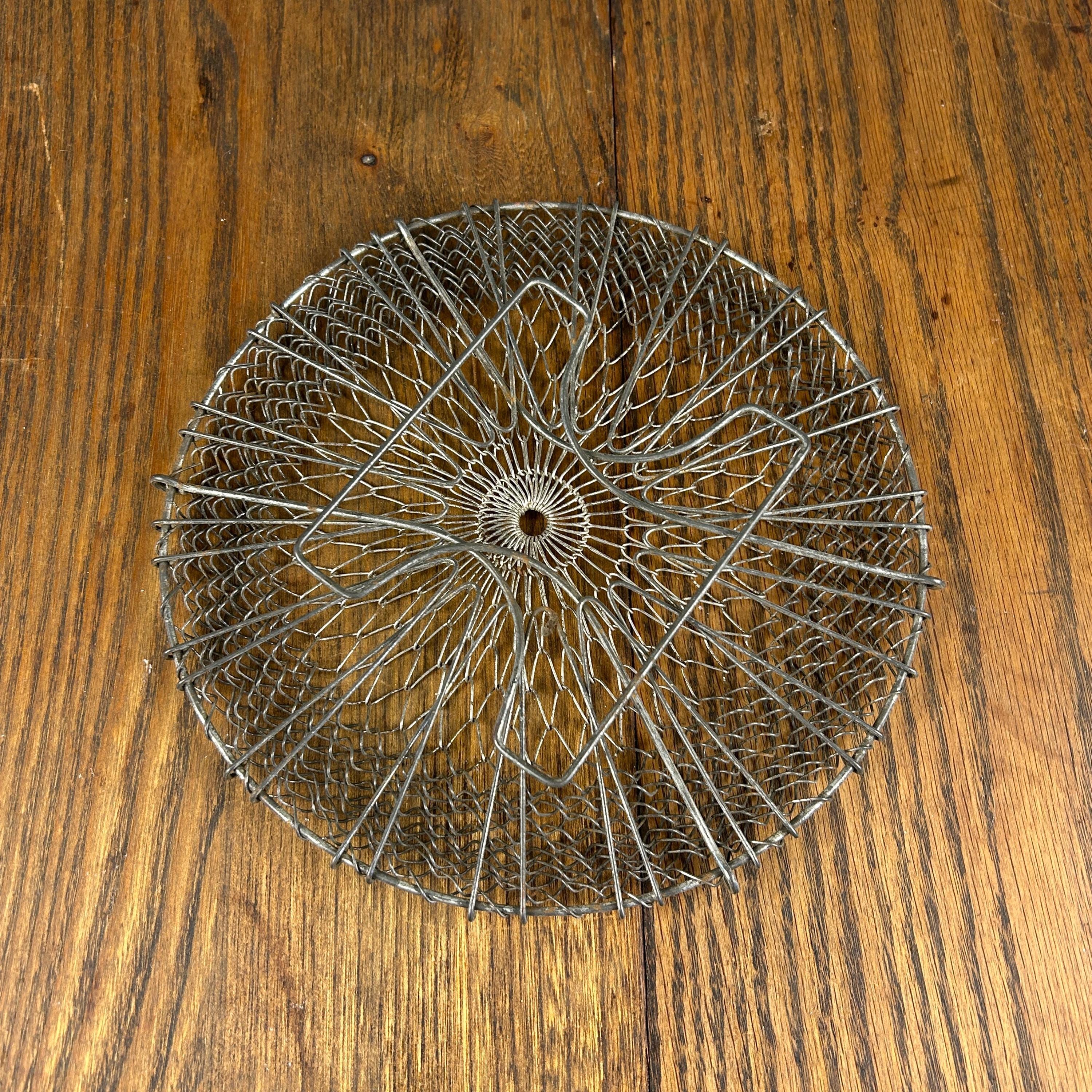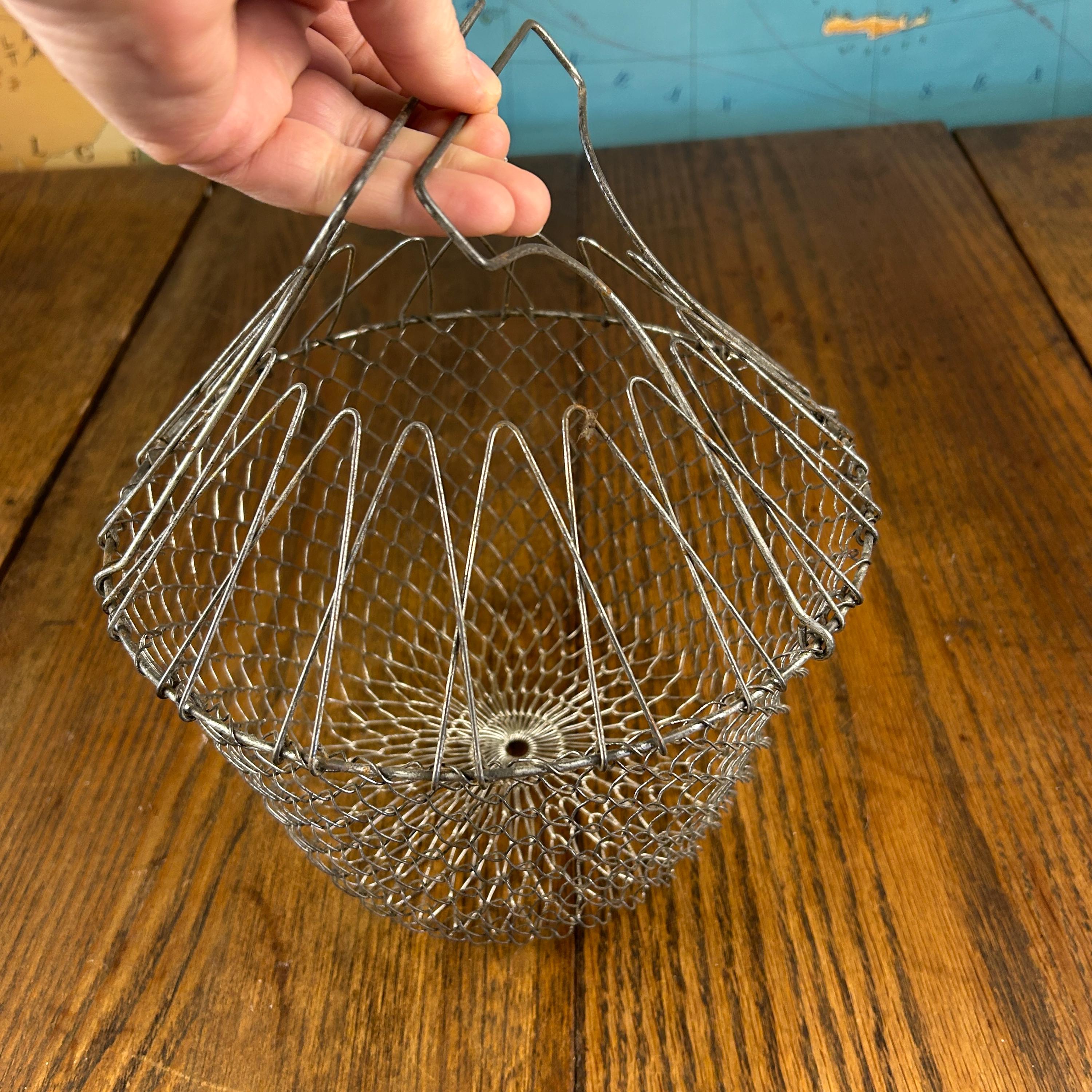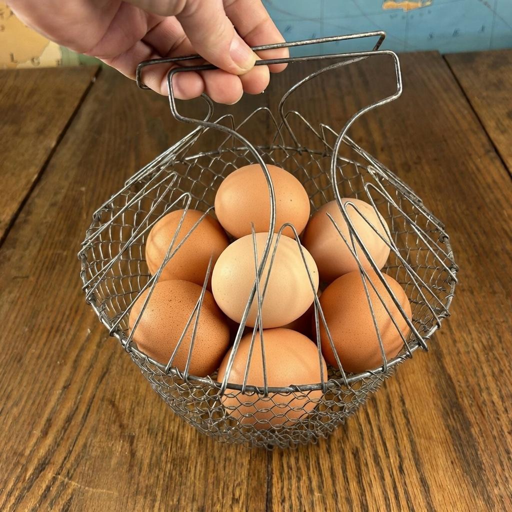 This is a vintage collapsible wire mesh egg gathering basket, traditionally used for safely collecting eggs from the coop. Crafted from sturdy metal wire (typically stainless steel or galvanized), the open mesh design allows for airflow while gently cradling fragile eggs during transport.