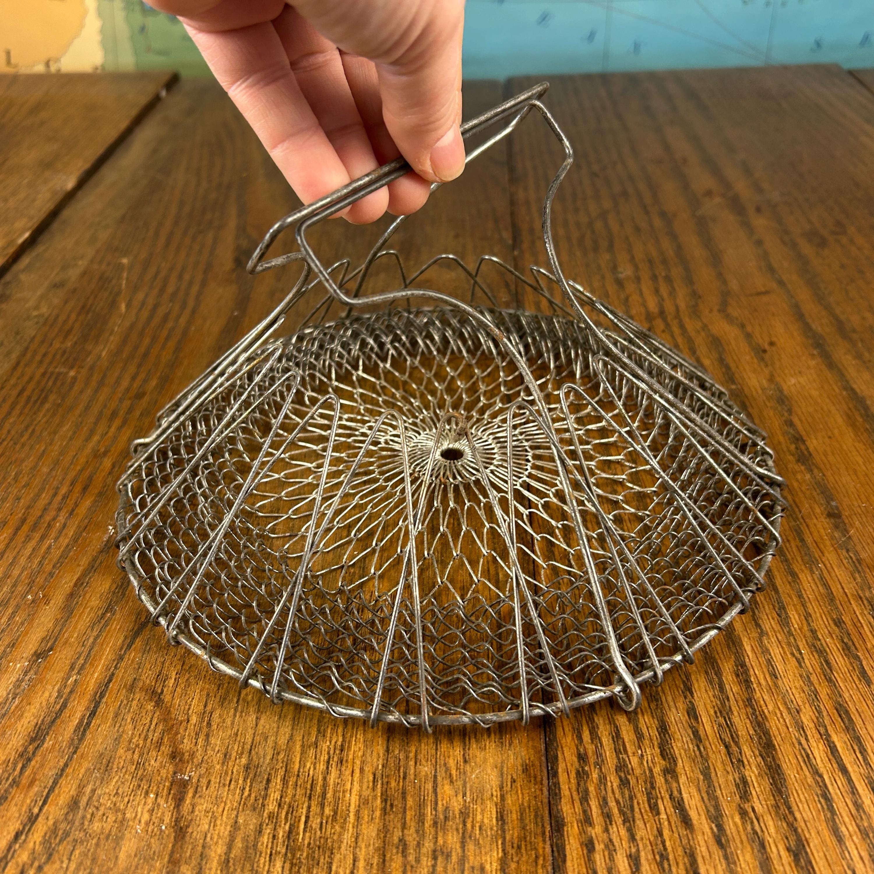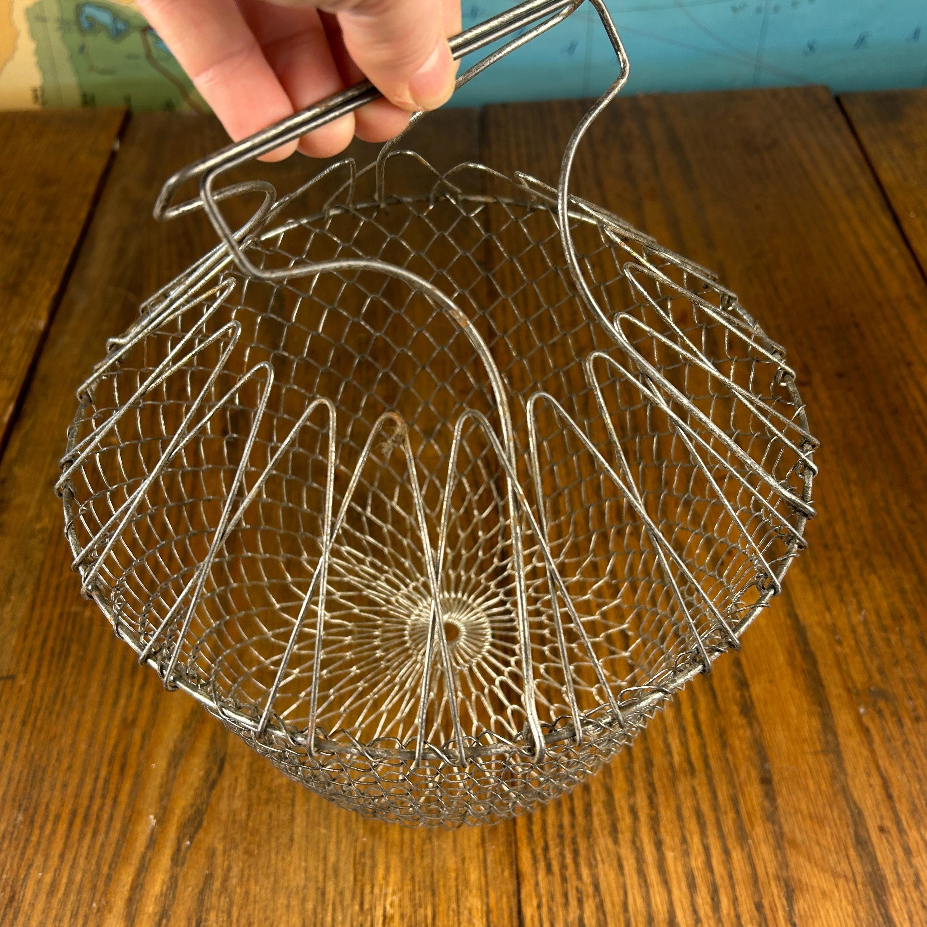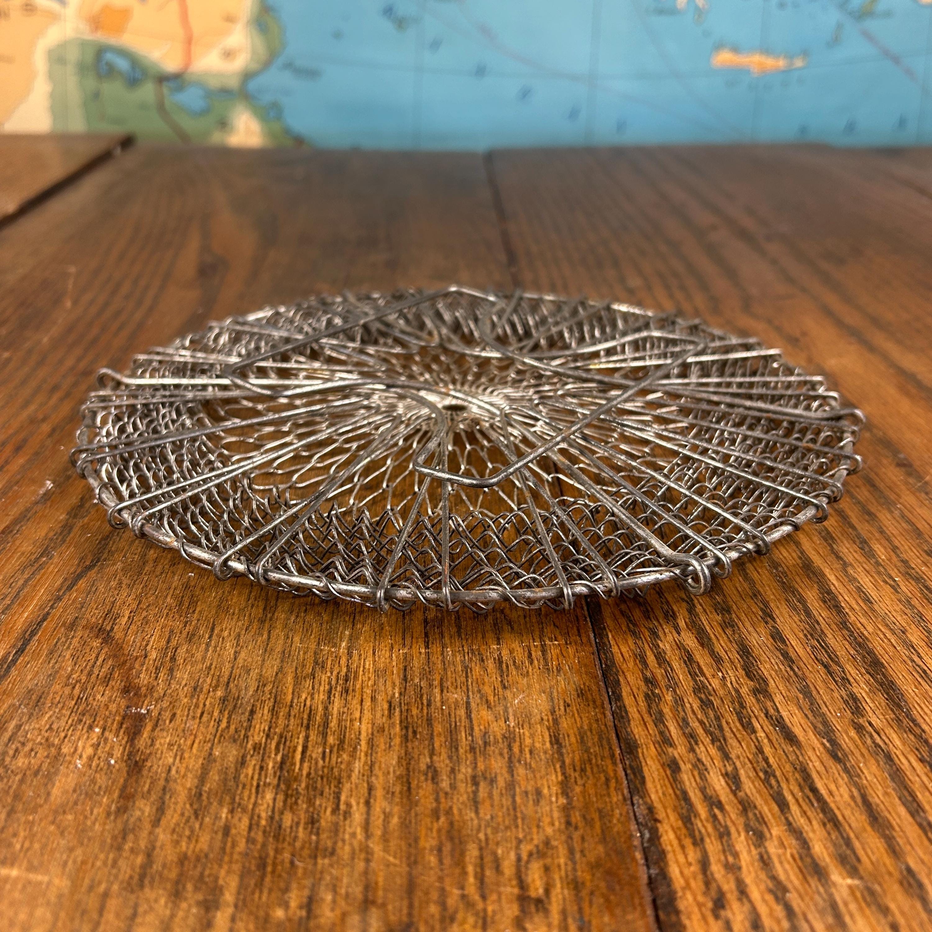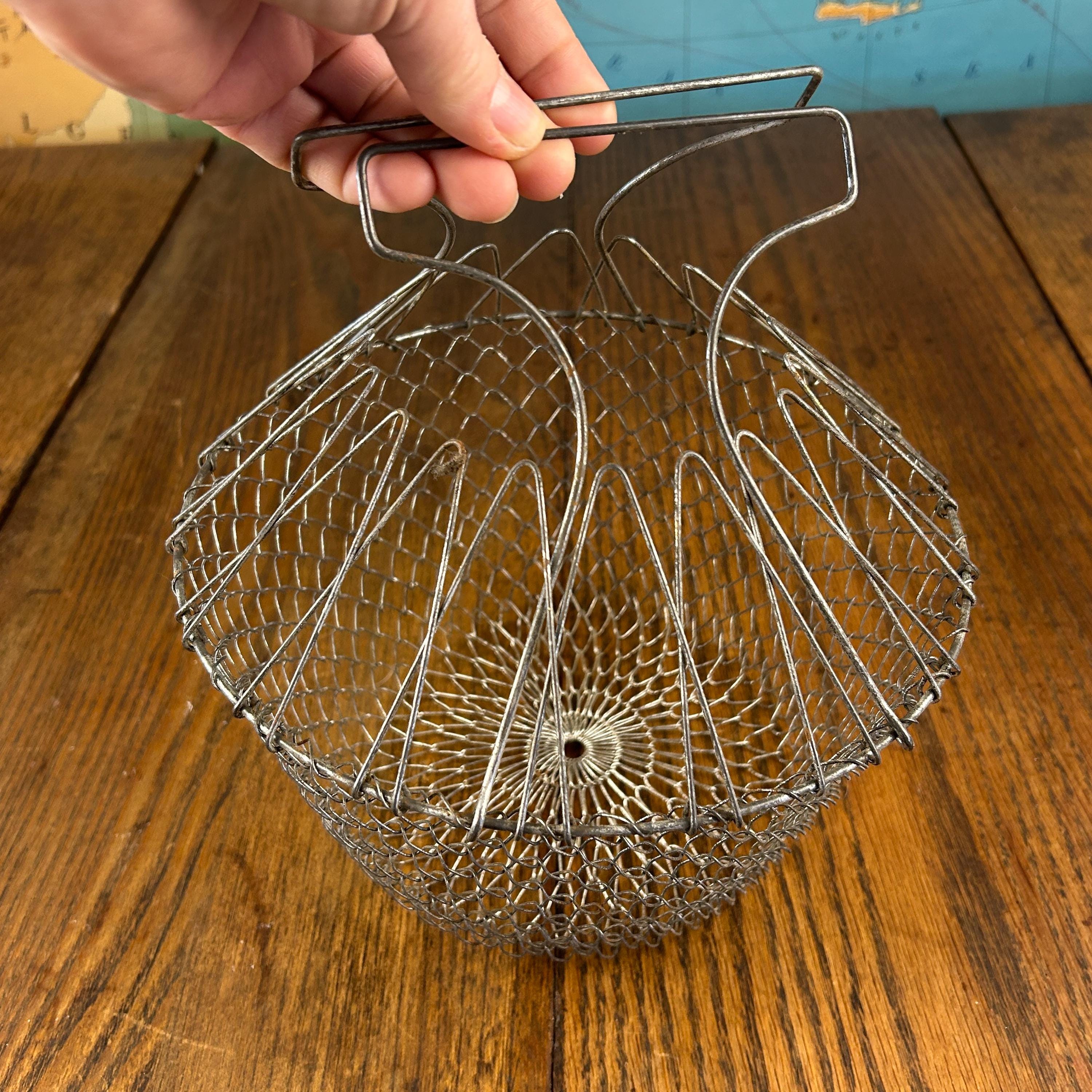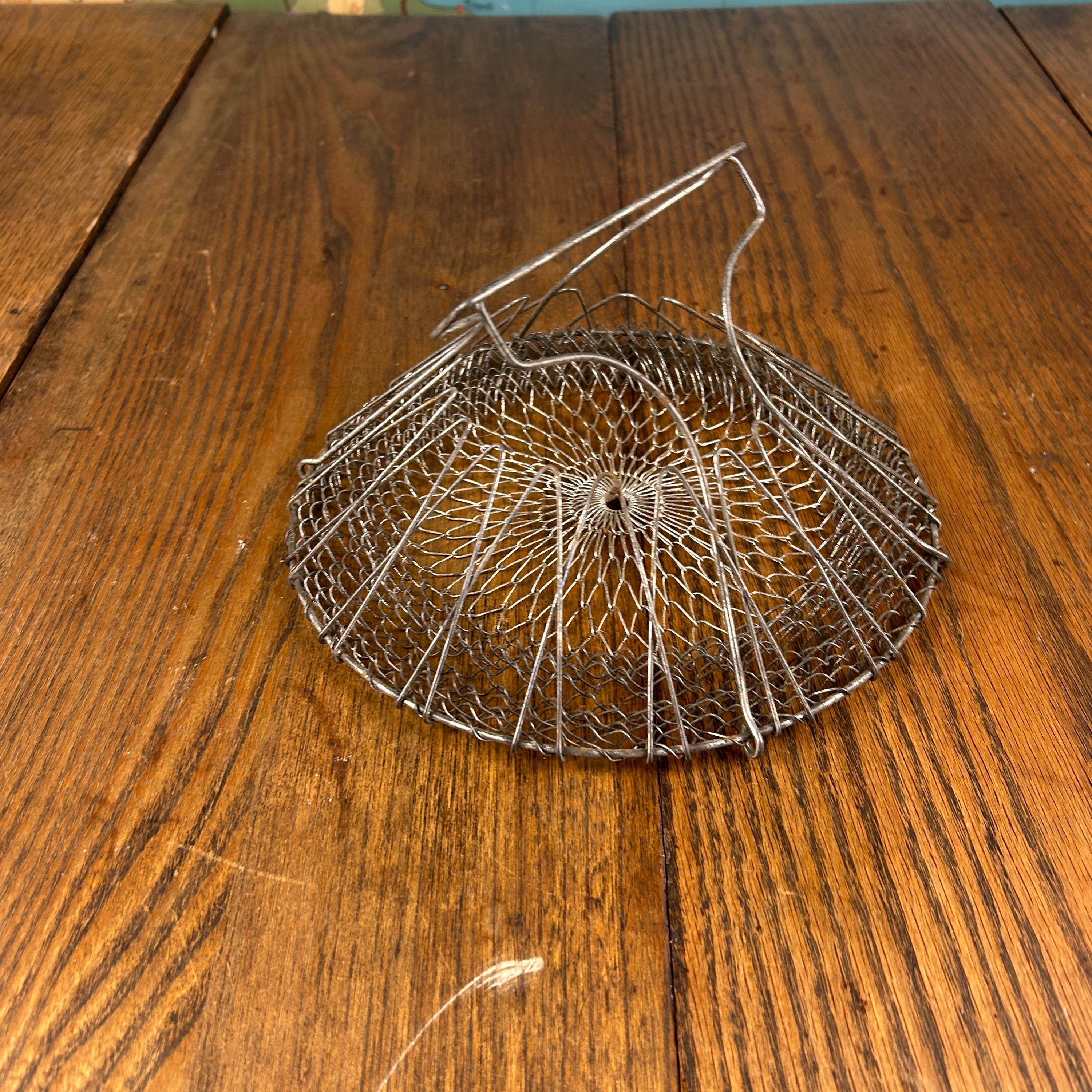 This is a vintage collapsible wire mesh egg gathering basket, traditionally used for safely collecting eggs from the coop. Crafted from sturdy metal wire (typically stainless steel or galvanized), the open mesh design allows for airflow while gently cradling fragile eggs during transport.