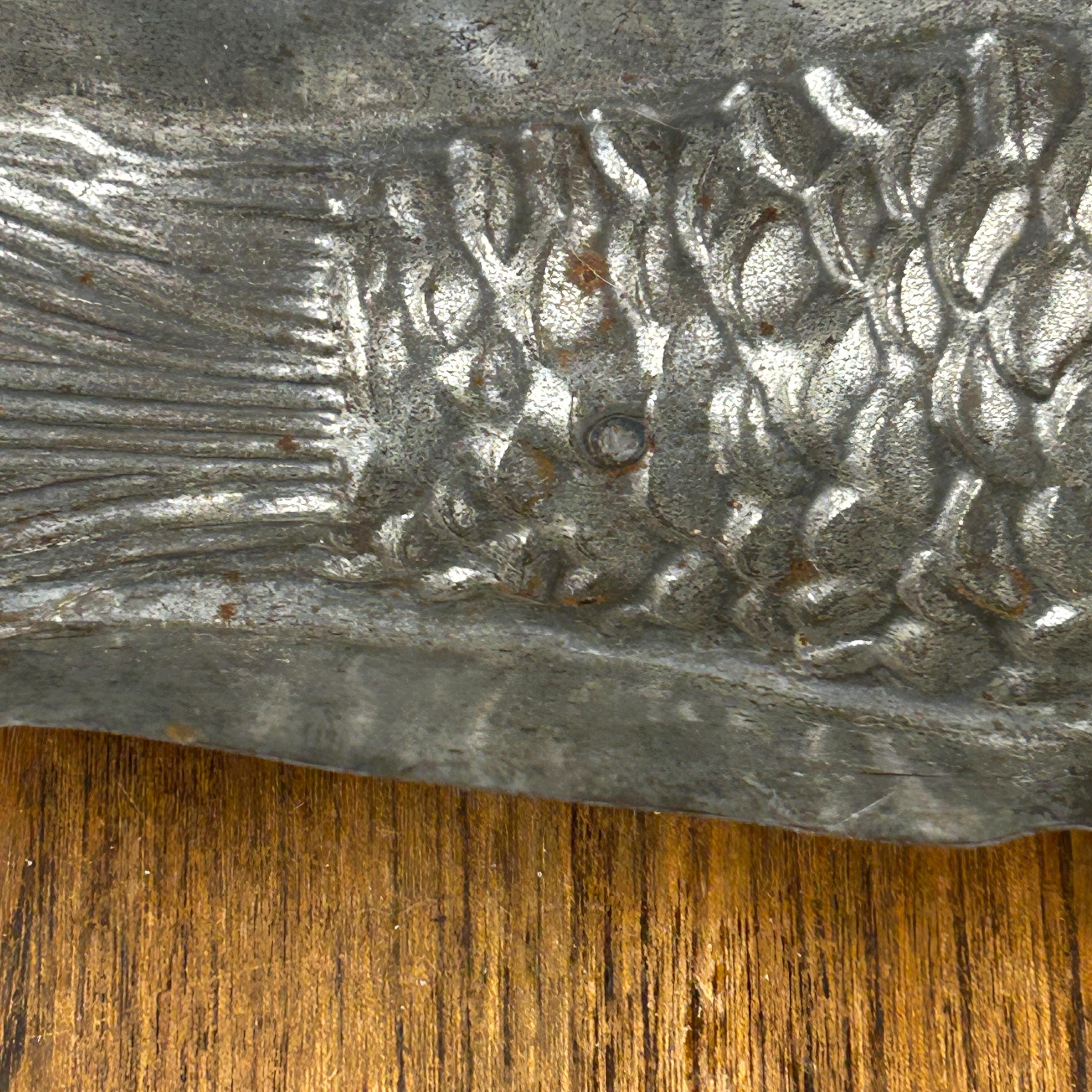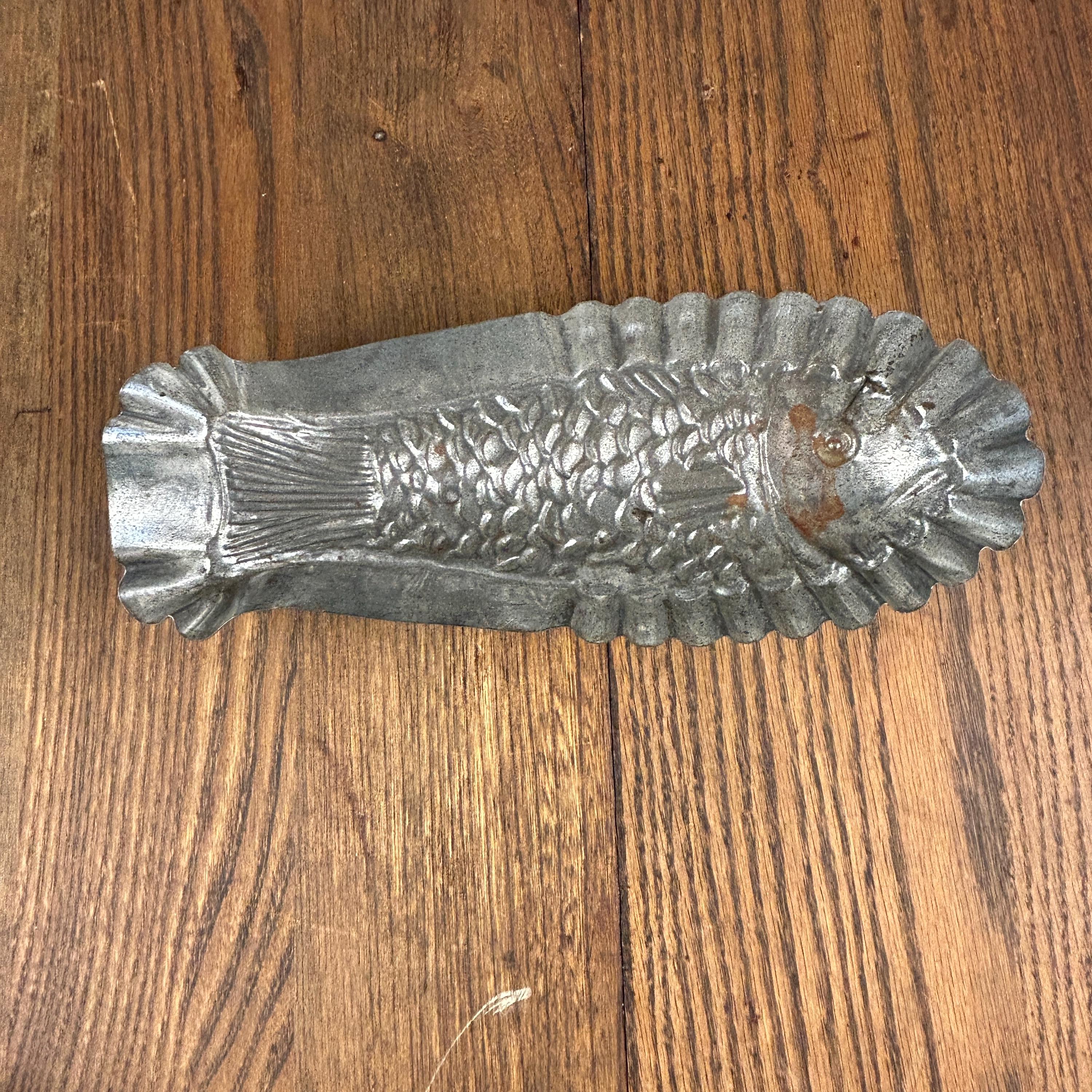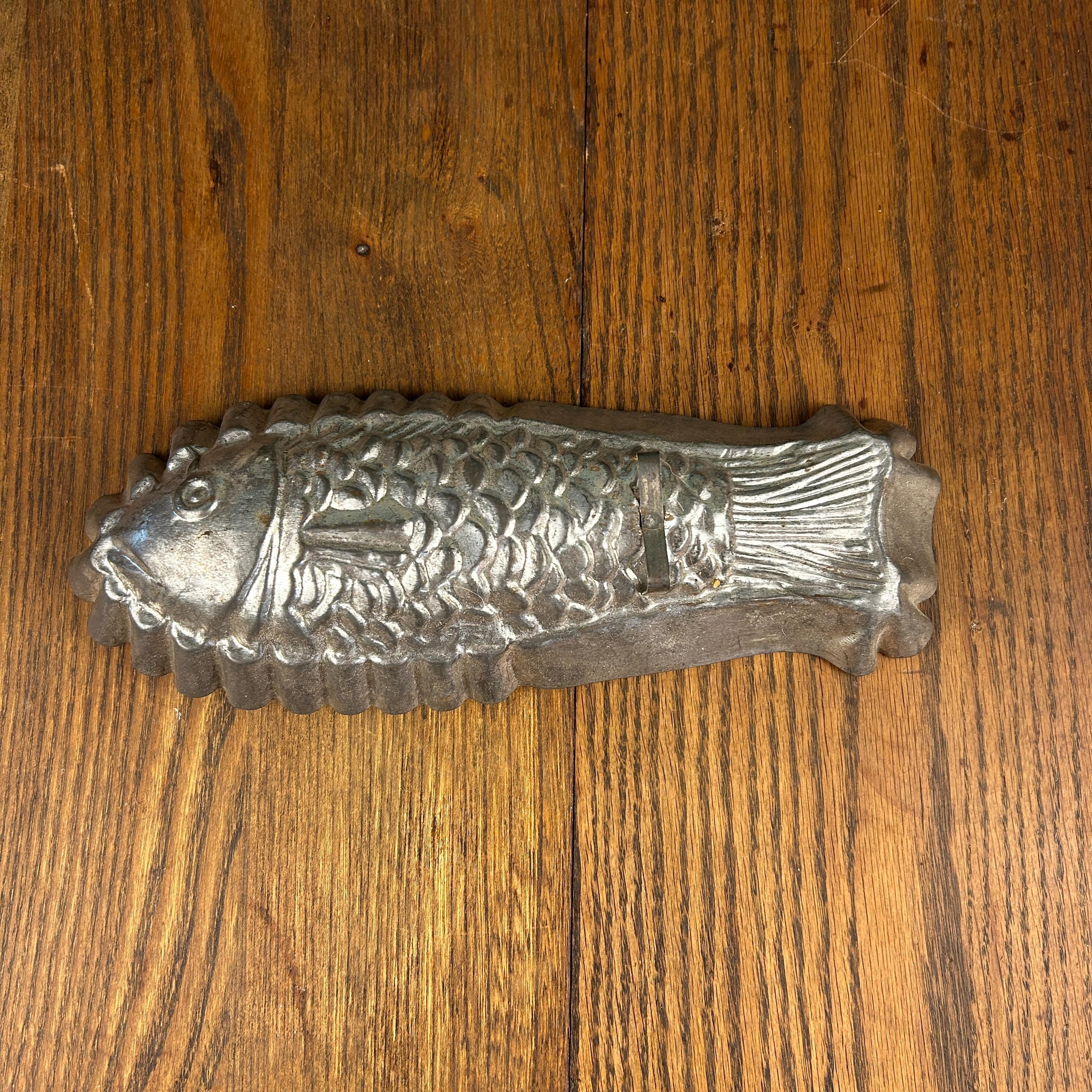 This is a vintage metal mold shaped like a fish, a classic kitchen piece often used for baking cakes, molding gelatin salads, or creating decorative aspics. Crafted from aluminum or tin, the mold features detailed scales and fins along with fluted edges, giving it wonderful texture and visual interest.