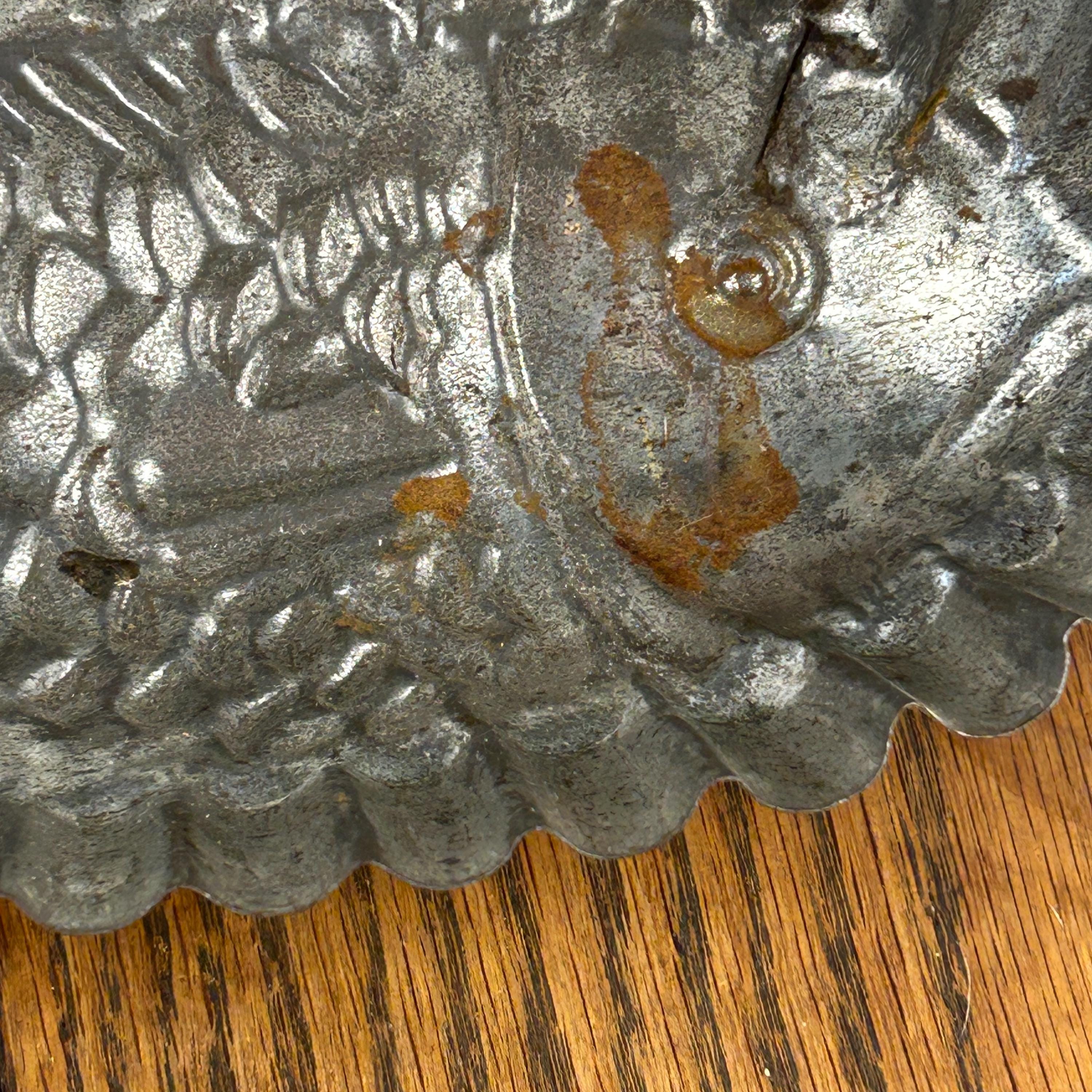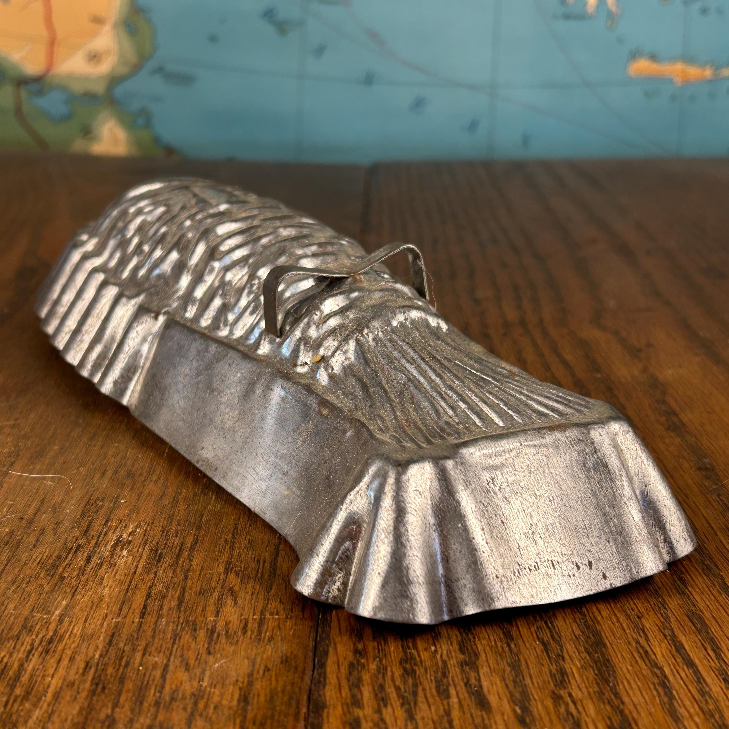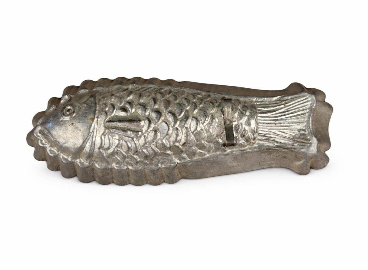 This is a vintage metal mold shaped like a fish, a classic kitchen piece often used for baking cakes, molding gelatin salads, or creating decorative aspics. Crafted from aluminum or tin, the mold features detailed scales and fins along with fluted edges, giving it wonderful texture and visual interest.