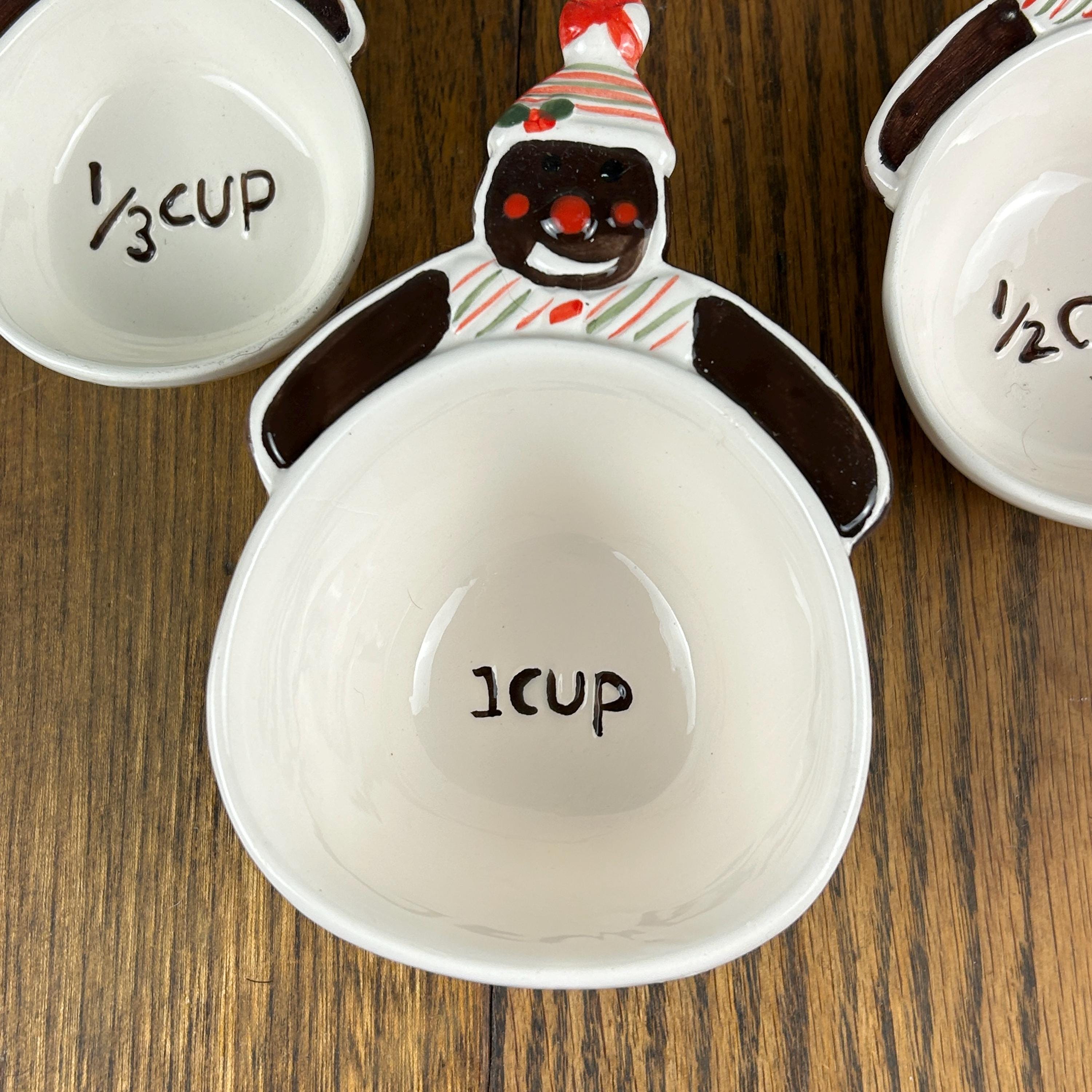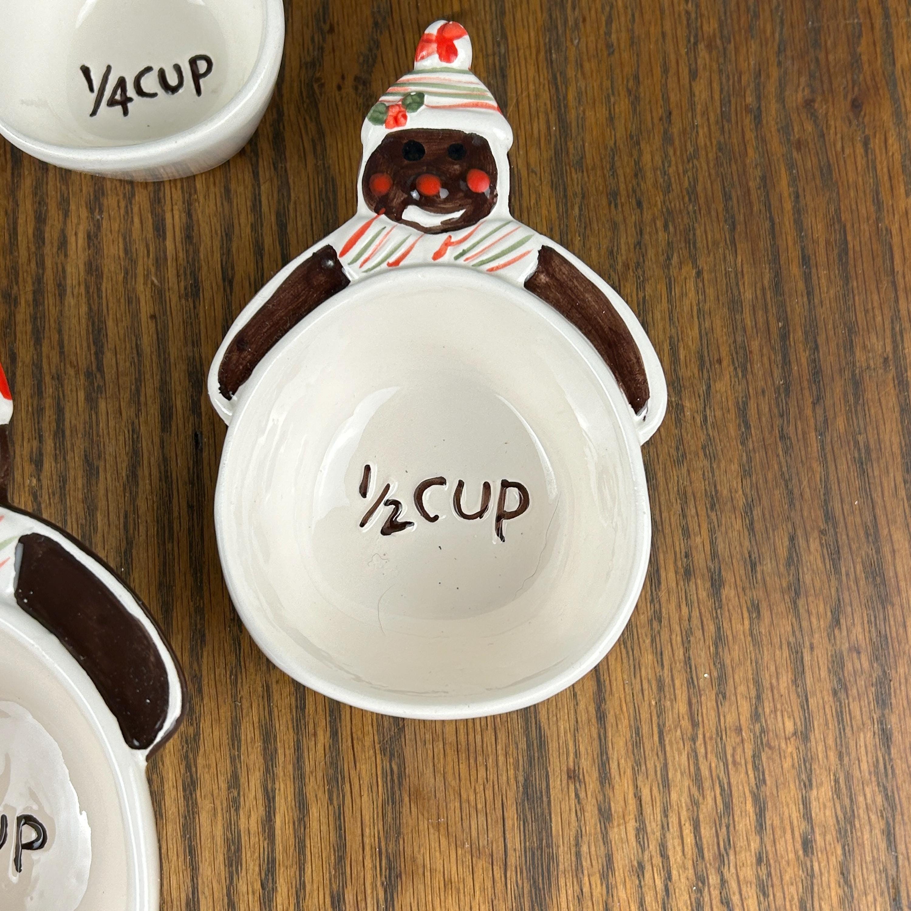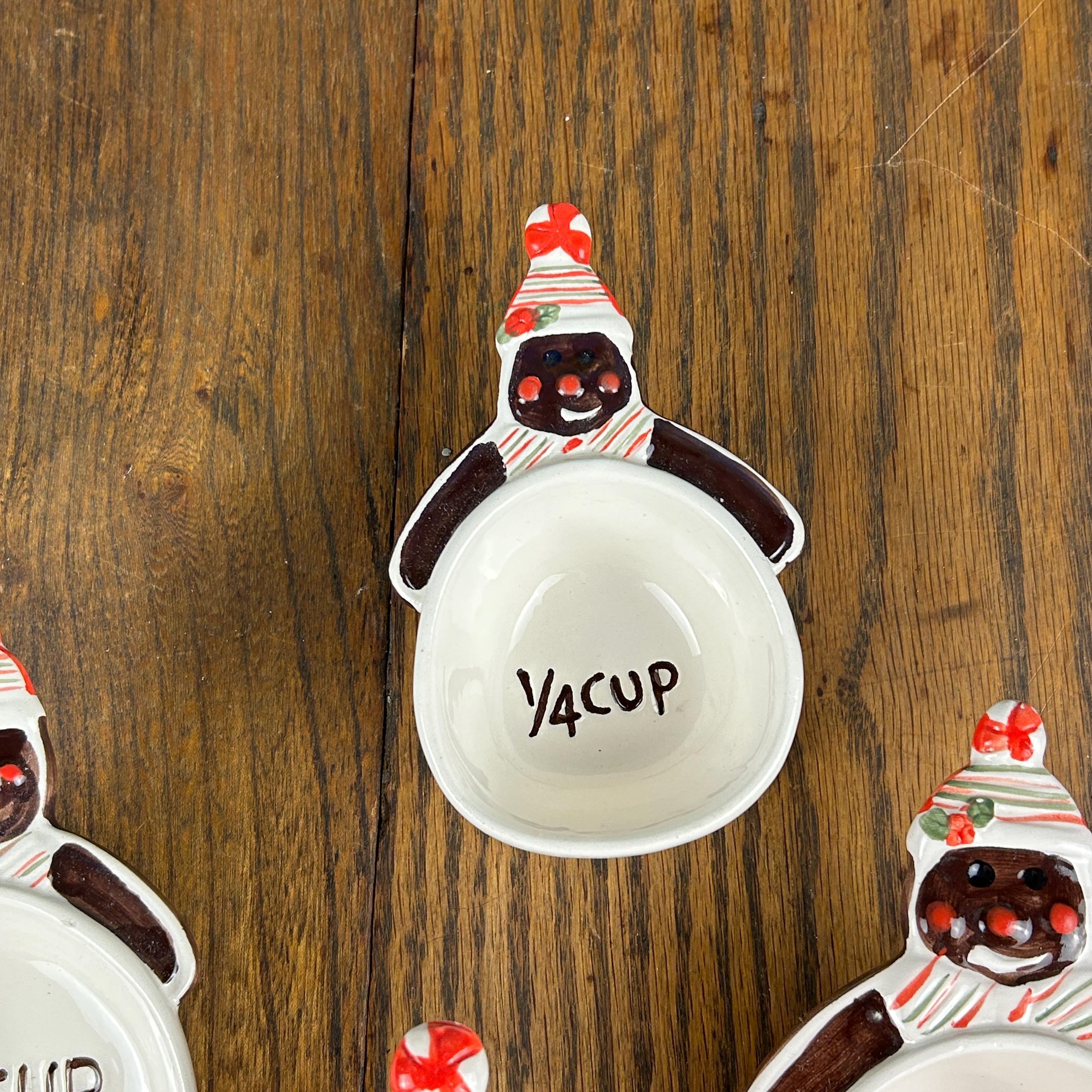 This is a set of 4 ceramic Gingerbread Man measuring cups made by Tien Hsing Int'l Trading Co.. Each cup features an adorable hand-painted gingerbread man wearing a festive holiday hat, bringing instant Christmas cheer to your kitchen.
