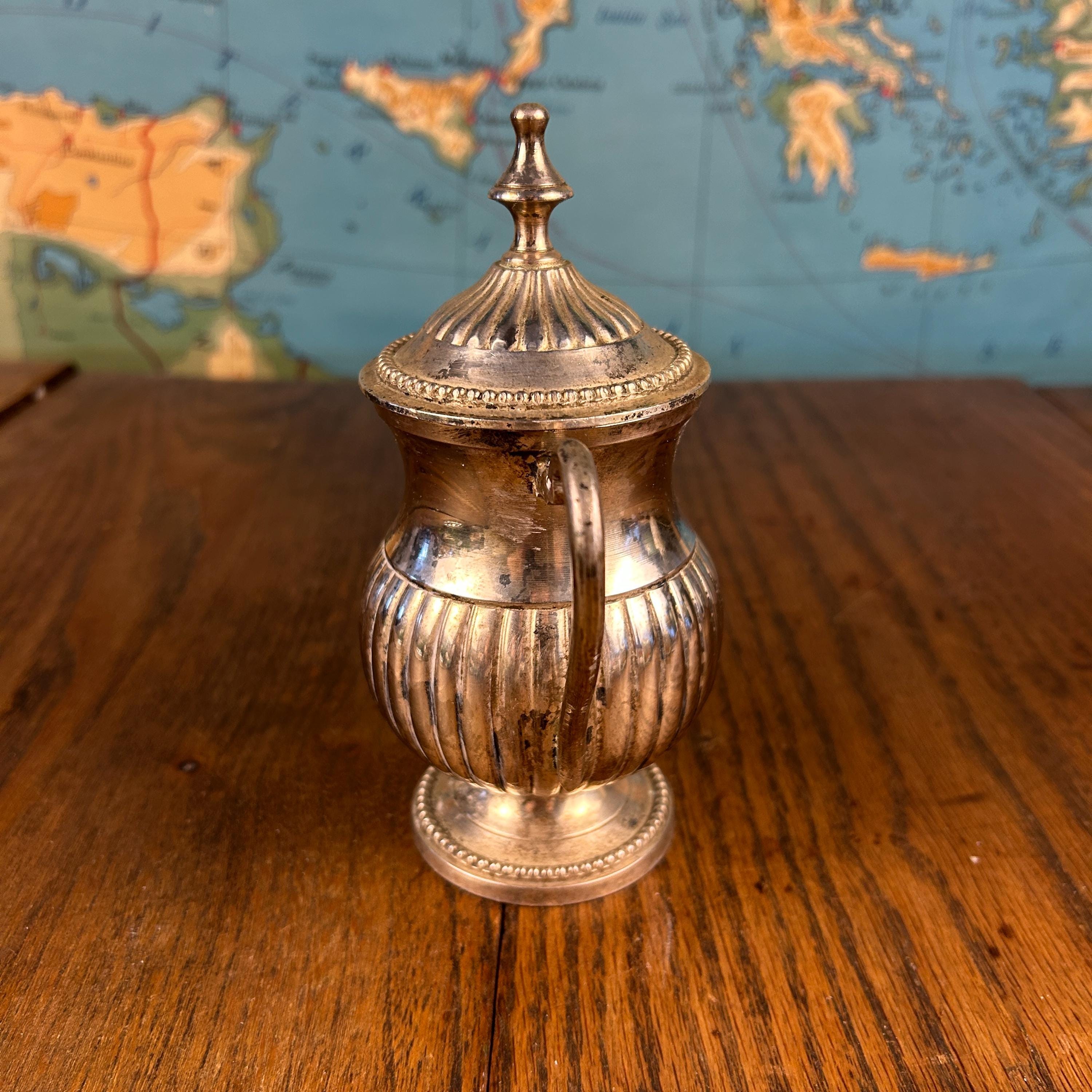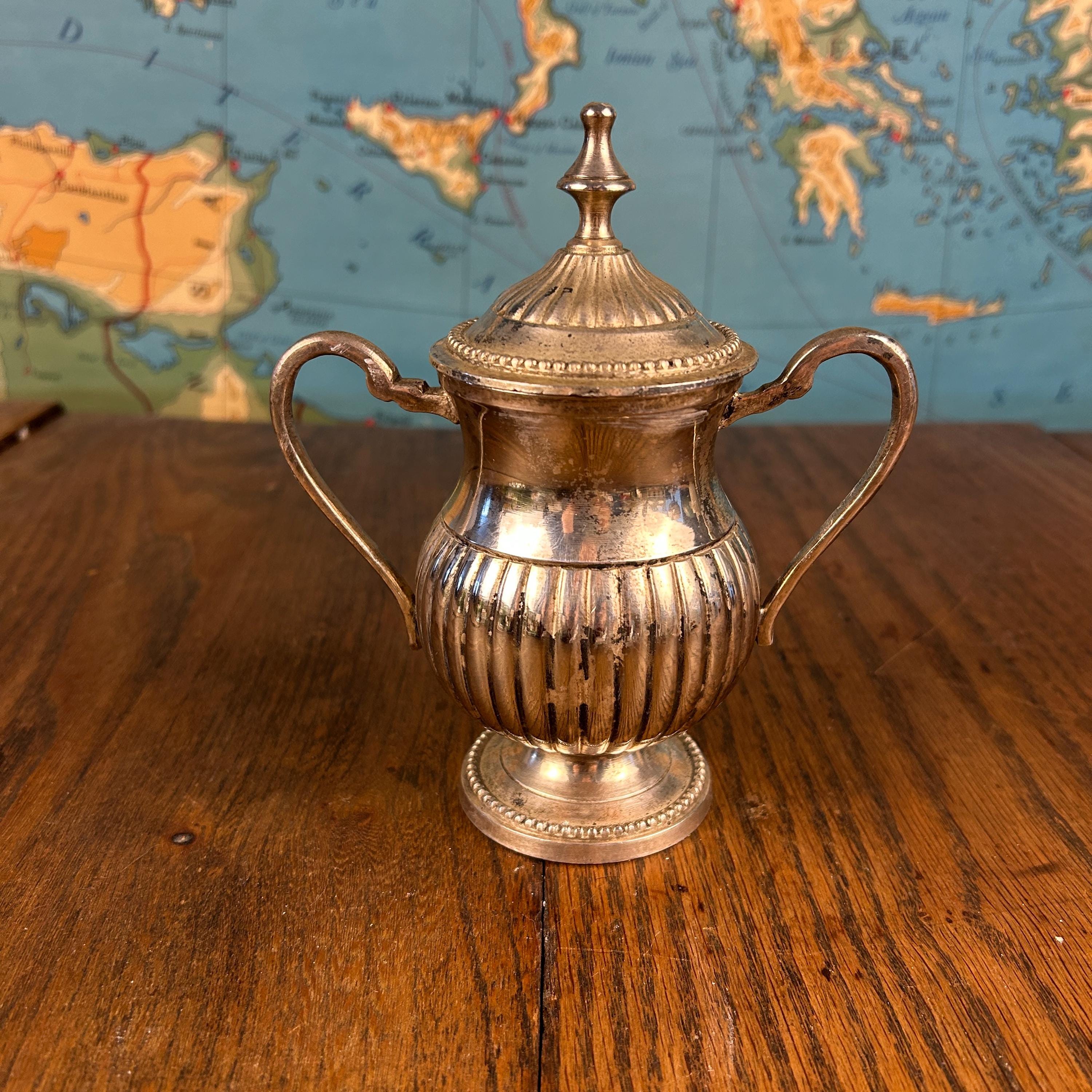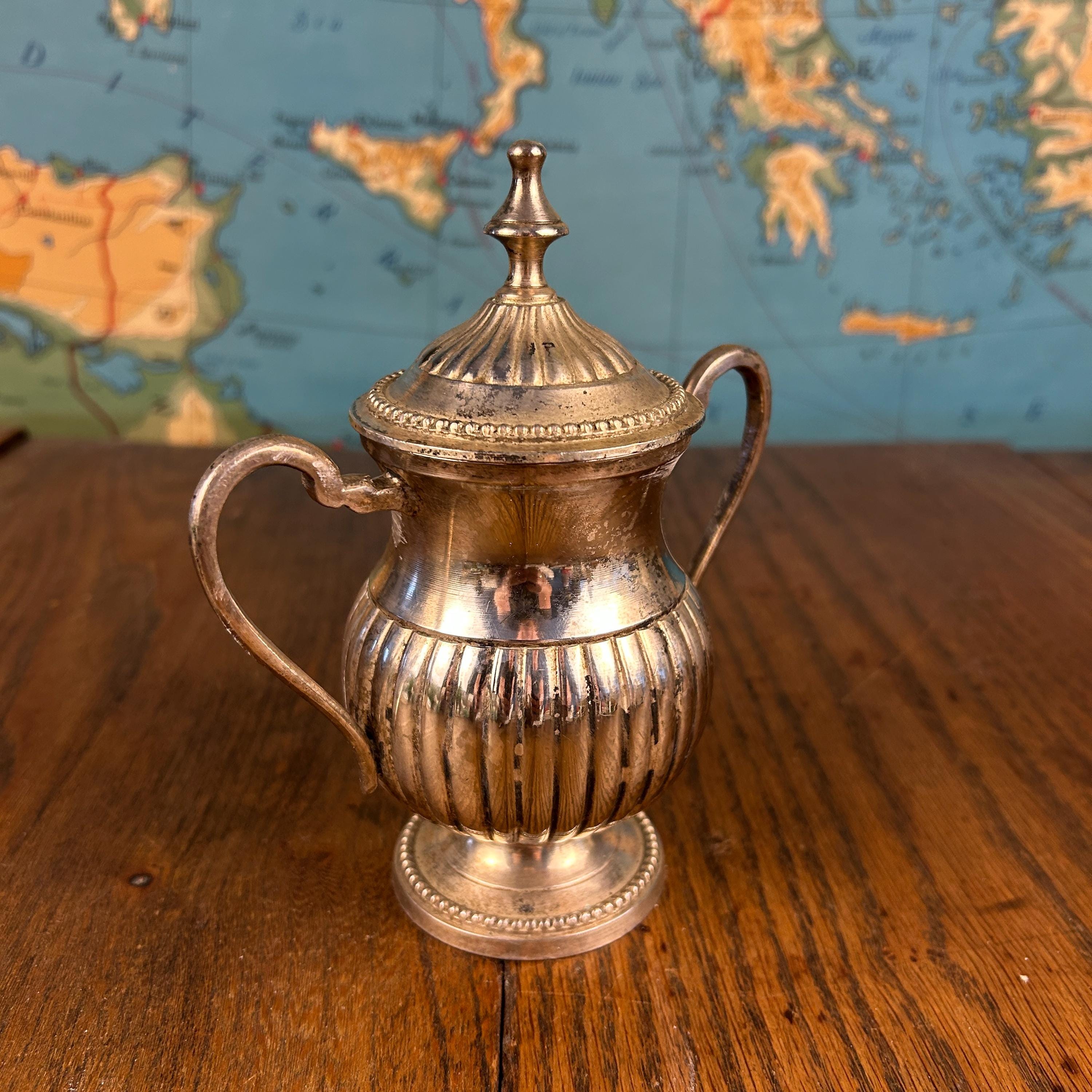 Quadruple silver plate indicates a thicker plating process, valued for its durability and rich shine. This bowl works beautifully as a sugar bowl, but it can also be styled as a small candy dish, trinket holder, or accent piece in a china cabinet or on a sideboard.