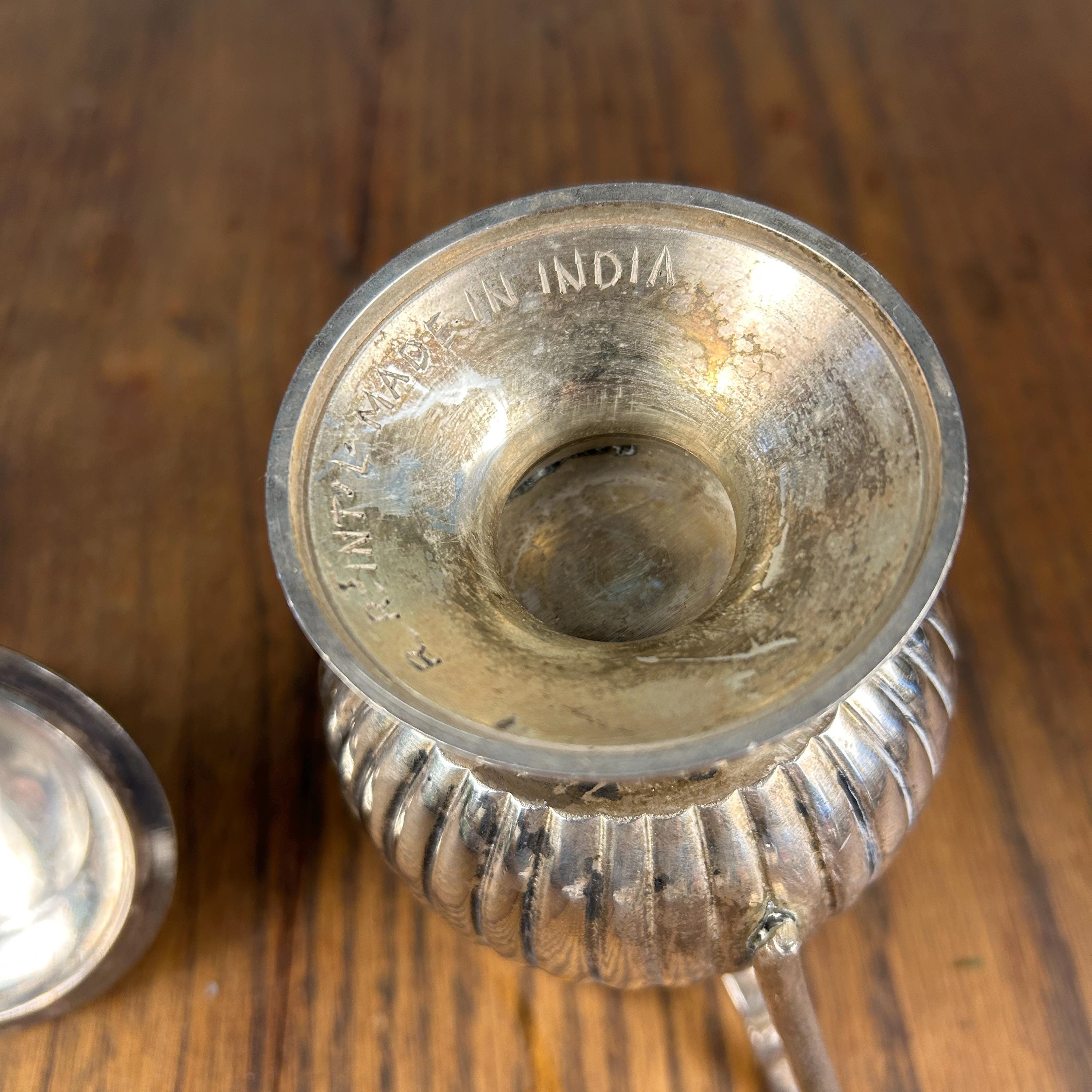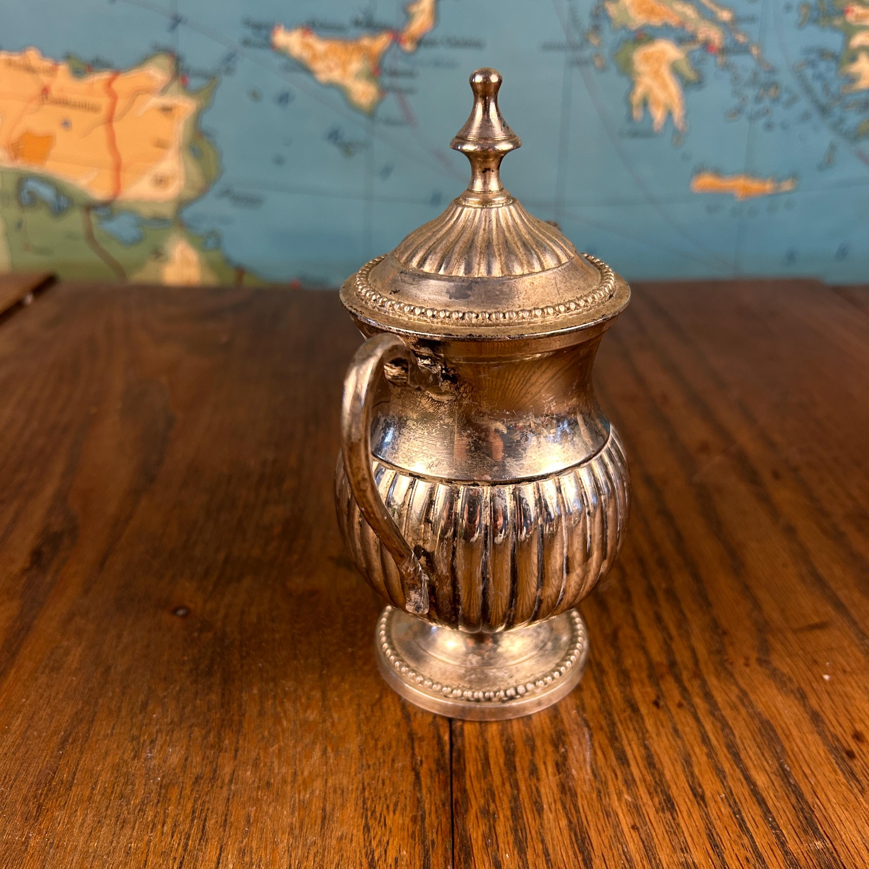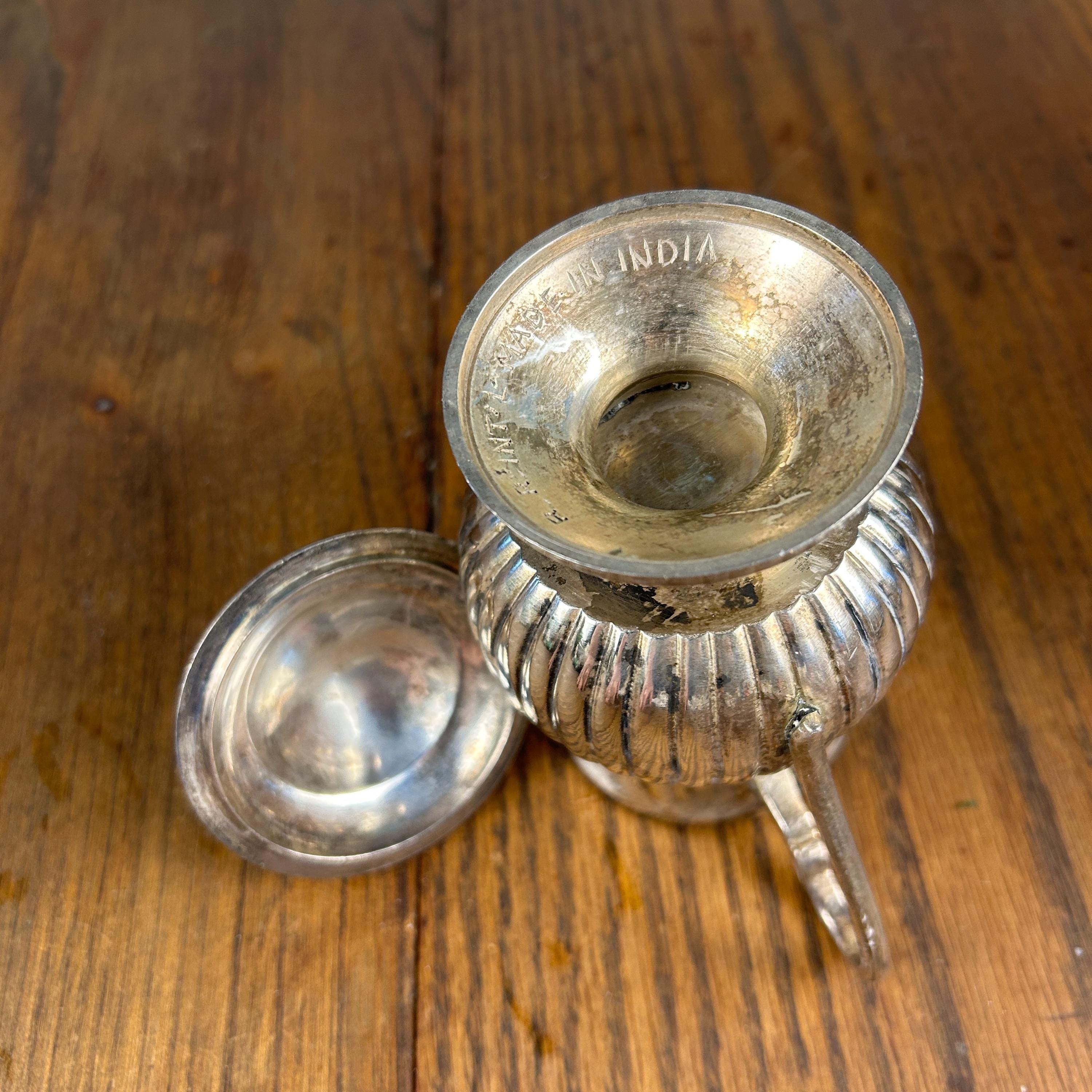 This is a vintage Quadruple Silver Plated pedestal sugar bowl with lid, manufactured by R.R. International in India. The elegant pedestal form and lidded design give this piece a timeless, traditional presence—perfect for both use and display.