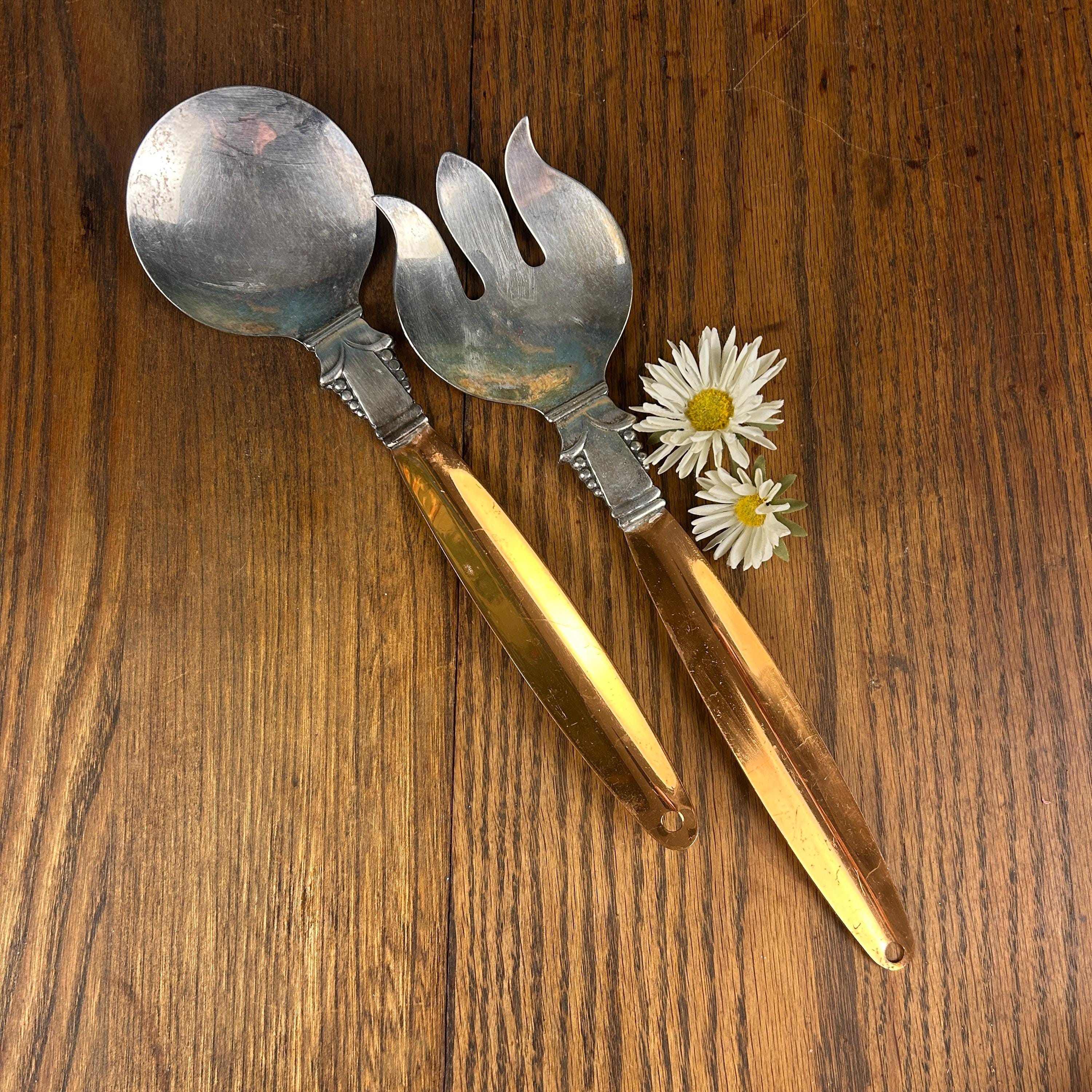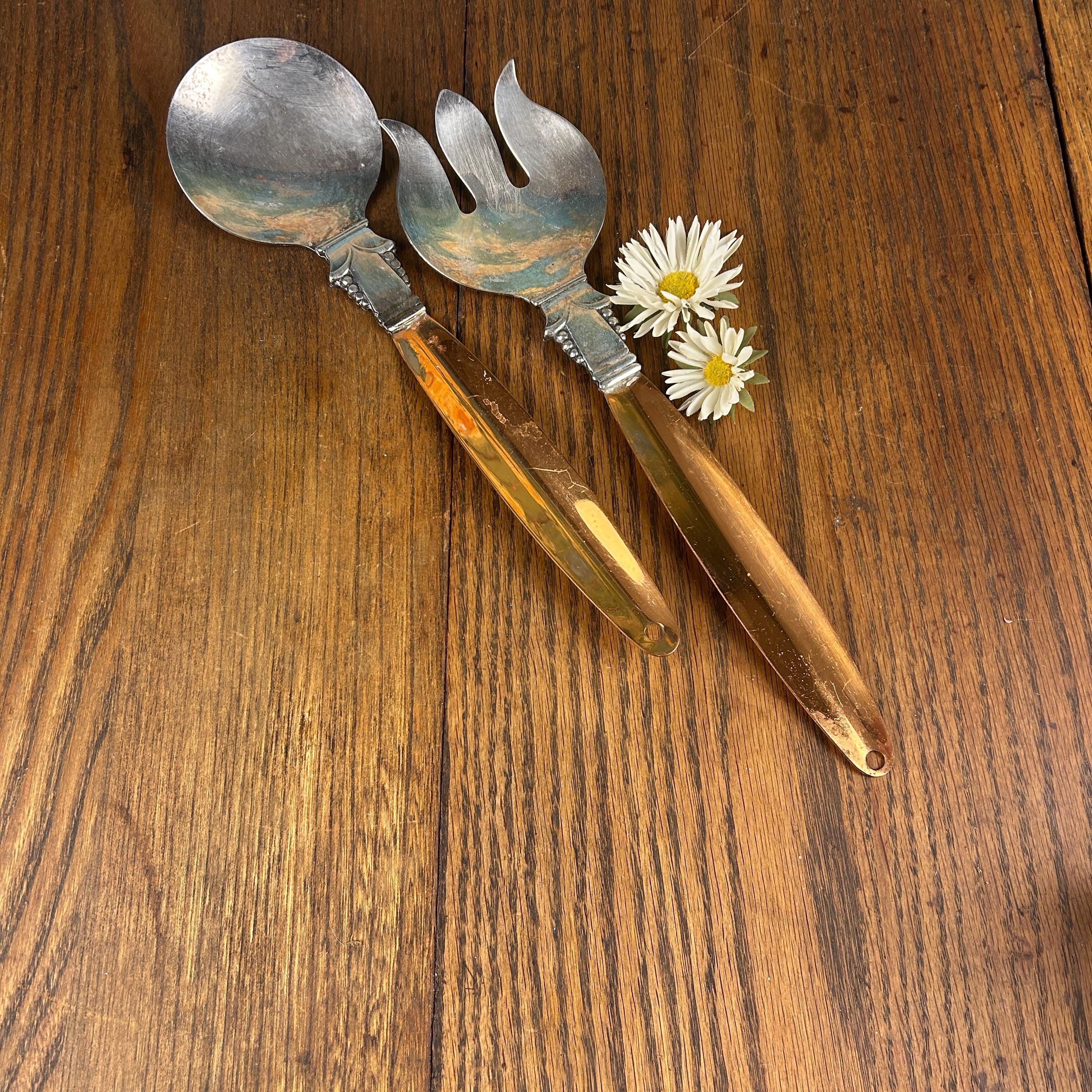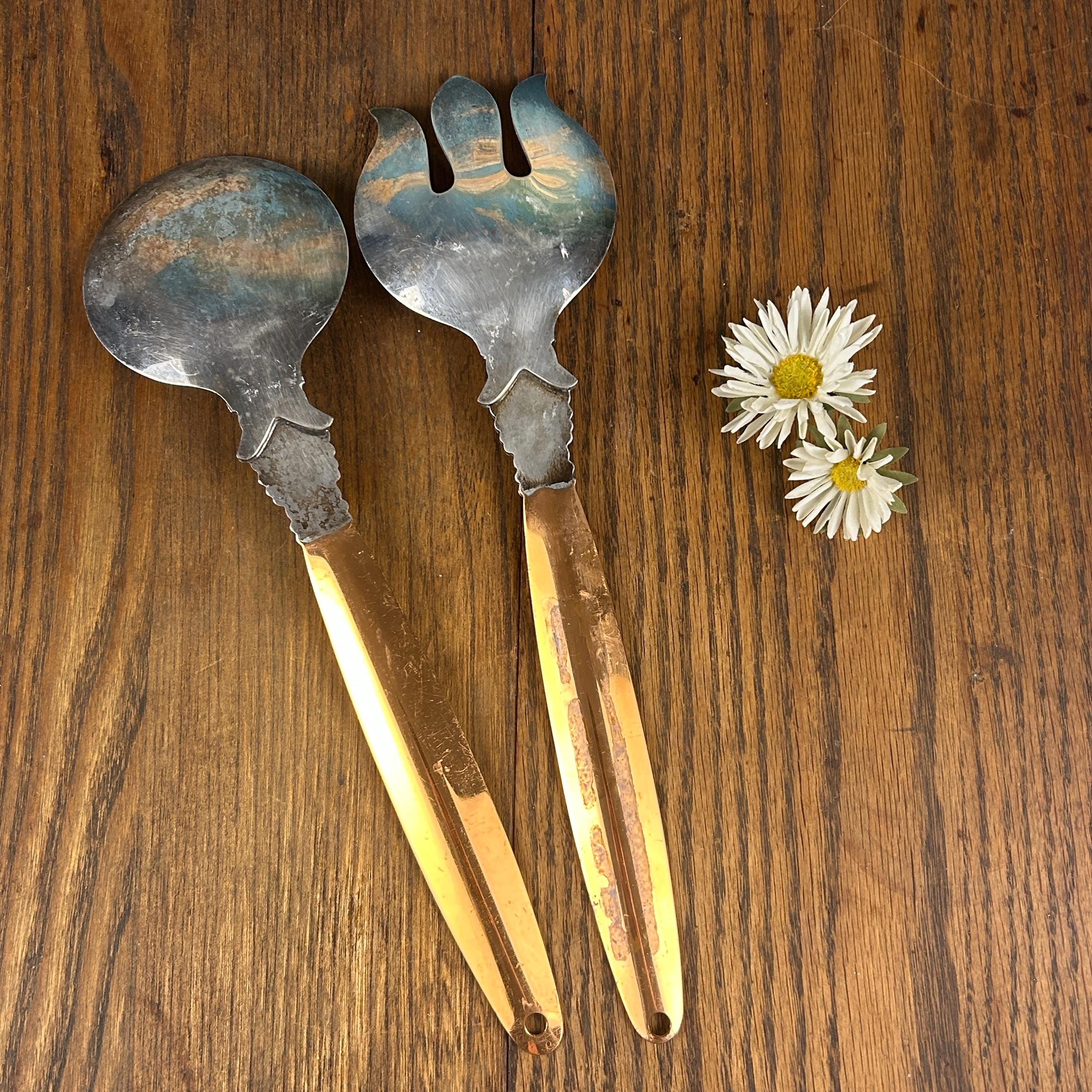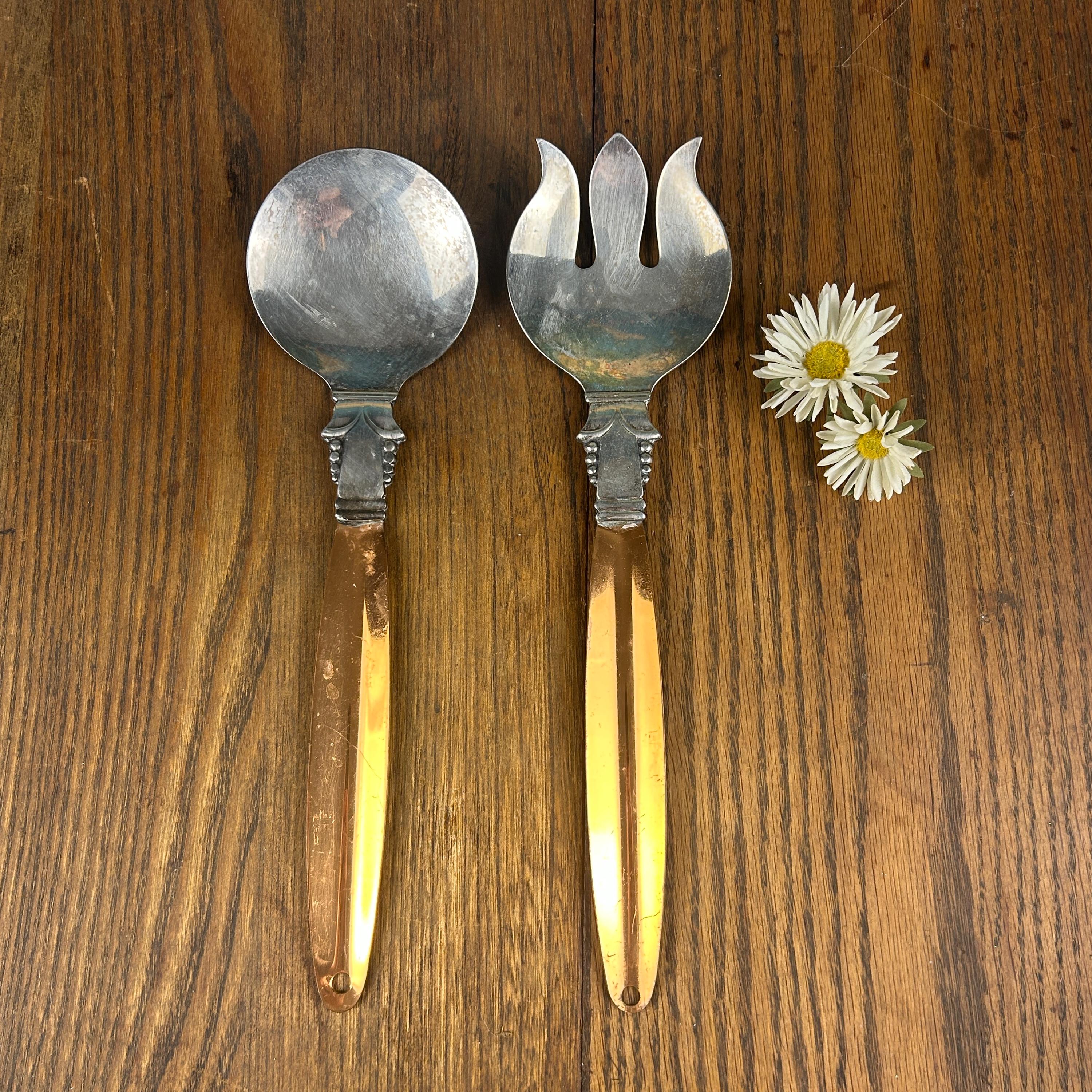This is a vintage salad serving set by the Copper Craft Guild of Taunton, Massachusetts. The set features striking copper handles paired with silver-plated spoon and fork heads, creating a beautiful mixed-metal contrast.