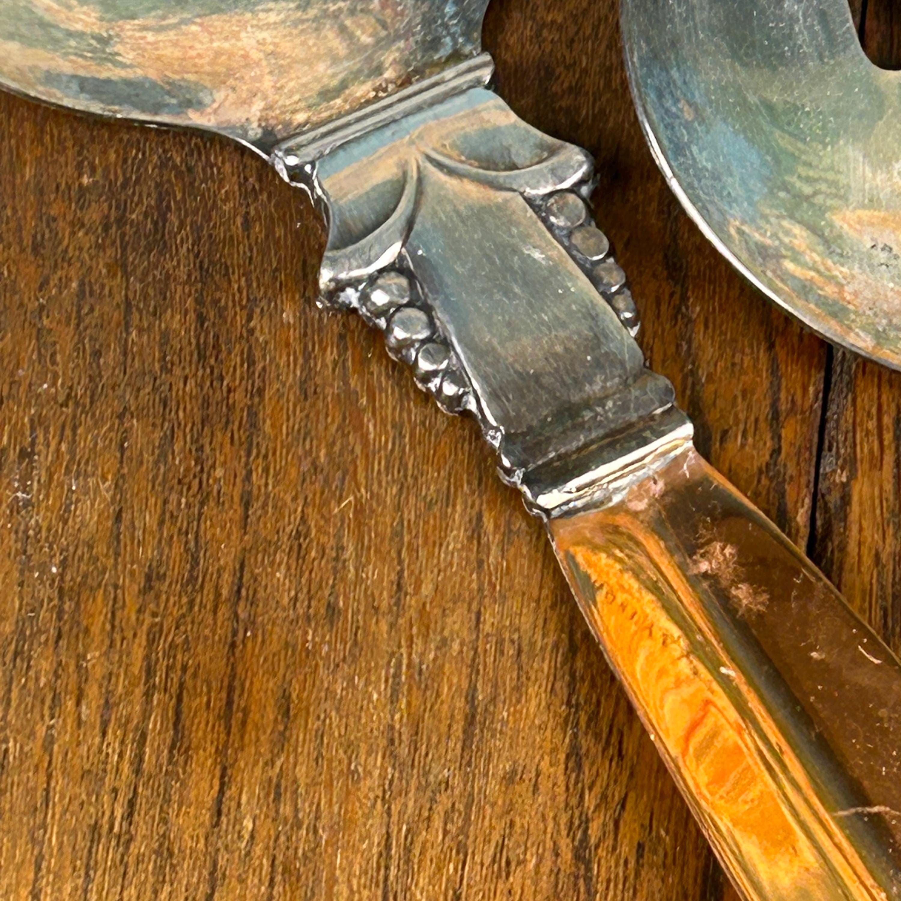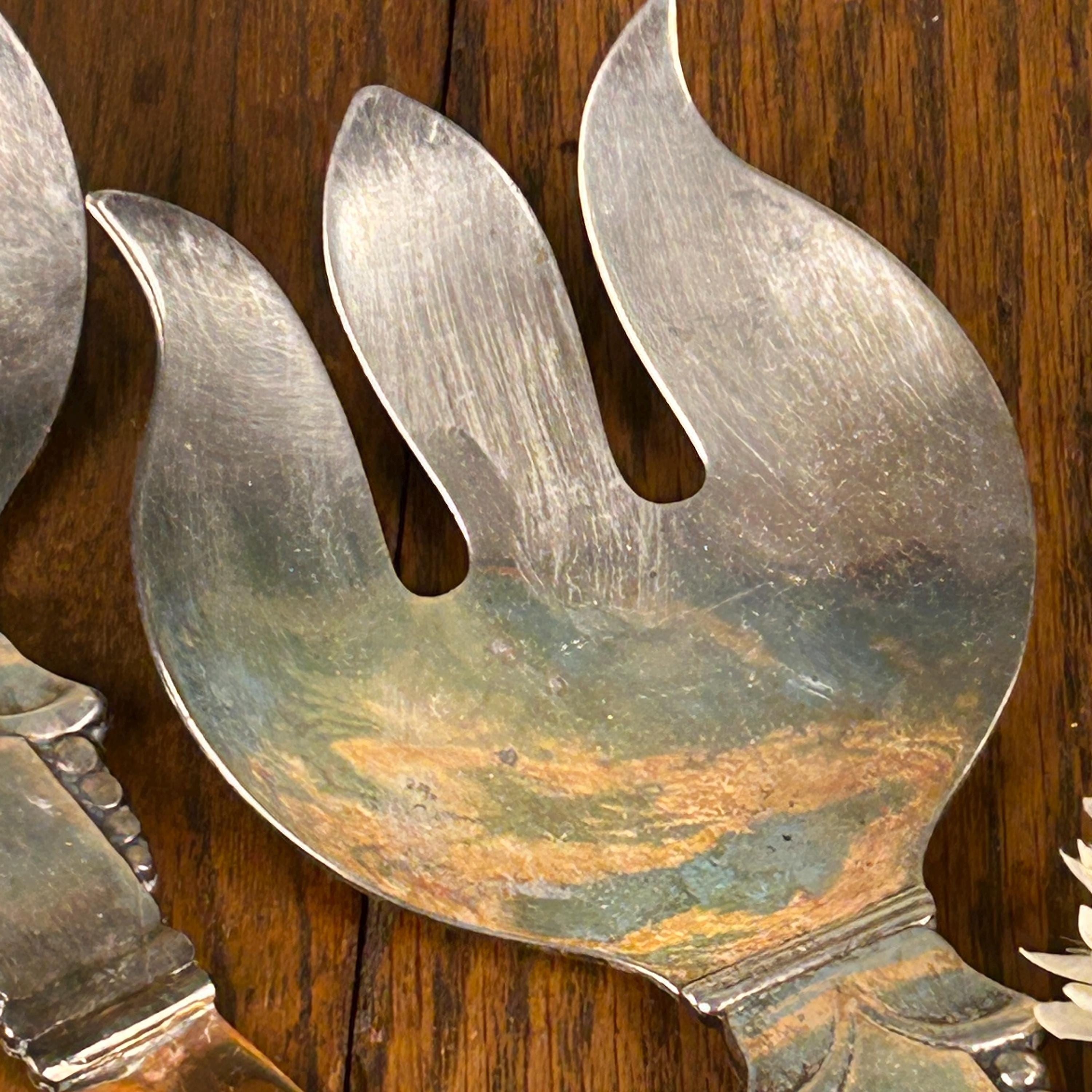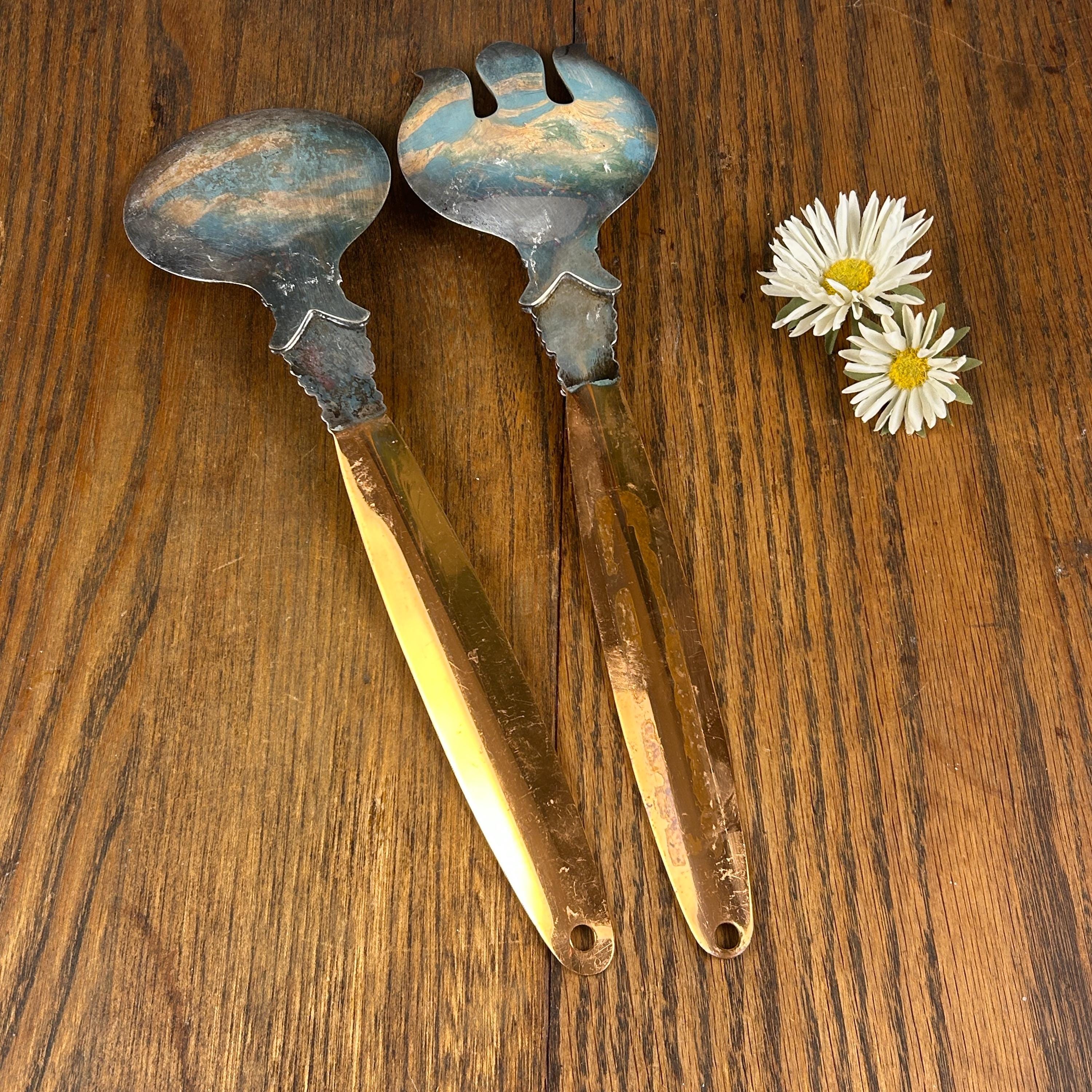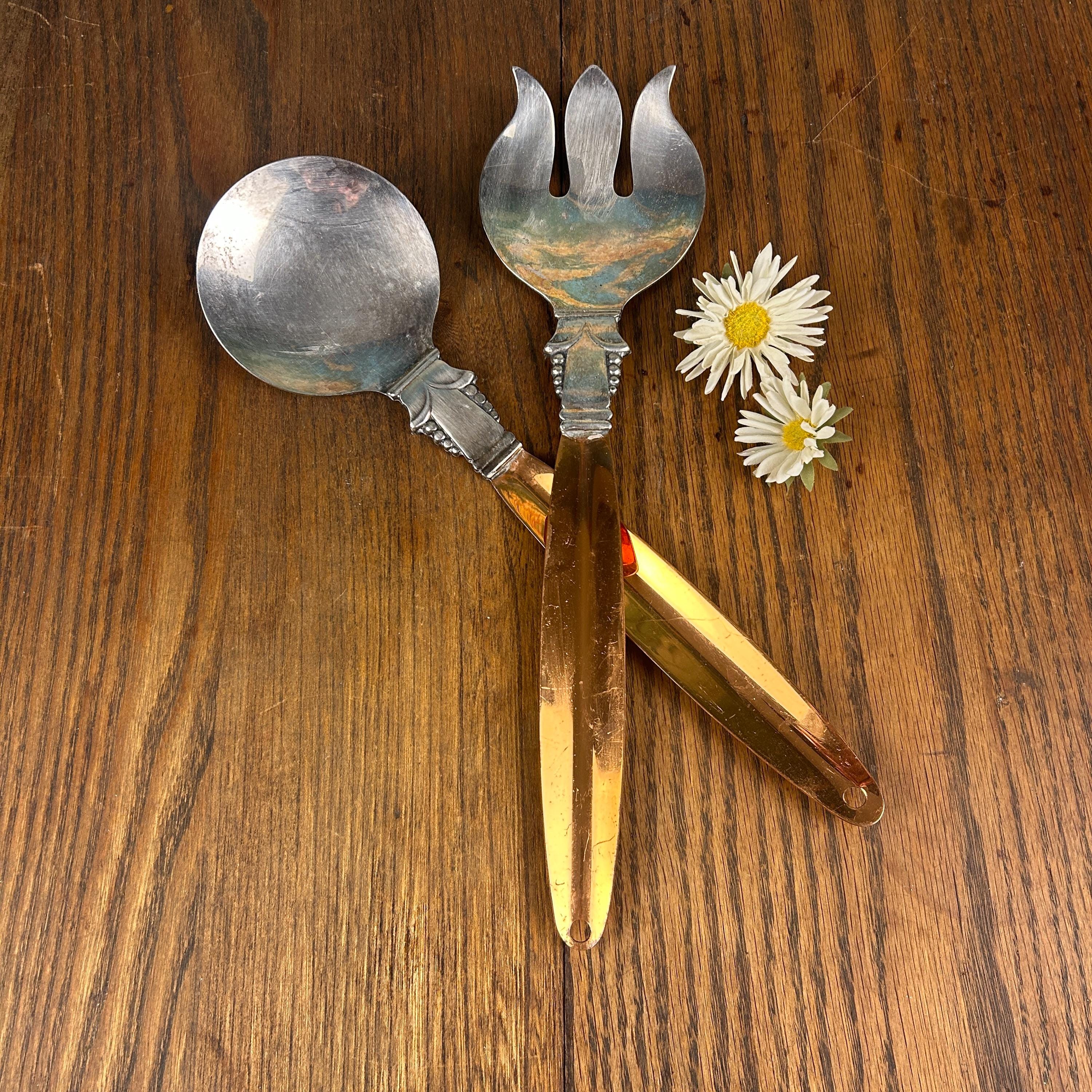 This is a vintage salad serving set by the Copper Craft Guild of Taunton, Massachusetts. The set features striking copper handles paired with silver-plated spoon and fork heads, creating a beautiful mixed-metal contrast.