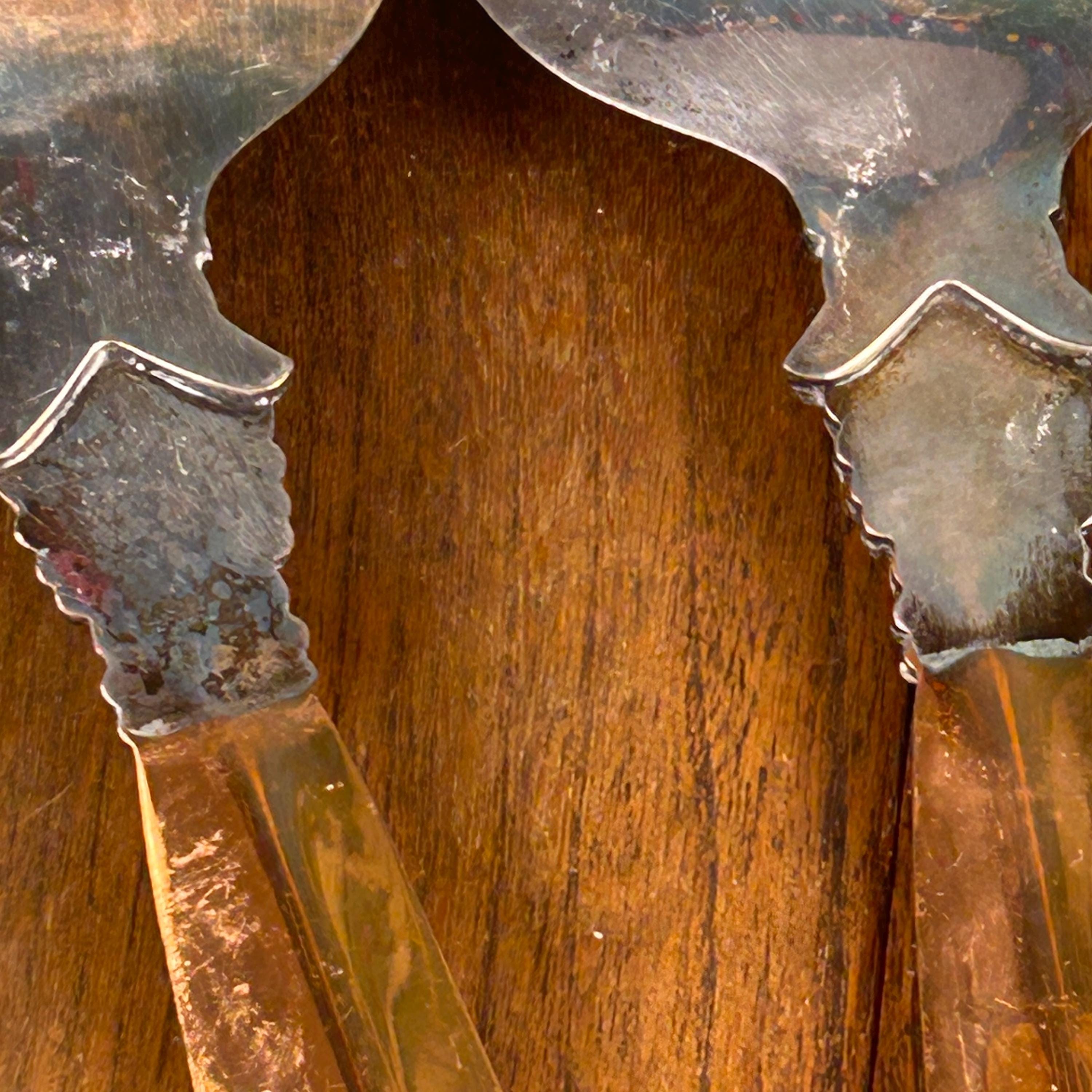 The design reflects strong Art Deco or Gothic influences, with bold lines and sculptural presence that make these servers as eye-catching as they are functional. Pieces from the Copper Craft Guild are known for their quality craftsmanship and distinctive style, making this set a desirable collectible for lovers of vintage tableware and metalwork.